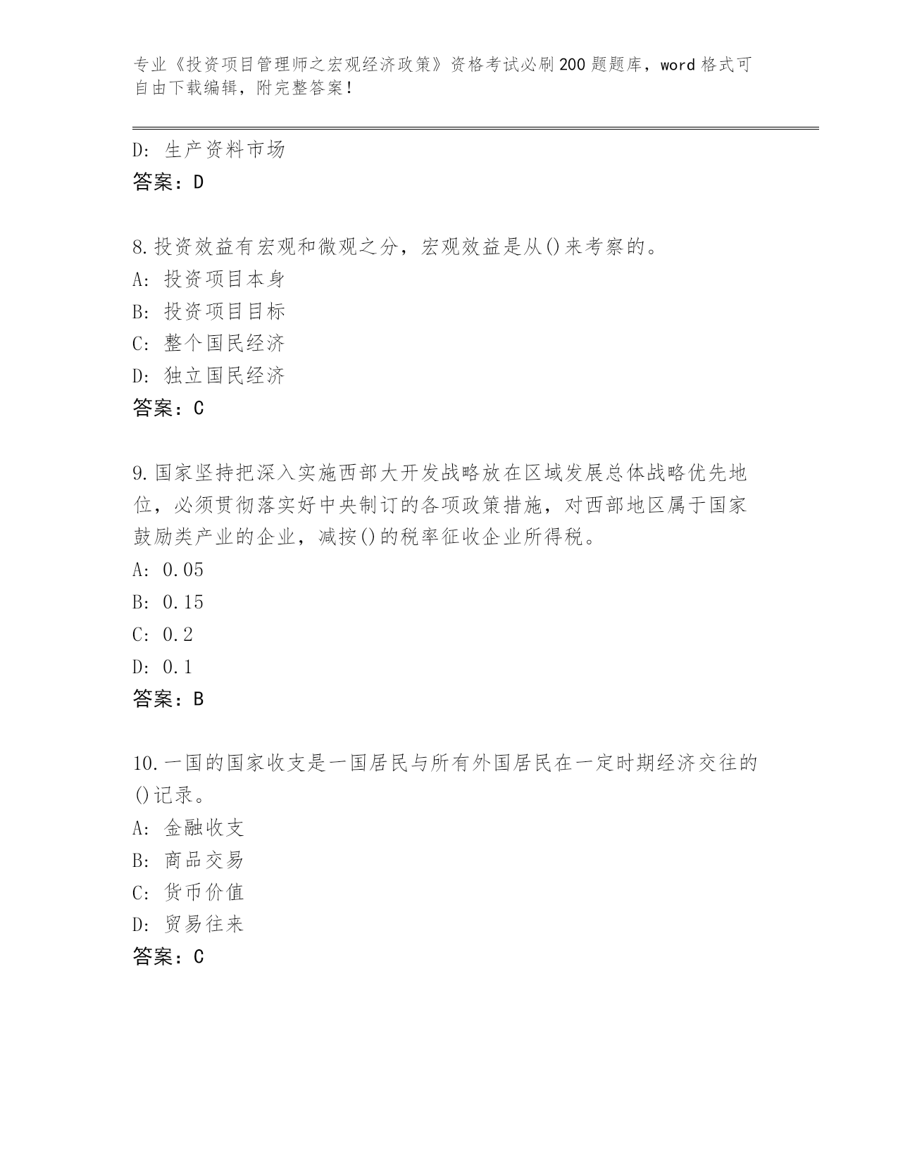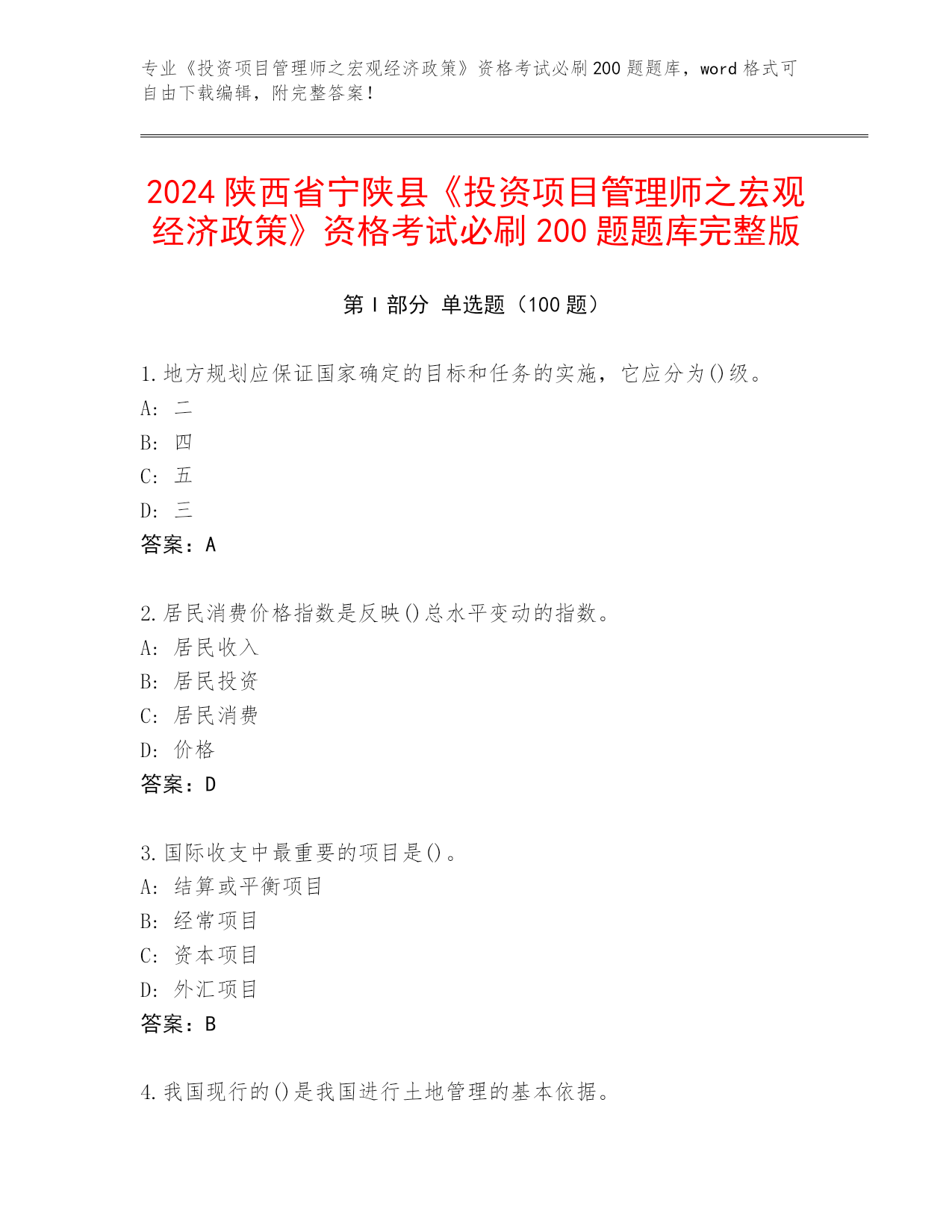 2024年陕西省宁陕县《投资项目管理师之宏观经济政策》考试必刷200题完整版及答案(夺冠系列)