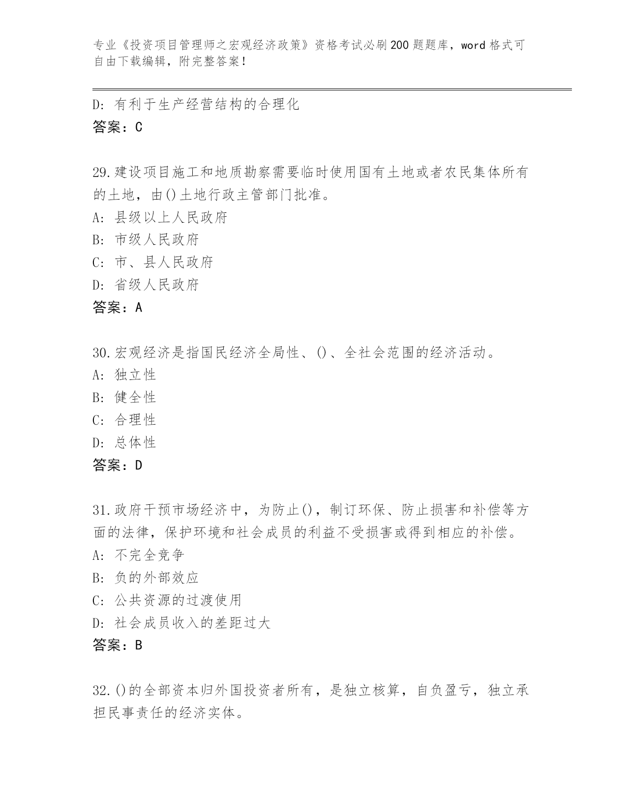 2024陕西省宁陕县《投资项目管理师之宏观经济政策》资格考试必刷200题题库完整版