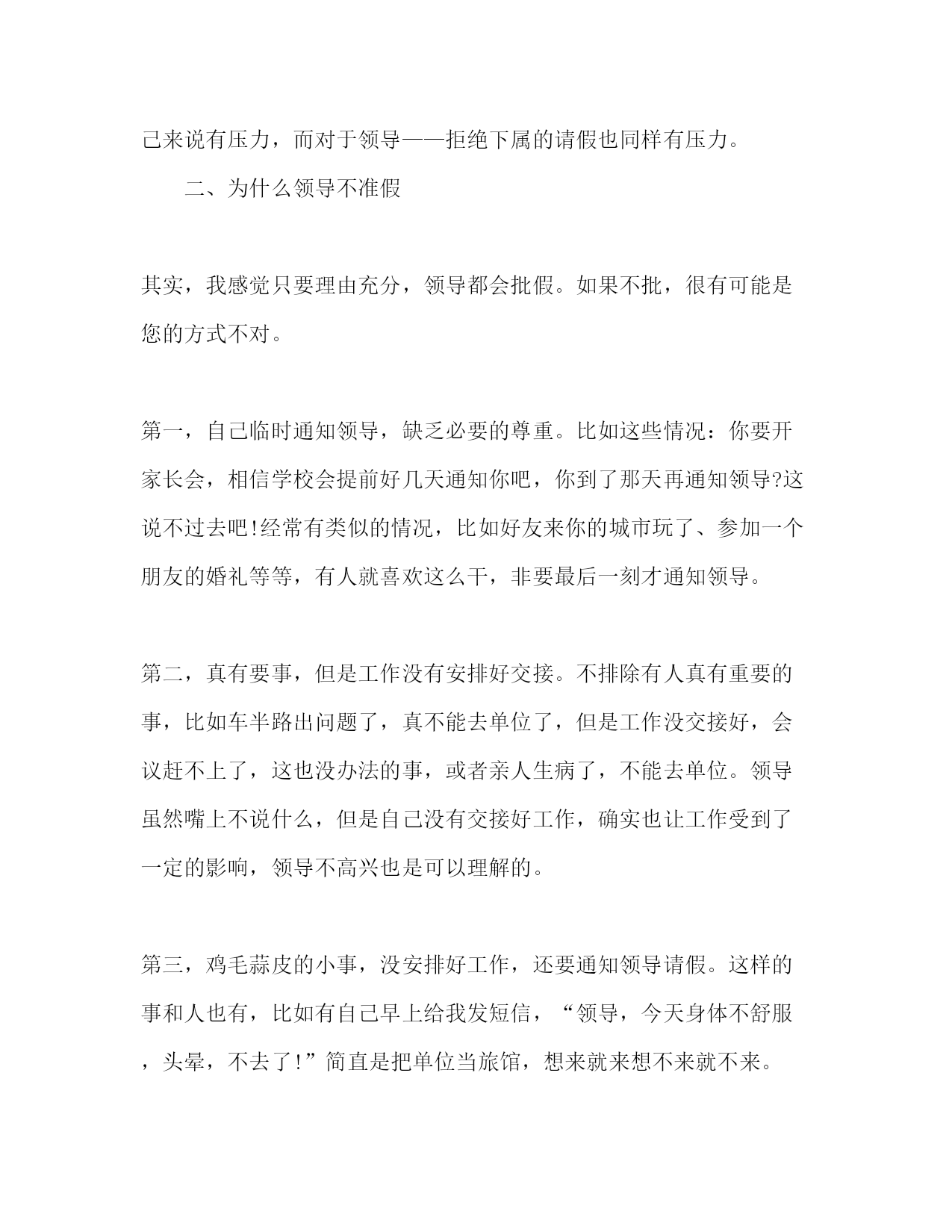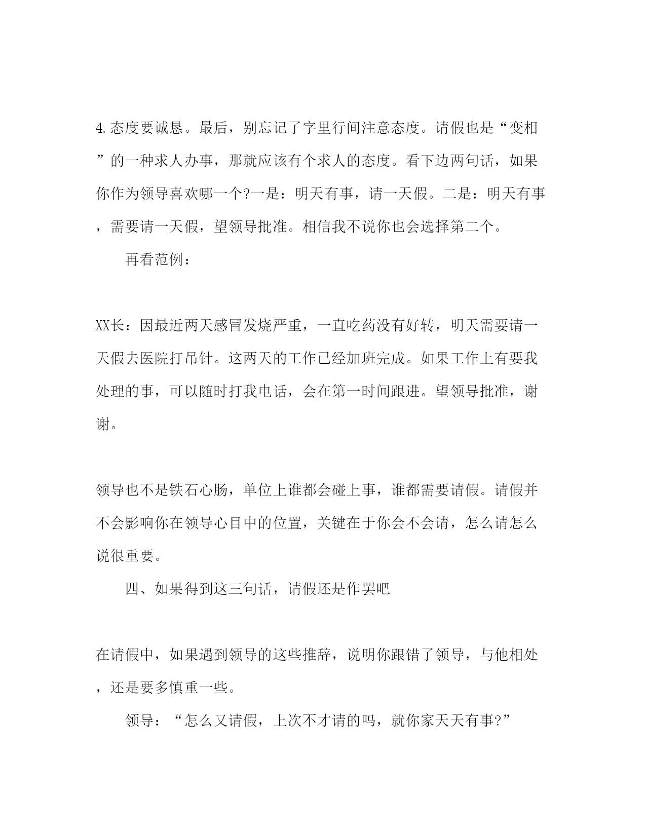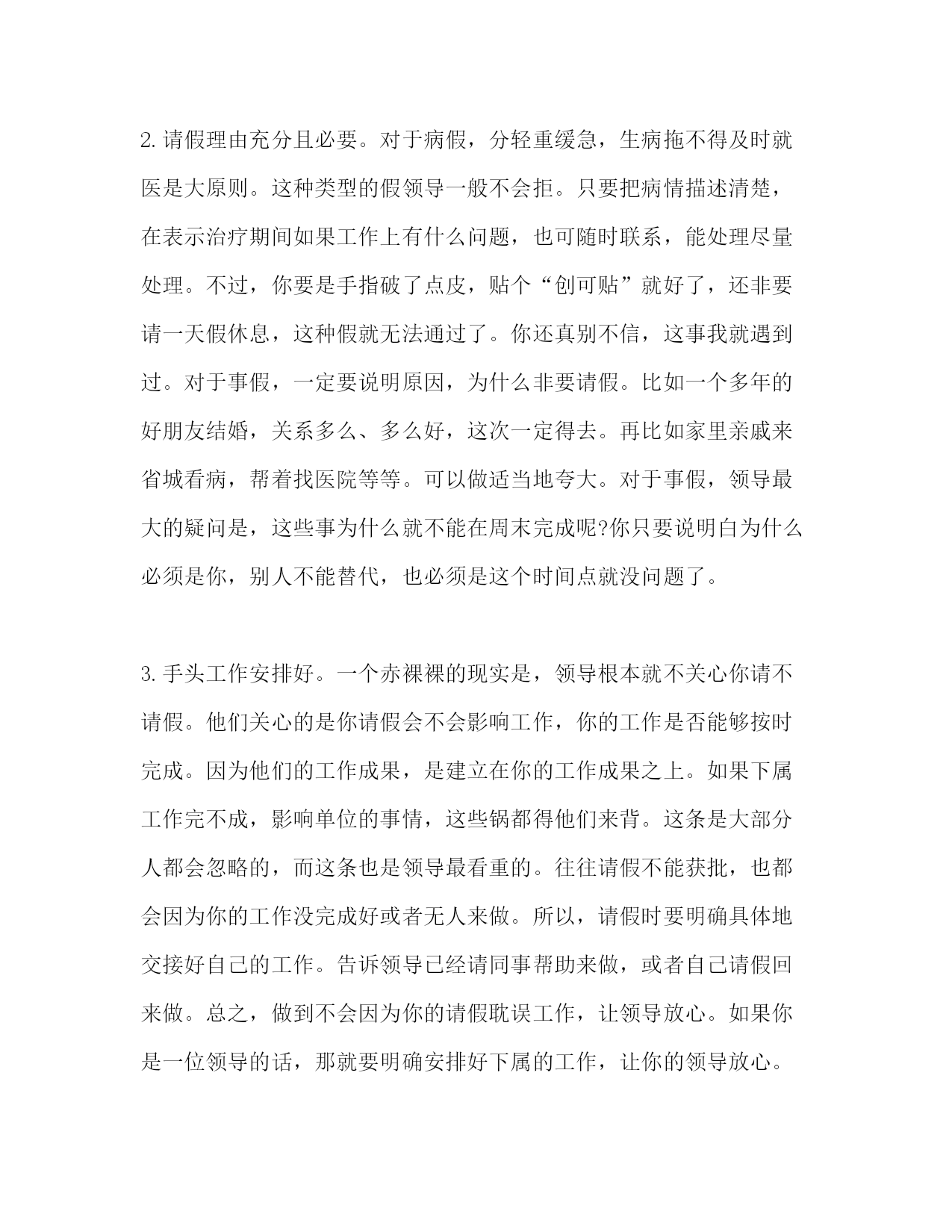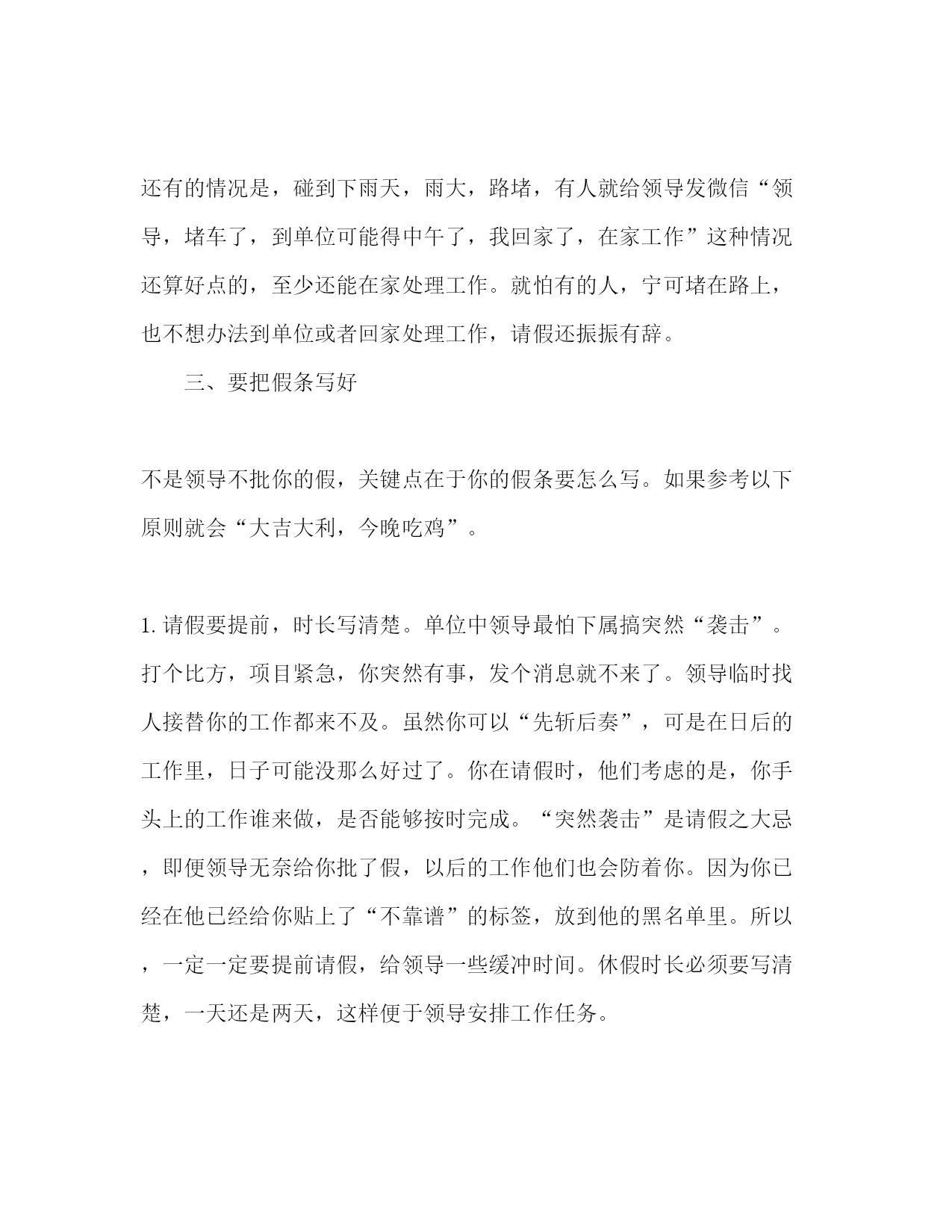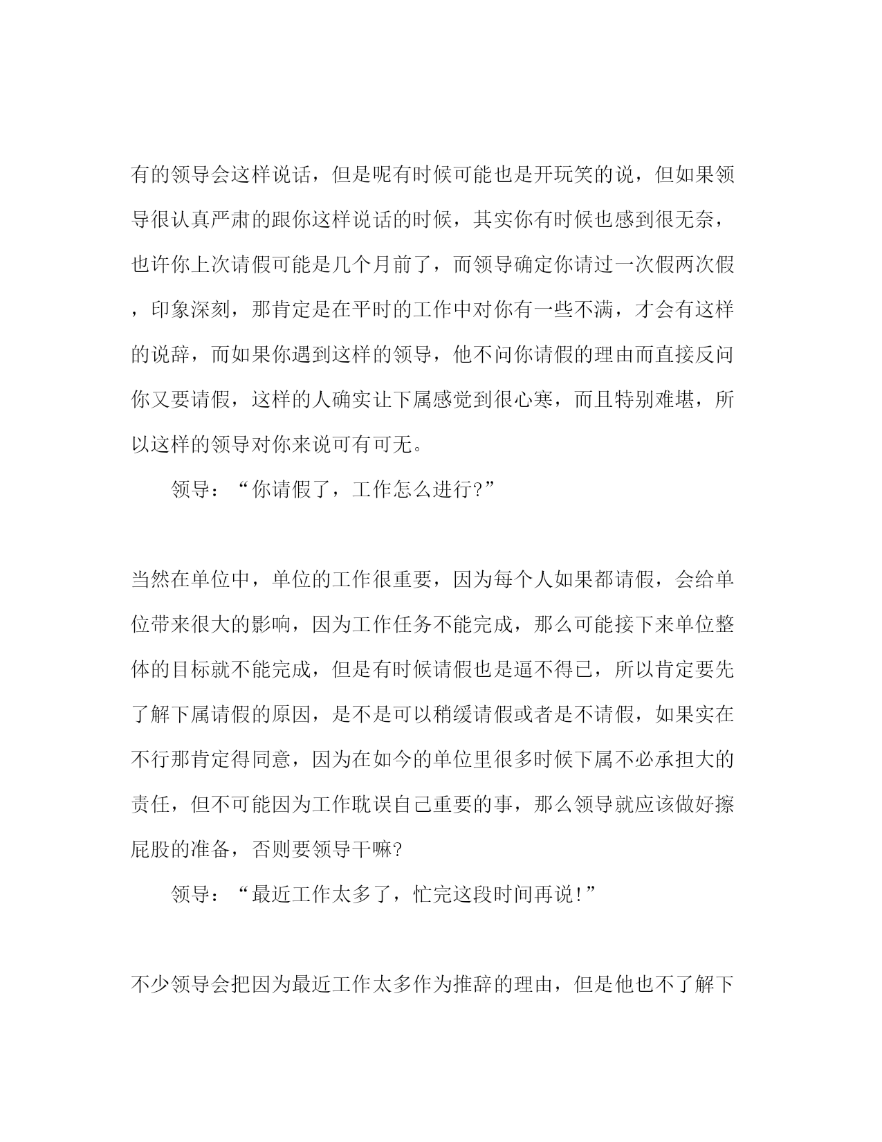 PAGE此资料由网络收集而来,如有侵权请告知上传者立即删除。资料共分享,我们负责传递知识。关于机关公务员请假的事公务员压力大,这是众所周知的。到底有多大?尤其座位基层公务员,下村、填表、做台帐、造材料、报总结。围绕当前中心工作,上街扫地、森林防火、上堤防汛、量体温等等。中央、省、市、县领导路过、调研,提前踩点、制作展板、拍照宣传。“这个节能否出去旅个游?”“没门,节日期间要抓好值班工作。”基层杂事多,值班、驻村等也特别栓人,让人烦躁。接触一线群众,也需要大量耐心、爱心。在“5+2”“白加黑”“996”的日子里,请个假也是很难的事情。一、不好意思请假怎么办不少人在开口请假之前,已经在心理上承担了极大的负担。即便有充分理由,比如自己生病、家人生病、只能在工作日办理证件等等。心理也会不停地盘算,自己最近工作够不够努力,有没有出现过什么错,领导对你的表现满意不满意。更加担心的是,如果领导不给假,该怎么办?会不会按照旷工算?领导不给假就不去,那这事到底重要还是不重要呢?如果不去的话,领导会不会认为在撒谎?其实大部分人并不是害怕请假,只是觉得自己很重要,与其说害怕请假,倒不如说害怕自己在领导面前没那么重要。如今我做了领导,突然发现:请假对自己来说有压力,而对于领导——拒绝下属的请假也同样有压力。二、为什么领导不准假其实,我感觉只要理由充分,领导都会批假。如果不批,很有可能是您的方式不对。第一,自己临时通知领导,缺乏必要的尊重。比如这些情况:你要开家长会,相信学校会提前好几天通知你吧,你到了那天再通知领导?这说不过去吧!经常有类似的情况,比如好友来你的城市玩了、参加一个朋友的婚礼等等,有人就喜欢这么干,非要最后一刻才通知领导。第二,真有要事,但是工作没有安排好交接。不排除有人真有重要的事,比如车半路出问题了,真不能去单位了,但是工作没交接好,会议赶不上了,这也没办法的事,或者亲人生病了,不能去单位。领导虽然嘴上不说什么,但是自己没有交接好工作,确实也让工作受到了一定的影响,领导不高兴也是可以理解的。第三,鸡毛蒜皮的小事,没安排好工作,还要通知领导请假。这样的事和人也有,比如有自己早上给我发短信,“领导,今天身体不舒服,头晕,不去了!”简直是把单位当旅馆,想来就来想不来就不来。还有的情况是,碰到下雨天,雨大,路堵,有人就给领导发微信“领导,堵车了,到单位可能得中午了,我回家了,在家工作”这种情况还算好点的,至少还能在家处理工作。就怕有的人,宁可堵在路上,也不想办法到单位或者回家处理工作,请假还振振有辞。三、要把假条写好不是领导不批你的假,关键点在于你的假条要怎么写。如果参考以下原则就会“大吉大利,今晚吃鸡”。1.请假要提前,时长写清楚。单位中领导最怕下属搞突然“袭击”。打个比方,项目紧急,你突然有事,发个消息就不来了。领导临时找人接替你的工作都来不及。虽然你可以“先斩后奏”,可是在日后的工作里,日子可能没那么好过了。你在请假时,他们考虑的是,你手头上的工作谁来做,是否能够按时完成。“突然袭击”是请假之大忌,即便领导无奈给你批了假,以后的工作他们也会防着你。因为你已经在他已经给你贴上了“不靠谱”的标签,放到他的黑名单里。所以,一定一定要提前请假,给领导一些缓冲时间。休假时长必须要写清楚,一天还是两天,这样便于领导安排工作任务。2.请假理由充分且必要。对于病假,分轻重缓急,生病拖不得及时就医是大原则。这种类型的假领导一般不会拒。只要把病情描述清楚,在表示治疗期间如果工作上有什么问题,也可随时联系,能处理尽量处理。不过,你要是手指破了点皮,贴个“创可贴”就好了,还非要请一天假休息,这种假就无法通过了。你还真别不信,这事我就遇到过。对于事假,一定要说明原因,为什么非要请假。比如一个多年的好朋友结婚,关系多么、多么好,这次一定得去。再比如家里亲戚来省城看病,帮着找医院等等。可以做适当地夸大。对于事假,领导最大的疑问是,这些事为什么就不能在周末完成呢?你只要说明白为什么必须是你,别人不能替代,也必须是这个时间点就没问题了。3.手头工作安排好。一个赤裸裸的现实是,领导根本就不关心你请不请假。他们关心的是你请假会不会影响工作,你的工作是否能够按时完成。因为他们的工作成果,是建立在你的工作成果之上。如果下属工作完不成,影响单位的事情,这些锅都得他们来背。这条是大部分人都会忽略的,而这条也是领导最看重的。往往请假不能获批,也都会因为你的工作没完成好或者无人来做。所以,请假时要明确具体地交接好自己的工作。告诉领导已经请同事帮助来做,或者自己请假回来做。总之,做到不会因为你的请假耽误工作,让领导放心。如果你是一位领导的话,那就要明确安排好下属的工作,让你的领导放心。4.态度要诚恳。最后,别忘记了字里行间注意态度。请假也是