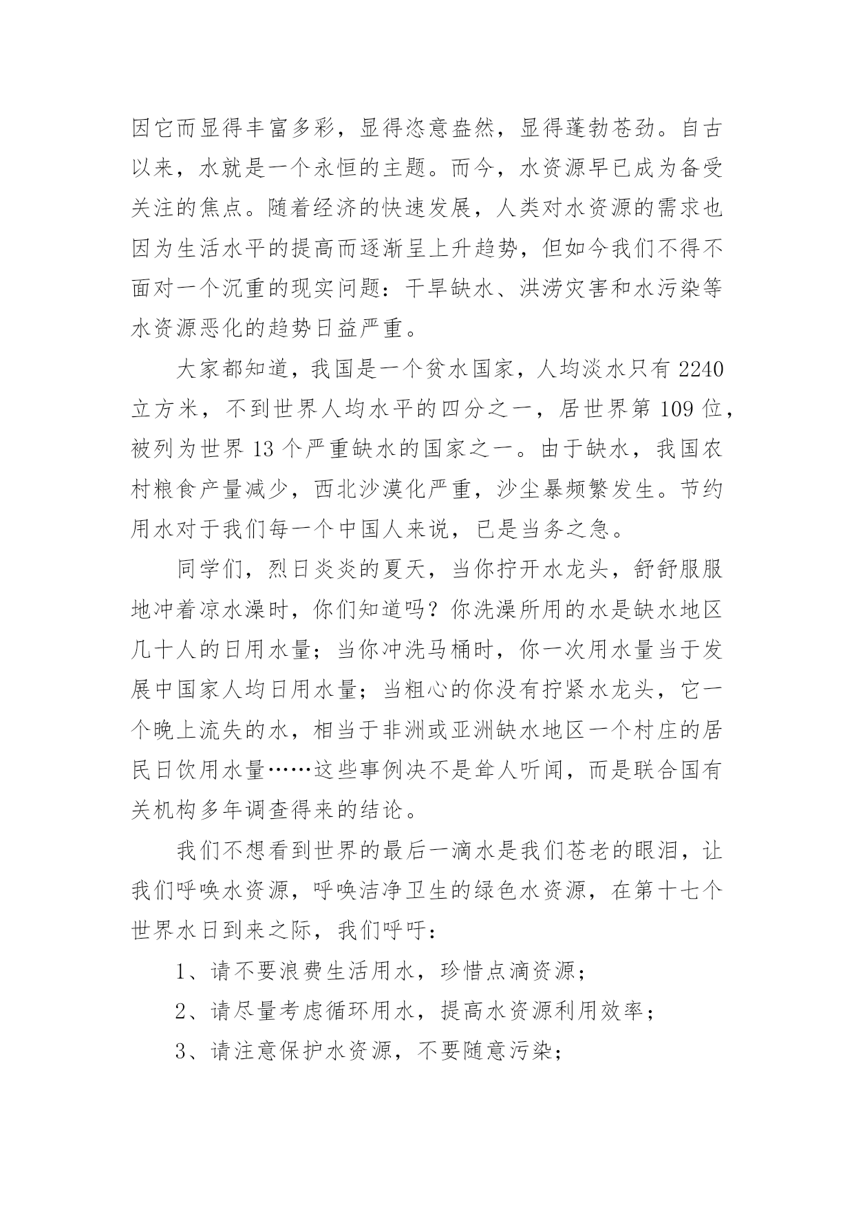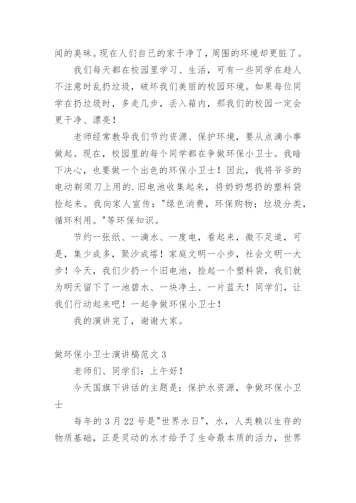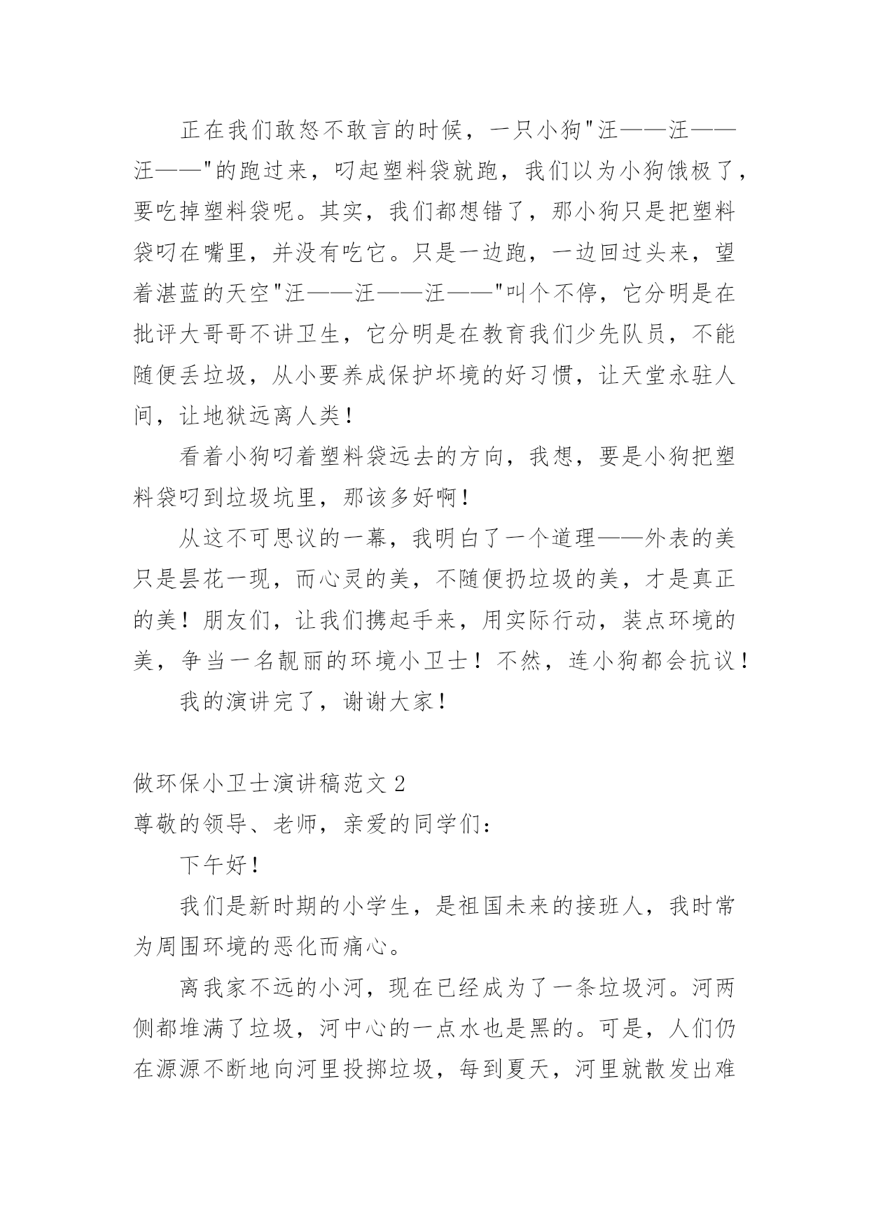做环保小卫士演讲稿做环保小卫士演讲稿范文演讲稿的格式由称谓、开场白、主干、结尾等几部分组成。在社会一步步向前发展的今天,演讲稿对我们的作用越来越大,来参考自己需要的演讲稿吧!下面是小编帮大家整理的做环保小卫士演讲稿范文,希望能够帮助到大家。做环保小卫士演讲稿范文1大家好!我演讲的题目是《争当环保小卫士》。众所周知,环境,是我们赖以生存的地方!山清水秀太阳高,环境就是天堂!否则呀,山——失去绿衣裳,水——没有鱼虾嬉戏,天空——见不到太阳,环境就会变成人间地狱!看着胸前鲜艳的红领巾,我思绪起伏!那是一天放学后,一位长得十分清秀的大哥哥,喜气洋洋地冲向小卖铺,熟练地撕开一包马仔王,美滋滋地吃起来。呵,好神气,同学们都向他投去羡慕的眼光……再注意大哥哥的时候,那包马仔王已经被他一扫而光。他呢,舔着嘴唇,瞅了一眼,趁别人不注意,早把包装马仔王的塑料袋,随手扔在原本一尘不染的地面上!多么可恶呀,地面在默默地流着红色的眼泪,塑料袋在春风中"呜呜呜"地哭泣,同学们更是满腔怒火——恨不得冲上去扒开大哥哥的心,看看是不是黑色的?!正在我们敢怒不敢言的时候,一只小狗"汪——汪——汪——"的跑过来,叼起塑料袋就跑,我们以为小狗饿极了,要吃掉塑料袋呢。其实,我们都想错了,那小狗只是把塑料袋叼在嘴里,并没有吃它。只是一边跑,一边回过头来,望着湛蓝的天空"汪——汪——汪——"叫个不停,它分明是在批评大哥哥不讲卫生,它分明是在教育我们少先队员,不能随便丢垃圾,从小要养成保护坏境的好习惯,让天堂永驻人间,让地狱远离人类!看着小狗叼着塑料袋远去的方向,我想,要是小狗把塑料袋叼到垃圾坑里,那该多好啊!从这不可思议的一幕,我明白了一个道理——外表的美只是昙花一现,而心灵的美,不随便扔垃圾的美,才是真正的美!朋友们,让我们携起手来,用实际行动,装点环境的美,争当一名靓丽的环境小卫士!不然,连小狗都会抗议!我的演讲完了,谢谢大家!做环保小卫士演讲稿范文2尊敬的领导、老师,亲爱的同学们:下午好!我们是新时期的小学生,是祖国未来的接班人,我时常为周围环境的恶化而痛心。离我家不远的小河,现在已经成为了一条垃圾河。河两侧都堆满了垃圾,河中心的一点水也是黑的。可是,人们仍在源源不断地向河里投掷垃圾,每到夏天,河里就散发出难闻的臭昧。现在人们自己的家干净了,周围的环境却更脏了。我们每天都在校园里学习、生活,可有一些同学在趁人不注意时乱扔垃圾,破坏我们美丽的校园环境。如果每位同学在扔垃圾时,多走几步,丢入箱内,那我们的校园一定会更干净、漂亮!老师经常教导我们节约资源、保护环境,要从点滴小事做起。现在,校园里的每个同学都在争做环保小卫士。我暗下决心,也要做一个出色的环保小卫士!因此,我将爷爷的电动剃须刀上用的.旧电池收集起来,将奶奶想扔的塑料袋捡起来。我向家人宣传:"绿色消费,环保购物;垃圾分类,循环利用。"等环保知识。节约一张纸、一滴水、一度电,看起来,微不足道,可是,集少成多,聚沙成塔!家庭文明一小步,社会文明一大步!今天,我们少扔一个旧电池,捡起一个塑料袋,我们就为明天留下了一池碧水、一块净土、一片蓝天!同学们,让我们行动起来吧!一起争做环保小卫士!我的演讲完了,谢谢大家。做环保小卫士演讲稿范文3老师们、同学们:上午好!今天国旗下讲话的主题是:保护水资源,争做环保小卫士每年的3月22号是"世界水日",水,人类赖以生存的物质基础,正是灵动的水才给予了生命最本质的活力,世界因它而显得丰富多彩,显得恣意盎然,显得蓬勃苍劲。自古以来,水就是一个永恒的主题。而今,水资源早已成为备受关注的焦点。随着经济的快速发展,人类对水资源的需求也因为生活水平的提高而逐渐呈上升趋势,但如今我们不得不面对一个沉重的现实问题:干旱缺水、洪涝灾害和水污染等水资源恶化的趋势日益严重。大家都知道,我国是一个贫水国家,人均淡水只有2240立方米,不到世界人均水平的四分之一,居世界第109位,被列为世界13个严重缺水的国家之一。由于缺水,我国农村粮食产量减少,西北沙漠化严重,沙尘暴频繁发生。节约用水对于我们每一个中国人来说,已是当务之急。同学们,烈日炎炎的夏天,当你拧开水龙头,舒舒服服地冲着凉水澡时,你们知道吗?你洗澡所用的水是缺水地区几十人的日用水量;当你冲洗马桶时,你一次用水量当于发展中国家人均日用水量;当粗心的你没有拧紧水龙头,它一个晚上流失的水,相当于非洲或亚洲缺水地区一个村庄的居民日饮用水量……这些事例决不是耸人听闻,而是联合国有关机构多年调查得来的结论。我们不想看到世界的最后一滴水是我们苍老的眼泪,让我们呼唤水资源,呼唤洁净卫生的绿色水资源,在第十七个世界水日到来之际,我们呼吁:1、请不要浪费生活用水,珍惜点滴资源;2、请尽量考虑循环用水,提高水资源利用效率;3、请注意保护水资源,不要随意污染;4、请用