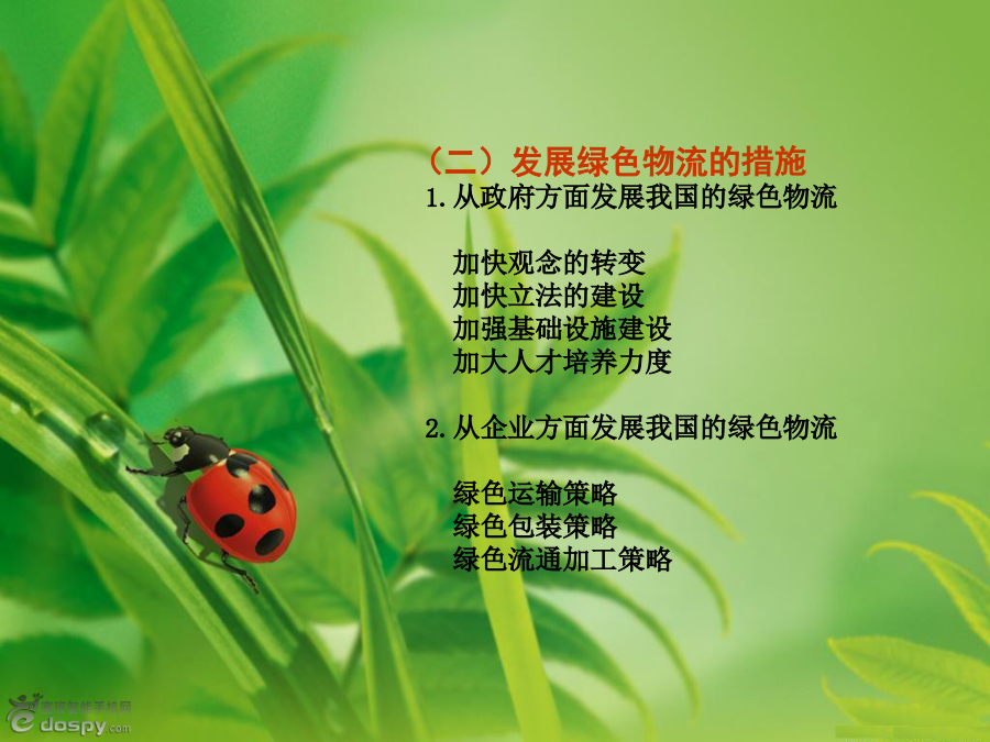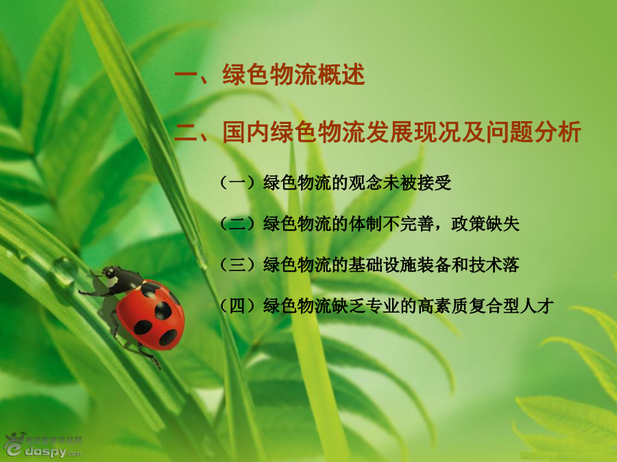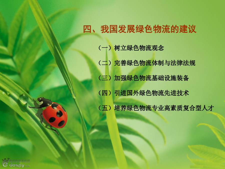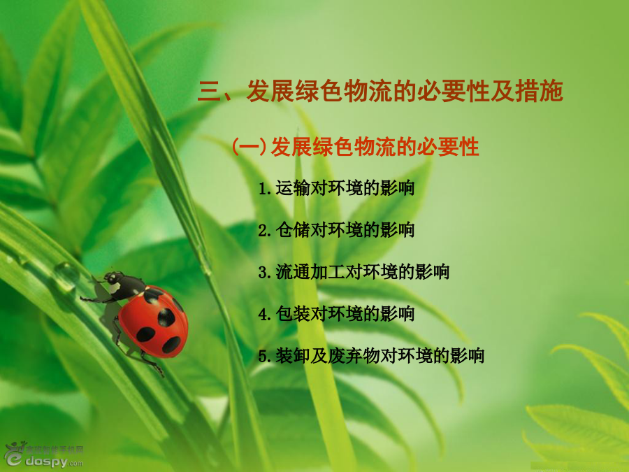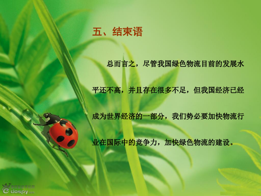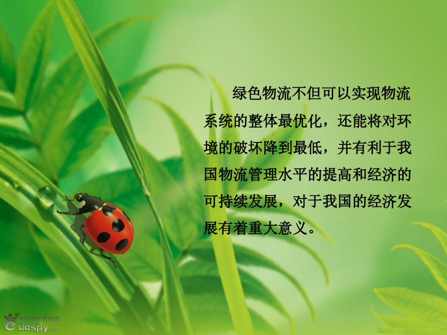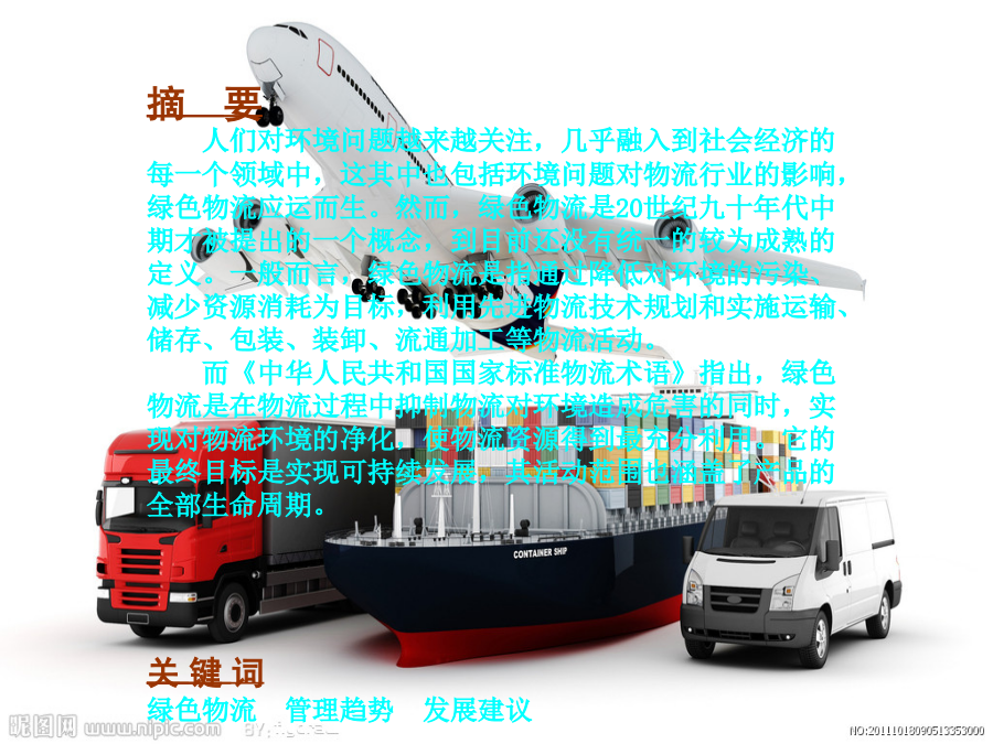 绿色物流的发展研究TheDevelopmentofEnvironmentalLogistics摘要人们对环境问题越来越关注,几乎融入到社会经济的每一个领域中,这其中也包括环境问题对物流行业的影响,绿色物流应运而生。然而,绿色物流是20世纪九十年代中期才被提出的一个概念,到目前还没有统一的较为成熟的定义。一般而言,绿色物流是指通过降低对环境的污染、减少资源消耗为目标,利用先进物流技术规划和实施运输、储存、包装、装卸、流通加工等物流活动。而《中华人民共和国国家标准物流术语》指出,绿色物流是在物流过程中抑制物流对环境造成危害的同时,实现对物流环境的净化,使物流资源得到最充分利用。它的最终目标是实现可持续发展,其活动范围也涵盖了产品的全部生命周期。关键词绿色物流管理趋势发展建议一、绿色物流概述二、国内绿色物流发展现况及问题分析(一)绿色物流的观念未被接受(二)绿色物流的体制不完善,政策缺失(三)绿色物流的基础设施装备和技术落(四)绿色物流缺乏专业的高素质复合型人才三、发展绿色物流的必要性及措施(一)发展绿色物流的必要性1.运输对环境的影响2.仓储对环境的影响3.流通加工对环境的影响4.包装对环境的影响5.装卸及废弃物对环境的影响(二)发展绿色物流的措施1.从政府方面发展我国的绿色物流加快观念的转变加快立法的建设加强基础设施建设加大人才培养力度2.从企业方面发展我国的绿色物流绿色运输策略绿色包装策略绿色流通加工策略四、我国发展绿色物流的建议(一)树立绿色物流观念(二)完善绿色物流体制与法律法规(三)加强绿色物流基础设施装备(四)引进国外绿色物流先进技术(五)培养绿色物流专业高素质复合型人才五、结束语总而言之,尽管我国绿色物流目前的发展水平还不高,并且存在很多不足,但我国经济已经成为世界经济的一部分,我们势必要加快物流行业在国际中的竞争力,加快绿色物流的建设。绿色物流不但可以实现物流系统的整体最优化,还能将对环境的破坏降到最低,并有利于我国物流管理水平的提高和经济的可持续发展,对于我国的经济发展有着重大意义。