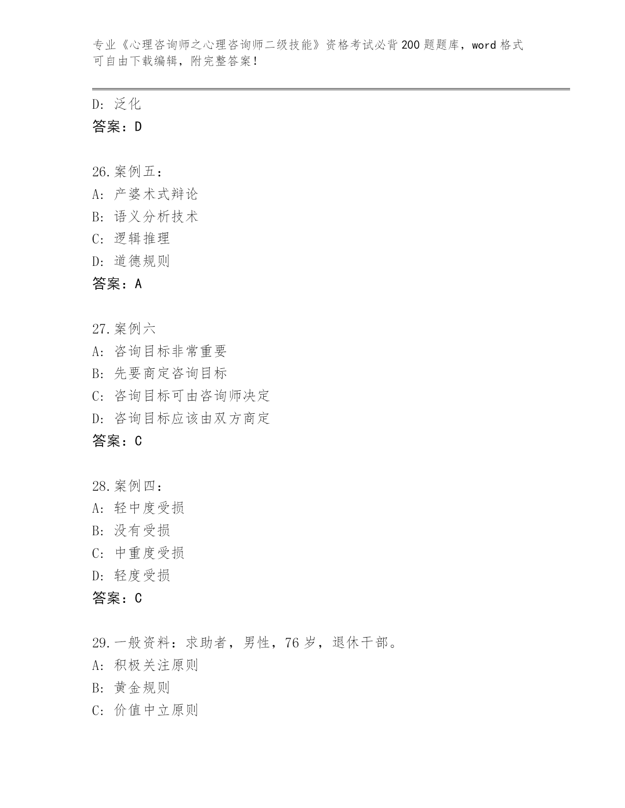 山西省整理《心理咨询师之心理咨询师二级技能》资格考试必背200题【含答案】