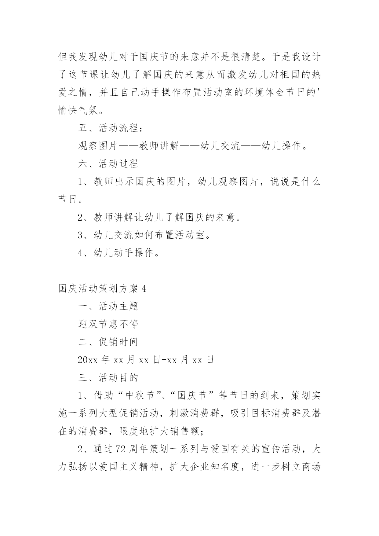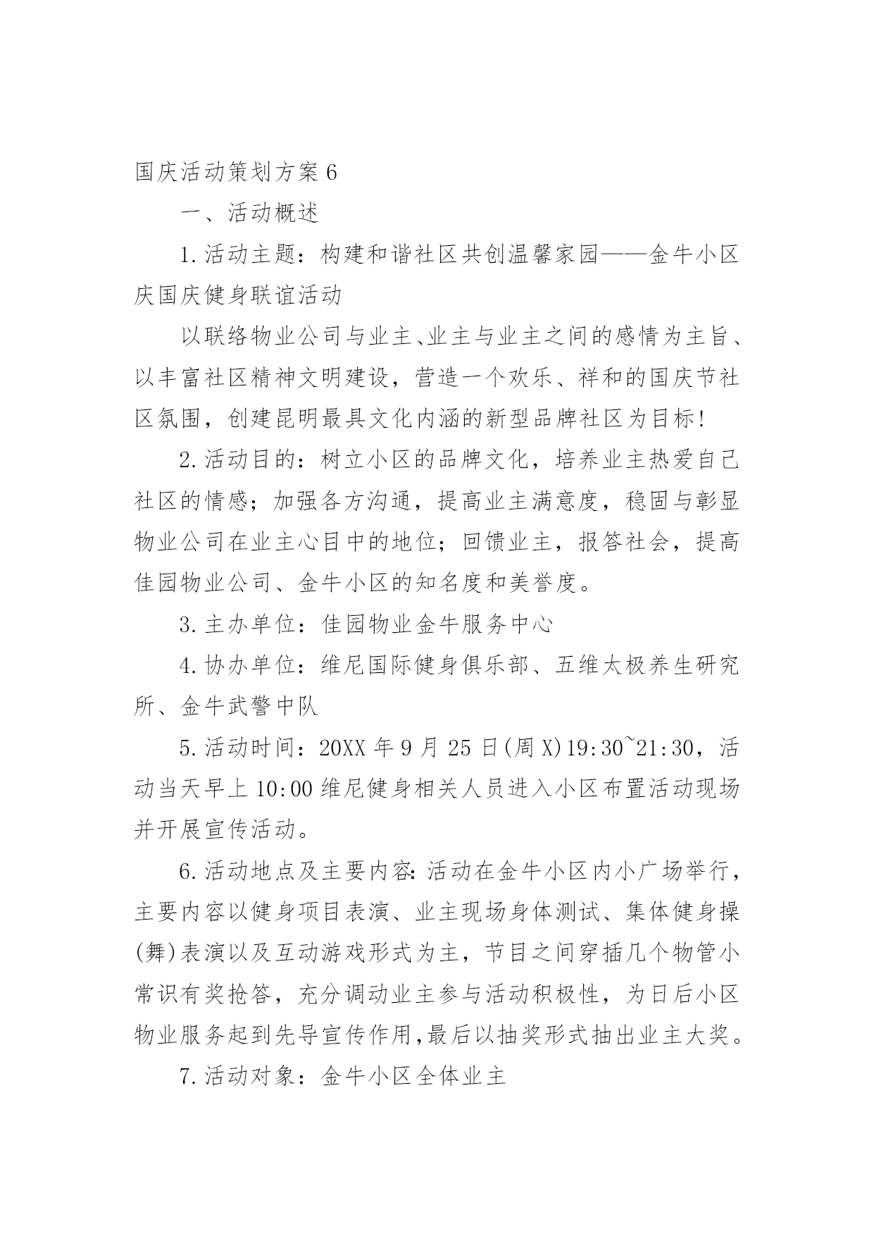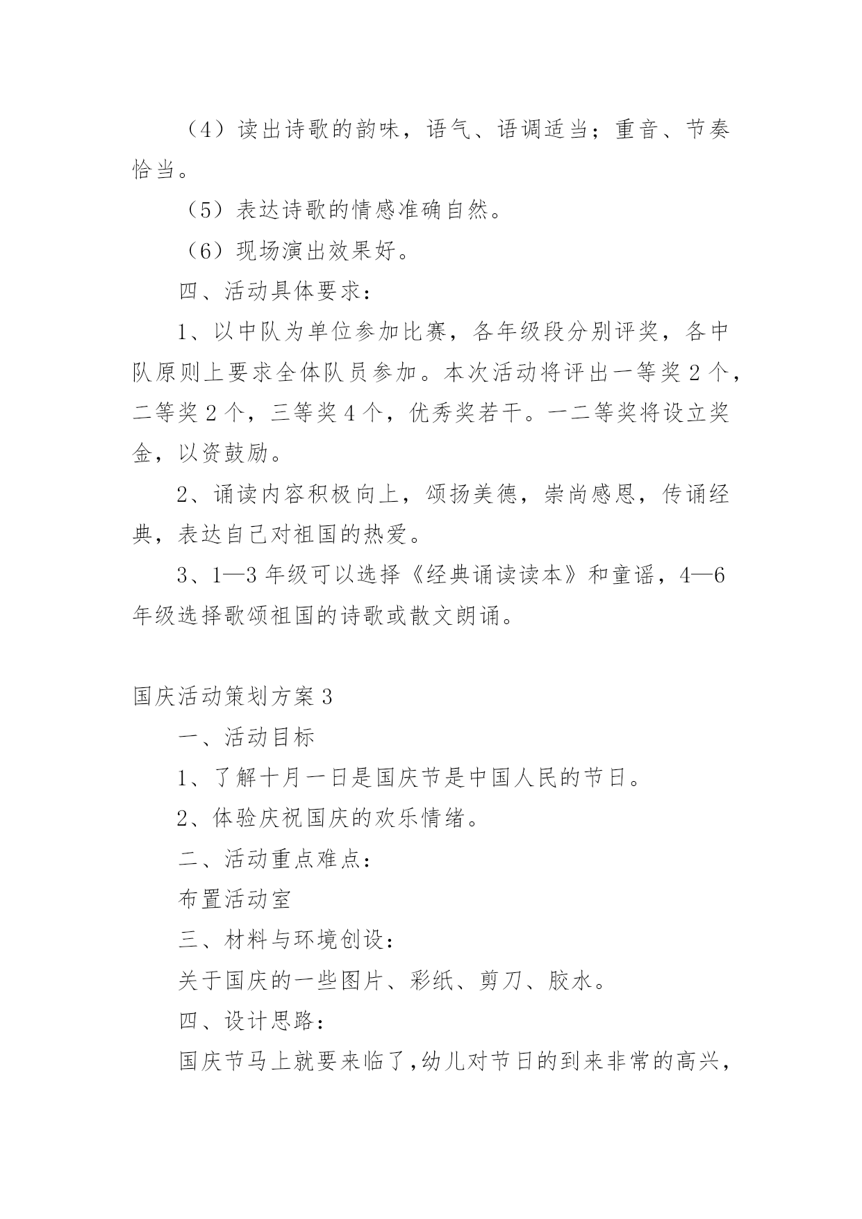 国庆活动策划方案为了保障活动顺利、圆满进行,就需要我们事先制定活动方案,一份好的活动方案一定会注重受众的参与性及互动性。怎样写活动方案才更能起到其作用呢?以下是小编精心整理的2022国庆活动策划方案(通用8篇),仅供参考,欢迎大家阅读。国庆活动策划方案1为进一步推动班集体建设年工作,激发少先队员的爱国主义情感,增强少先队员的集体荣誉感,进一步加强未成年人的思想道德建设,我校特开展“祖国,我为你骄傲;雅小,我为你自豪!”庆国庆系列活动。一、活动主题:“祖国,我为你骄傲;雅小,我为你自豪!”二、活动时间:20XX年X月X日三、活动内容:1、低年级:“祖国,我为你骄傲;雅小我为你自豪”童谣说唱比赛。可以根据班级的情况,由班主任从班中选择组队学生,人数根据情况自定。为了丰富童谣的表现形式,充实内容,活跃气氛,在童谣诵读时可以采用分角色、加动作、配音乐等不同形式,将表现和创新和谐地结合。时间是3~5分钟。2、中年级:“爱国、爱校、爱班”红歌大合唱比赛,以齐唱、合唱为主要表现形式,演唱作品可以根据艺术作品的内容进行合理的创编。以班为单位组成合唱队,人数不少于20人。评分:要求符合主题、健康向上,整齐合拍、音准到位,精神饱满、真挚感人,服装统一,组织纪律好,上下场快静齐,各班设指挥一名,限由本班学生担任,如有特色,可酌情加分。3、高年级:“爱国、爱校、爱班”集体诗朗诵比赛。以班为单位,人数不少于20人。诗歌内容健康向上,围绕“祖国,我为你骄傲;雅小,我为你自豪”开展,以音诗画的形式,时间不超过5分钟。四、活动要求:1、六年级学生统一穿着整齐,最好是校服。各中队长在活动开始前到队室领中队旗。2、加强学生纪律礼仪教育,注意会场秩序,给予同伴喝彩,争取组织奖。3、比赛要求全员参赛。4、各年段组奖项设置:一等奖1名;二等奖2名;三等奖3名。最佳组织奖1名。5、具体分工:各年段比赛活动由级部主任全权负责:安排主持人,评委评分,当日分会场组织,各班节目串联,主持词的撰写。大队部提供辅导小主持人的培训。6、活动结束后,将活动材料整理交至大队部,各年级组并负责场地的卫生打扫。7、资料收集。整理材料上交少先队。国庆活动策划方案2一、活动目的:通过本次庆祝活动,体验庆祝国庆的欢乐情绪,萌发热爱祖国的情感。培养少先队员民族自豪感,调动每个孩子积极参与的热情,真切感受经典诵读的快乐,营造良好的校园艺术文化氛围。活动主题:“祖国在我心中”活动对象:全体师生活动时间:20XX年9月29日——20XX年9月30日二、活动准备:各班布置教室黑板板画主题悬挂标语气球、彩带若干。三、活动内容:1、出一期“祖国在我心中”为主题的黑板报。请各班于9月29日前完成。2、全校开展“歌颂祖国、爱我中华”的经典诵读比赛。时间为9月30日下午两点。3、评比标准:(1)仪态大方、着装得体、动作适当。(2)所选诗歌内容必须是以歌颂祖国为主题。思想健康向上,符合学生年龄特点。(3)普通话标准、声音洪亮。(4)读出诗歌的韵味,语气、语调适当;重音、节奏恰当。(5)表达诗歌的情感准确自然。(6)现场演出效果好。四、活动具体要求:1、以中队为单位参加比赛,各年级段分别评奖,各中队原则上要求全体队员参加。本次活动将评出一等奖2个,二等奖2个,三等奖4个,优秀奖若干。一二等奖将设立奖金,以资鼓励。2、诵读内容积极向上,颂扬美德,崇尚感恩,传诵经典,表达自己对祖国的热爱。3、1—3年级可以选择《经典诵读读本》和童谣,4—6年级选择歌颂祖国的诗歌或散文朗诵。国庆活动策划方案3一、活动目标1、了解十月一日是国庆节是中国人民的节日。2、体验庆祝国庆的欢乐情绪。二、活动重点难点:布置活动室三、材料与环境创设:关于国庆的一些图片、彩纸、剪刀、胶水。四、设计思路:国庆节马上就要来临了,幼儿对节日的到来非常的高兴,但我发现幼儿对于国庆节的来意并不是很清楚。于是我设计了这节课让幼儿了解国庆的来意从而激发幼儿对祖国的热爱之情,并且自己动手操作布置活动室的环境体会节日的'愉快气氛。五、活动流程:观察图片——教师讲解——幼儿交流——幼儿操作。六、活动过程1、教师出示国庆的图片,幼儿观察图片,说说是什么节日。2、教师讲解让幼儿了解国庆的来意。3、幼儿交流如何布置活动室。4、幼儿动手操作。国庆活动策划方案4一、活动主题迎双节惠不停二、促销时间20xx年xx月xx日-xx月xx日三、活动目的1、借助“中秋节”、“国庆节”等节日的到来,策划实施一系列大型促销活动,刺激消费群,吸引目标消费群及潜在的消费群,限度地扩大销售额;2、通过72周年策划一系列与爱国有关的宣传活动,大力弘扬以爱国主义精神,扩大企业知名度,进一步树立商场“热爱祖国,关心教育”的社会形象。四、活动地点xx超市五、活动企划活动一:迎双节,惠不停,xx月xx日-xx月x