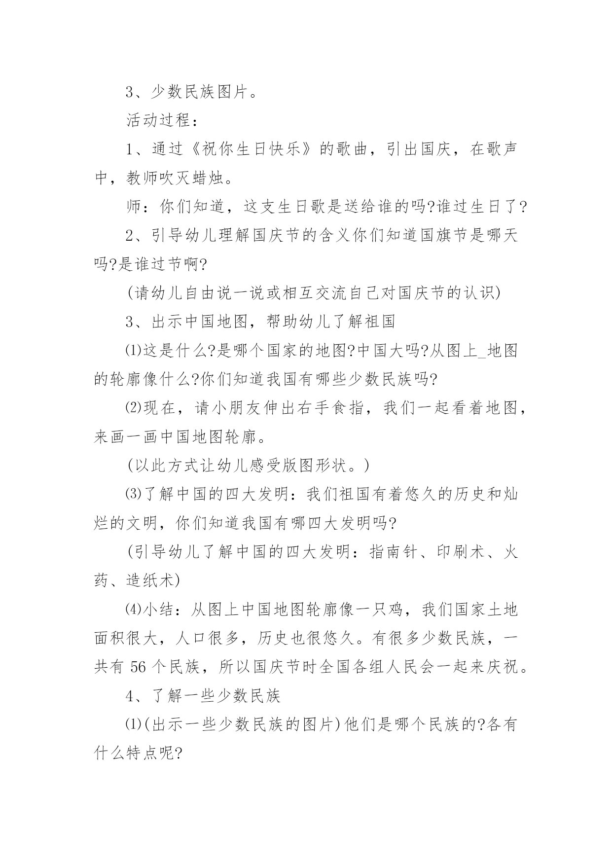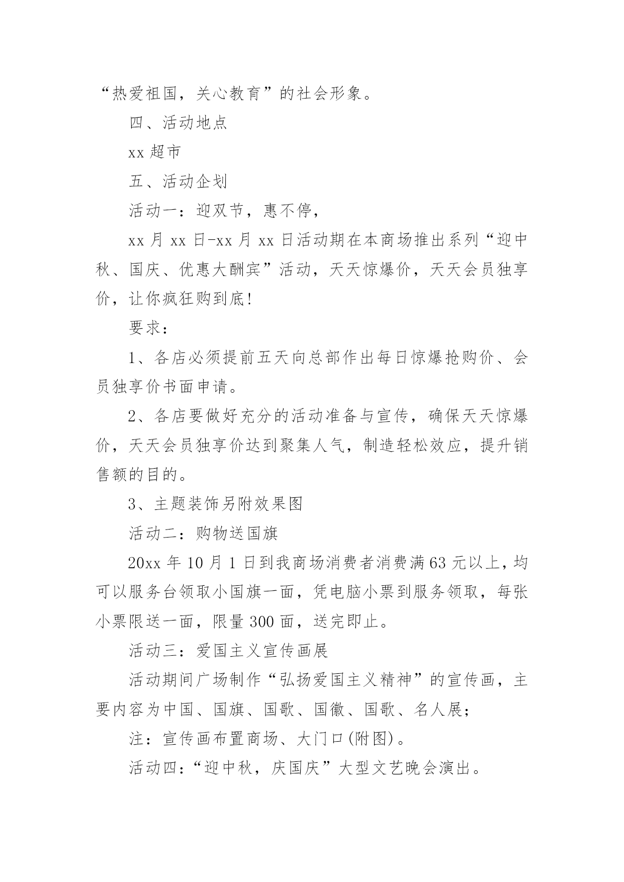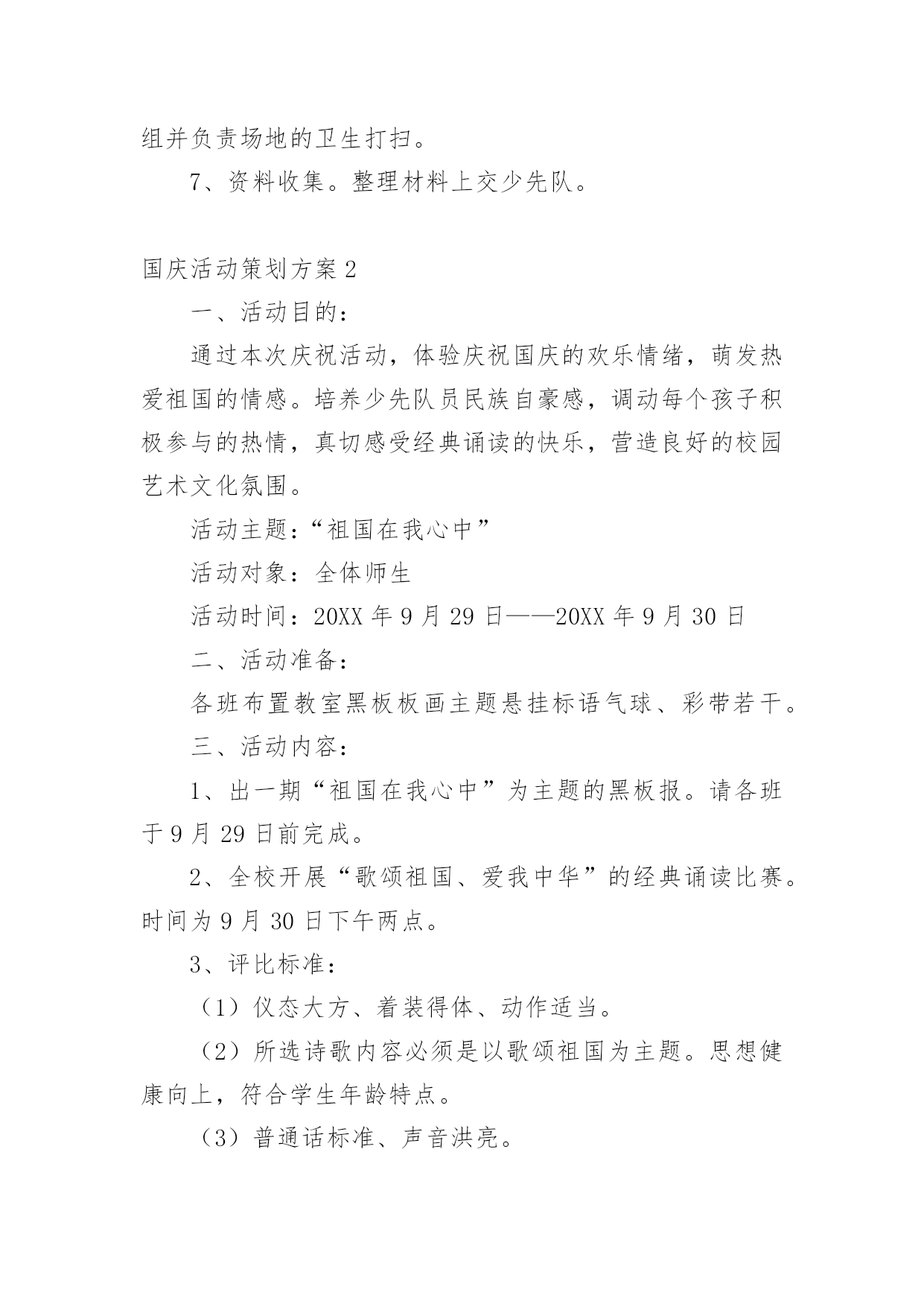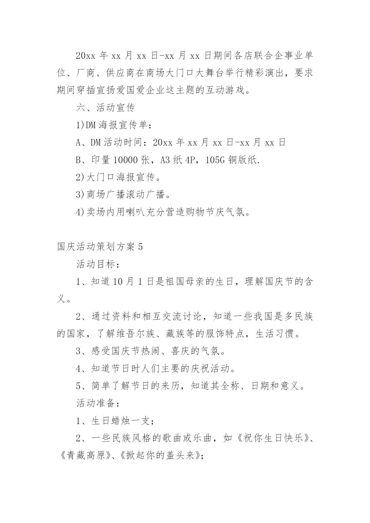 国庆活动策划方案为了保障活动顺利、圆满进行,就需要我们事先制定活动方案,一份好的活动方案一定会注重受众的参与性及互动性。怎样写活动方案才更能起到其作用呢?以下是小编精心整理的2022国庆活动策划方案(通用8篇),仅供参考,欢迎大家阅读。国庆活动策划方案1为进一步推动班集体建设年工作,激发少先队员的爱国主义情感,增强少先队员的集体荣誉感,进一步加强未成年人的思想道德建设,我校特开展“祖国,我为你骄傲;雅小,我为你自豪!”庆国庆系列活动。一、活动主题:“祖国,我为你骄傲;雅小,我为你自豪!”二、活动时间:20XX年X月X日三、活动内容:1、低年级:“祖国,我为你骄傲;雅小我为你自豪”童谣说唱比赛。可以根据班级的情况,由班主任从班中选择组队学生,人数根据情况自定。为了丰富童谣的表现形式,充实内容,活跃气氛,在童谣诵读时可以采用分角色、加动作、配音乐等不同形式,将表现和创新和谐地结合。时间是3~5分钟。2、中年级:“爱国、爱校、爱班”红歌大合唱比赛,以齐唱、合唱为主要表现形式,演唱作品可以根据艺术作品的内容进行合理的创编。以班为单位组成合唱队,人数不少于20人。评分:要求符合主题、健康向上,整齐合拍、音准到位,精神饱满、真挚感人,服装统一,组织纪律好,上下场快静齐,各班设指挥一名,限由本班学生担任,如有特色,可酌情加分。3、高年级:“爱国、爱校、爱班”集体诗朗诵比赛。以班为单位,人数不少于20人。诗歌内容健康向上,围绕“祖国,我为你骄傲;雅小,我为你自豪”开展,以音诗画的形式,时间不超过5分钟。四、活动要求:1、六年级学生统一穿着整齐,最好是校服。各中队长在活动开始前到队室领中队旗。2、加强学生纪律礼仪教育,注意会场秩序,给予同伴喝彩,争取组织奖。3、比赛要求全员参赛。4、各年段组奖项设置:一等奖1名;二等奖2名;三等奖3名。最佳组织奖1名。5、具体分工:各年段比赛活动由级部主任全权负责:安排主持人,评委评分,当日分会场组织,各班节目串联,主持词的撰写。大队部提供辅导小主持人的培训。6、活动结束后,将活动材料整理交至大队部,各年级组并负责场地的卫生打扫。7、资料收集。整理材料上交少先队。国庆活动策划方案2一、活动目的:通过本次庆祝活动,体验庆祝国庆的欢乐情绪,萌发热爱祖国的情感。培养少先队员民族自豪感,调动每个孩子积极参与的热情,真切感受经典诵读的快乐,营造良好的校园艺术文化氛围。活动主题:“祖国在我心中”活动对象:全体师生活动时间:20XX年9月29日——20XX年9月30日二、活动准备:各班布置教室黑板板画主题悬挂标语气球、彩带若干。三、活动内容:1、出一期“祖国在我心中”为主题的黑板报。请各班于9月29日前完成。2、全校开展“歌颂祖国、爱我中华”的经典诵读比赛。时间为9月30日下午两点。3、评比标准:(1)仪态大方、着装得体、动作适当。(2)所选诗歌内容必须是以歌颂祖国为主题。思想健康向上,符合学生年龄特点。(3)普通话标准、声音洪亮。(4)读出诗歌的韵味,语气、语调适当;重音、节奏恰当。(5)表达诗歌的情感准确自然。(6)现场演出效果好。四、活动具体要求:1、以中队为单位参加比赛,各年级段分别评奖,各中队原则上要求全体队员参加。本次活动将评出一等奖2个,二等奖2个,三等奖4个,优秀奖若干。一二等奖将设立奖金,以资鼓励。2、诵读内容积极向上,颂扬美德,崇尚感恩,传诵经典,表达自己对祖国的热爱。3、1—3年级可以选择《经典诵读读本》和童谣,4—6年级选择歌颂祖国的诗歌或散文朗诵。国庆活动策划方案3一、活动目标1、了解十月一日是国庆节是中国人民的节日。2、体验庆祝国庆的欢乐情绪。二、活动重点难点:布置活动室三、材料与环境创设:关于国庆的一些图片、彩纸、剪刀、胶水。四、设计思路:国庆节马上就要来临了,幼儿对节日的到来非常的高兴,但我发现幼儿对于国庆节的来意并不是很清楚。于是我设计了这节课让幼儿了解国庆的来意从而激发幼儿对祖国的热爱之情,并且自己动手操作布置活动室的环境体会节日的'愉快气氛。五、活动流程:观察图片——教师讲解——幼儿交流——幼儿操作。六、活动过程1、教师出示国庆的图片,幼儿观察图片,说说是什么节日。2、教师讲解让幼儿了解国庆的来意。3、幼儿交流如何布置活动室。4、幼儿动手操作。国庆活动策划方案4一、活动主题迎双节惠不停二、促销时间20xx年xx月xx日-xx月xx日三、活动目的1、借助“中秋节”、“国庆节”等节日的到来,策划实施一系列大型促销活动,刺激消费群,吸引目标消费群及潜在的消费群,限度地扩大销售额;2、通过72周年策划一系列与爱国有关的宣传活动,大力弘扬以爱国主义精神,扩大企业知名度,进一步树立商场“热爱祖国,关心教育”的社会形象。四、活动地点xx超市五、活动企划活动一:迎双节,惠不停,xx月xx日-xx月x