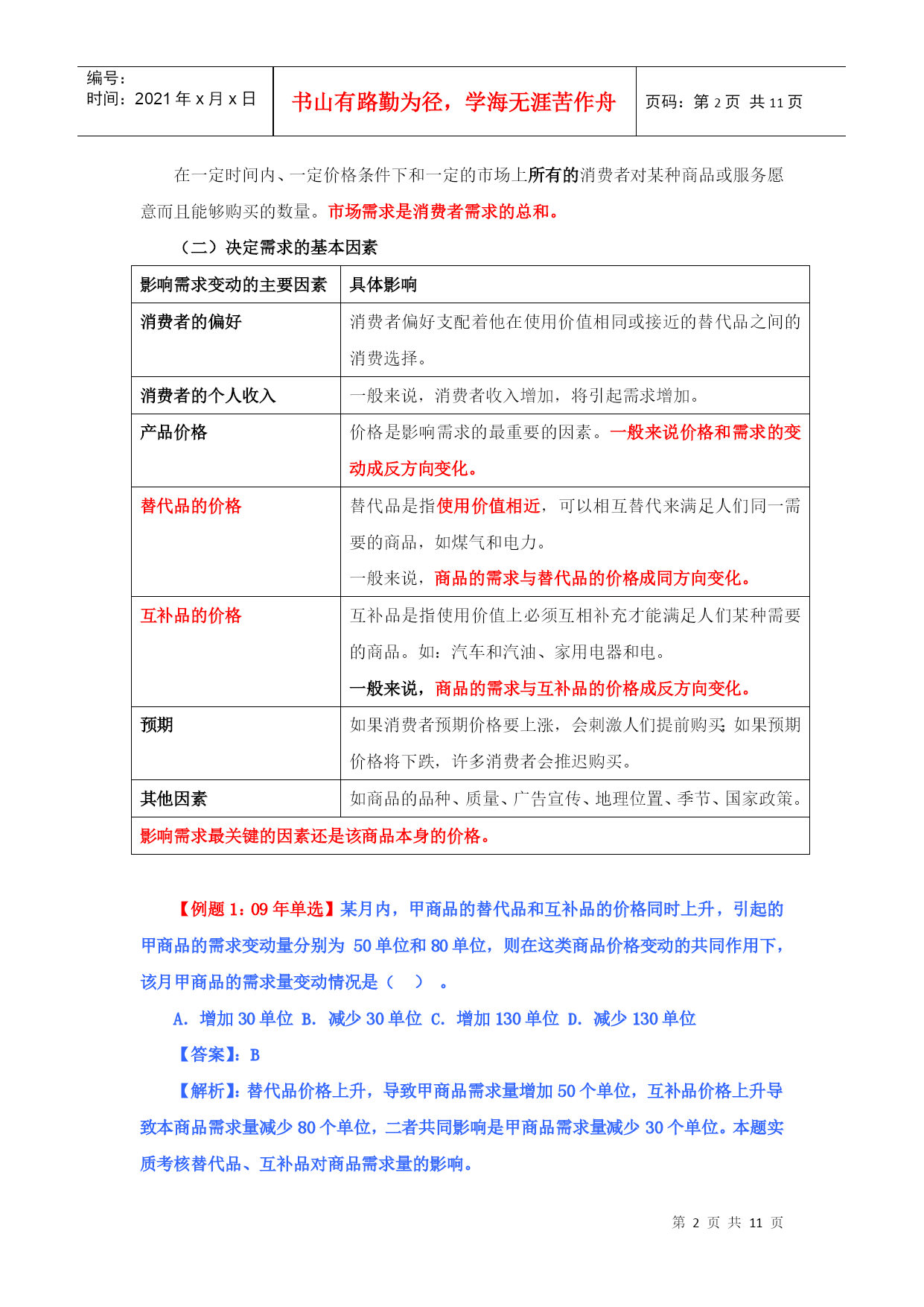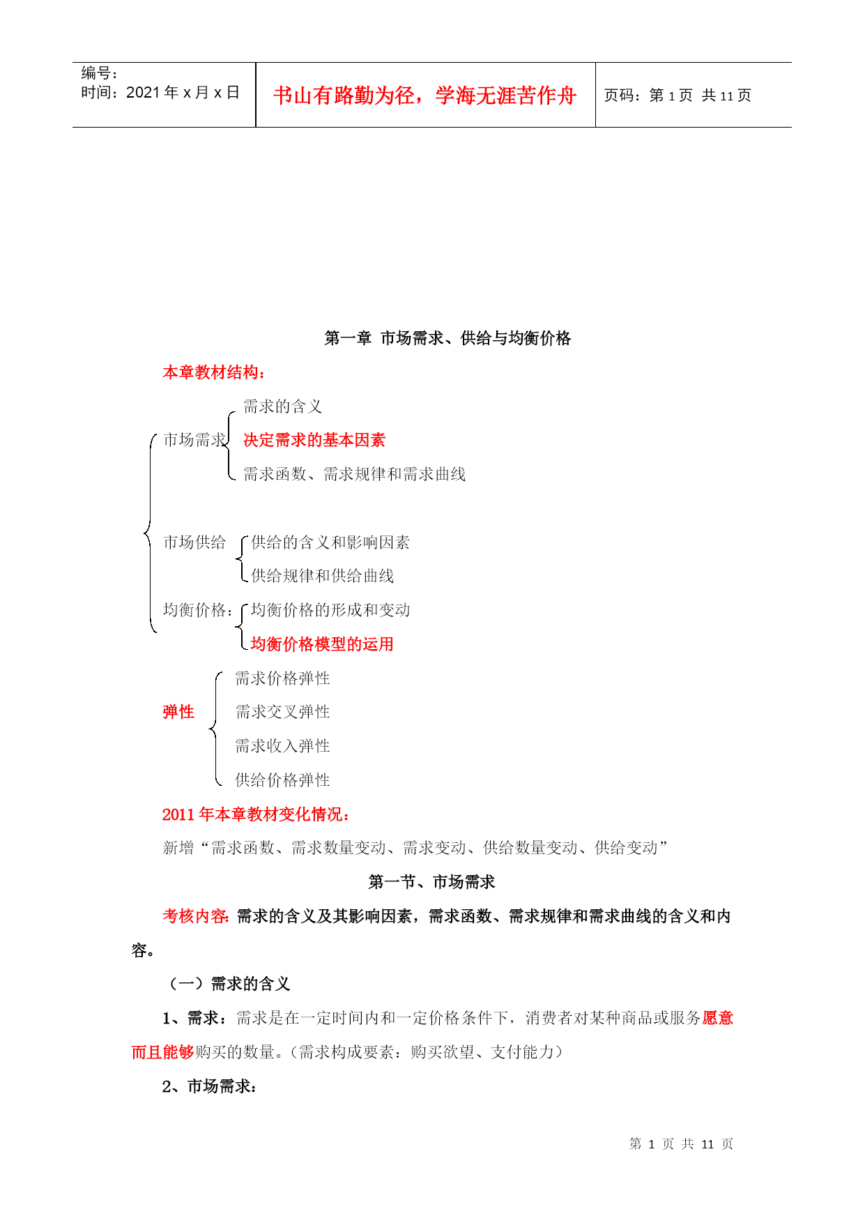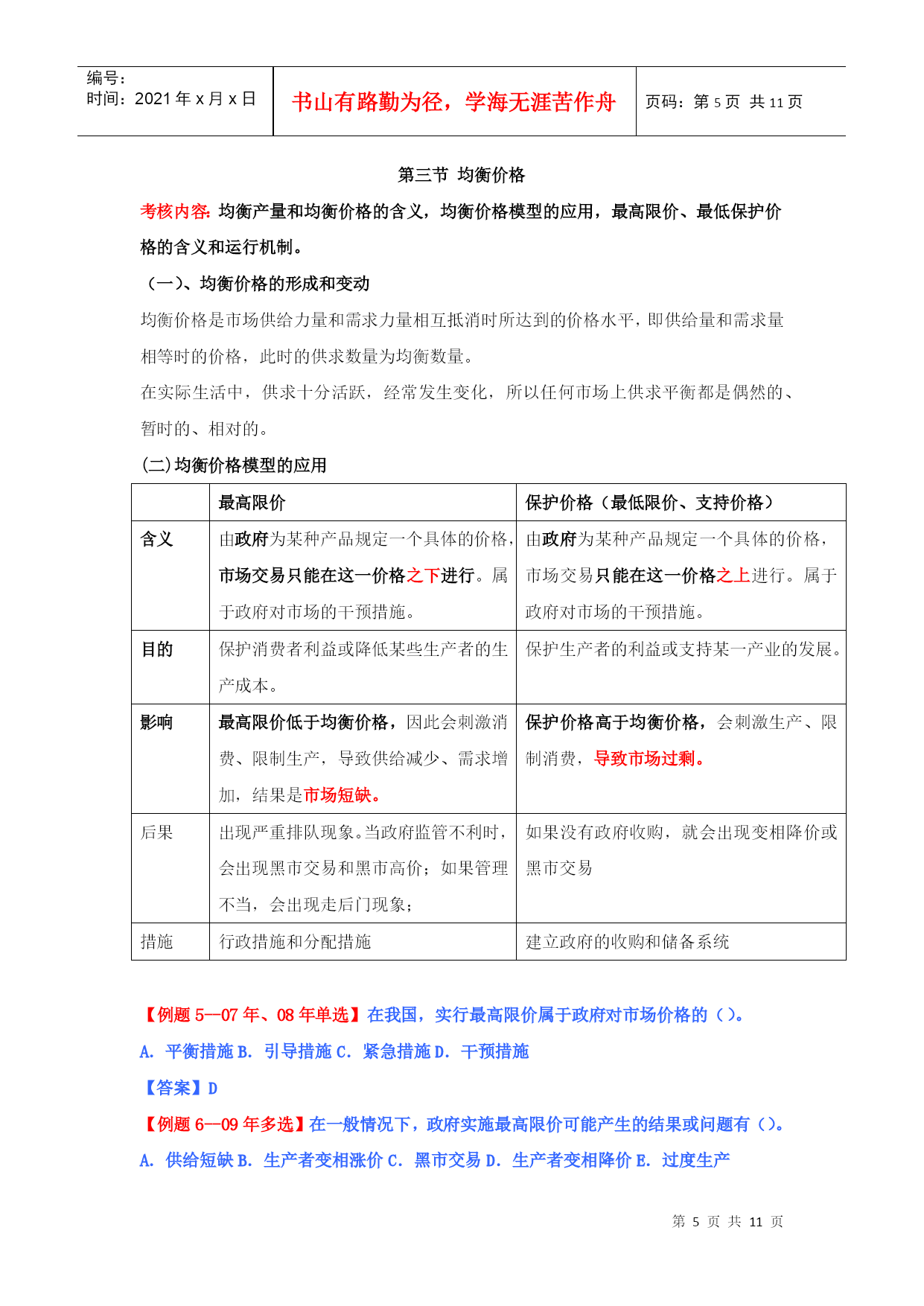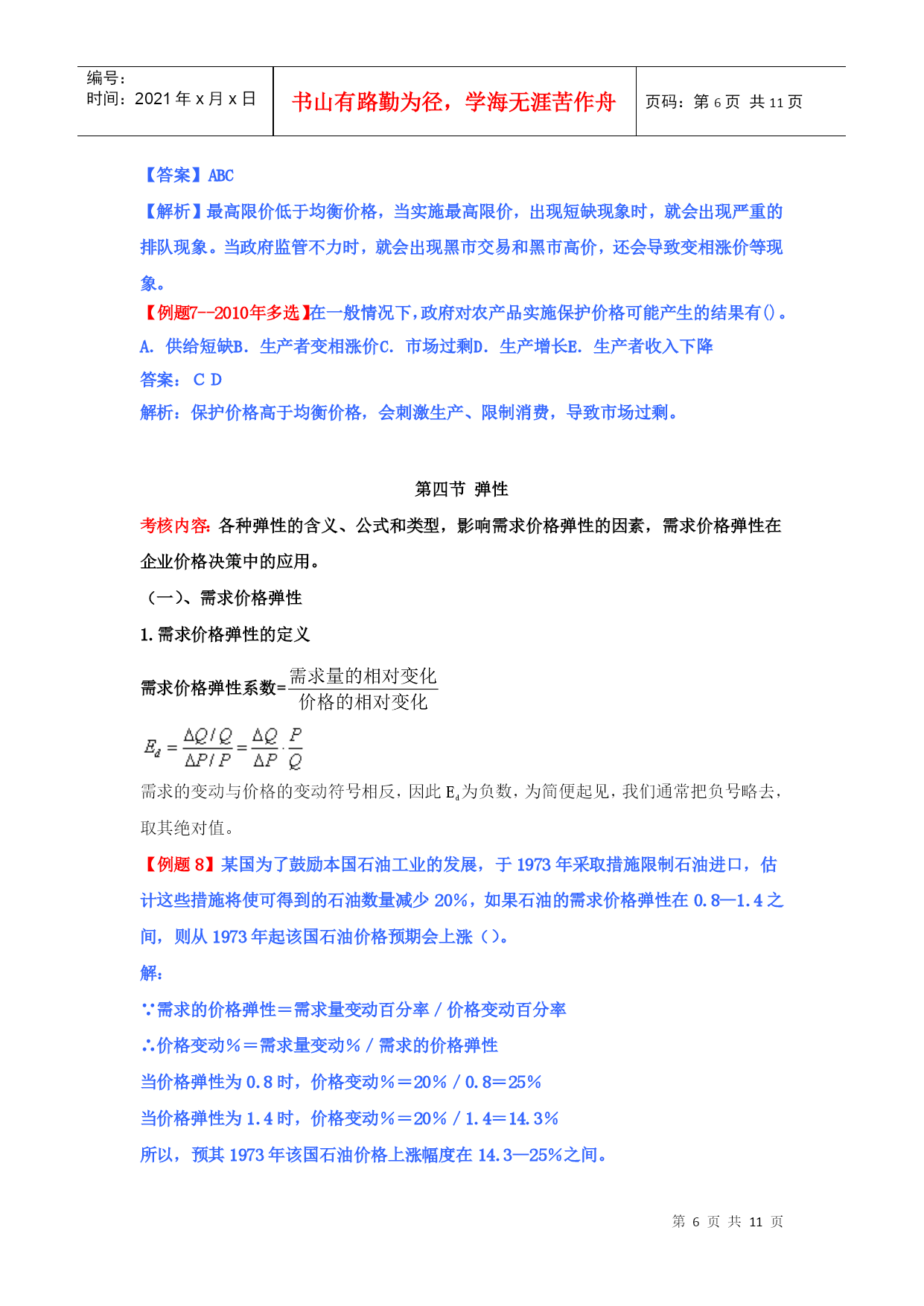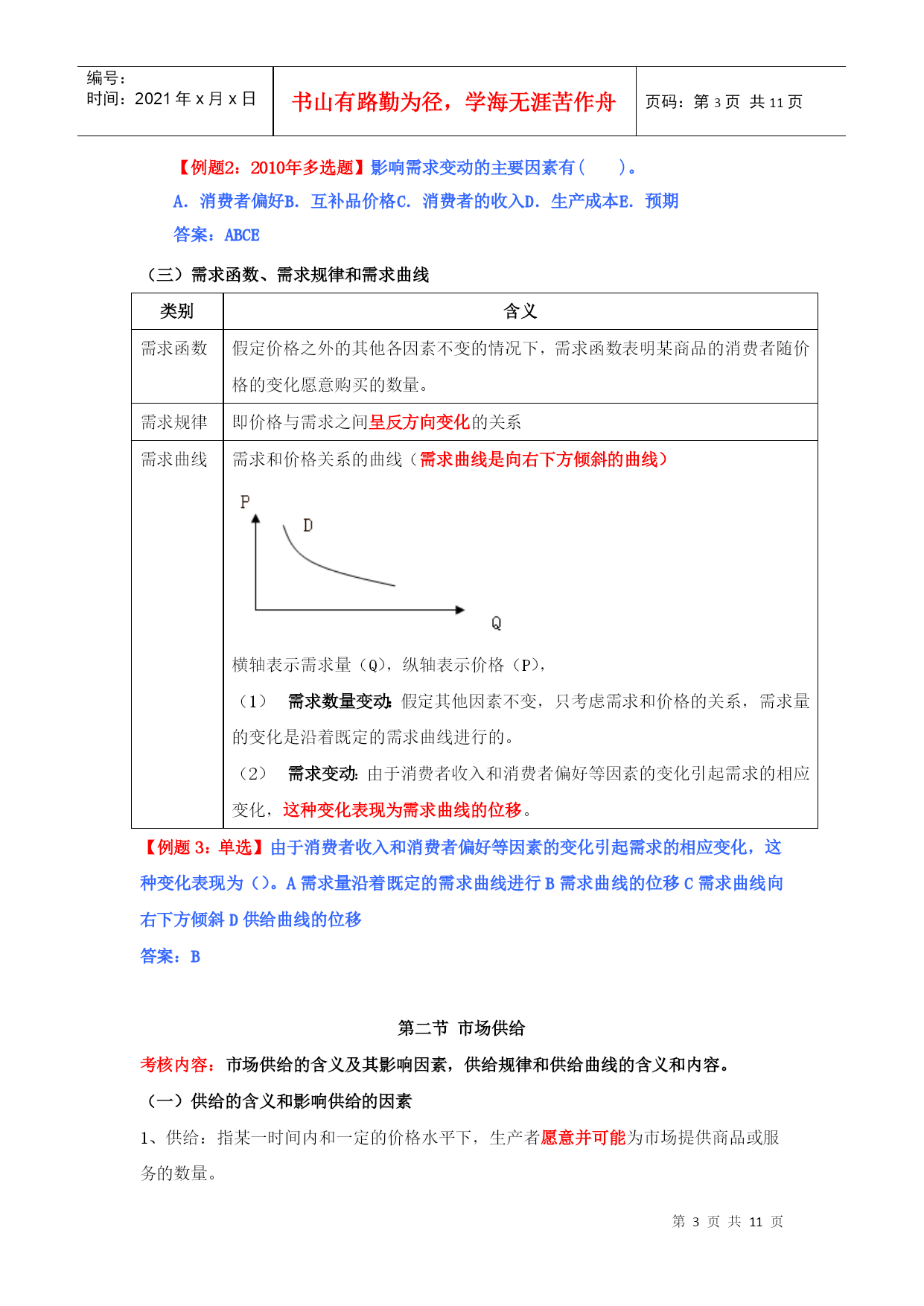 编号:时间:2021年x月x日书山有路勤为径,学海无涯苦作舟页码:第PAGE11页共NUMPAGES11页第PAGE\*MERGEFORMAT11页共NUMPAGES\*MERGEFORMAT11页HYPERLINK""市场需求、供给与均衡价格本章教材结构:需求的含义市场需求决定需求的基本因素需求函数、需求规律和需求曲线市场供给供给的含义和影响因素供给规律和供给曲线均衡价格:均衡价格的形成和变动均衡价格模型的运用需求价格弹性弹性需求交叉弹性需求收入弹性供给价格弹性2011年本章教材变化情况:新增“需求函数、需求数量变动、需求变动、供给数量变动、供给变动”第一节、市场需求考核内容:需求的含义及其影响因素,需求函数、需求规律和需求曲线的含义和内容。(一)需求的含义1、需求:需求是在一定时间内和一定价格条件下,消费者对某种商品或服务愿意而且能够购买的数量。(需求构成要素:购买欲望、支付能力)2、市场需求:在一定时间内、一定价格条件下和一定的市场上所有的消费者对某种商品或服务愿意而且能够购买的数量。市场需求是消费者需求的总和。(二)决定需求的基本因素影响需求变动的主要因素具体影响消费者的偏好消费者偏好支配着他在使用价值相同或接近的替代品之间的消费选择。消费者的个人收入一般来说,消费者收入增加,将引起需求增加。产品价格价格是影响需求的最重要的因素。一般来说价格和需求的变动成反方向变化。替代品的价格替代品是指使用价值相近,可以相互替代来满足人们同一需要的商品,如煤气和电力。一般来说,商品的需求与替代品的价格成同方向变化。互补品的价格互补品是指使用价值上必须互相补充才能满足人们某种需要的商品。如:汽车和汽油、家用电器和电。一般来说,商品的需求与互补品的价格成反方向变化。预期如果消费者预期价格要上涨,会刺激人们提前购买;如果预期价格将下跌,许多消费者会推迟购买。其他因素如商品的品种、质量、广告宣传、地理位置、季节、国家政策。影响需求最关键的因素还是该商品本身的价格。【例题1:09年单选】某月内,甲商品的替代品和互补品的价格同时上升,引起的甲商品的需求变动量分别为50单位和80单位,则在这类商品价格变动的共同作用下,该月甲商品的需求量变动情况是()。A.增加30单位B.减少30单位C.增加130单位D.减少130单位【答案】:B【解析】:替代品价格上升,导致甲商品需求量增加50个单位,互补品价格上升导致本商品需求量减少80个单位,二者共同影响是甲商品需求量减少30个单位。本题实质考核替代品、互补品对商品需求量的影响。【例题2:2010年多选题】影响需求变动的主要因素有()。A.消费者偏好B.互补品价格C.消费者的收入D.生产成本E.预期答案:ABCE(三)需求函数、需求规律和需求曲线类别含义需求函数假定价格之外的其他各因素不变的情况下,需求函数表明某商品的消费者随价格的变化愿意购买的数量。需求规律即价格与需求之间呈反方向变化的关系需求曲线需求和价格关系的曲线(需求曲线是向右下方倾斜的曲线)横轴表示需求量(Q),纵轴表示价格(P),需求数量变动:假定其他因素不变,只考虑需求和价格的关系,需求量的变化是沿着既定的需求曲线进行的。需求变动:由于消费者收入和消费者偏好等因素的变化引起需求的相应变化,这种变化表现为需求曲线的位移。【例题3:单选】由于消费者收入和消费者偏好等因素的变化引起需求的相应变化,这种变化表现为()。A需求量沿着既定的需求曲线进行B需求曲线的位移C需求曲线向右下方倾斜D供给曲线的位移答案:B第二节市场供给考核内容:市场供给的含义及其影响因素,供给规律和供给曲线的含义和内容。(一)供给的含义和影响供给的因素1、供给:指某一时间内和一定的价格水平下,生产者愿意并可能为市场提供商品或服务的数量。2、市场供给是所有生产者供给的总和。3、影响供给的因素主要有:(1)产品价格。在其他条件不变的情况下,某种产品自身的价格和其供给的变动成正方向变化。(2)生产成本。在其他条件不变的情况下,某种产品自身的成本和其供给的变动成反方向变化。(3)生产技术。技术水平在一定程度上决定着生产成本并进而影响供给。(4)预期。(5)相关产品的价格。(6)其他因素。包括生产要素的价格以及国家政策等。(二)、供给函数、供给规律、供给曲线类别含义供给函数假定其他因素不变,只考虑某种商品供给量和该商品价格之间的关系。供给规律即价格与需求之间呈同方向变化的关系供给曲线供给和价格关系的曲线(供给曲线是向右上方倾斜的曲线)横轴表示供给量(Q),纵轴表示价格(P),供给数量变动:假定其他因素不变,只考虑供给和价格的关系