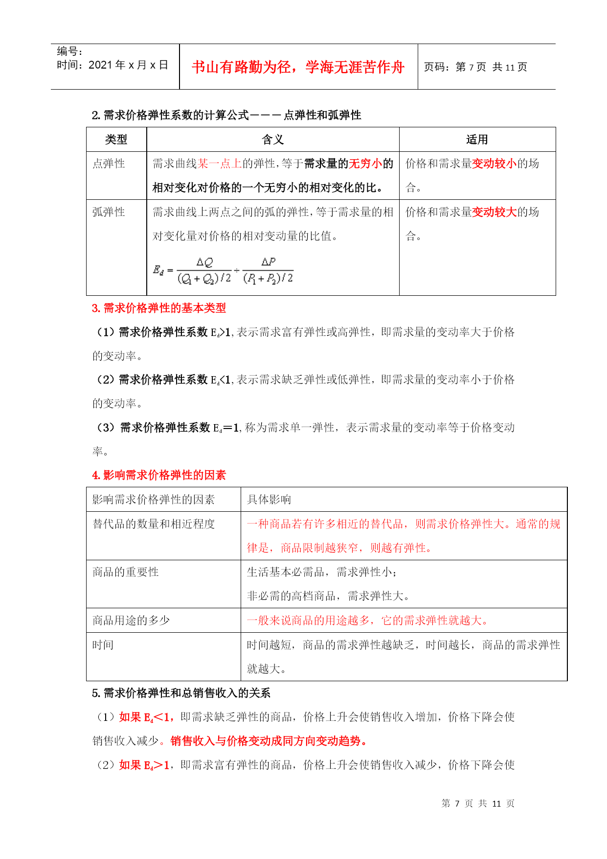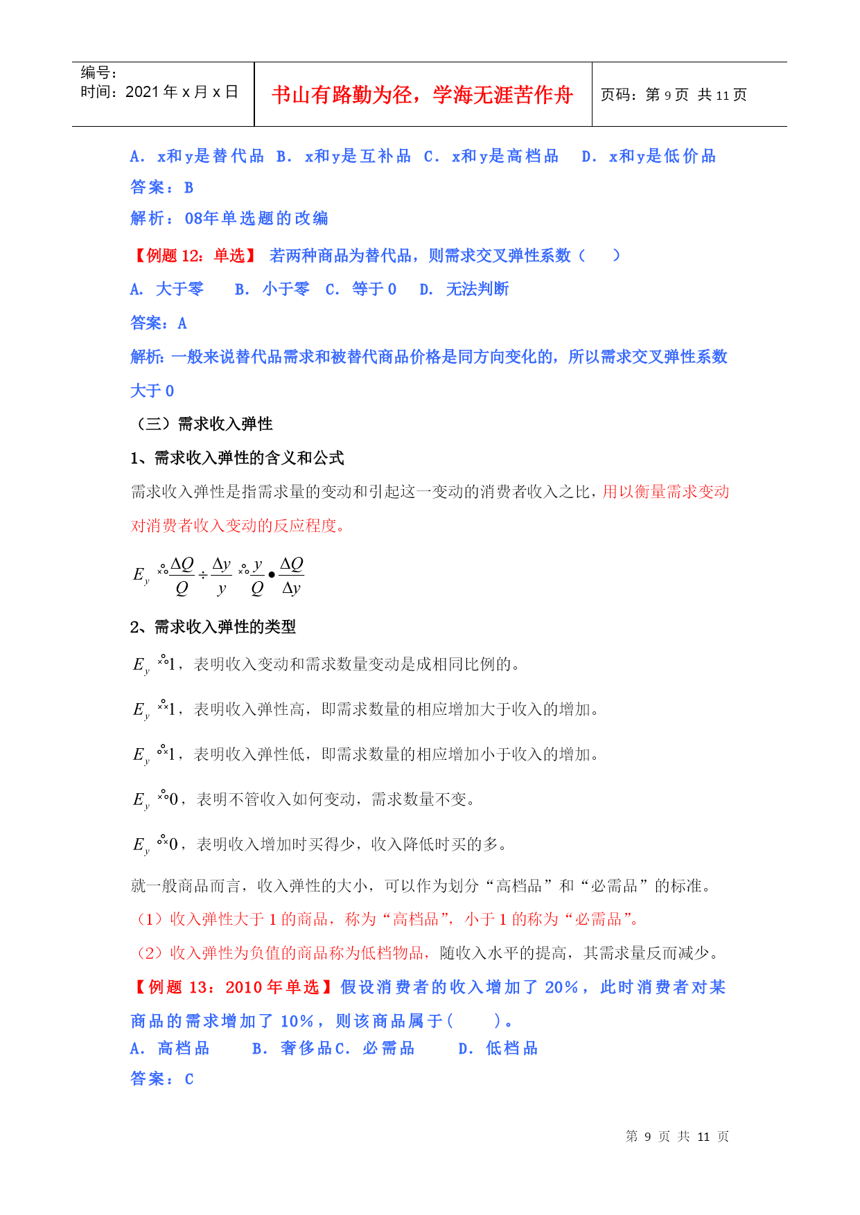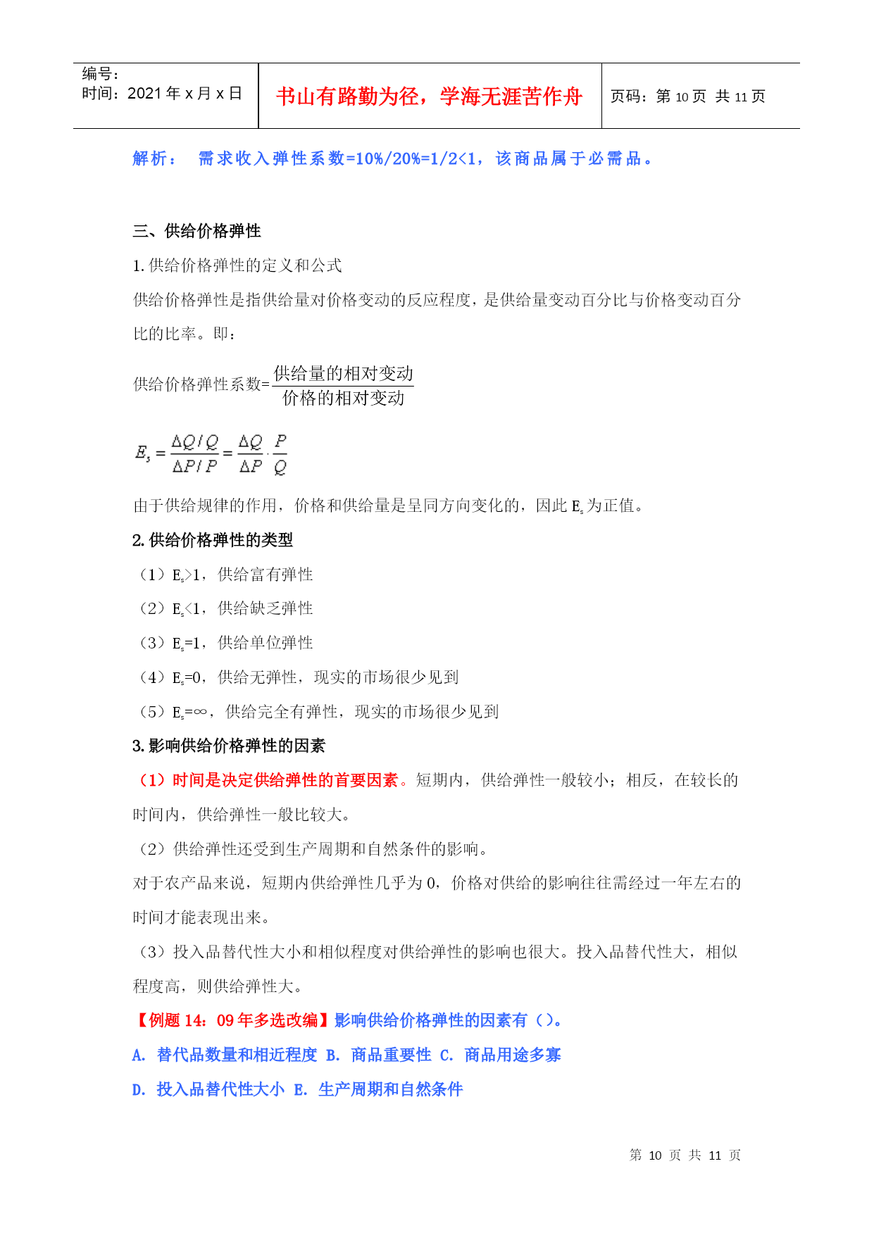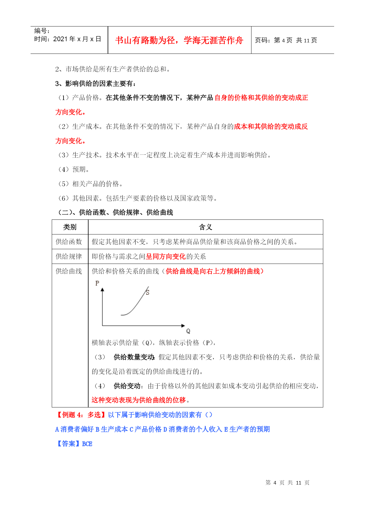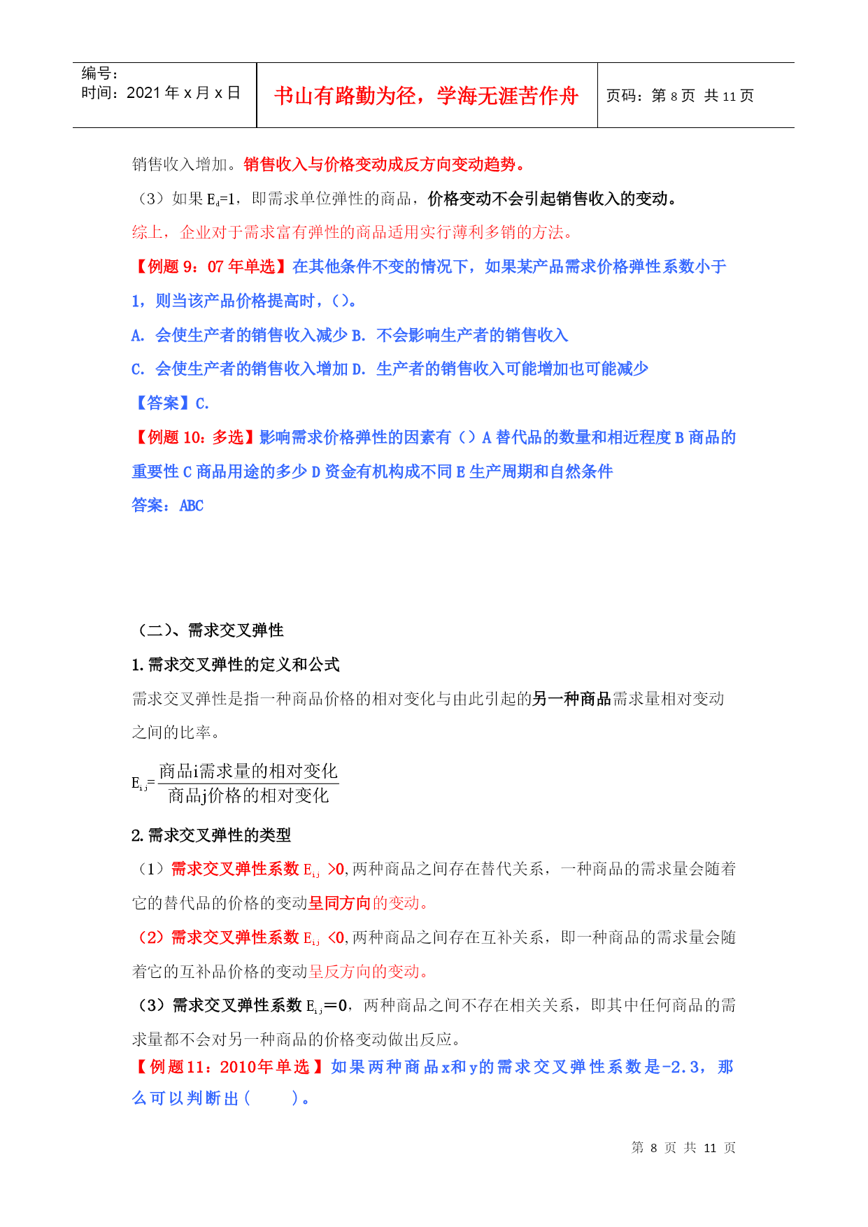 编号:时间:2021年x月x日书山有路勤为径,学海无涯苦作舟页码:第PAGE11页共NUMPAGES11页第PAGE\*MERGEFORMAT11页共NUMPAGES\*MERGEFORMAT11页HYPERLINK""市场需求、供给与均衡价格本章教材结构:需求的含义市场需求决定需求的基本因素需求函数、需求规律和需求曲线市场供给供给的含义和影响因素供给规律和供给曲线均衡价格:均衡价格的形成和变动均衡价格模型的运用需求价格弹性弹性需求交叉弹性需求收入弹性供给价格弹性2011年本章教材变化情况:新增“需求函数、需求数量变动、需求变动、供给数量变动、供给变动”第一节、市场需求考核内容:需求的含义及其影响因素,需求函数、需求规律和需求曲线的含义和内容。(一)需求的含义1、需求:需求是在一定时间内和一定价格条件下,消费者对某种商品或服务愿意而且能够购买的数量。(需求构成要素:购买欲望、支付能力)2、市场需求:在一定时间内、一定价格条件下和一定的市场上所有的消费者对某种商品或服务愿意而且能够购买的数量。市场需求是消费者需求的总和。(二)决定需求的基本因素影响需求变动的主要因素具体影响消费者的偏好消费者偏好支配着他在使用价值相同或接近的替代品之间的消费选择。消费者的个人收入一般来说,消费者收入增加,将引起需求增加。产品价格价格是影响需求的最重要的因素。一般来说价格和需求的变动成反方向变化。替代品的价格替代品是指使用价值相近,可以相互替代来满足人们同一需要的商品,如煤气和电力。一般来说,商品的需求与替代品的价格成同方向变化。互补品的价格互补品是指使用价值上必须互相补充才能满足人们某种需要的商品。如:汽车和汽油、家用电器和电。一般来说,商品的需求与互补品的价格成反方向变化。预期如果消费者预期价格要上涨,会刺激人们提前购买;如果预期价格将下跌,许多消费者会推迟购买。其他因素如商品的品种、质量、广告宣传、地理位置、季节、国家政策。影响需求最关键的因素还是该商品本身的价格。【例题1:09年单选】某月内,甲商品的替代品和互补品的价格同时上升,引起的甲商品的需求变动量分别为50单位和80单位,则在这类商品价格变动的共同作用下,该月甲商品的需求量变动情况是()。A.增加30单位B.减少30单位C.增加130单位D.减少130单位【答案】:B【解析】:替代品价格上升,导致甲商品需求量增加50个单位,互补品价格上升导致本商品需求量减少80个单位,二者共同影响是甲商品需求量减少30个单位。本题实质考核替代品、互补品对商品需求量的影响。【例题2:2010年多选题】影响需求变动的主要因素有()。A.消费者偏好B.互补品价格C.消费者的收入D.生产成本E.预期答案:ABCE(三)需求函数、需求规律和需求曲线类别含义需求函数假定价格之外的其他各因素不变的情况下,需求函数表明某商品的消费者随价格的变化愿意购买的数量。需求规律即价格与需求之间呈反方向变化的关系需求曲线需求和价格关系的曲线(需求曲线是向右下方倾斜的曲线)横轴表示需求量(Q),纵轴表示价格(P),需求数量变动:假定其他因素不变,只考虑需求和价格的关系,需求量的变化是沿着既定的需求曲线进行的。需求变动:由于消费者收入和消费者偏好等因素的变化引起需求的相应变化,这种变化表现为需求曲线的位移。【例题3:单选】由于消费者收入和消费者偏好等因素的变化引起需求的相应变化,这种变化表现为()。A需求量沿着既定的需求曲线进行B需求曲线的位移C需求曲线向右下方倾斜D供给曲线的位移答案:B第二节市场供给考核内容:市场供给的含义及其影响因素,供给规律和供给曲线的含义和内容。(一)供给的含义和影响供给的因素1、供给:指某一时间内和一定的价格水平下,生产者愿意并可能为市场提供商品或服务的数量。2、市场供给是所有生产者供给的总和。3、影响供给的因素主要有:(1)产品价格。在其他条件不变的情况下,某种产品自身的价格和其供给的变动成正方向变化。(2)生产成本。在其他条件不变的情况下,某种产品自身的成本和其供给的变动成反方向变化。(3)生产技术。技术水平在一定程度上决定着生产成本并进而影响供给。(4)预期。(5)相关产品的价格。(6)其他因素。包括生产要素的价格以及国家政策等。(二)、供给函数、供给规律、供给曲线类别含义供给函数假定其他因素不变,只考虑某种商品供给量和该商品价格之间的关系。供给规律即价格与需求之间呈同方向变化的关系供给曲线供给和价格关系的曲线(供给曲线是向右上方倾斜的曲线)横轴表示供给量(Q),纵轴表示价格(P),供给数量变动:假定其他因素不变,只考虑供给和价格的关系