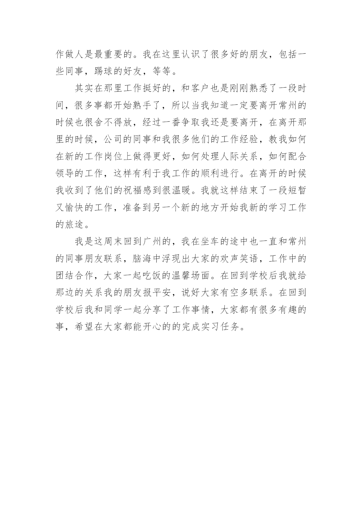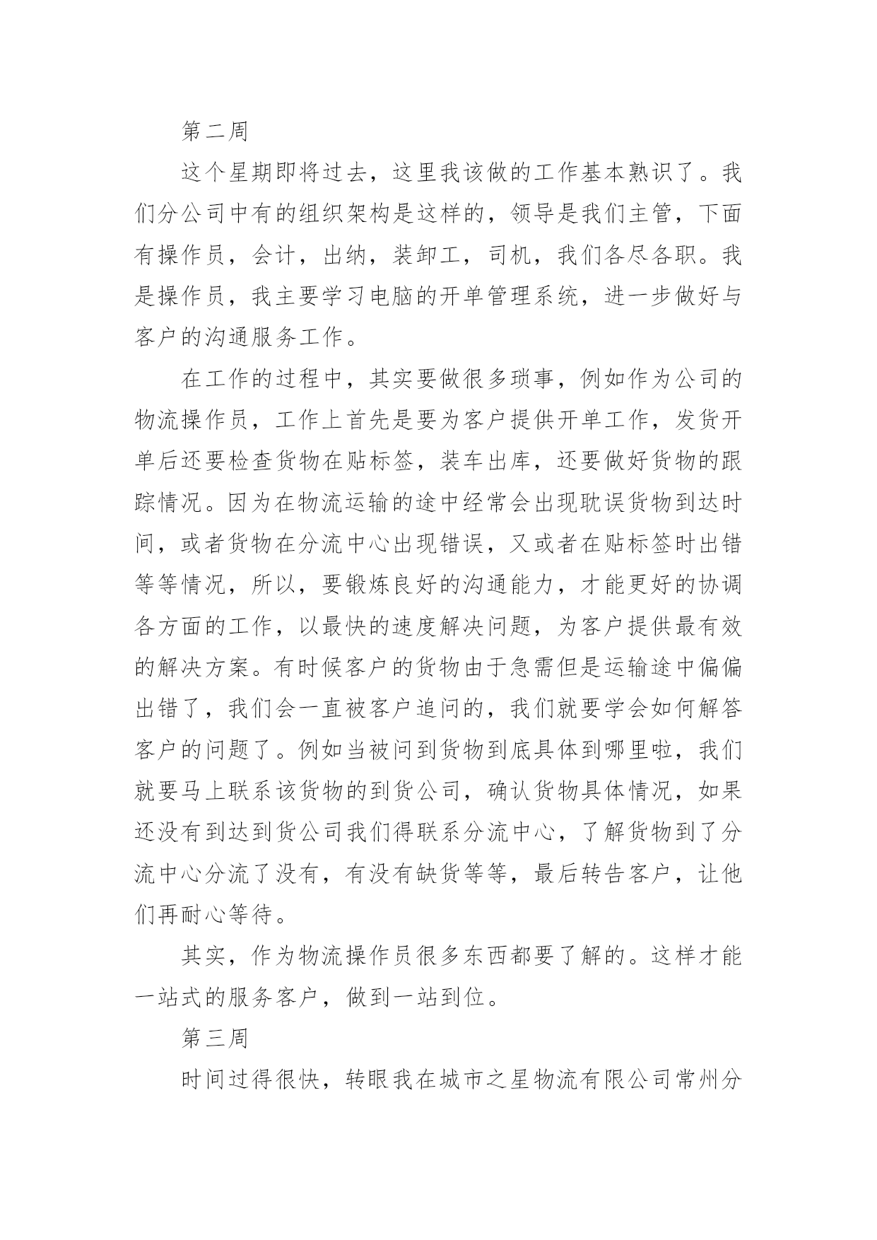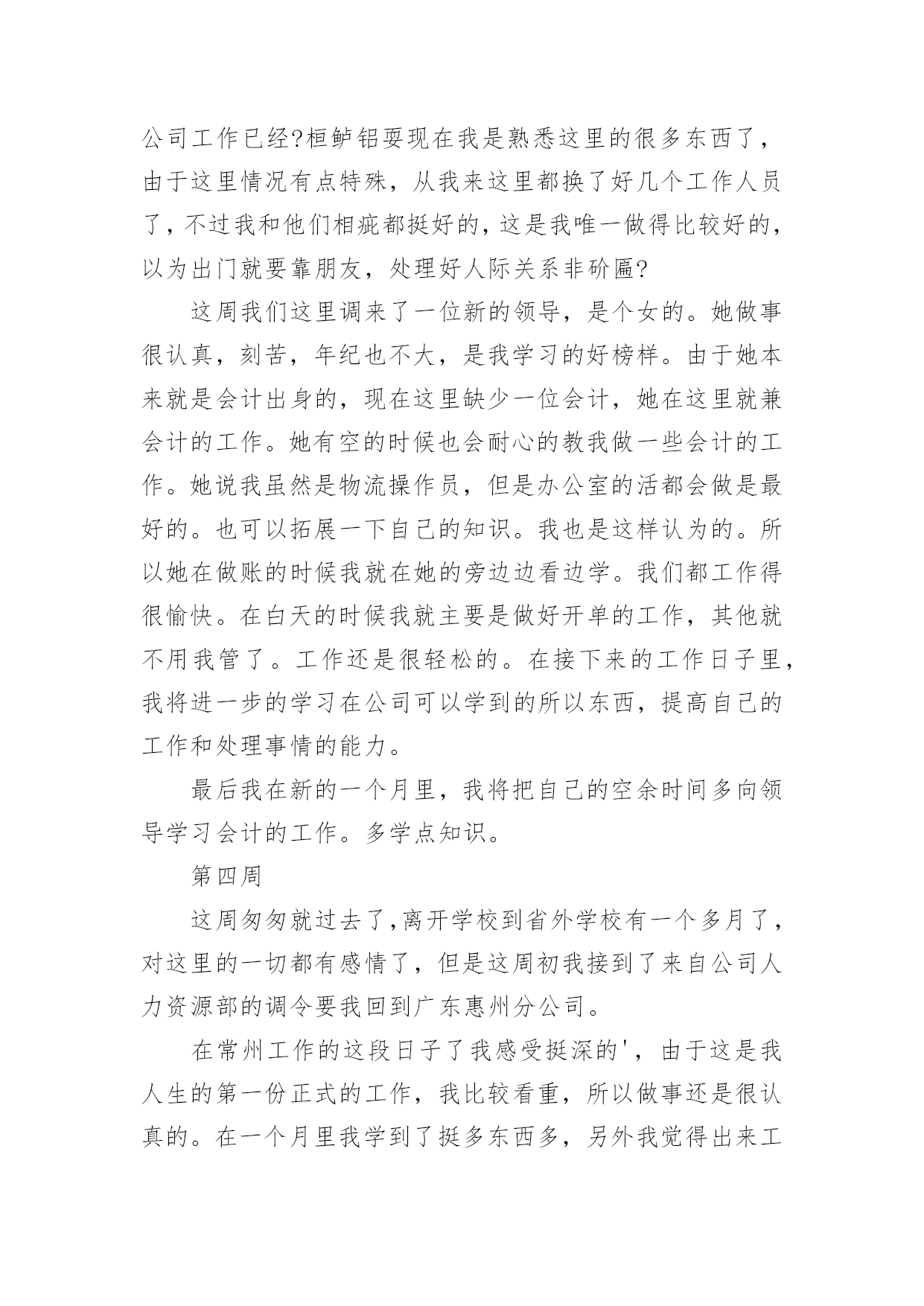 物流公司实习周记物流公司实习周记范文第一周我所在的公司叫福建城市之星物流运输有限公司,该公司有三百二十多个网点,我分配到的网点是广西柳州。公司从事的是物流运输服务。而我在的常州分公司是主要服务珠三角的往返运输。在公司里我从事物流操作员工作,这工作的任务主要是按照公司操作的标准流程来进行一系列与物流运输服务有关的工作。完成公司的业务量标准。具体工作如为客户发货开单,到货核单,提货开单,与客户协商,货物的跟踪,提供咨询服务等等。我到这里已经学习有一段时间了,我现在正在学习使用的是公司的运单管理系统OTM,该系统主要功能有开发运单,运单查询,客户的管理,报表等项目。我已经初步了解了该系统的运用。我平时就学习了解我们到货公司一些基本情况。以方便我的工作。我要知道从我这公司发货到到货公司的代码,运输的费用等,还要知道货物的定价标准等。对于我们分公司来说,公司的全部员工还必须懂得理货。因为很多时候客户查货是需要我们去核实。在这里我也学习仓库的管理,就是货物的码放。来到这里我东西,认识了一些有趣的人,经常和客户打交道,觉得自己学到了很多东西,从而更觉得自己还缺乏很多东西需要日后学习。第二周这个星期即将过去,这里我该做的工作基本熟识了。我们分公司中有的组织架构是这样的,领导是我们主管,下面有操作员,会计,出纳,装卸工,司机,我们各尽各职。我是操作员,我主要学习电脑的开单管理系统,进一步做好与客户的沟通服务工作。在工作的过程中,其实要做很多琐事,例如作为公司的物流操作员,工作上首先是要为客户提供开单工作,发货开单后还要检查货物在贴标签,装车出库,还要做好货物的跟踪情况。因为在物流运输的途中经常会出现耽误货物到达时间,或者货物在分流中心出现错误,又或者在贴标签时出错等等情况,所以,要锻炼良好的沟通能力,才能更好的协调各方面的工作,以最快的速度解决问题,为客户提供最有效的解决方案。有时候客户的货物由于急需但是运输途中偏偏出错了,我们会一直被客户追问的,我们就要学会如何解答客户的问题了。例如当被问到货物到底具体到哪里啦,我们就要马上联系该货物的到货公司,确认货物具体情况,如果还没有到达到货公司我们得联系分流中心,了解货物到了分流中心分流了没有,有没有缺货等等,最后转告客户,让他们再耐心等待。其实,作为物流操作员很多东西都要了解的。这样才能一站式的服务客户,做到一站到位。第三周时间过得很快,转眼我在城市之星物流有限公司常州分公司工作已经?桓鲈铝耍现在我是熟悉这里的很多东西了,由于这里情况有点特殊,从我来这里都换了好几个工作人员了,不过我和他们相疵都挺好的,这是我唯一做得比较好的,以为出门就要靠朋友,处理好人际关系非砎匾?这周我们这里调来了一位新的领导,是个女的。她做事很认真,刻苦,年纪也不大,是我学习的好榜样。由于她本来就是会计出身的,现在这里缺少一位会计,她在这里就兼会计的工作。她有空的时候也会耐心的教我做一些会计的工作。她说我虽然是物流操作员,但是办公室的活都会做是最好的。也可以拓展一下自己的知识。我也是这样认为的。所以她在做账的时候我就在她的旁边边看边学。我们都工作得很愉快。在白天的时候我就主要是做好开单的工作,其他就不用我管了。工作还是很轻松的。在接下来的工作日子里,我将进一步的学习在公司可以学到的所以东西,提高自己的工作和处理事情的能力。最后我在新的一个月里,我将把自己的空余时间多向领导学习会计的工作。多学点知识。第四周这周匆匆就过去了,离开学校到省外学校有一个多月了,对这里的一切都有感情了,但是这周初我接到了来自公司人力资源部的调令要我回到广东惠州分公司。在常州工作的这段日子了我感受挺深的',由于这是我人生的第一份正式的工作,我比较看重,所以做事还是很认真的。在一个月里我学到了挺多东西多,另外我觉得出来工作做人是最重要的。我在这里认识了很多好的朋友,包括一些同事,踢球的好友,等等。其实在那里工作挺好的,和客户也是刚刚熟悉了一段时间,很多事都开始熟手了,所以当我知道一定要离开常州的时候也很舍不得放,经过一番争取我还是要离开,在离开那里的时候,公司的同事和我很多他们的工作经验,教我如何在新的工作岗位上做得更好,如何处理人际关系,如何配合领导的工作,这样有利于我工作的顺利进行。在离开的时候我收到了他们的祝福感到很温暖。我就这样结束了一段短暂又愉快的工作,准备到另一个新的地方开始我新的学习工作的旅途。我是这周末回到广州的,我在坐车的途中也一直和常州的同事朋友联系,脑海中浮现出大家的欢声笑语,工作中的团结合作,大家一起吃饭的温馨场面。在回到学校后我就给那边的关系我的朋友报平安,说好大家有空多联系。在回到学校后我和同学一起分享了工作事情,大家都有很多有趣的事,希望在大家都能开心的的完成实习任务。
