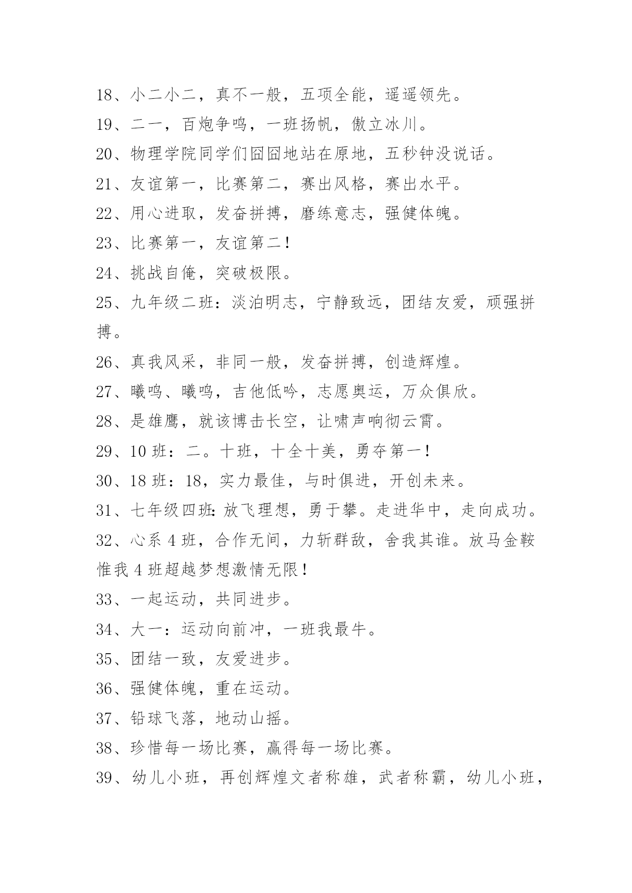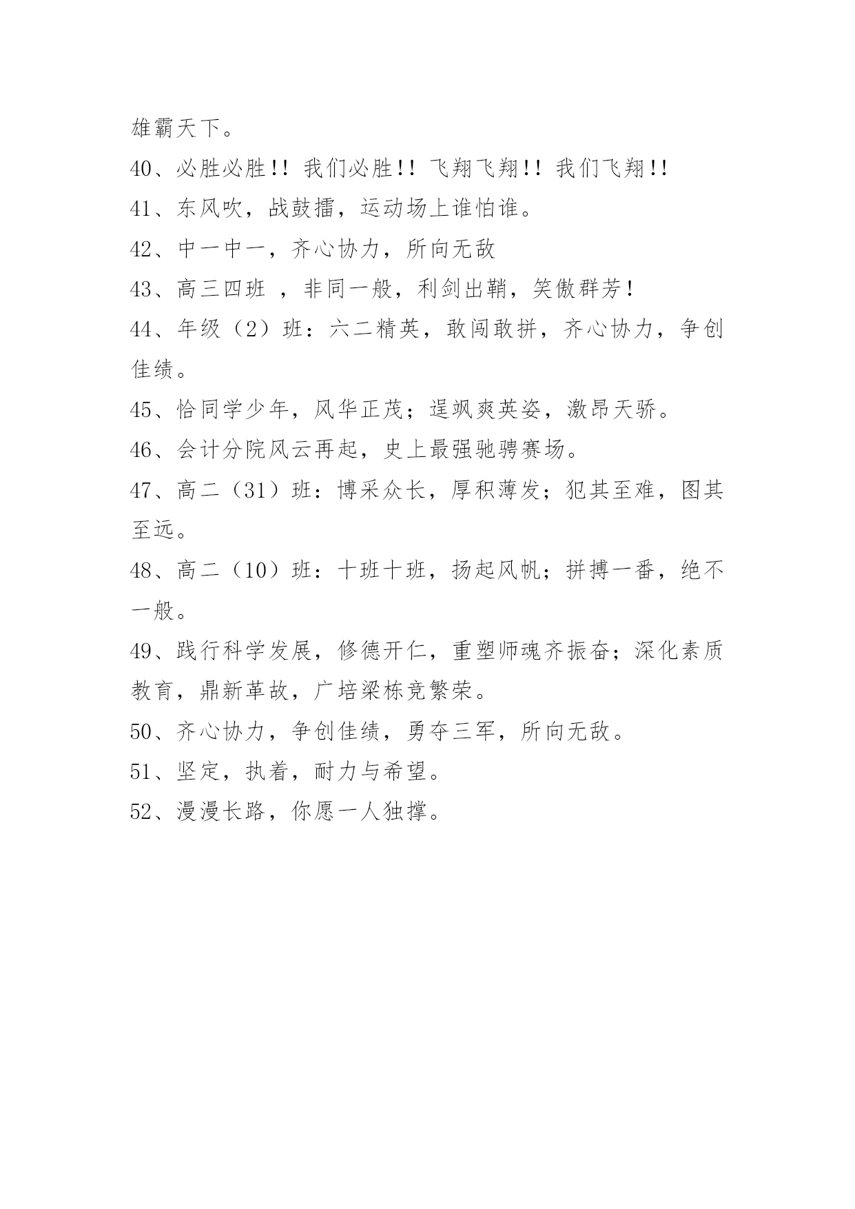 霸气的运动会口号精选霸气的运动会口号52条强健体魄,增强体质。以下是小编给各位读者分享的`霸气的运动会口号52条,感兴趣的一起来看看吧。1、扬帆把舵,奋勇拼搏,看我8班,锐不可当。2、展企业职工风采,树中州文明形象。3、我运动,我快乐我健康我做主。4、文者称雄,武者称霸,终极一班,雄霸天下。5、人小志气大比赛顶呱呱,宝宝班加油!6、放飞抱负,勇于攀登。热爱运动,走向成功。7、飞跃梦想,热情奔放。8、X班X班,永争第一,加油加油,力争上游。9、挑战奇迹,挑战梦想!10、班富我精神,强我体魄;少年风采,二一独占。11、山中猛虎,水中蛟龙,初二(五)班,卧虎藏龙。12、扬帆起航,劈波斩浪,初三六班班,再创辉煌。13、我们追求,绿叶为美文阅读网喝彩,风雨为我们做伴,用微笑洗去尘埃,把心点燃,照亮一切美好的未来。14、五一五一,就像雄鹰,飞向天空,走向第一。15、预备四班,团体协作,奥运精神。16、扬帆把舵,奋力拼搏,看我四班,气势磅礴。17、初二(6)秋风吹,战鼓擂,我们二(6)怕过谁!18、小二小二,真不一般,五项全能,遥遥领先。19、二一,百炮争鸣,一班扬帆,傲立冰川。20、物理学院同学们囧囧地站在原地,五秒钟没说话。21、友谊第一,比赛第二,赛出风格,赛出水平。22、用心进取,发奋拼搏,磨练意志,强健体魄。23、比赛第一,友谊第二!24、挑战自俺,突破极限。25、九年级二班:淡泊明志,宁静致远,团结友爱,顽强拼搏。26、真我风采,非同一般,发奋拼搏,创造辉煌。27、曦鸣、曦鸣,吉他低吟,志愿奥运,万众俱欣。28、是雄鹰,就该博击长空,让啸声响彻云霄。29、10班:二。十班,十全十美,勇夺第一!30、18班:18,实力最佳,与时俱进,开创未来。31、七年级四班:放飞理想,勇于攀。走进华中,走向成功。32、心系4班,合作无间,力斩群敌,舍我其谁。放马金鞍惟我4班超越梦想激情无限!33、一起运动,共同进步。34、大一:运动向前冲,一班我最牛。35、团结一致,友爱进步。36、强健体魄,重在运动。37、铅球飞落,地动山摇。38、珍惜每一场比赛,赢得每一场比赛。39、幼儿小班,再创辉煌文者称雄,武者称霸,幼儿小班,雄霸天下。40、必胜必胜!!我们必胜!!飞翔飞翔!!我们飞翔!!41、东风吹,战鼓擂,运动场上谁怕谁。42、中一中一,齐心协力,所向无敌43、高三四班,非同一般,利剑出鞘,笑傲群芳!44、年级(2)班:六二精英,敢闯敢拼,齐心协力,争创佳绩。45、恰同学少年,风华正茂;逞飒爽英姿,激昂天骄。46、会计分院风云再起,史上最强驰骋赛场。47、高二(31)班:博采众长,厚积薄发;犯其至难,图其至远。48、高二(10)班:十班十班,扬起风帆;拼搏一番,绝不一般。49、践行科学发展,修德开仁,重塑师魂齐振奋;深化素质教育,鼎新革故,广培梁栋竞繁荣。50、齐心协力,争创佳绩,勇夺三军,所向无敌。51、坚定,执着,耐力与希望。52、漫漫长路,你愿一人独撑。