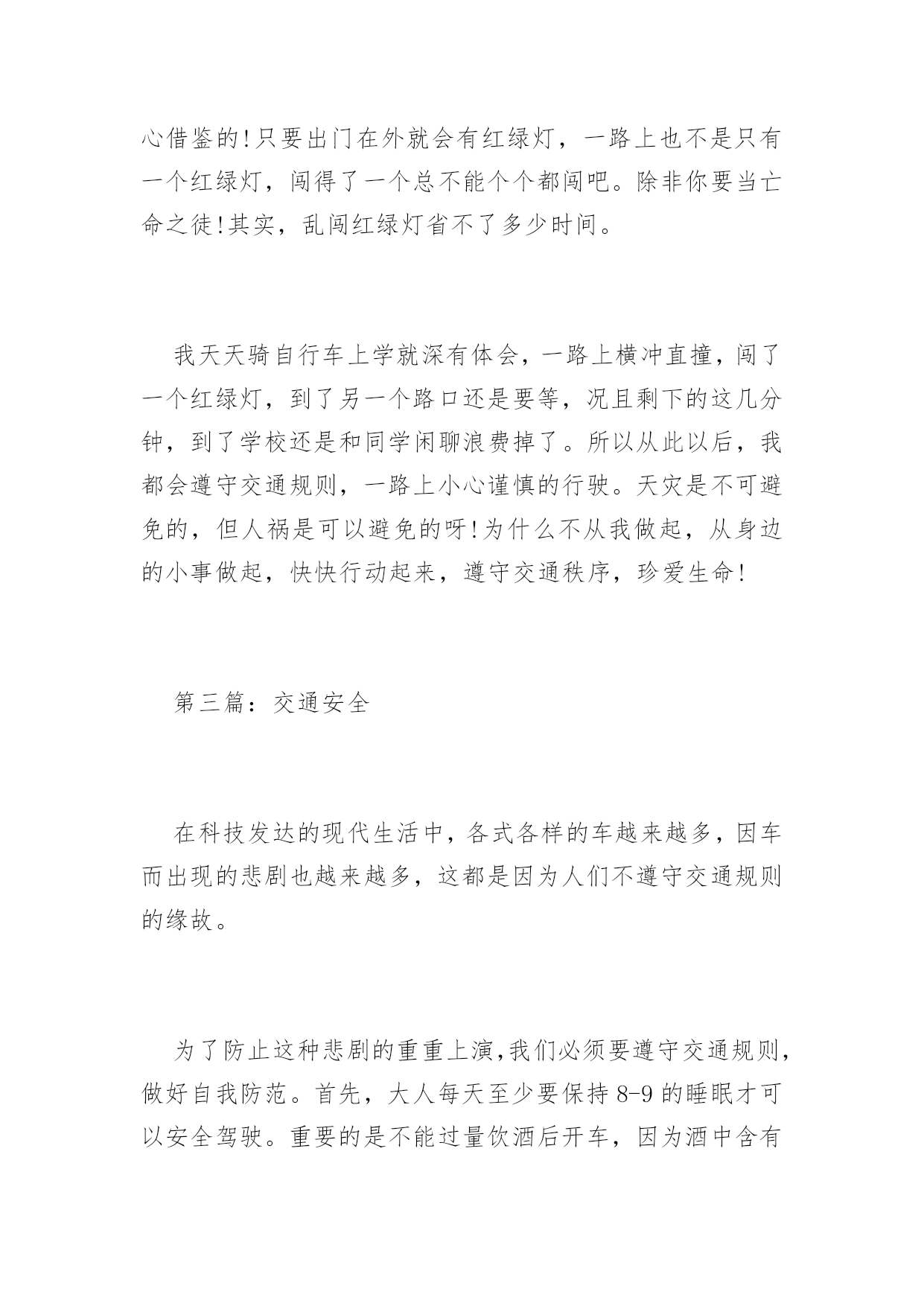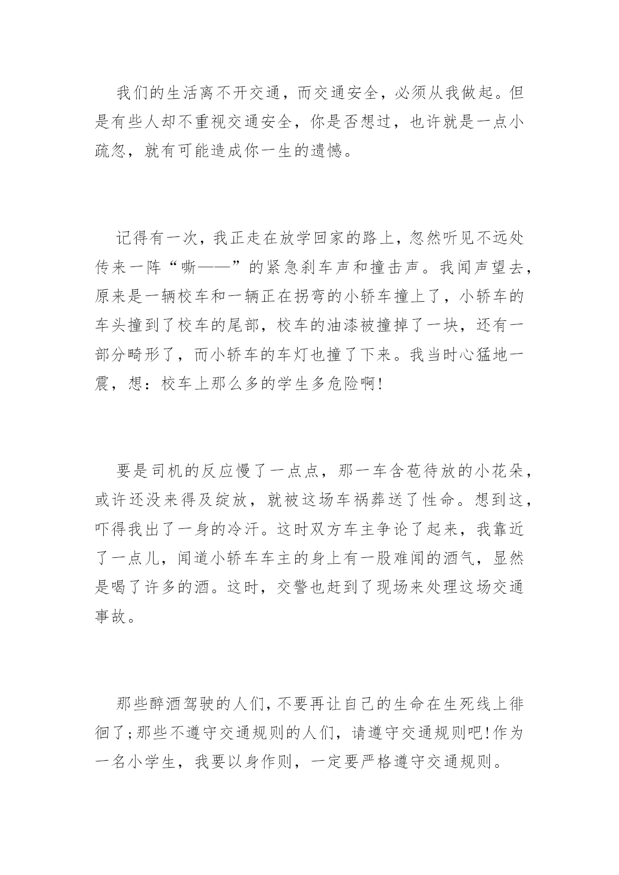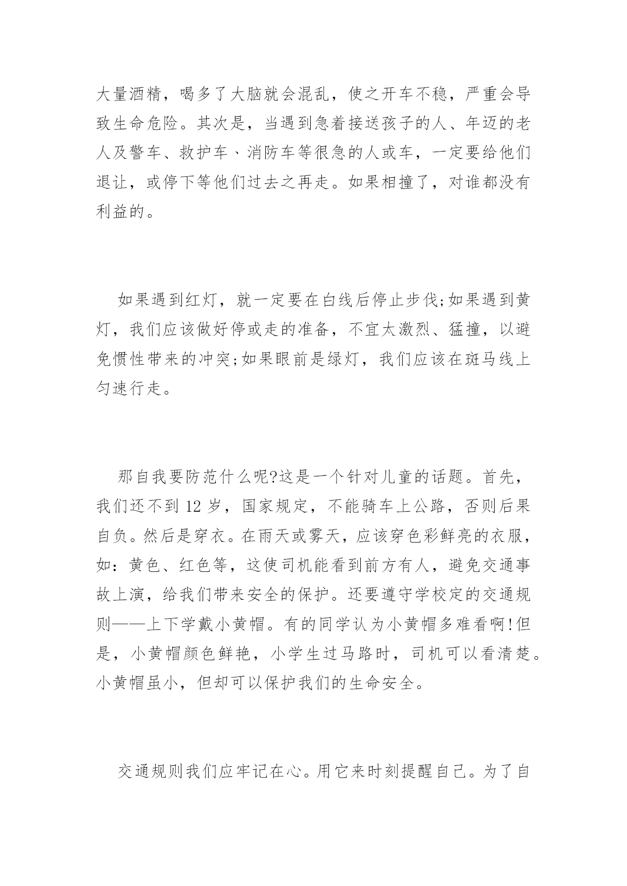 交通安全征文2016年交通安全征文范文交通规则我们应牢记在心。用它来时刻提醒自己。为了自己和他人的安全,我们应遵守交通规则,小编收集了交通安全征文,欢迎阅读。第一篇:交通安全“交通安全”这个词相信大家都很熟悉并不陌生,因为从我们刚会走路到上一年级开始,爸爸妈妈、老师就一直嘱咐我们“注意交通安全”“过马路的时候要左右看”。行走时的一次走神,过马路时的一次侥幸,开车时的一次违章,仅仅是一次小小的疏忽,这一切都会使一个生命转瞬即逝。飞旋的车轮会无情地吞噬掉行人的生命。可是有些同学呢,过马路的时候,看也不看就横冲直撞,好像是要奔赴战场一样;还有一些同学,一边跟其他同学玩,要不然两三个同学飞车比赛,走路时走“S”型,一边过马路,后面来了汽车,按得喇叭很响也不管不顾;还有一些同学就更疯狂了,骑着自行车在马路上绕圈子,走路时走“S”型,把飞驶而过的汽车当成了儿戏。同学们,这种情况对吗?好吗?当然不对,也不好。俗话说的好:“不怕一万,就怕万一!”假如,你冲过马路的那一刻,有一辆车突然从旁边开了过来,你又什么防备也没有,正好对着你,这时的你,能反应过来吗?你瞧,那边有一个小女孩,要过马路,先看看左边有没有车,确认了以后,快速向前走到了两条黄线中间,然后又看了看右边,等到确实没有车以后,他才走到对面;再看,那边那个小女孩,本来已经到了目的地,可是她看到了一个骑车轮车的带着东西掉了,他却不知道,赶快和他说了声,快速帮忙把东西拾起来,把人和车安全地送到了对面,她才露出甜蜜的微笑。交通事故像一个隐形的杀手,潜伏在马路上等待着违章违规的人出现。因此,人们应当学会保护自己,要养成文明行车,文明走路的习惯。看了上面这几则小故事,相信大家也知道了交通安全的重要。当然对于交通文明习惯和素质的培养,应该从每个人每时每刻做起,特别是作为一名行动相对来说缓慢的行人,更应该引起注意。作为一名普通的小学生,遵守交通法规,维护交通秩序是我们应该具备的社会公德。因此,这需要每个公民从自身做起,从小事做起,增强交通文明的意识,才能真正的使其得到改进,才能真正的实现交通安全秩序,才能真正实现和谐的交通环境。第二篇:交通安全交通安全,学校老师讲,校长讲,家里父母讲,我想这四个字大家已不陌生了吧。哦,应该说是听得不耐烦了。可是,我要问一句,这四个字,大家都记在心里了吗?走路不要闯红绿灯,这句话连幼儿园小朋友都知道。可是,又有多少人真正做到了呢?为什么马路要设置红绿灯?不就是为了让交通秩序井然吗?其实遵守交通规则就是对自己的生命负责。我们活着,不仅是为自己而活,更是对关心你、爱护你的人负责。再说,现在我们青少年正处于青春似的年华,为什么我们不能善待生命,开开心心过好每一天?据说,在国外,几乎没有人横穿马路,就算马路上没有汽车,也没有人闯红绿灯。而在中国,横穿马路的人多的是。遵守交通规则还是道德的表现。所以我们要懂得谦让:一条马路上,除了车就是人,只要双方相互忍让,那么我们社会将多么和谐。俗话说:让一步海阔天空。可见,交通安全,无论是生活中还是学习上都是值得大家虚心借鉴的!只要出门在外就会有红绿灯,一路上也不是只有一个红绿灯,闯得了一个总不能个个都闯吧。除非你要当亡命之徒!其实,乱闯红绿灯省不了多少时间。我天天骑自行车上学就深有体会,一路上横冲直撞,闯了一个红绿灯,到了另一个路口还是要等,况且剩下的这几分钟,到了学校还是和同学闲聊浪费掉了。所以从此以后,我都会遵守交通规则,一路上小心谨慎的行驶。天灾是不可避免的,但人祸是可以避免的呀!为什么不从我做起,从身边的小事做起,快快行动起来,遵守交通秩序,珍爱生命!第三篇:交通安全在科技发达的现代生活中,各式各样的车越来越多,因车而出现的悲剧也越来越多,这都是因为人们不遵守交通规则的缘故。为了防止这种悲剧的重重上演,我们必须要遵守交通规则,做好自我防范。首先,大人每天至少要保持8-9的睡眠才可以安全驾驶。重要的是不能过量饮酒后开车,因为酒中含有大量酒精,喝多了大脑就会混乱,使之开车不稳,严重会导致生命危险。其次是,当遇到急着接送孩子的人、年迈的老人及警车、救护车﹑消防车等很急的人或车,一定要给他们退让,或停下等他们过去之再走。如果相撞了,对谁都没有利益的。如果遇到红灯,就一定要在白线后停止步伐;如果遇到黄灯,我们应该做好停或走的准备,不宜太激烈、猛撞,以避免惯性带来的冲突;如果眼前是绿灯,我们应该在斑马线上匀速行走。那自我要防范什么呢?这是一个针对儿童的话题。首先,我们还不到12岁,国家规定,不能骑车上公路,否则后果自负。然后是穿衣。在雨天或雾天,应该穿色彩鲜亮的衣服,如:黄色、红色等,这使司机能看到前方有人,避免交通事故上演,给我们带来安全的保护。还要遵守学校定的交通规则——上下学戴小黄帽。有的同学认为小黄帽多