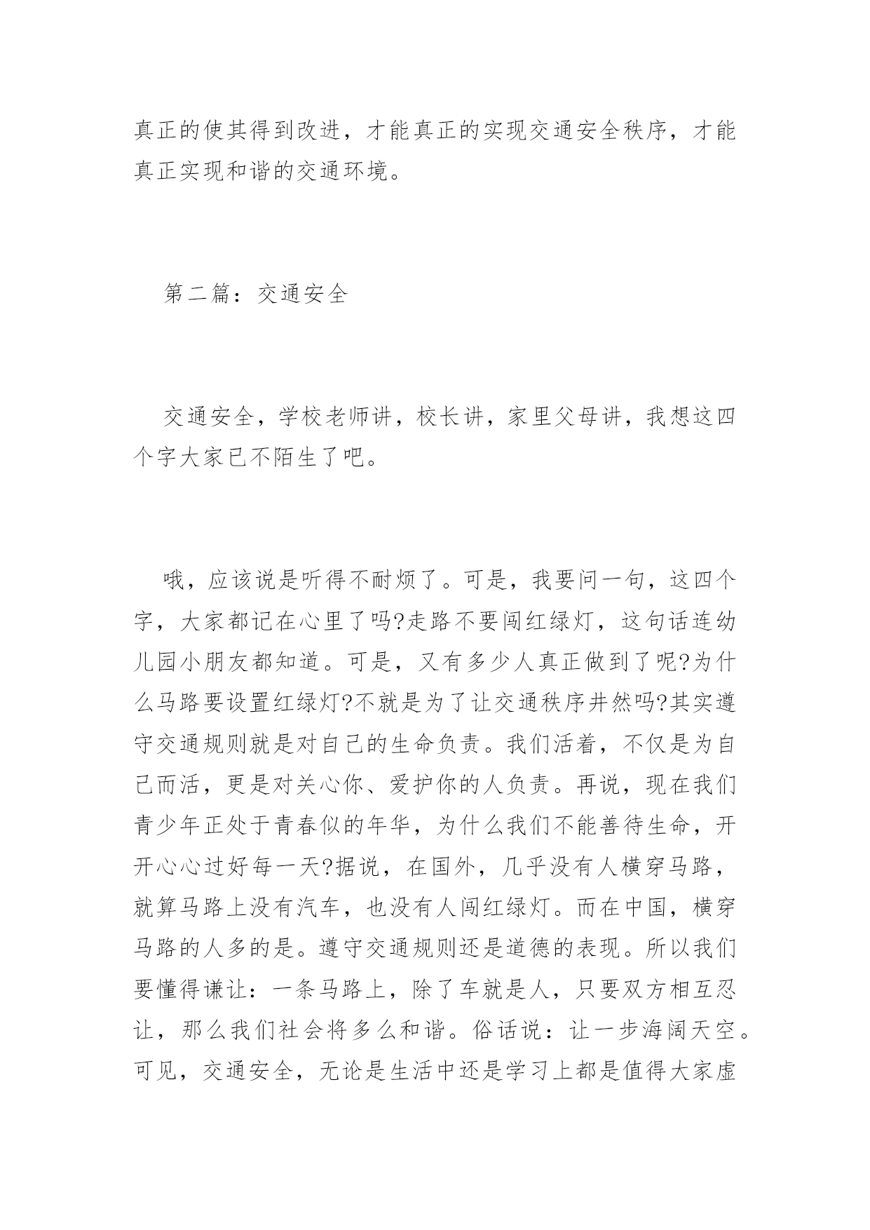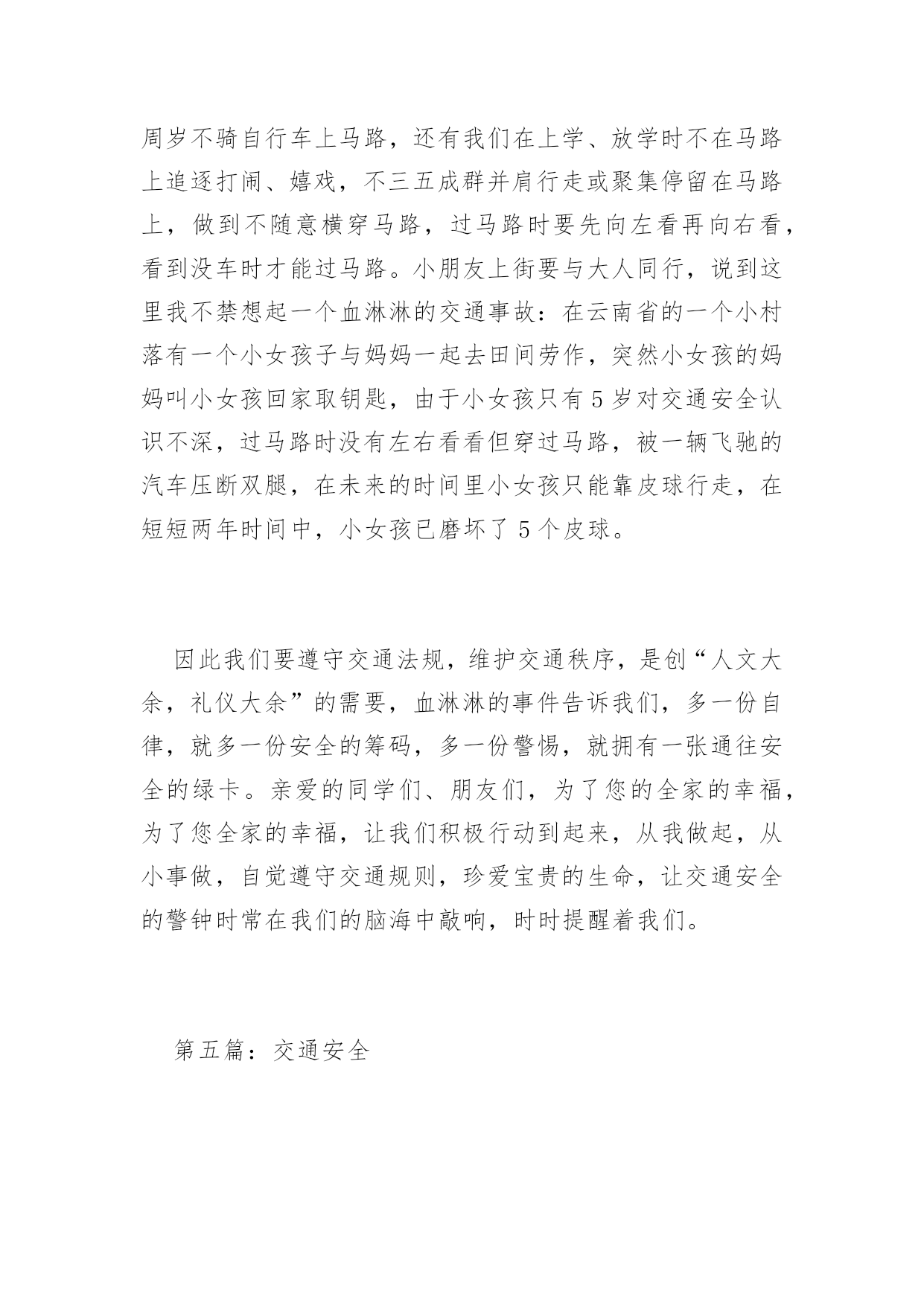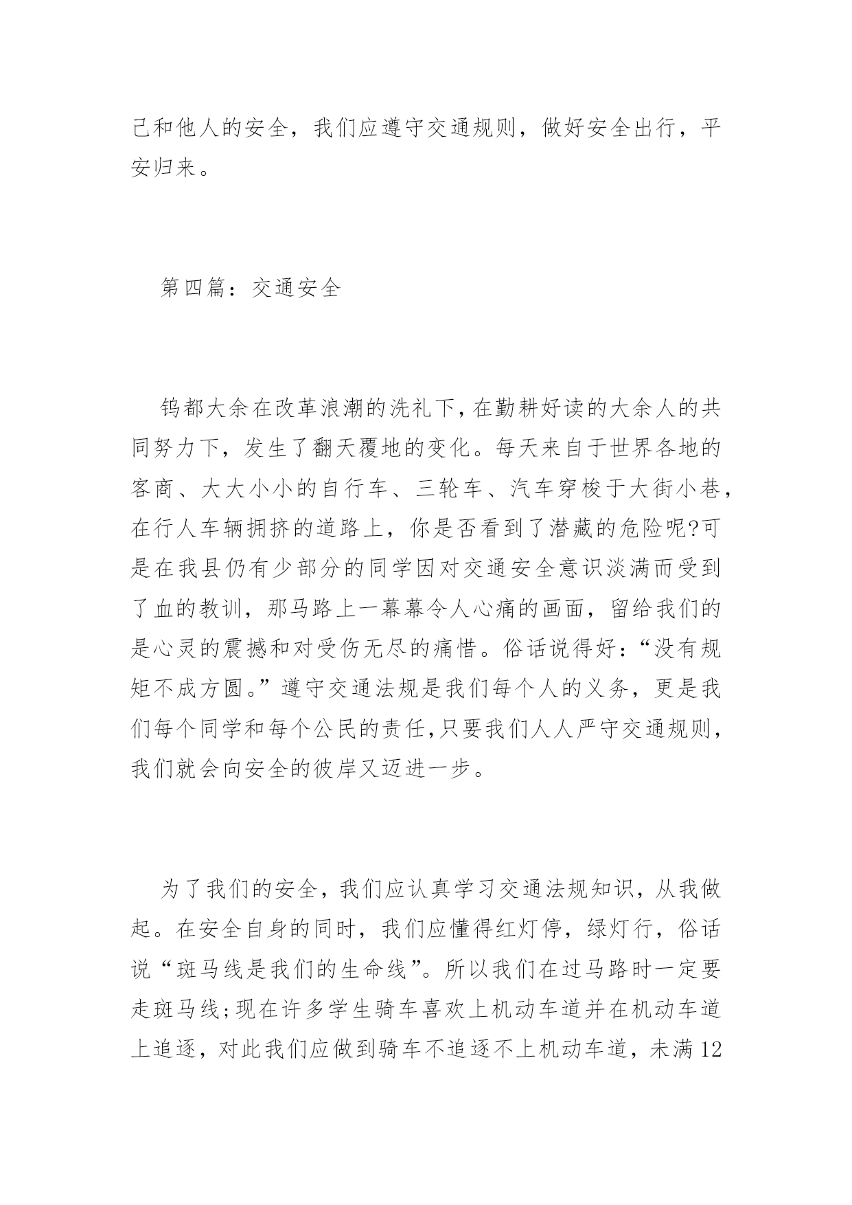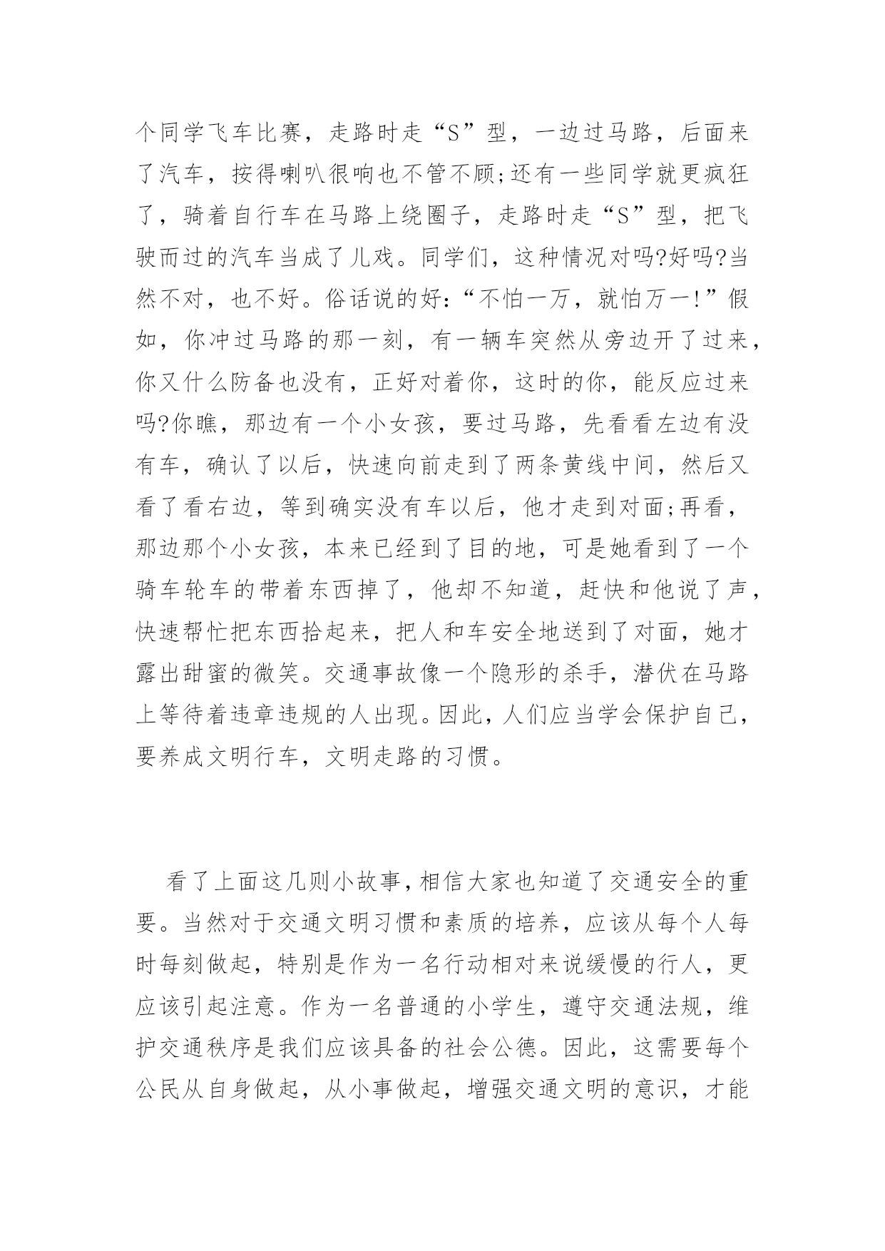 交通安全征文2016年交通安全征文范文交通规则我们应牢记在心。用它来时刻提醒自己。为了自己和他人的安全,我们应遵守交通规则,小编收集了交通安全征文,欢迎阅读。第一篇:交通安全“交通安全”这个词相信大家都很熟悉并不陌生,因为从我们刚会走路到上一年级开始,爸爸妈妈、老师就一直嘱咐我们“注意交通安全”“过马路的时候要左右看”。行走时的一次走神,过马路时的一次侥幸,开车时的一次违章,仅仅是一次小小的疏忽,这一切都会使一个生命转瞬即逝。飞旋的车轮会无情地吞噬掉行人的生命。可是有些同学呢,过马路的时候,看也不看就横冲直撞,好像是要奔赴战场一样;还有一些同学,一边跟其他同学玩,要不然两三个同学飞车比赛,走路时走“S”型,一边过马路,后面来了汽车,按得喇叭很响也不管不顾;还有一些同学就更疯狂了,骑着自行车在马路上绕圈子,走路时走“S”型,把飞驶而过的汽车当成了儿戏。同学们,这种情况对吗?好吗?当然不对,也不好。俗话说的好:“不怕一万,就怕万一!”假如,你冲过马路的那一刻,有一辆车突然从旁边开了过来,你又什么防备也没有,正好对着你,这时的你,能反应过来吗?你瞧,那边有一个小女孩,要过马路,先看看左边有没有车,确认了以后,快速向前走到了两条黄线中间,然后又看了看右边,等到确实没有车以后,他才走到对面;再看,那边那个小女孩,本来已经到了目的地,可是她看到了一个骑车轮车的带着东西掉了,他却不知道,赶快和他说了声,快速帮忙把东西拾起来,把人和车安全地送到了对面,她才露出甜蜜的微笑。交通事故像一个隐形的杀手,潜伏在马路上等待着违章违规的人出现。因此,人们应当学会保护自己,要养成文明行车,文明走路的习惯。看了上面这几则小故事,相信大家也知道了交通安全的重要。当然对于交通文明习惯和素质的培养,应该从每个人每时每刻做起,特别是作为一名行动相对来说缓慢的行人,更应该引起注意。作为一名普通的小学生,遵守交通法规,维护交通秩序是我们应该具备的社会公德。因此,这需要每个公民从自身做起,从小事做起,增强交通文明的意识,才能真正的使其得到改进,才能真正的实现交通安全秩序,才能真正实现和谐的交通环境。第二篇:交通安全交通安全,学校老师讲,校长讲,家里父母讲,我想这四个字大家已不陌生了吧。哦,应该说是听得不耐烦了。可是,我要问一句,这四个字,大家都记在心里了吗?走路不要闯红绿灯,这句话连幼儿园小朋友都知道。可是,又有多少人真正做到了呢?为什么马路要设置红绿灯?不就是为了让交通秩序井然吗?其实遵守交通规则就是对自己的生命负责。我们活着,不仅是为自己而活,更是对关心你、爱护你的人负责。再说,现在我们青少年正处于青春似的年华,为什么我们不能善待生命,开开心心过好每一天?据说,在国外,几乎没有人横穿马路,就算马路上没有汽车,也没有人闯红绿灯。而在中国,横穿马路的人多的是。遵守交通规则还是道德的表现。所以我们要懂得谦让:一条马路上,除了车就是人,只要双方相互忍让,那么我们社会将多么和谐。俗话说:让一步海阔天空。可见,交通安全,无论是生活中还是学习上都是值得大家虚心借鉴的!只要出门在外就会有红绿灯,一路上也不是只有一个红绿灯,闯得了一个总不能个个都闯吧。除非你要当亡命之徒!其实,乱闯红绿灯省不了多少时间。我天天骑自行车上学就深有体会,一路上横冲直撞,闯了一个红绿灯,到了另一个路口还是要等,况且剩下的这几分钟,到了学校还是和同学闲聊浪费掉了。所以从此以后,我都会遵守交通规则,一路上小心谨慎的行驶。天灾是不可避免的,但人祸是可以避免的呀!为什么不从我做起,从身边的小事做起,快快行动起来,遵守交通秩序,珍爱生命!第三篇:交通安全在科技发达的现代生活中,各式各样的车越来越多,因车而出现的悲剧也越来越多,这都是因为人们不遵守交通规则的缘故。为了防止这种悲剧的重重上演,我们必须要遵守交通规则,做好自我防范。首先,大人每天至少要保持8-9的睡眠才可以安全驾驶。重要的是不能过量饮酒后开车,因为酒中含有大量酒精,喝多了大脑就会混乱,使之开车不稳,严重会导致生命危险。其次是,当遇到急着接送孩子的人、年迈的老人及警车、救护车﹑消防车等很急的人或车,一定要给他们退让,或停下等他们过去之再走。如果相撞了,对谁都没有利益的。如果遇到红灯,就一定要在白线后停止步伐;如果遇到黄灯,我们应该做好停或走的准备,不宜太激烈、猛撞,以避免惯性带来的冲突;如果眼前是绿灯,我们应该在斑马线上匀速行走。那自我要防范什么呢?这是一个针对儿童的话题。首先,我们还不到12岁,国家规定,不能骑车上公路,否则后果自负。然后是穿衣。在雨天或雾天,应该穿色彩鲜亮的衣服,如:黄色、红色等,这使司机能看到前方有人,避免交通事故上演,给我们带来安全的保护。还要遵守学校定的交通规则——上下学戴小黄帽。有的同学认为小黄帽多