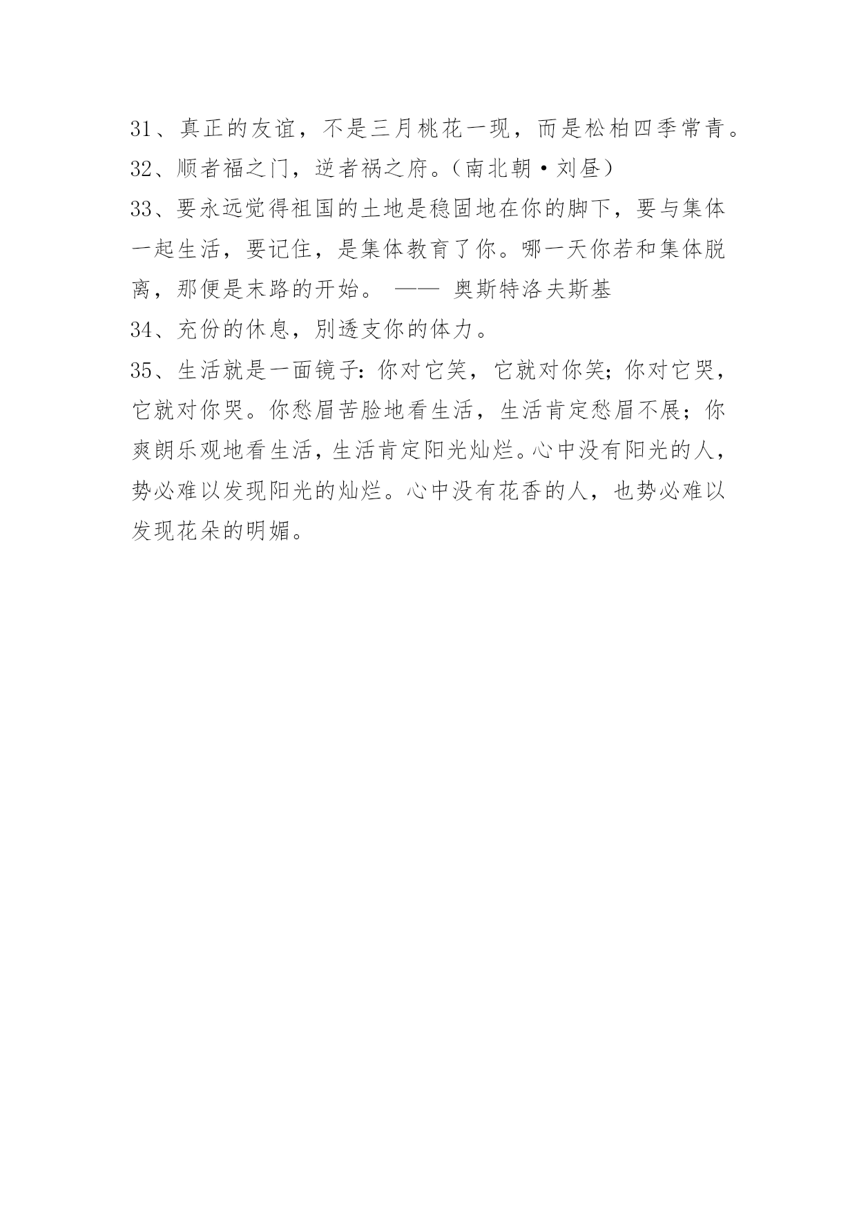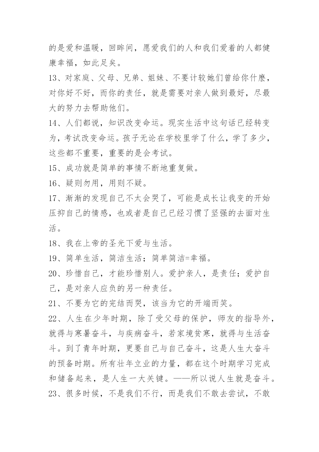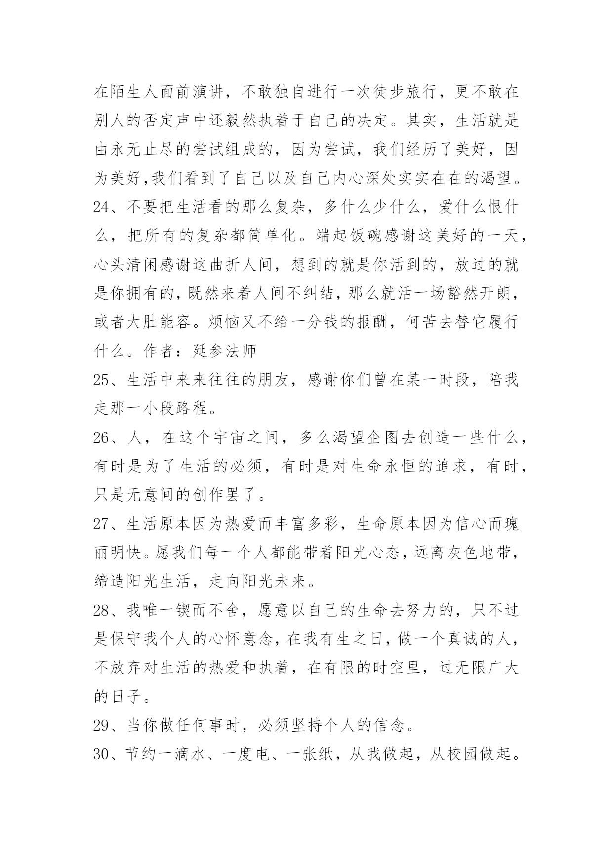 生活名言名句2024年通用生活名言名句汇编35句生活中,惟一的幸福就是不断前进。——左拉以下是小编为大家整理的生活名言名句35句,欢迎参考。1、生活是多棱的,时常伴随着残缺和遗憾,我们要学会立体地审视和揣摩,不停地转变看待事物的视角和态度。仁者无忧,智者无惑,勇者无惧,只有遇事通达,方能心静止水,常怀感恩之心,常做回报善举。若偏执冥玩,则多哀怨,恨由心生,疾亦长顾。在生活面前,谁能看得开,谁就能过得快乐。2、快乐是最好的天气。使人成熟的是经历,而不是岁月。让我们感谢过去吧,它会带给我们一个更好的未来。生活从来都是波澜起伏的,命运从来都是峰回路转的,因为有了曲折和故事,我们的生命才会精彩。有时候,哭泣,不是屈服;后退,不是认输;放手,不是放弃;沉默,不是无话可说。3、生活的价值在于创造。4、没有坎坷的生活是幼稚的,缺少思考的生活是平庸的,失去追求的生活是空虚的,缺乏朝气的生活是贫乏的,毫无远见的生活是浅薄的!5、我比以前更热爱人生。热爱生活的句子。因此,人生快要终结的时候,我受不了,越爱人生,就越不能服膺生活者的条件。如果只为了凝视人生,要意识做什么呢?6、下棋找高手,弄斧到班门。7、人的大脑时刻要充电,否则会电力不足。8、对于每个人生活道路上必然出现的普通的不愉快的事情,我们必须常常提醒自己,我们并不是弱者,我们有能力战胜它:我们要对自己的生活负责,通过行动、通过努力、通过汇集自己所有的勇气和毅力,我们能够创造一个完全不同的机会,能摆脱苦恼的纠缠,而且每次努力都会有成效。——[美国]哈默9、金钱真正是人间一切下流行为的渊薮。有了钱,那些最黑暗的勾当的沉渣往往都会在国家生活的表面浮起,并支配整个国家的命运。10、人活在世上,无非是面对两个世界,身外的大千世界和自己的内心世界。能说出来的,未必是太在意的;能写出来的,其实是可以放下的;存在心底的,才是欲罢不能、挥之不去的。爱之于我,不是肌肤之亲,不是一蔬一饭,它是一种不死的欲望,是疲惫生活中的英雄梦想。11、平淡是心静如水,是人生的一道风景,时间就如海绵里的水,不妨我们现在就停下手中忙碌的事,想想什么更重要。生活,需要一种安慰来抚摸伤口。一句简单的问候,一声简洁的鼓励,也许就能够让伤口快速愈合。12、记忆的年轮,岁月的脚步沧桑了指尖浮华,感谢岁月给我一方晴空,让我带着一颗明媚如初的心,过好生命的每一天;感谢生活给我温暖,让我在平淡时光里细数人间烟火,笑看月缺月圆,或许时光可以老去,光阴的对面,永不老却的是爱和温暖,回眸间,愿爱我们的人和我们爱着的人都健康幸福,如此足矣。13、对家庭、父母、兄弟、姐妹、不要计较她们曾给你什麽,对你好不好,而你的责任,就是需要对亲人做到最好,尽最大的努力去帮助他们。14、人们都说,知识改变命运。现实生活中这句话已经转变为,考试改变命运。孩子无论在学校里学了什么,学了多少,这些都不重要,重要的是会考试。15、成功就是简单的事情不断地重复做。16、疑则勿用,用则不疑。17、渐渐的发现自己不太会哭了,可能是成长让我变的开始压抑自己的情感,也或者是自己已经习惯了坚强的去面对生活。18、我在上帝的圣光下爱与生活。19、简单生活,简洁生活;简单简洁=幸福。20、珍惜自己,才能珍惜别人。爱护亲人,是责任;爱护自己,是对亲人应负的另一种责任。21、不要为它的完结而哭,该当为它的开端而笑。22、人生在少年时期,除了受父母的保护,师友的指导外,就得与寒暑奋斗,与疾病奋斗,若家境贫寒,就得与生活奋斗。到了青年时期,更要自己与自己奋斗,这是人生大奋斗的预备时期。所有壮年立业的力量,都在这个时期学习完成和储备起来,是人生一大关键。——所以说人生就是奋斗。23、很多时候,不是我们不行,而是我们不敢去尝试,不敢在陌生人面前演讲,不敢独自进行一次徒步旅行,更不敢在别人的否定声中还毅然执着于自己的决定。其实,生活就是由永无止尽的尝试组成的,因为尝试,我们经历了美好,因为美好,我们看到了自己以及自己内心深处实实在在的渴望。24、不要把生活看的那么复杂,多什么少什么,爱什么恨什么,把所有的复杂都简单化。端起饭碗感谢这美好的一天,心头清闲感谢这曲折人间,想到的就是你活到的,放过的就是你拥有的,既然来着人间不纠结,那么就活一场豁然开朗,或者大肚能容。烦恼又不给一分钱的报酬,何苦去替它履行什么。作者:延参法师25、生活中来来往往的朋友,感谢你们曾在某一时段,陪我走那一小段路程。26、人,在这个宇宙之间,多么渴望企图去创造一些什么,有时是为了生活的必须,有时是对生命永恒的追求,有时,只是无意间的创作罢了。27、生活原本因为热爱而丰富多彩,生命原本因为信心而瑰丽明快。愿我们每一个人都能带着阳光心态,远离灰色地带,缔造阳光生活,走向阳光未来。28、我唯一锲而不舍,愿意以自己的生命去努力的,只不过是