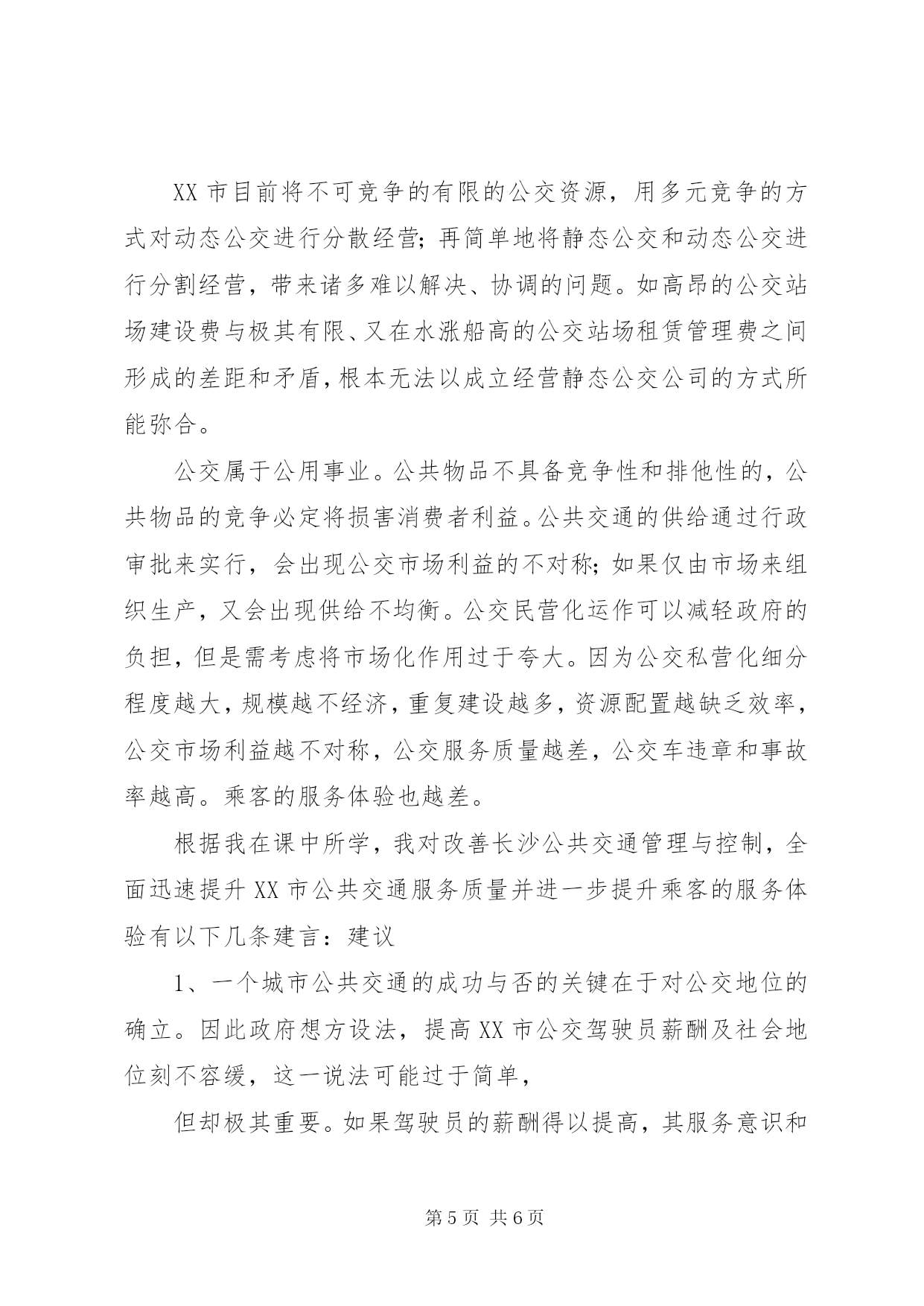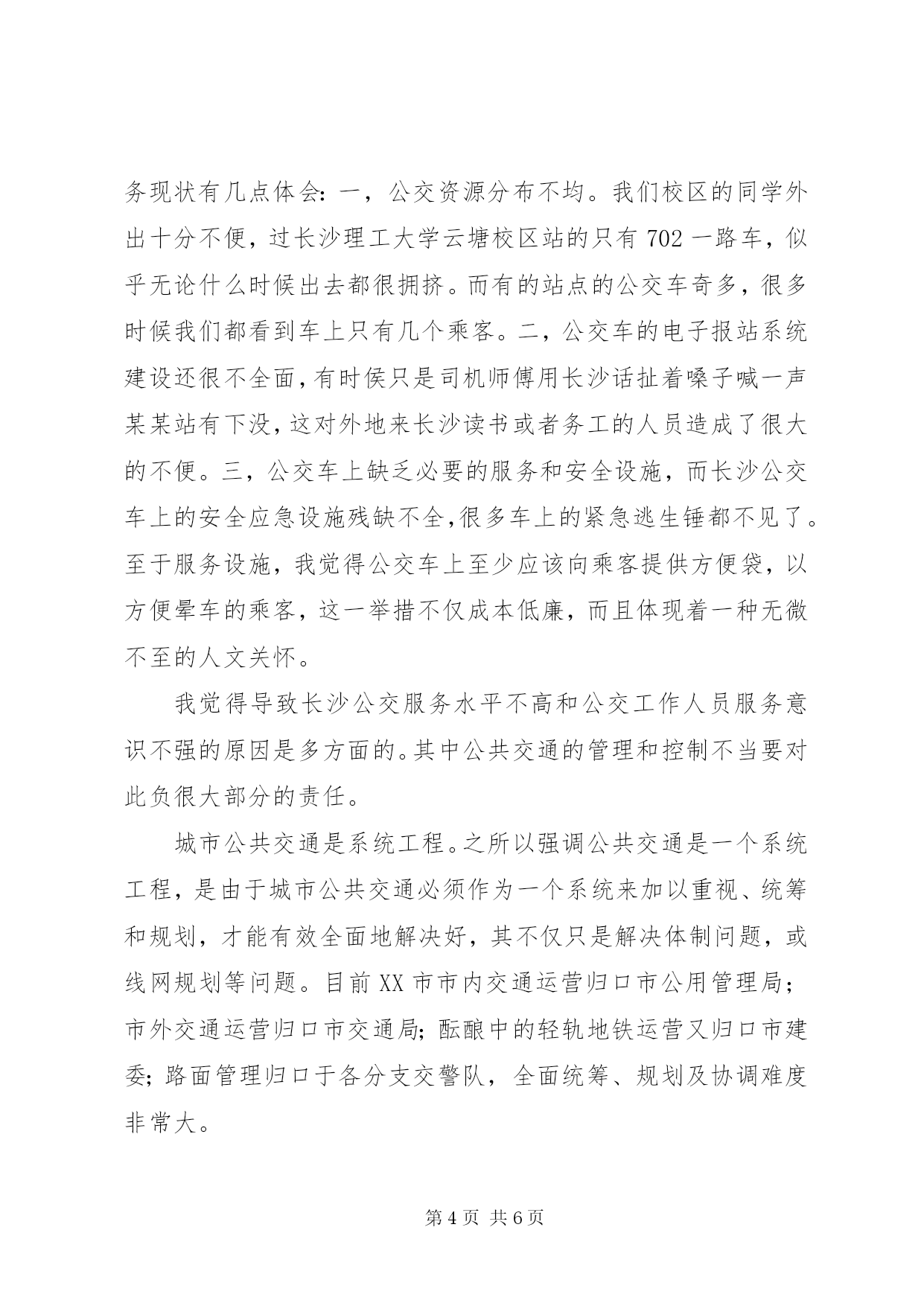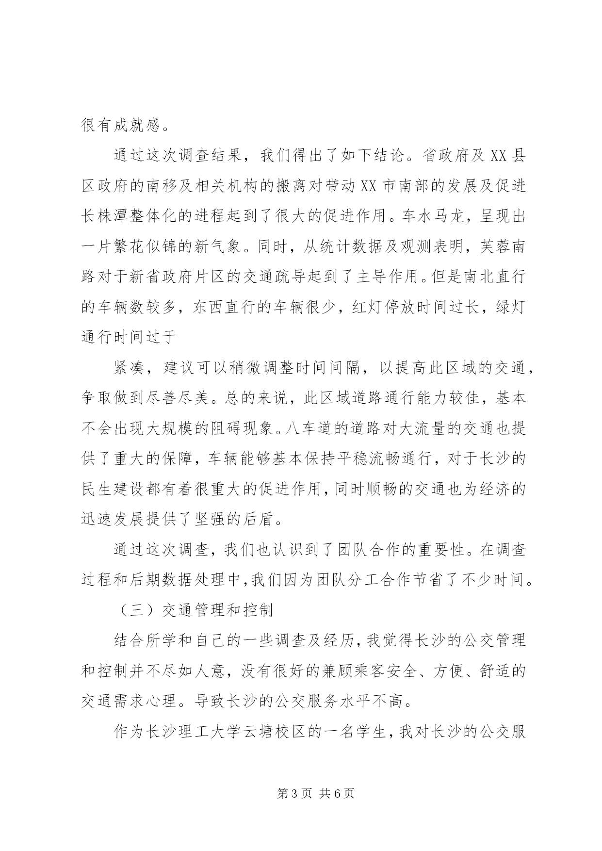 第PAGE\*Arabic\*MERGEFORMAT6页共NUMPAGES\*MERGEFORMAT6页交通工程总论学习心得《交通工程总论》学习心得这学期我们学了《交通工程总论》这门新的课程,通过学习这门课程我对本专业有了一个较为清晰的认识。交通工程学是研究交通发生、发展、分布、运行与停住规律,探讨交通调查、规划、设计、监控、营运、管理、安全的理论、方法以及有关设施、装备、法律和法规,协调道路交通中人、车、路与环境之间的相互关系,使道路交通更加安全,高效、快捷、舒适和美观、方便经济的一门工程技术科学。在短短的八次课中,李老师着重给我们讲了交通特性分析、交通调查、交通流理论、交通规划和交通管理等内容。很多概念(像交通特性、交通量、交通流、道路通行能力等)我们以前偶有听说过,但不是很了解,通过这门课的学习,我们对这些较为专业的词汇的了解也从感性阶段上升到了理性阶段。在老师讲的这些内容中,我对新型交通,交通调查和交通管理尤其有兴趣。(一)新型交通在一次课上,老师跟我们介绍了brt(快速公交系统)这一新型公共客运系统。多名同学发言参与了介绍自己见过的brt形式。但同时也有很多同学并没有见过这一系统。于是老师让我们自己动手查资料并作为作业写一篇brt的简介。我觉得这种讲课方式很好的激发了我们的学习主动性,自己动手查询得到的东西比在课堂上听老师做一番简单的介绍效果要更好。我通过查阅资料得知,brt是快速公交系统(busrapidtransit)的简称,是一种来源于巴西库里蒂巴介于快速轨道交通(rapidrailtransit,简称rrt)与常规公交(normalbustransit,简称nbt)之间的新型公共客运系统,是一种大运量交通方式,通常也被人称作“地面上的地铁系统”。它是利用现代化公交技术配合智能交通和运营管理,开辟公交专用道路和建造新式公交车站,实现轨道交通运营服务,达到轻轨服务水准的一种独特的城市客运系统。我还得知,长沙近期也将会兴建这一新型公交系统,我对此十分期待。通过这次课,我们学会了主动查阅所需资料,这对我们工科的学生来说是非常重要的。(二)交通调查交通调查指的是交通量、车速、交通运行特征、起迄点、交叉口、交通事故、交通环境等调查的统称。交通调查是我们学习这门课的一种必需的实践。我们全班同学曾前往省政府旁展开了一次交通调查。我们主要调查了芙蓉南路和湘府路交叉口的交通流量。因为该路口交通流量较大,我们采取了团队分工合作的方法。每个组员负责观察从某一特定车道转入另一车道的车辆的具体数目,另安排一组员观测红绿灯周期。一个多小时的调查使我们体验到,得出第一手资料有时是要付出大量的实践和劳动的。而通过自己亲手调查得出的成果也让我们很有成就感。通过这次调查结果,我们得出了如下结论。省政府及XX县区政府的南移及相关机构的搬离对带动XX市南部的发展及促进长株潭整体化的进程起到了很大的促进作用。车水马龙,呈现出一片繁花似锦的新气象。同时,从统计数据及观测表明,芙蓉南路对于新省政府片区的交通疏导起到了主导作用。但是南北直行的车辆数较多,东西直行的车辆很少,红灯停放时间过长,绿灯通行时间过于紧凑,建议可以稍微调整时间间隔,以提高此区域的交通,争取做到尽善尽美。总的来说,此区域道路通行能力较佳,基本不会出现大规模的阻碍现象。八车道的道路对大流量的交通也提供了重大的保障,车辆能够基本保持平稳流畅通行,对于长沙的民生建设都有着很重大的促进作用,同时顺畅的交通也为经济的迅速发展提供了坚强的后盾。通过这次调查,我们也认识到了团队合作的重要性。在调查过程和后期数据处理中,我们因为团队分工合作节省了不少时间。(三)交通管理和控制结合所学和自己的一些调查及经历,我觉得长沙的公交管理和控制并不尽如人意,没有很好的兼顾乘客安全、方便、舒适的交通需求心理。导致长沙的公交服务水平不高。作为长沙理工大学云塘校区的一名学生,我对长沙的公交服务现状有几点体会:一,公交资源分布不均。我们校区的同学外出十分不便,过长沙理工大学云塘校区站的只有702一路车,似乎无论什么时候出去都很拥挤。而有的站点的公交车奇多,很多时候我们都看到车上只有几个乘客。二,公交车的电子报站系统建设还很不全面,有时侯只是司机师傅用长沙话扯着嗓子喊一声某某站有下没,这对外地来长沙读书或者务工的人员造成了很大的不便。三,公交车上缺乏必要的服务和安全设施,而长沙公交车上的安全应急设施残缺不全,很多车上的紧急逃生锤都不见了。至于服务设施,我觉得公交车上至少应该向乘客提供方便袋,以方便晕车的乘客,这一举措不仅成本低廉,而且体现着一种无微不至的人文关怀。我觉得导致长沙公交服务水平不高和公交工作人员服务意识不强的原因是多方面的。其中公共交通的管理和控制不当要对此负很大部分的责任。城市公共交通