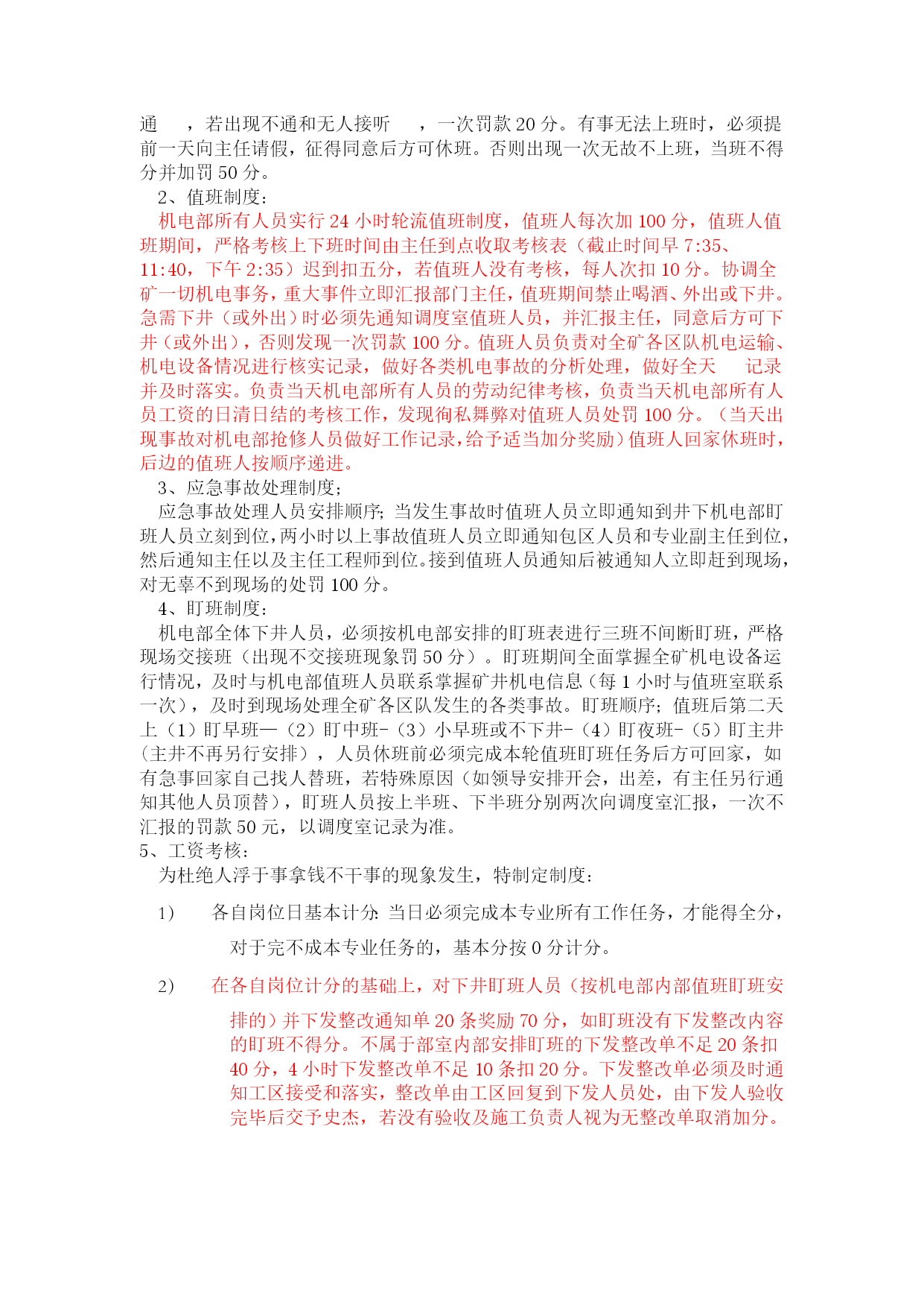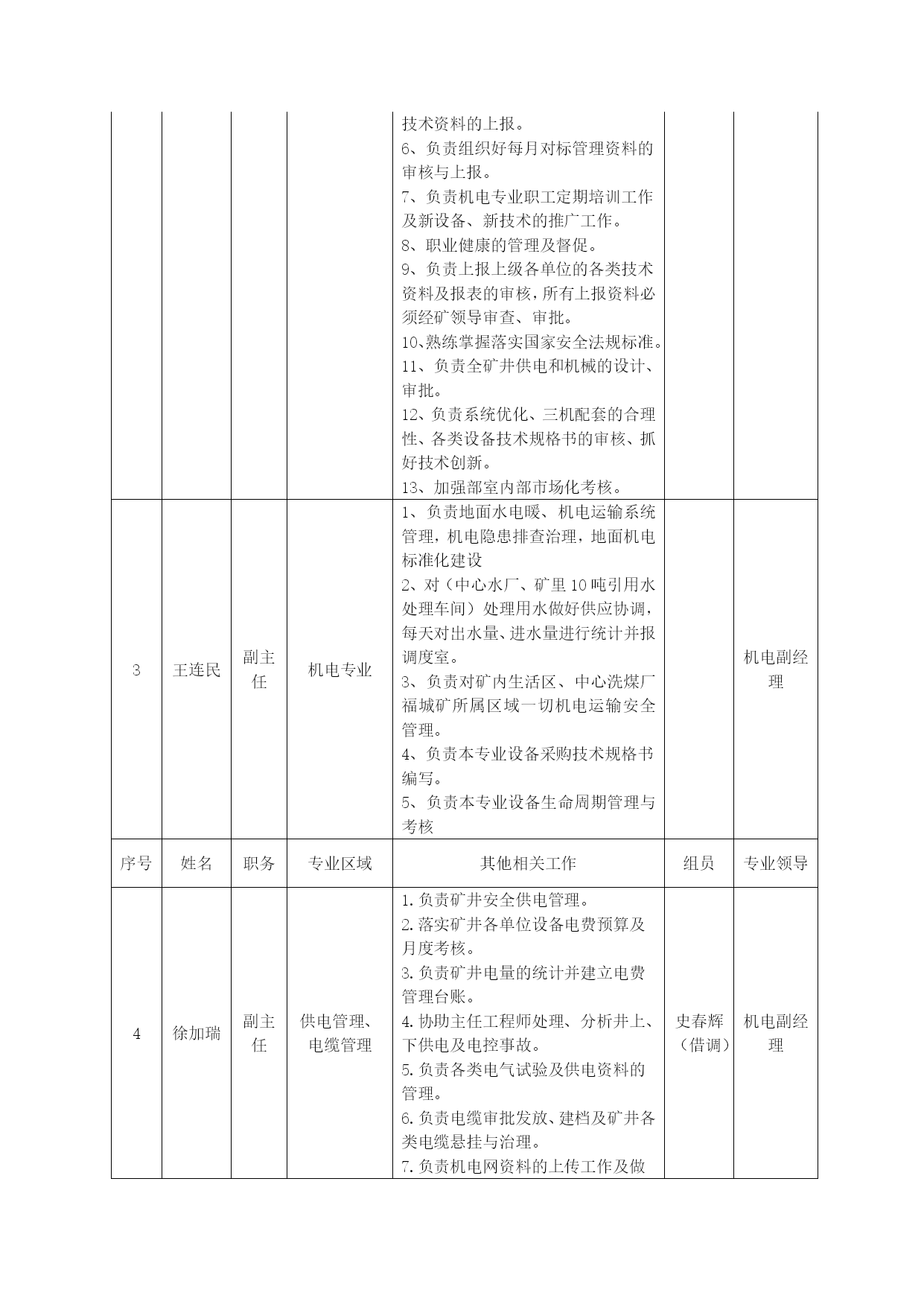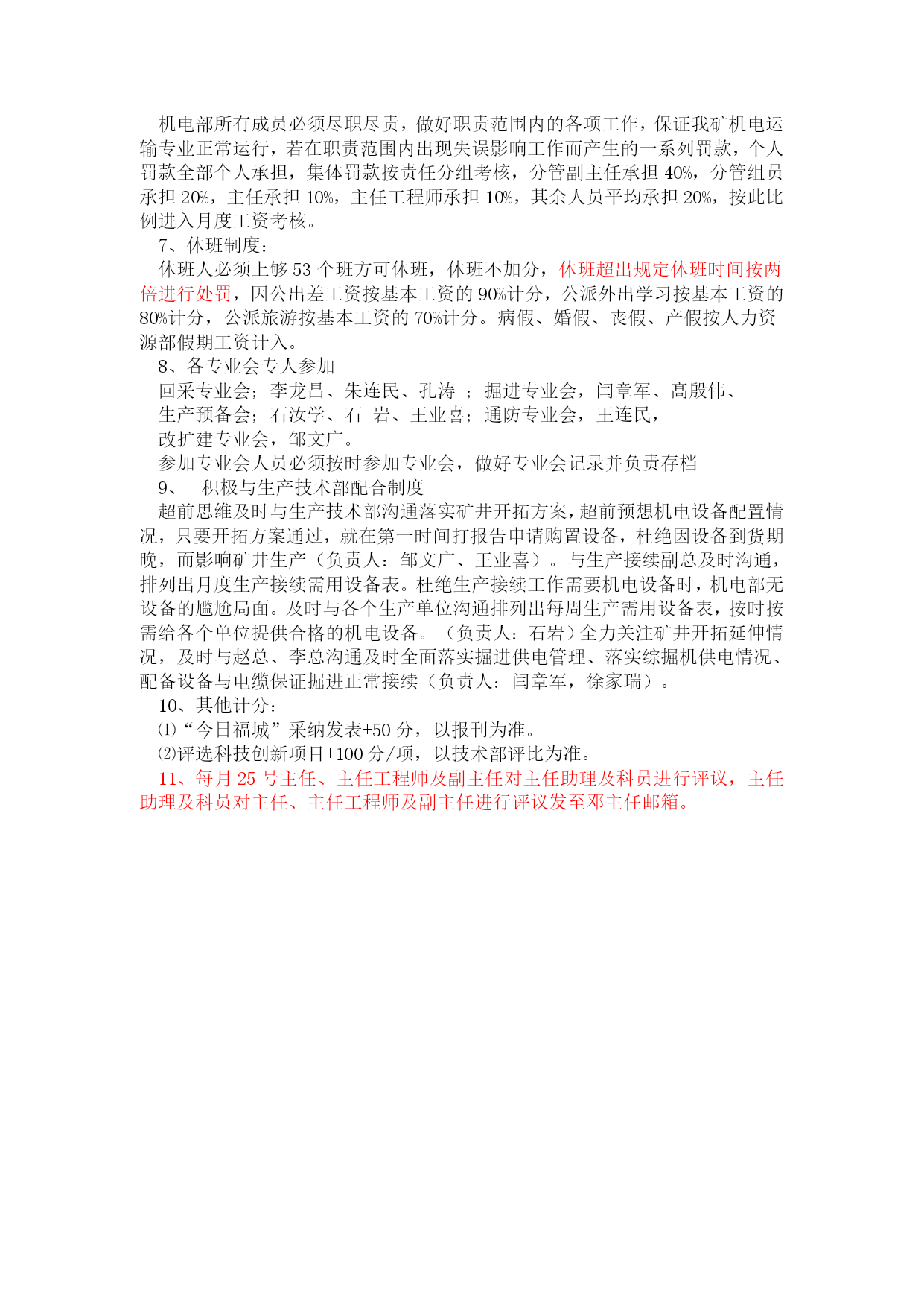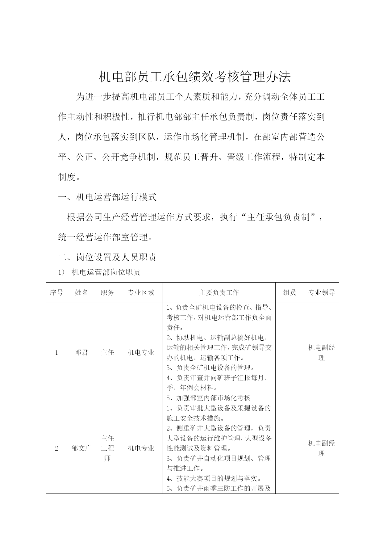 机电部绩效考核管理办法优质资料(可以直接使用,可编辑优质资料,欢迎下载)机电部员工承包绩效考核管理办法为进一步提高机电部员工个人素质和能力,充分调动全体员工工作主动性和积极性,推行机电部部主任承包负责制,岗位责任落实到人,岗位承包落实到区队,运作市场化管理机制,在部室内部营造公平、公正、公开竞争机制,规范员工晋升、晋级工作流程,特制定本制度。一、机电运营部运行模式根据公司生产经营管理运作方式要求,执行“主任承包负责制”,统一经营运作部室管理。二、岗位设置及人员职责机电运营部岗位职责序号姓名职务专业区域主要负责工作组员专业领导1邓君主任机电专业1、负责全矿机电设备的检查、指导、考核工作,对机电运营部工作负全面责任。2、协助机电、运输副总搞好机电、运输的相关管理工作,完成矿领导交办的机电、运输各项工作。3、负责全矿机电设备的管理。4、负责审查并向矿班子汇报每月、季、年例会材料。5、加强部室内部市场化考核机电副经理2邹文广主任工程师机电专业1、负责审批大型设备及采掘设备的施工安全技术措施。2、侧重矿井大型设备的管理,负责大型设备的运行维护管理,大型设备性能测试及资料管理。3、负责矿井自动化项目规划、管理与推进工作。4、技能大赛项目的规划与落实。5、负责矿井雨季三防工作的开展及技术资料的上报。6、负责组织好每月对标管理资料的审核与上报。7、负责机电专业职工定期培训工作及新设备、新技术的推广工作。8、职业健康的管理及督促。9、负责上报上级各单位的各类技术资料及报表的审核,所有上报资料必须经矿领导审查、审批。10、熟练掌握落实国家安全法规标准。11、负责全矿井供电和机械的设计、审批。12、负责系统优化、三机配套的合理性、各类设备技术规格书的审核、抓好技术创新。13、加强部室内部市场化考核。机电副经理3王连民副主任机电专业1、负责地面水电暖、机电运输系统管理,机电隐患排查治理,地面机电标准化建设2、对(中心水厂、矿里10吨引用水处理车间)处理用水做好供应协调,每天对出水量、进水量进行统计并报调度室。3、负责对矿内生活区、中心洗煤厂福城矿所属区域一切机电运输安全管理。4、负责本专业设备采购技术规格书编写。5、负责本专业设备生命周期管理与考核机电副经理序号姓名职务专业区域其他相关工作组员专业领导4徐加瑞副主任供电管理、电缆管理1.负责矿井安全供电管理。2.落实矿井各单位设备电费预算及月度考核。3.负责矿井电量的统计并建立电费管理台账。4.协助主任工程师处理、分析井上、下供电及电控事故。5.负责各类电气试验及供电资料的管理。6.负责电缆审批发放、建档及矿井各类电缆悬挂与治理。7.负责机电网资料的上传工作及做好每月对标工作的汇报。8.负责本专业技能大赛、技术培训、业务提升工作。史春辉(借调)机电副经理5王业喜副主任设备管理、小电管理1.负责矿井设备管理工作,考核设备的验收分类、入账入库、保管发放工作,小型电器进行质量鉴定、建档、动态管理及开单发放。2.负责电气设备、小型电器入井前防爆检查把关。3.负责使用设备的手续审批、开单发放。4.负责入井及升井设备的检查验收。5.负责设备新到台账的更新、升井下井设备台账的更新。6.负责新到设备的验收,做好设备资料三证一标志的管理。7.集团公司设备管理平台的更新与维护,虚拟库设备的管理。8.负责本专业技能大赛、技术培训、业务提升工作。9、负责本专业设备采购技术规格书编写。10、负责本专业设备生命周期管理与考核张文王红红陈迪(借调)机电副经理6闫章军副主任掘进管理、协助主任工程师自动化管理1.主要负责掘进运输系统管理、设备运行等工作。2.协助主任工程师做好全矿自动化项目的规划、管理与推进。3.负责搞好矿井各掘进区队、机电设备检查和质量标准织化评比工作;负责掘进专业机电事故的现场协调处理并组织掘进专业机电事故分析。4.负责本矿内部部室对标管理工作。5.负责本专业技能大赛、技术培训、业务提升工作。6负责本专业设备采购技术规格书编写。7负责本专业设备生命周期管理与考核机电副经理序号姓名职务专业区域其他相关工作组员专业领导7李龙昌副主任回采管理、1.负责回采机电运输管理、设备运行等工作。2、负责组织回采专业机电事故的现场协调处理;组织回采专业机电事故分析。3.负责本专业技能大赛、技术培训、业务提升工作4、负责本专业设备采购技术规格书编写。5、负责本专业设备生命周期管理与考核朱连民机电副经理8石汝学运输主任运输专业1.负责运输专业全面工作,组织运输专业平衡会,负责全矿提升运输系统的检查、指导、考核工作。2.协助运输副总平衡全矿运输设备的检修,组织处理、分析各类运输事故;负责编写或审查上报的技术性资料。3.协调、安排、督促运输组人员的工作,加强各成