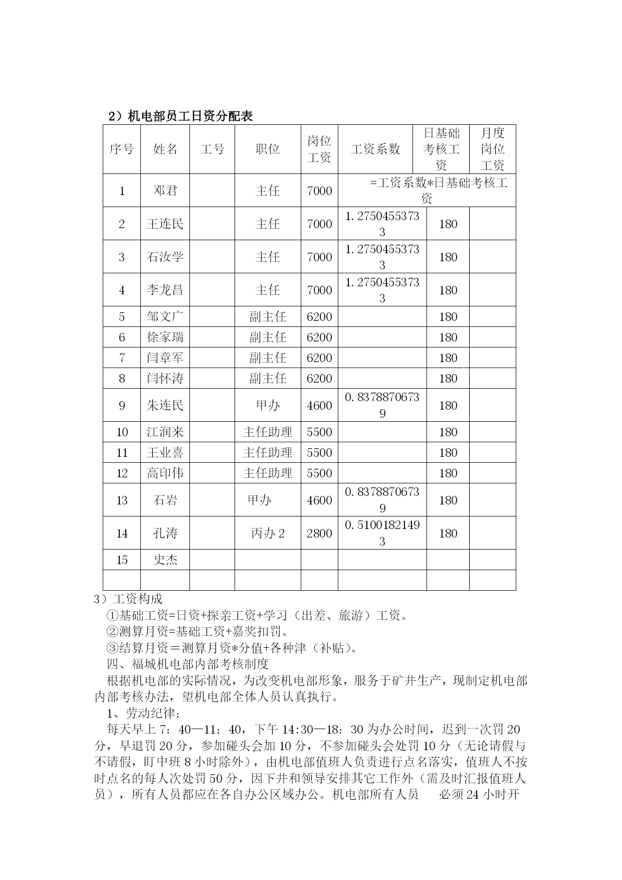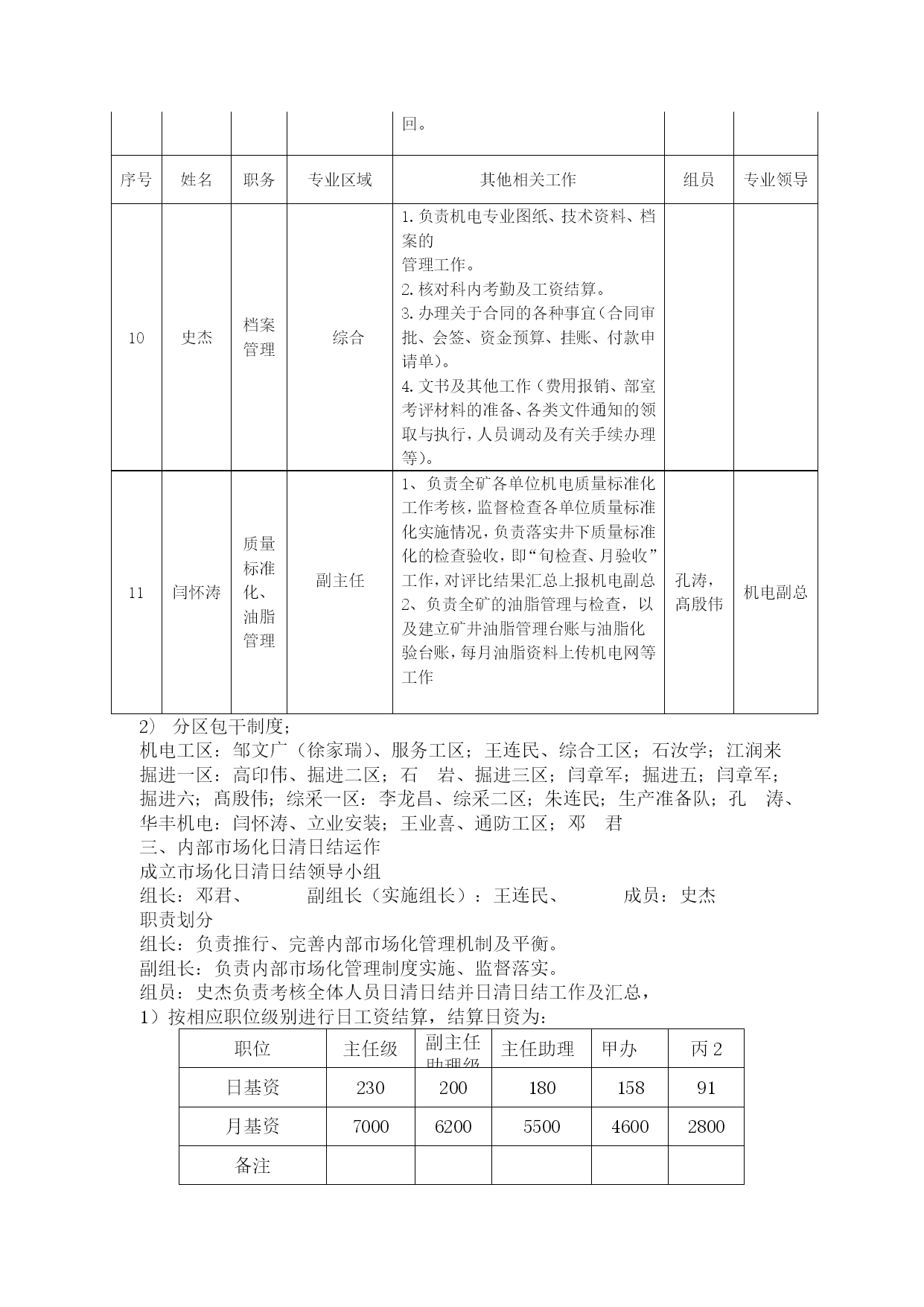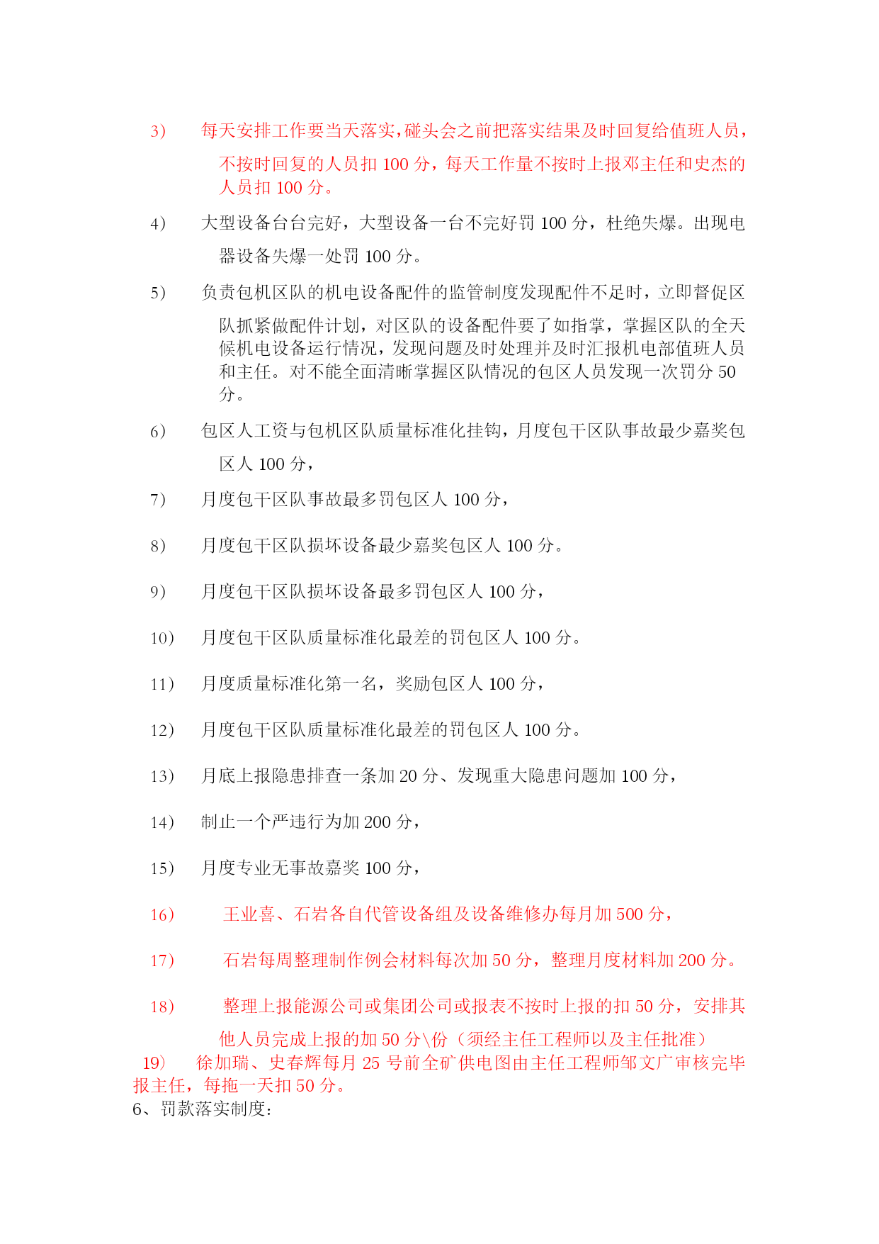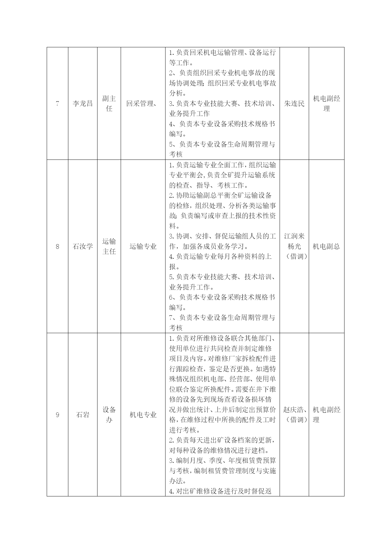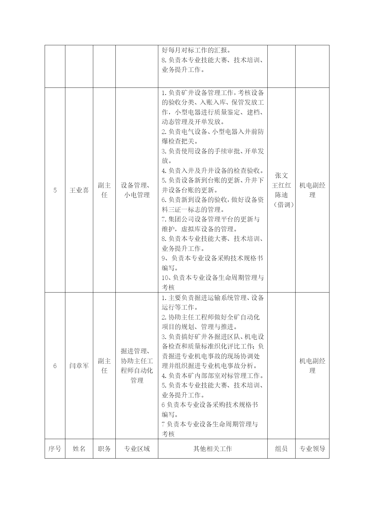 机电部绩效考核管理办法优质资料(可以直接使用,可编辑优质资料,欢迎下载)机电部员工承包绩效考核管理办法为进一步提高机电部员工个人素质和能力,充分调动全体员工工作主动性和积极性,推行机电部部主任承包负责制,岗位责任落实到人,岗位承包落实到区队,运作市场化管理机制,在部室内部营造公平、公正、公开竞争机制,规范员工晋升、晋级工作流程,特制定本制度。一、机电运营部运行模式根据公司生产经营管理运作方式要求,执行“主任承包负责制”,统一经营运作部室管理。二、岗位设置及人员职责机电运营部岗位职责序号姓名职务专业区域主要负责工作组员专业领导1邓君主任机电专业1、负责全矿机电设备的检查、指导、考核工作,对机电运营部工作负全面责任。2、协助机电、运输副总搞好机电、运输的相关管理工作,完成矿领导交办的机电、运输各项工作。3、负责全矿机电设备的管理。4、负责审查并向矿班子汇报每月、季、年例会材料。5、加强部室内部市场化考核机电副经理2邹文广主任工程师机电专业1、负责审批大型设备及采掘设备的施工安全技术措施。2、侧重矿井大型设备的管理,负责大型设备的运行维护管理,大型设备性能测试及资料管理。3、负责矿井自动化项目规划、管理与推进工作。4、技能大赛项目的规划与落实。5、负责矿井雨季三防工作的开展及技术资料的上报。6、负责组织好每月对标管理资料的审核与上报。7、负责机电专业职工定期培训工作及新设备、新技术的推广工作。8、职业健康的管理及督促。9、负责上报上级各单位的各类技术资料及报表的审核,所有上报资料必须经矿领导审查、审批。10、熟练掌握落实国家安全法规标准。11、负责全矿井供电和机械的设计、审批。12、负责系统优化、三机配套的合理性、各类设备技术规格书的审核、抓好技术创新。13、加强部室内部市场化考核。机电副经理3王连民副主任机电专业1、负责地面水电暖、机电运输系统管理,机电隐患排查治理,地面机电标准化建设2、对(中心水厂、矿里10吨引用水处理车间)处理用水做好供应协调,每天对出水量、进水量进行统计并报调度室。3、负责对矿内生活区、中心洗煤厂福城矿所属区域一切机电运输安全管理。4、负责本专业设备采购技术规格书编写。5、负责本专业设备生命周期管理与考核机电副经理序号姓名职务专业区域其他相关工作组员专业领导4徐加瑞副主任供电管理、电缆管理1.负责矿井安全供电管理。2.落实矿井各单位设备电费预算及月度考核。3.负责矿井电量的统计并建立电费管理台账。4.协助主任工程师处理、分析井上、下供电及电控事故。5.负责各类电气试验及供电资料的管理。6.负责电缆审批发放、建档及矿井各类电缆悬挂与治理。7.负责机电网资料的上传工作及做好每月对标工作的汇报。8.负责本专业技能大赛、技术培训、业务提升工作。史春辉(借调)机电副经理5王业喜副主任设备管理、小电管理1.负责矿井设备管理工作,考核设备的验收分类、入账入库、保管发放工作,小型电器进行质量鉴定、建档、动态管理及开单发放。2.负责电气设备、小型电器入井前防爆检查把关。3.负责使用设备的手续审批、开单发放。4.负责入井及升井设备的检查验收。5.负责设备新到台账的更新、升井下井设备台账的更新。6.负责新到设备的验收,做好设备资料三证一标志的管理。7.集团公司设备管理平台的更新与维护,虚拟库设备的管理。8.负责本专业技能大赛、技术培训、业务提升工作。9、负责本专业设备采购技术规格书编写。10、负责本专业设备生命周期管理与考核张文王红红陈迪(借调)机电副经理6闫章军副主任掘进管理、协助主任工程师自动化管理1.主要负责掘进运输系统管理、设备运行等工作。2.协助主任工程师做好全矿自动化项目的规划、管理与推进。3.负责搞好矿井各掘进区队、机电设备检查和质量标准织化评比工作;负责掘进专业机电事故的现场协调处理并组织掘进专业机电事故分析。4.负责本矿内部部室对标管理工作。5.负责本专业技能大赛、技术培训、业务提升工作。6负责本专业设备采购技术规格书编写。7负责本专业设备生命周期管理与考核机电副经理序号姓名职务专业区域其他相关工作组员专业领导7李龙昌副主任回采管理、1.负责回采机电运输管理、设备运行等工作。2、负责组织回采专业机电事故的现场协调处理;组织回采专业机电事故分析。3.负责本专业技能大赛、技术培训、业务提升工作4、负责本专业设备采购技术规格书编写。5、负责本专业设备生命周期管理与考核朱连民机电副经理8石汝学运输主任运输专业1.负责运输专业全面工作,组织运输专业平衡会,负责全矿提升运输系统的检查、指导、考核工作。2.协助运输副总平衡全矿运输设备的检修,组织处理、分析各类运输事故;负责编写或审查上报的技术性资料。3.协调、安排、督促运输组人员的工作,加强各成