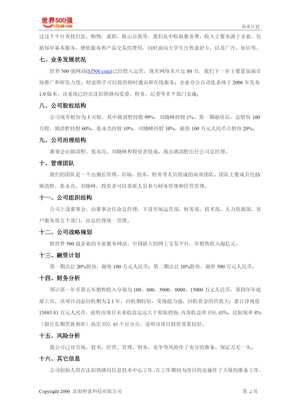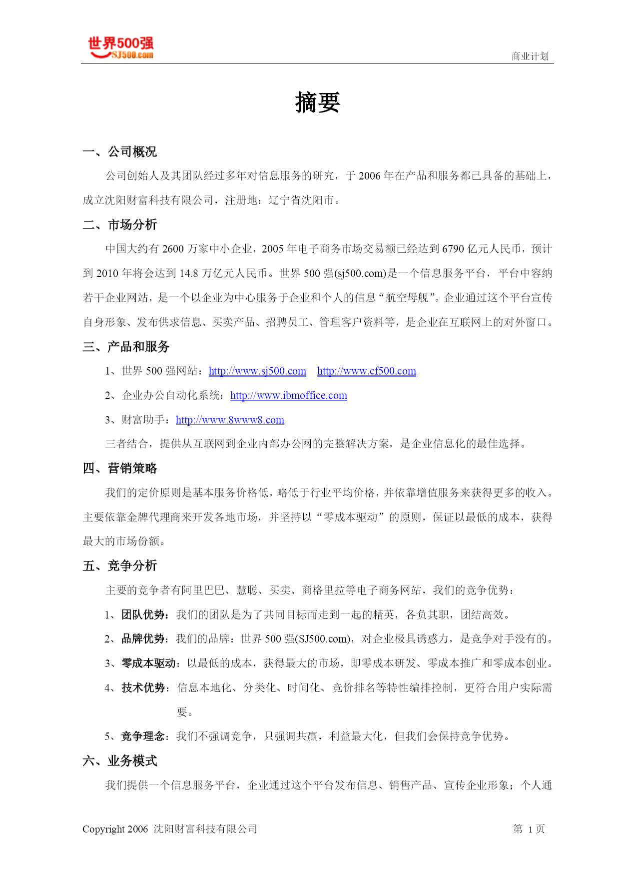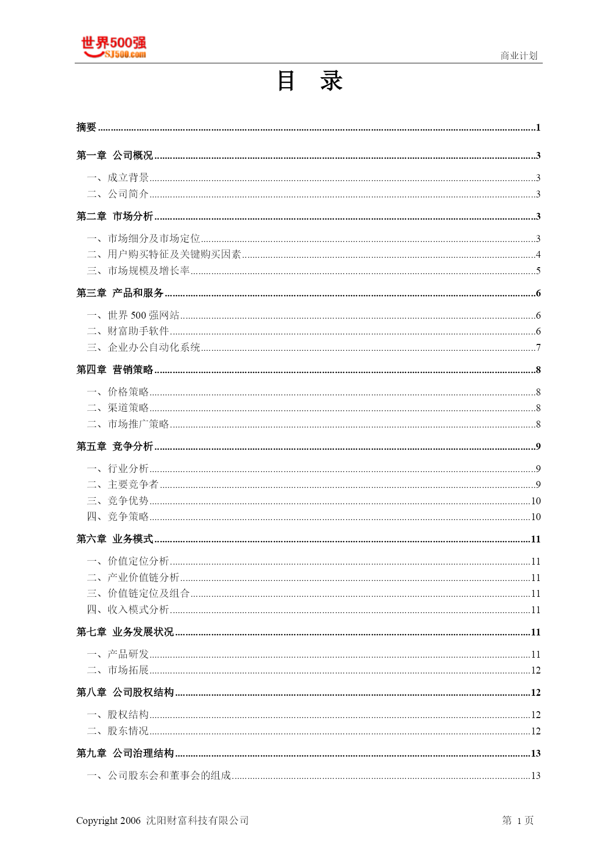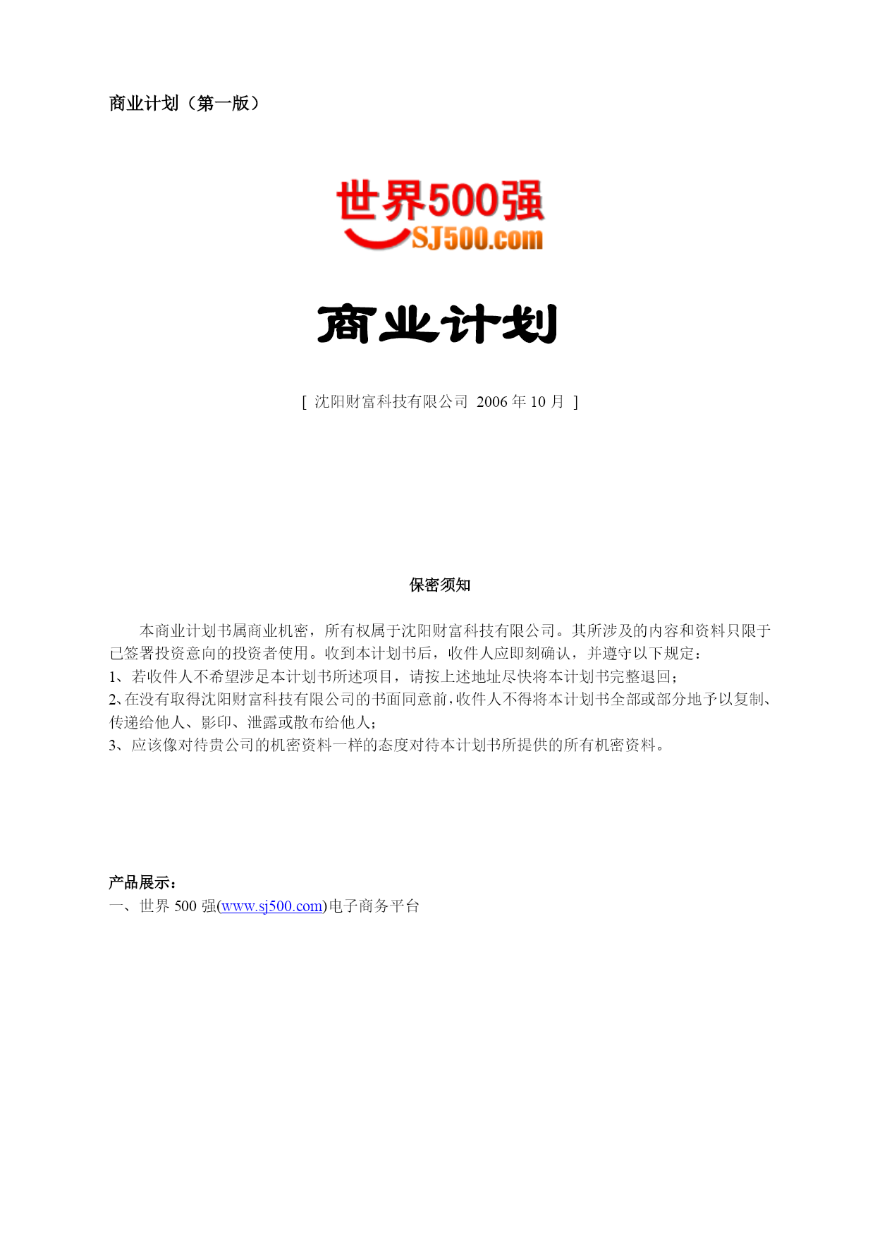 商业计划PAGE1Copyright2006沈阳财富科技有限公司版第PAGE3页商业计划(第一版)商业计划[沈阳财富科技有限公司2006年10月]保密须知本商业计划书属商业机密,所有权属于沈阳财富科技有限公司。其所涉及的内容和资料只限于已签署投资意向的投资者使用。收到本计划书后,收件人应即刻确认,并遵守以下规定:1、若收件人不希望涉足本计划书所述项目,请按上述地址尽快将本计划书完整退回;2、在没有取得沈阳财富科技有限公司的书面同意前,收件人不得将本计划书全部或部分地予以复制、传递给他人、影印、泄露或散布给他人;3、应该像对待贵公司的机密资料一样的态度对待本计划书所提供的所有机密资料。产品展示:一、世界500强(HYPERLINK"http://www.sj500.com"www.sj500.com)电子商务平台二、财富助手三、体系结构四、企业办公自动化系统(www.ibmoffice.com)三者结合提供从互联网到企业内部办公网的完美解决方案。目录TOC\o摘要PAGEREF_Toc158091193\h1第一章公司概况PAGEREF_Toc158091194\h3一、成立背景PAGEREF_Toc158091195\h3二、公司简介PAGEREF_Toc158091196\h3第二章市场分析PAGEREF_Toc158091197\h3一、市场细分及市场定位PAGEREF_Toc158091198\h3二、用户购买特征及关键购买因素PAGEREF_Toc158091199\h4三、市场规模及增长率PAGEREF_Toc158091200\h5第三章产品和服务PAGEREF_Toc158091201\h6一、世界500强网站PAGEREF_Toc158091202\h6二、财富助手软件PAGEREF_Toc158091203\h6三、企业办公自动化系统PAGEREF_Toc158091204\h7第四章营销策略PAGEREF_Toc158091205\h8一、价格策略PAGEREF_Toc158091206\h8二、渠道策略PAGEREF_Toc158091207\h8二、市场推广策略PAGEREF_Toc158091208\h8第五章竞争分析PAGEREF_Toc158091209\h9一、行业分析PAGEREF_Toc158091210\h9二、主要竞争者PAGEREF_Toc158091211\h9三、竞争优势PAGEREF_Toc158091212\h10四、竞争策略PAGEREF_Toc158091213\h10第六章业务模式PAGEREF_Toc158091214\h11一、价值定位分析PAGEREF_Toc158091215\h11二、产业价值链分析PAGEREF_Toc158091216\h11三、价值链定位及组合PAGEREF_Toc158091217\h11四、收入模式分析PAGEREF_Toc158091218\h11第七章业务发展状况PAGEREF_Toc158091219\h11一、产品研发PAGEREF_Toc158091220\h11二、市场拓展PAGEREF_Toc158091221\h12第八章公司股权结构PAGEREF_Toc158091222\h12一、股权结构PAGEREF_Toc158091223\h12二、股东情况PAGEREF_Toc158091224\h12第九章公司治理结构PAGEREF_Toc158091225\h13一、公司股东会和董事会的组成PAGEREF_Toc158091226\h13二、公司股东会和董事会的运作状况PAGEREF_Toc158091227\h13第十章管理团队PAGEREF_Toc158091228\h13一、管理团队主要成员的简历PAGEREF_Toc158091229\h13二、对管理团队成员的评价PAGEREF_Toc158091230\h14第十一章公司组织结构PAGEREF_Toc158091231\h14一、公司的组织结构及职能分工PAGEREF_Toc158091232\h14二、公司组织运作的基本状况