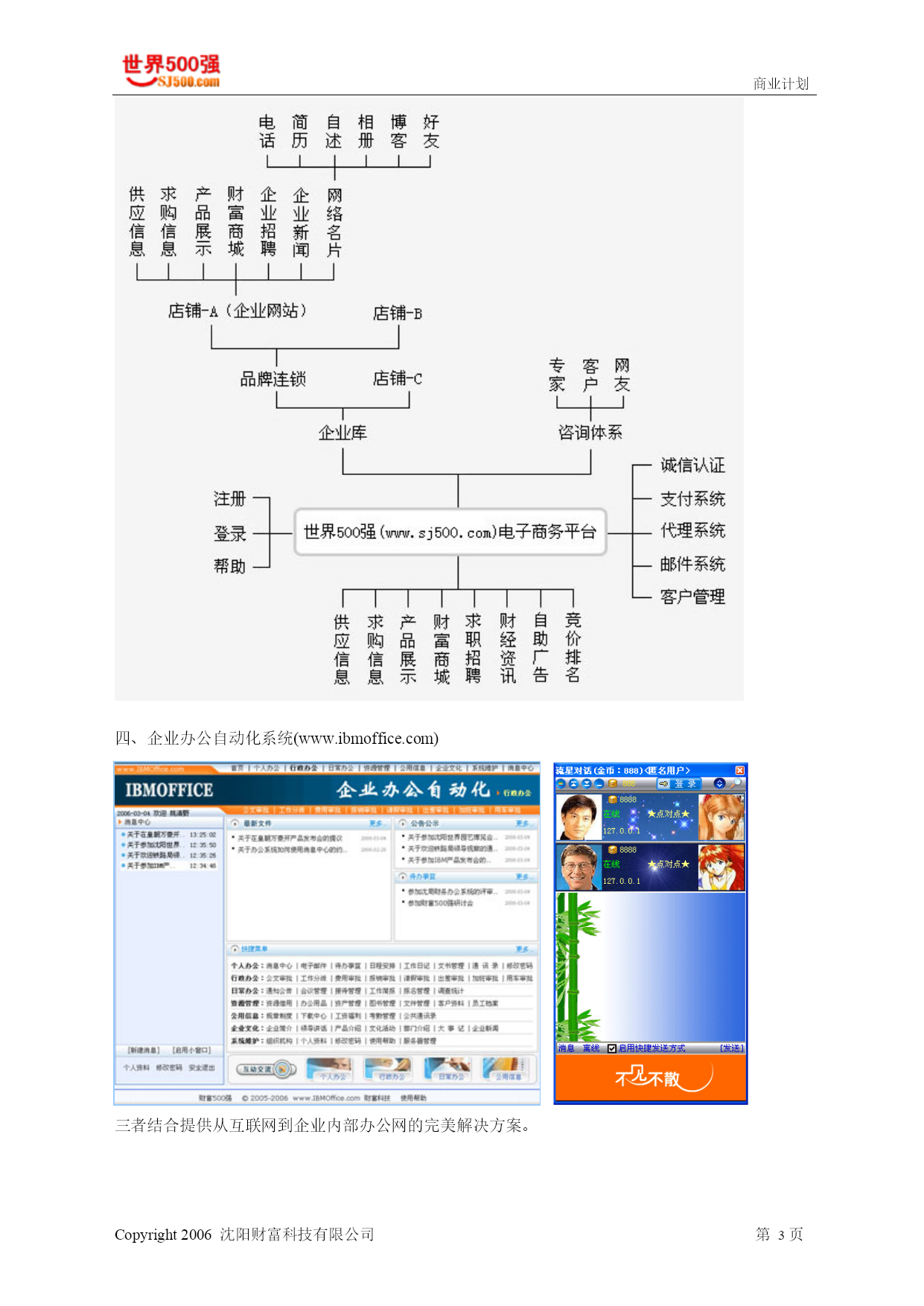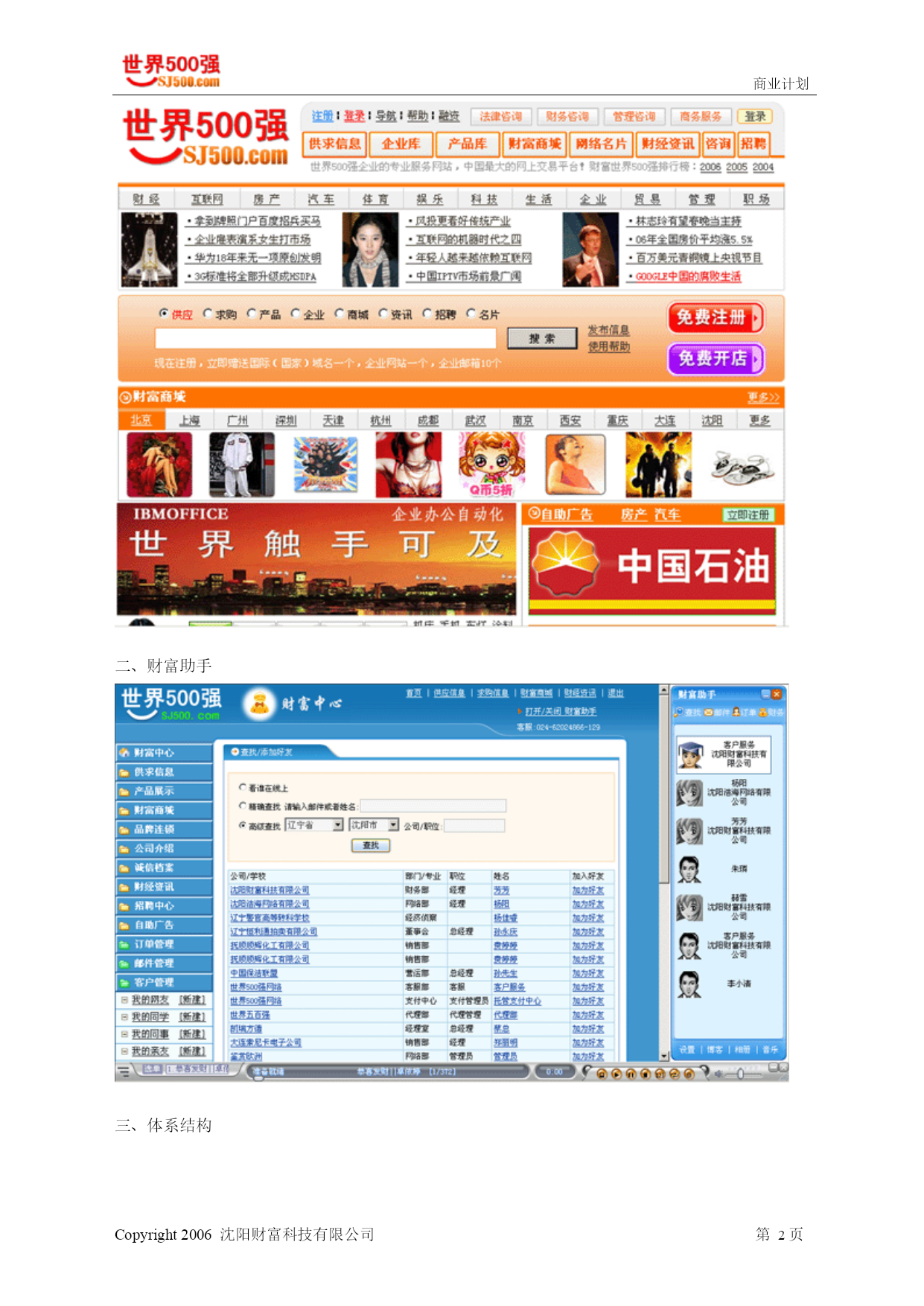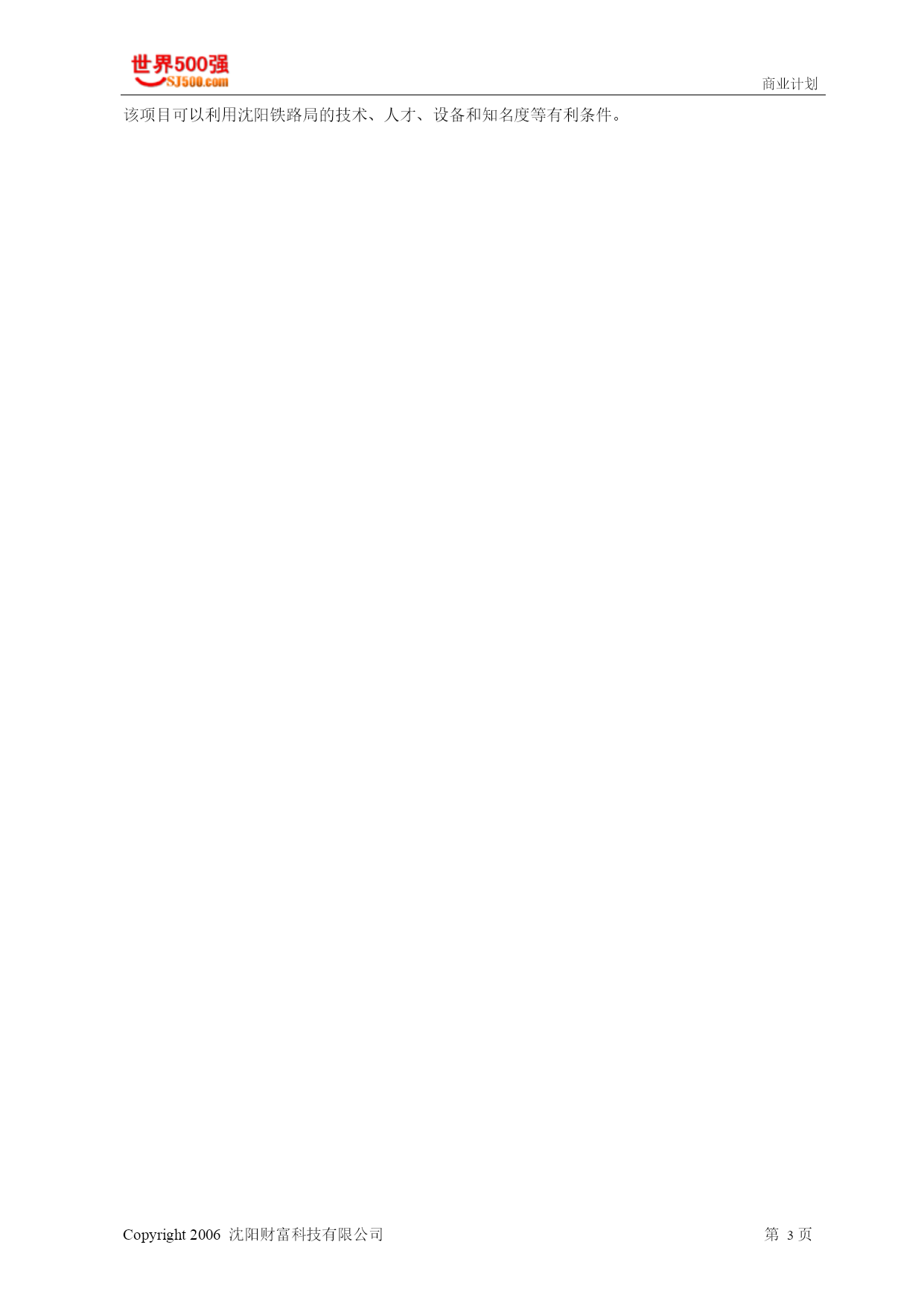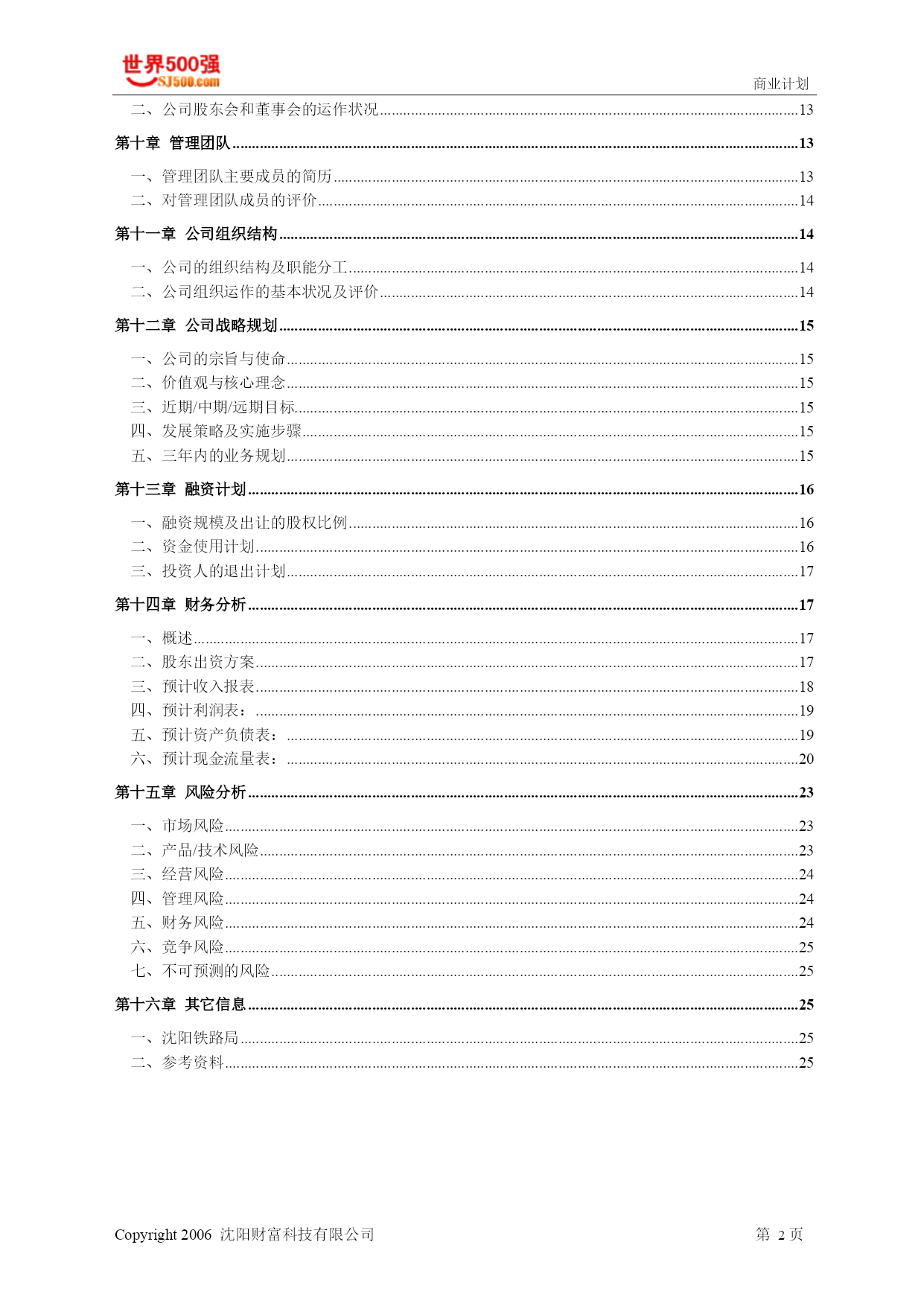 商业计划PAGE1Copyright2006沈阳财富科技有限公司版第PAGE3页商业计划(第一版)商业计划[沈阳财富科技有限公司2006年10月]保密须知本商业计划书属商业机密,所有权属于沈阳财富科技有限公司。其所涉及的内容和资料只限于已签署投资意向的投资者使用。收到本计划书后,收件人应即刻确认,并遵守以下规定:1、若收件人不希望涉足本计划书所述项目,请按上述地址尽快将本计划书完整退回;2、在没有取得沈阳财富科技有限公司的书面同意前,收件人不得将本计划书全部或部分地予以复制、传递给他人、影印、泄露或散布给他人;3、应该像对待贵公司的机密资料一样的态度对待本计划书所提供的所有机密资料。产品展示:一、世界500强(HYPERLINK"http://www.sj500.com"www.sj500.com)电子商务平台二、财富助手三、体系结构四、企业办公自动化系统(www.ibmoffice.com)三者结合提供从互联网到企业内部办公网的完美解决方案。目录TOC\o摘要PAGEREF_Toc158091193\h1第一章公司概况PAGEREF_Toc158091194\h3一、成立背景PAGEREF_Toc158091195\h3二、公司简介PAGEREF_Toc158091196\h3第二章市场分析PAGEREF_Toc158091197\h3一、市场细分及市场定位PAGEREF_Toc158091198\h3二、用户购买特征及关键购买因素PAGEREF_Toc158091199\h4三、市场规模及增长率PAGEREF_Toc158091200\h5第三章产品和服务PAGEREF_Toc158091201\h6一、世界500强网站PAGEREF_Toc158091202\h6二、财富助手软件PAGEREF_Toc158091203\h6三、企业办公自动化系统PAGEREF_Toc158091204\h7第四章营销策略PAGEREF_Toc158091205\h8一、价格策略PAGEREF_Toc158091206\h8二、渠道策略PAGEREF_Toc158091207\h8二、市场推广策略PAGEREF_Toc158091208\h8第五章竞争分析PAGEREF_Toc158091209\h9一、行业分析PAGEREF_Toc158091210\h9二、主要竞争者PAGEREF_Toc158091211\h9三、竞争优势PAGEREF_Toc158091212\h10四、竞争策略PAGEREF_Toc158091213\h10第六章业务模式PAGEREF_Toc158091214\h11一、价值定位分析PAGEREF_Toc158091215\h11二、产业价值链分析PAGEREF_Toc158091216\h11三、价值链定位及组合PAGEREF_Toc158091217\h11四、收入模式分析PAGEREF_Toc158091218\h11第七章业务发展状况PAGEREF_Toc158091219\h11一、产品研发PAGEREF_Toc158091220\h11二、市场拓展PAGEREF_Toc158091221\h12第八章公司股权结构PAGEREF_Toc158091222\h12一、股权结构PAGEREF_Toc158091223\h12二、股东情况PAGEREF_Toc158091224\h12第九章公司治理结构PAGEREF_Toc158091225\h13一、公司股东会和董事会的组成PAGEREF_Toc158091226\h13二、公司股东会和董事会的运作状况PAGEREF_Toc158091227\h13第十章管理团队PAGEREF_Toc158091228\h13一、管理团队主要成员的简历PAGEREF_Toc158091229\h13二、对管理团队成员的评价PAGEREF_Toc158091230\h14第十一章公司组织结构PAGEREF_Toc158091231\h14一、公司的组织结构及职能分工PAGEREF_Toc158091232\h14二、公司组织运作的基本状况