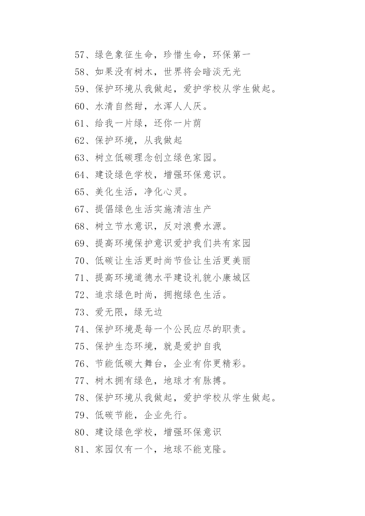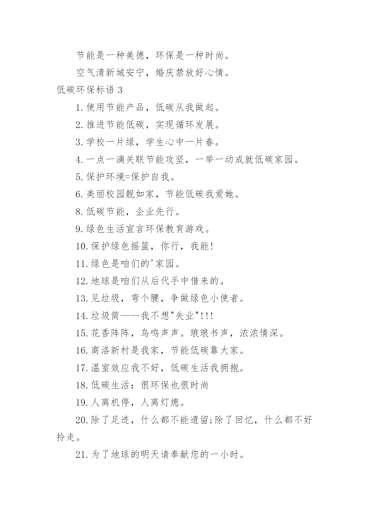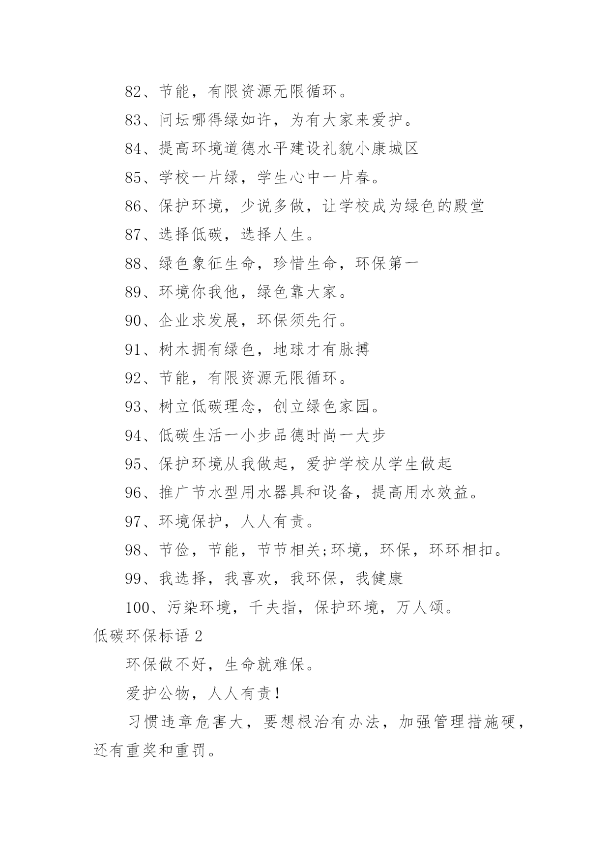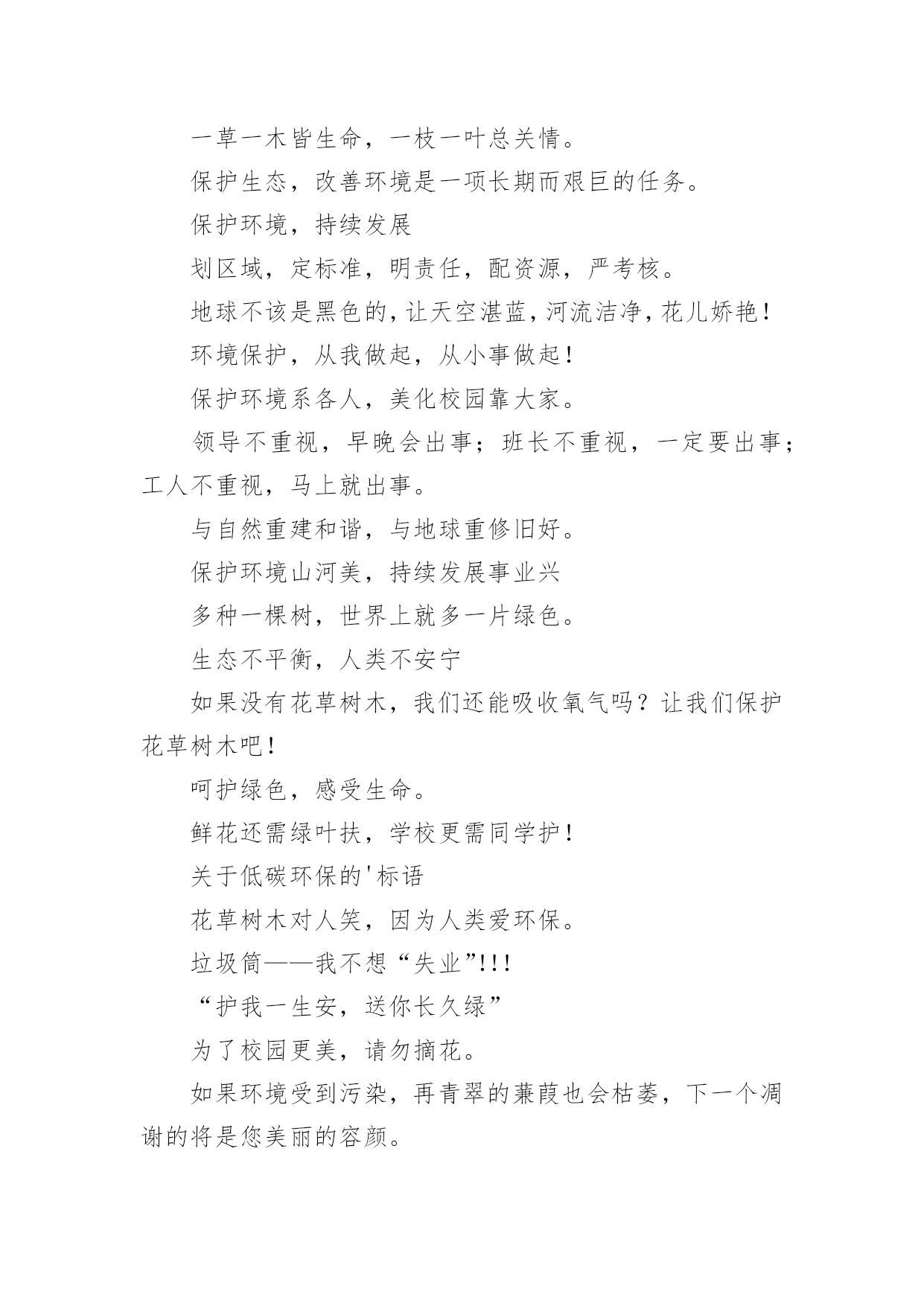 低碳环保标语低碳环保标语在日常学习、工作或生活中,大家最不陌生的就是标语了吧,标语不但折射着时代精神,也体现了执政的方向和智慧,其意义和作用是不容忽视的。你知道什么样的标语才能算得上是好的标语吗?下面是小编帮大家整理的低碳环保标语,希望能够帮助到大家。低碳环保标语11、喝洁净的水,呼吸新鲜的空气,这需要您每时每刻爱护环境!2、绿色生死恋有绿才有生命。3、当绿色褪去,就意味着人类走向命运的低谷。4、同享低碳生活,共建绿色家园。5、学校一片绿,学生心中一片春6、喝洁净的水,呼吸新鲜的空气,这需要您每时每刻爱护环境!7、天蓝水清地绿居佳8、提高环境保护意识,爱护我们共有家园。9、让我们共同拥有一个绿色的地球。10、保护环境,保护自然就是保护人类自我。11、只要给予一些爱,就能给你带来郁郁葱葱的绿荫12、人与自然需要和谐共存。13、提倡绿色生活实施清洁生产14、环境保护是我国一项基本国策。15、拯救地球,从生活中的.细节做起。16、使用节能产品,低碳从我做起。17、只要给予一些爱,就能给你带来郁郁葱葱的绿荫18、企业求发展,环保须先行。19、追求完美生活,应先拥抱绿色!20、选择低碳,选择人生。21、人类仅有好好地对待大自然,大自然才能无限地回报人类22、生产绿色产品,节俭地球资源。23、如果没有树木,世界将会暗淡无光24、保护环境,保护自然就是保护人类自我25、人类仅有好好地对待大自然,大自然才能无限地回报人类。26、节能低碳意义大,行动落实靠大家,关灯节水多步行,绿水青天笑脸迎。27、垃圾筒我不想失业!28、保护戈壁植被,防止沙尘污染,保护大气环境。29、保护环境是每一位公民应尽的职责。30、企业求发展环保须先行31、为了地球的明天请奉献您的一小时32、人人都来爱护它,世界才会更美妙33、追求绿色节能时尚,拥抱绿色低碳生活。34、让学校成为绿色殿堂!35、见垃圾,弯个腰,争做绿色小使者。36、低碳生活一小步,品德时尚一大步。37、倡导低碳生活呵护生态家园共享碧水蓝天38、建设绿色学校,增强环保意识。39、树环保之风,迎完美明天。40、我选择,我喜欢,我环保,我健康。41、为了地球上的生命,清除白色污染。42、绿色是我们的家园43、创造绿色时尚,拥抱绿色生活44、节能是一种美德环保是一种时尚45、倡导低碳生活让地球不再叹息46、不要让绿色从身边消失。47、保护环境,保护自然就是保护人类自我48、树环保之风,迎完美明天。49、选择低碳,选择人生。50、保护蓝天碧水。51、少开车多步行,低碳生活从我做起。52、使用手提袋,低碳生活从我做起!53、绿色奥运应从绿色学校开始54、倡导低碳生活让地球不再叹息。55、别在绿色消失时,我们才去后悔56、合理利用资源保护生态平衡。57、绿色象征生命,珍惜生命,环保第一58、如果没有树木,世界将会暗淡无光59、保护环境从我做起,爱护学校从学生做起。60、水清自然甜,水浑人人厌。61、给我一片绿,还你一片荫62、保护环境,从我做起63、树立低碳理念创立绿色家园。64、建设绿色学校,增强环保意识。65、美化生活,净化心灵。67、提倡绿色生活实施清洁生产68、树立节水意识,反对浪费水源。69、提高环境保护意识爱护我们共有家园70、低碳让生活更时尚节俭让生活更美丽71、提高环境道德水平建设礼貌小康城区72、追求绿色时尚,拥抱绿色生活。73、爱无限,绿无边74、保护环境是每一个公民应尽的职责。75、保护生态环境,就是爱护自我76、节能低碳大舞台,企业有你更精彩。77、树木拥有绿色,地球才有脉搏。78、保护环境从我做起,爱护学校从学生做起。79、低碳节能,企业先行。80、建设绿色学校,增强环保意识81、家园仅有一个,地球不能克隆。82、节能,有限资源无限循环。83、问坛哪得绿如许,为有大家来爱护。84、提高环境道德水平建设礼貌小康城区85、学校一片绿,学生心中一片春。86、保护环境,少说多做,让学校成为绿色的殿堂87、选择低碳,选择人生。88、绿色象征生命,珍惜生命,环保第一89、环境你我他,绿色靠大家。90、企业求发展,环保须先行。91、树木拥有绿色,地球才有脉搏92、节能,有限资源无限循环。93、树立低碳理念,创立绿色家园。94、低碳生活一小步品德时尚一大步95、保护环境从我做起,爱护学校从学生做起96、推广节水型用水器具和设备,提高用水效益。97、环境保护,人人有责。98、节俭,节能,节节相关;环境,环保,环环相扣。99、我选择,我喜欢,我环保,我健康100、污染环境,千夫指,保护环境,万人颂。低碳环保标语2环保做不好,生命就难保。爱护公物,人人有责!习惯违章危害大,要想根治有办法,加强管理措施硬,还有重奖和重罚。鸟语花香,爱赏共享。青山绿水蓝天,共创美好人间。保护水资源,促进西部大开发;节约每滴水,共