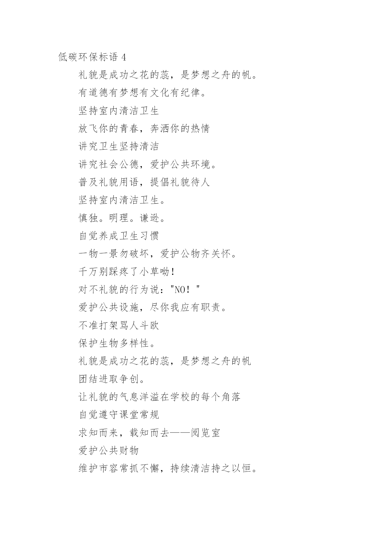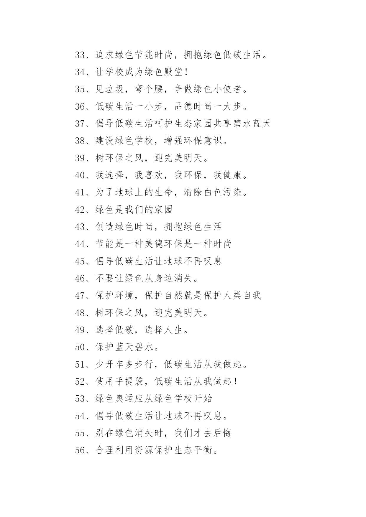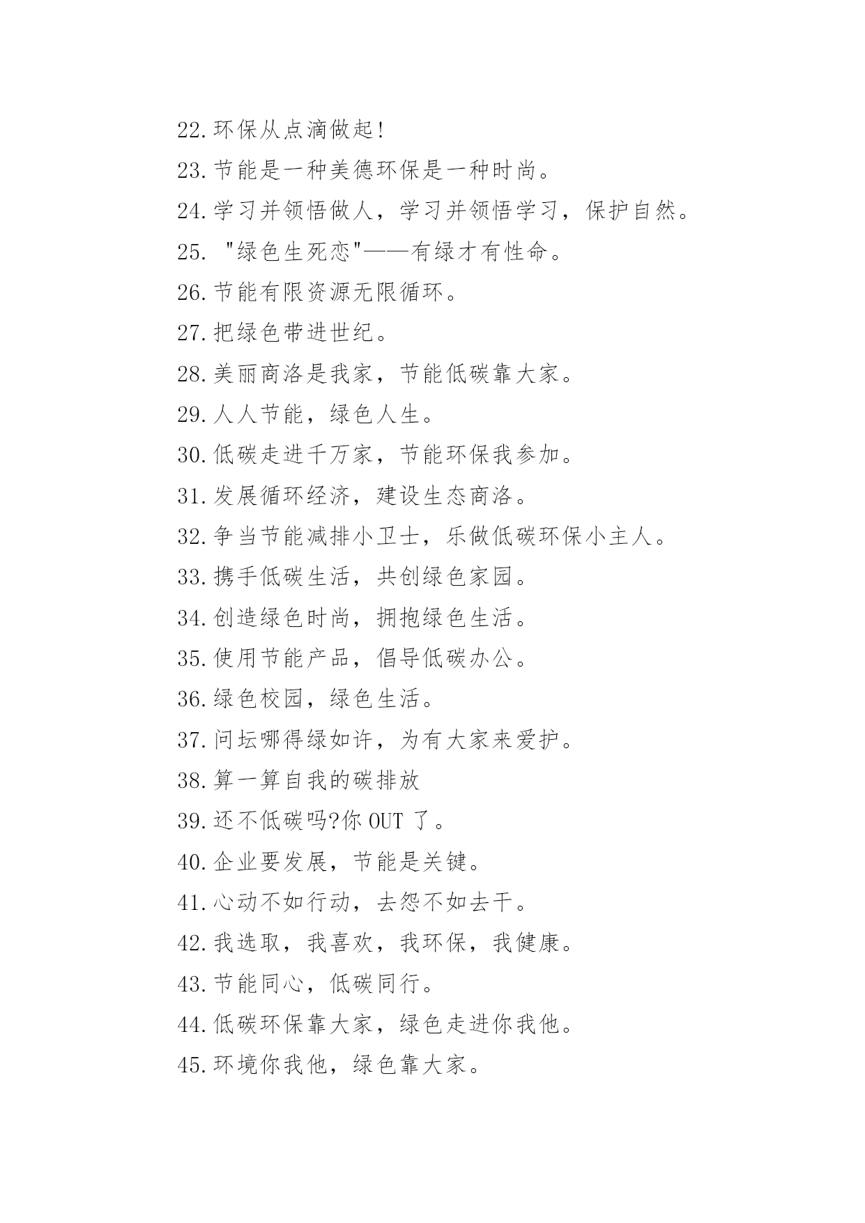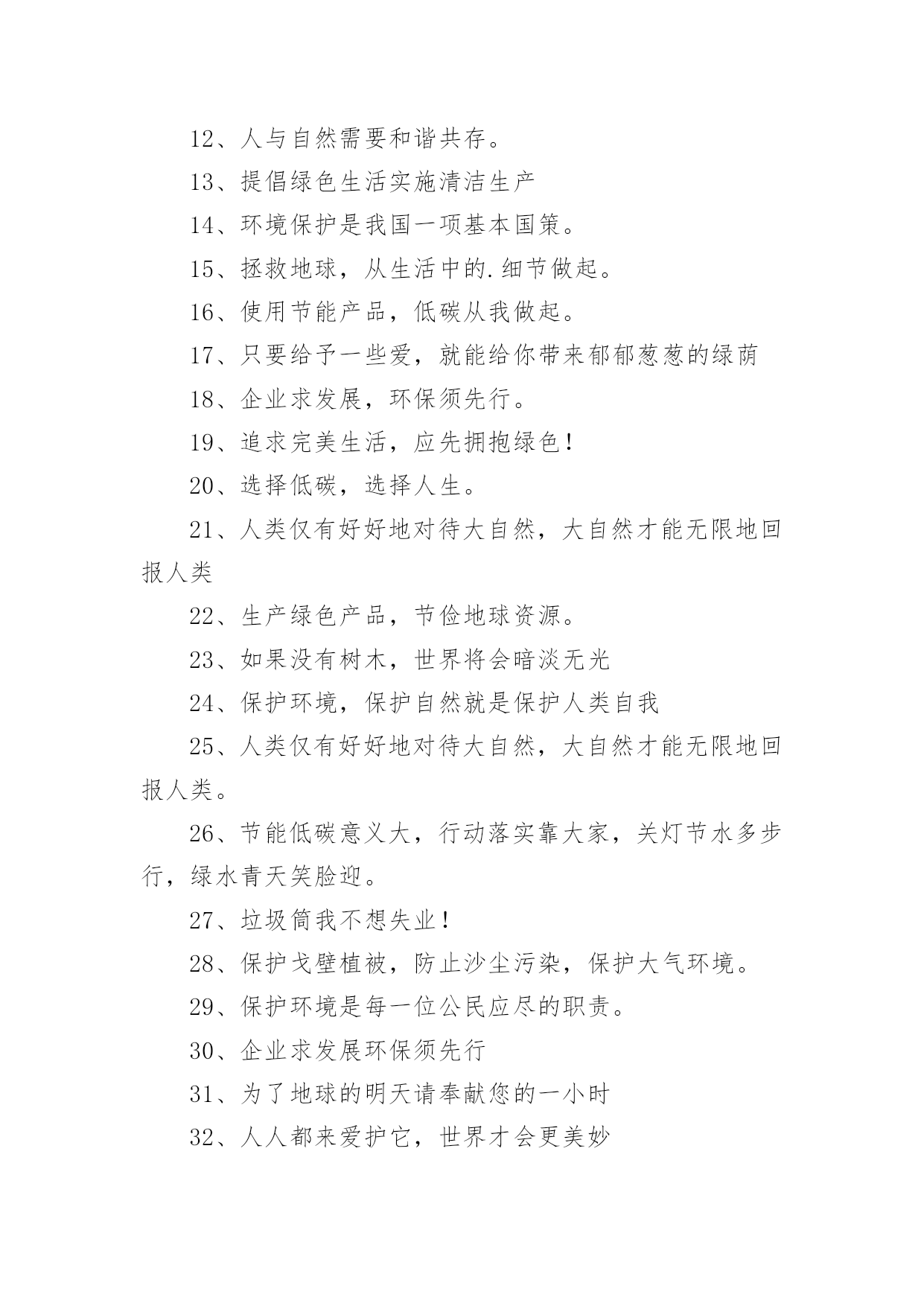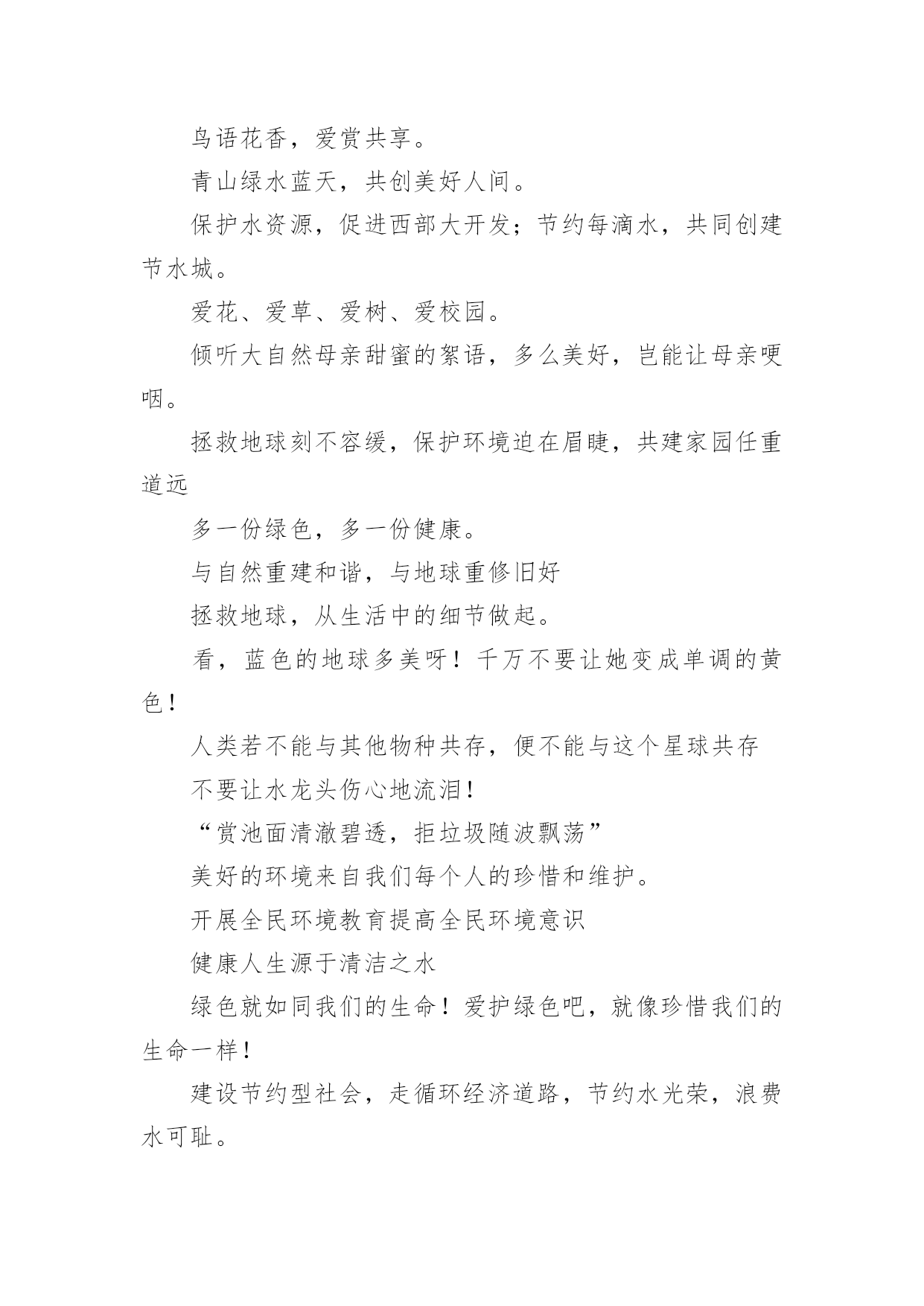 低碳环保标语低碳环保标语在日常学习、工作或生活中,大家最不陌生的就是标语了吧,标语不但折射着时代精神,也体现了执政的方向和智慧,其意义和作用是不容忽视的。你知道什么样的标语才能算得上是好的标语吗?下面是小编帮大家整理的低碳环保标语,希望能够帮助到大家。低碳环保标语11、喝洁净的水,呼吸新鲜的空气,这需要您每时每刻爱护环境!2、绿色生死恋有绿才有生命。3、当绿色褪去,就意味着人类走向命运的低谷。4、同享低碳生活,共建绿色家园。5、学校一片绿,学生心中一片春6、喝洁净的水,呼吸新鲜的空气,这需要您每时每刻爱护环境!7、天蓝水清地绿居佳8、提高环境保护意识,爱护我们共有家园。9、让我们共同拥有一个绿色的地球。10、保护环境,保护自然就是保护人类自我。11、只要给予一些爱,就能给你带来郁郁葱葱的绿荫12、人与自然需要和谐共存。13、提倡绿色生活实施清洁生产14、环境保护是我国一项基本国策。15、拯救地球,从生活中的.细节做起。16、使用节能产品,低碳从我做起。17、只要给予一些爱,就能给你带来郁郁葱葱的绿荫18、企业求发展,环保须先行。19、追求完美生活,应先拥抱绿色!20、选择低碳,选择人生。21、人类仅有好好地对待大自然,大自然才能无限地回报人类22、生产绿色产品,节俭地球资源。23、如果没有树木,世界将会暗淡无光24、保护环境,保护自然就是保护人类自我25、人类仅有好好地对待大自然,大自然才能无限地回报人类。26、节能低碳意义大,行动落实靠大家,关灯节水多步行,绿水青天笑脸迎。27、垃圾筒我不想失业!28、保护戈壁植被,防止沙尘污染,保护大气环境。29、保护环境是每一位公民应尽的职责。30、企业求发展环保须先行31、为了地球的明天请奉献您的一小时32、人人都来爱护它,世界才会更美妙33、追求绿色节能时尚,拥抱绿色低碳生活。34、让学校成为绿色殿堂!35、见垃圾,弯个腰,争做绿色小使者。36、低碳生活一小步,品德时尚一大步。37、倡导低碳生活呵护生态家园共享碧水蓝天38、建设绿色学校,增强环保意识。39、树环保之风,迎完美明天。40、我选择,我喜欢,我环保,我健康。41、为了地球上的生命,清除白色污染。42、绿色是我们的家园43、创造绿色时尚,拥抱绿色生活44、节能是一种美德环保是一种时尚45、倡导低碳生活让地球不再叹息46、不要让绿色从身边消失。47、保护环境,保护自然就是保护人类自我48、树环保之风,迎完美明天。49、选择低碳,选择人生。50、保护蓝天碧水。51、少开车多步行,低碳生活从我做起。52、使用手提袋,低碳生活从我做起!53、绿色奥运应从绿色学校开始54、倡导低碳生活让地球不再叹息。55、别在绿色消失时,我们才去后悔56、合理利用资源保护生态平衡。57、绿色象征生命,珍惜生命,环保第一58、如果没有树木,世界将会暗淡无光59、保护环境从我做起,爱护学校从学生做起。60、水清自然甜,水浑人人厌。61、给我一片绿,还你一片荫62、保护环境,从我做起63、树立低碳理念创立绿色家园。64、建设绿色学校,增强环保意识。65、美化生活,净化心灵。67、提倡绿色生活实施清洁生产68、树立节水意识,反对浪费水源。69、提高环境保护意识爱护我们共有家园70、低碳让生活更时尚节俭让生活更美丽71、提高环境道德水平建设礼貌小康城区72、追求绿色时尚,拥抱绿色生活。73、爱无限,绿无边74、保护环境是每一个公民应尽的职责。75、保护生态环境,就是爱护自我76、节能低碳大舞台,企业有你更精彩。77、树木拥有绿色,地球才有脉搏。78、保护环境从我做起,爱护学校从学生做起。79、低碳节能,企业先行。80、建设绿色学校,增强环保意识81、家园仅有一个,地球不能克隆。82、节能,有限资源无限循环。83、问坛哪得绿如许,为有大家来爱护。84、提高环境道德水平建设礼貌小康城区85、学校一片绿,学生心中一片春。86、保护环境,少说多做,让学校成为绿色的殿堂87、选择低碳,选择人生。88、绿色象征生命,珍惜生命,环保第一89、环境你我他,绿色靠大家。90、企业求发展,环保须先行。91、树木拥有绿色,地球才有脉搏92、节能,有限资源无限循环。93、树立低碳理念,创立绿色家园。94、低碳生活一小步品德时尚一大步95、保护环境从我做起,爱护学校从学生做起96、推广节水型用水器具和设备,提高用水效益。97、环境保护,人人有责。98、节俭,节能,节节相关;环境,环保,环环相扣。99、我选择,我喜欢,我环保,我健康100、污染环境,千夫指,保护环境,万人颂。低碳环保标语2环保做不好,生命就难保。爱护公物,人人有责!习惯违章危害大,要想根治有办法,加强管理措施硬,还有重奖和重罚。鸟语花香,爱赏共享。青山绿水蓝天,共创美好人间。保护水资源,促进西部大开发;节约每滴水,共