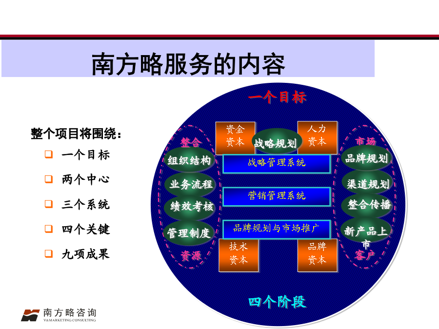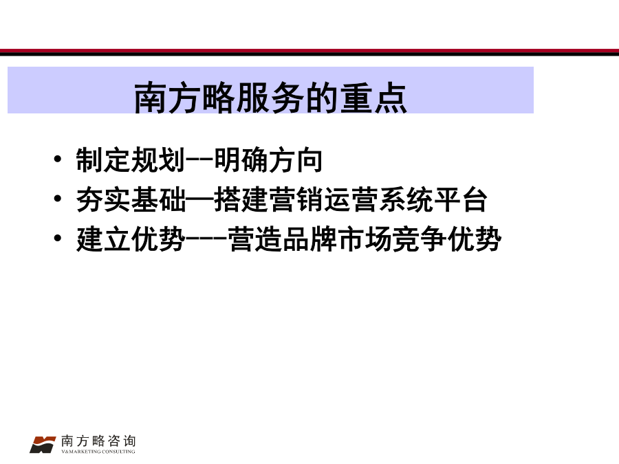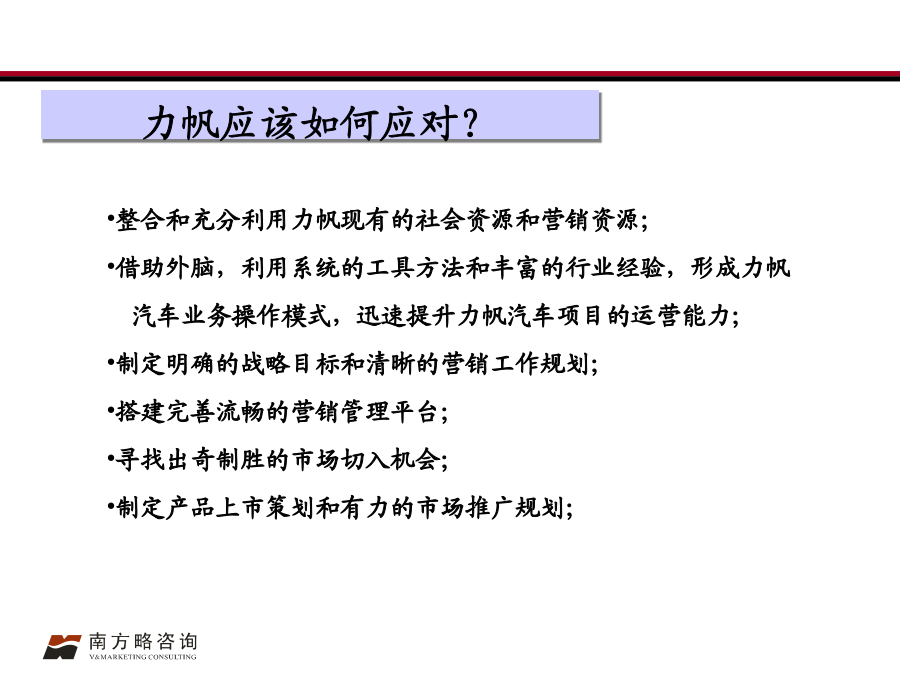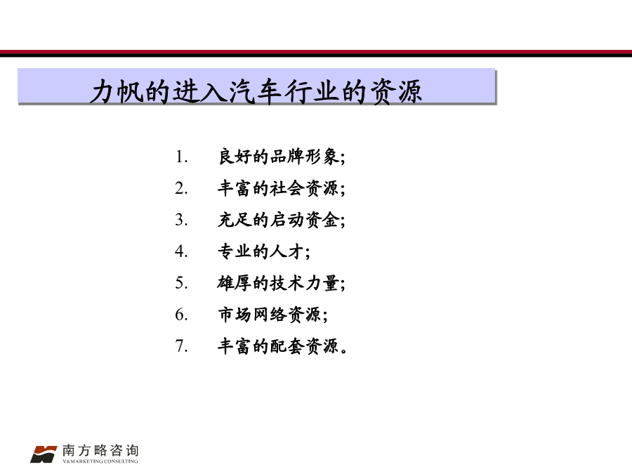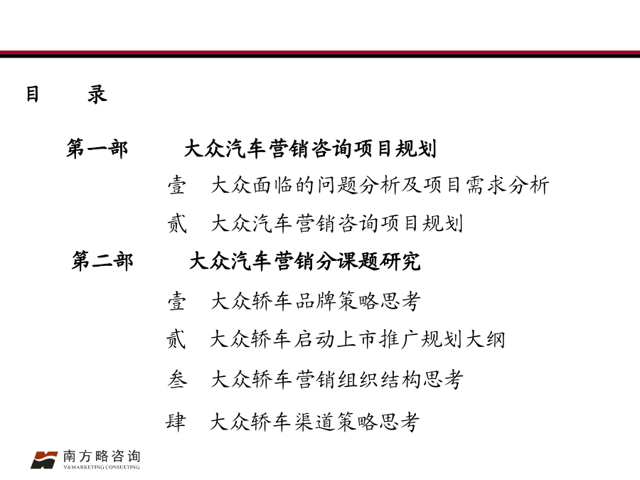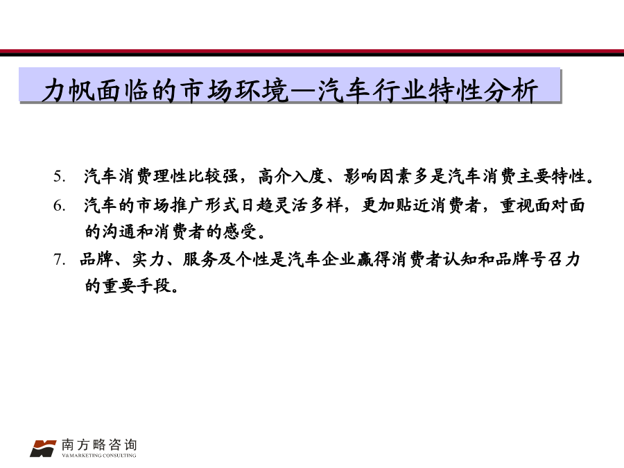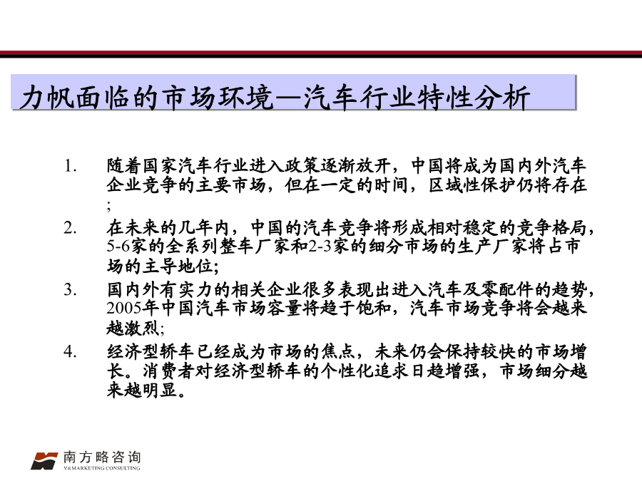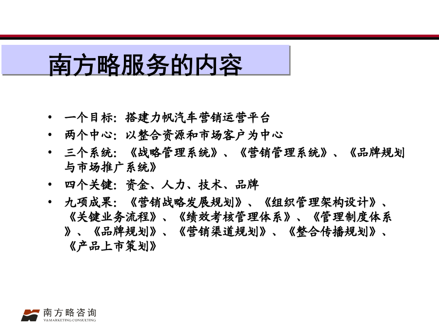 市场营销学习参考目录力帆面临的市场环境—汽车行业特性分析力帆面临的市场环境—汽车行业特性分析力帆的进入汽车行业的资源力帆进入汽车行业面临的困难力帆应该如何应对?南方略服务的重点南方略服务的内容一个目标:搭建力帆汽车营销运营平台两个中心:以整合资源和市场客户为中心三个系统:《战略管理系统》、《营销管理系统》、《品牌规划与市场推广系统》四个关键:资金、人力、技术、品牌九项成果:《营销战略发展规划》、《组织管理架构设计》、《关键业务流程》、《绩效考核管理体系》、《管理制度体系》、《品牌规划》、《营销渠道规划》、《整合传播规划》、《产品上市策划》第二阶段营销管理体系目录目录一、汽车行业和营销特征1、汽车属国家支柱产业,受技术、宏观经济政策和市场环境等因素影响大2、产品推向市场后需要强大的保障体系“销售汽车”=“整车+配件+技术服务”3、汽车属复杂性购买,消费行为理性,决策过程长1)产品价值高2)高技术,消费者有技术“壁垒”3)产品和品牌多,差异性难为消费者所识别4)较重视品牌4、竞争品牌多,竞争激烈,呈现白热化状态汽车行业及其营销组织特性3.强大市场预测、计划组织与管理功能。汽车所涉及零配件品种过万种,生产组织难度异常大如协作配套复杂,加之汽车产品价值高,过大的库存给企业带来巨大压力。4.产品体积大,占地面积大,而且对产品合格入出库要求高,质量检查工作量大,组织需要强大的检查、仓储、物流和配送体系。5.强大财务结算和管理功能。与总装厂的内部结算业务,汽车销售结算业务,配件销售结算业务,三包赔偿处理业务,销售公司财务管理与预算等。二、几种常见的汽车营销组织分析(1)广州本田营销组织结构图(2)神龙汽车营销组织结构图整车销售主导型特点长安汽车集团市场服务保障型组织特点东风乘用车营销组织结构图品牌导向型组织特点(2)上海通用营销组织结构图产销分离型组织的特点三、力帆现阶段组织战略选择思考力帆轿车现阶段所面对的资源和挑战力帆轿车为新上项目,基于内部筹备及资源现状,需分阶段实现,下面基于上市阶段进行讨论。现阶段的主要困难和挑战主要在:汽车渠道建设与形成难度巨大技术服务站规划与建设工作量巨大汽车销售人才和管理人才严重缺乏配件销售人才和管理人才严重缺乏技术服务人才和管理人才严重缺乏汽车组织建设、管理、营销及经营经验缺乏大众汽车营销组织策略目录目录一、我国汽车渠道发展现状与特征分析二、国内外汽车渠道模式的分析三、大众轿车现阶段的渠道规划思路一、我国汽车渠道发展特征分析进口轿车二、国内外汽车渠道的分析我国汽车多元化渠道模式我国汽车主导型渠道模式国外汽车销售渠道模式—德国大众国外汽车销售渠道模式—法国雪特龙日本汽车公司国内外汽车渠道模式三、大众轿车现阶段的渠道规划思路大众发展现状对力帆汽车的要求大众渠道的总体策略选择力帆渠道设计考虑的要点大众轿车渠道的管理方式附件2、南方略介绍亚洲第1家加入AMCF(全球管理顾问公司协会)的咨询公司集团每年营业额5000万元以上,在国内同行业名列第1名先后为300多家客户提供服务18个行业领域和10个专业领域的专业技能集团具有300多名国内一流的市场研究、营销及人力资源管理咨询、策划专家市场研究、战略定位、营销管理、、品牌、传播等方面专业化的营销咨询公司尤其擅长的行业:快速消费品、连锁经营、日化、汽车及零配件、机械、化工、建材、电子、金融等客户分布在全国各个地区以及台湾地区深圳瑞德丰农药天创数码深圳市大佛药业有限公司www.szdaphne.com刘祖轲资历:清华大学MBA、中国企业联合会高级管理咨询顾问,中山大学市场营销培训教授,中国职业经理人培训学院教授、全国高级营销经理职业培训班特聘讲师,深圳市管理干部培训中心特聘讲师,广东高科技商会特聘顾问,深圳市咨询业委员会专家组组长,《销售与市场》、《新营销》、《销售与管理》等营销杂志顾问;经历:曾在国外从事国际市场营销两年,回国后先后任职于东风汽车公司、华为公司高级营销管理职位,具有18年国内外市场营销管理实战经验;专长:国际市场与渠道的研究,顾问计算与方法的研究、企业管理模型研究、优秀经理人模型研究等成功案例:著有《中国管理顾问手册》《东风汽车营销组织重构》、《赢得应变》、《企业七大竞争优势》等书籍,成功辅导过东风汽车、胜利油田、光大依波表、力帆集团、徐工集团等百余家企业。李宝顺资历:南方略咨询部总监,高级顾问师,中山大学MBA、国家认证商业经济师、中国企业联合会高级管理咨询顾问,,深圳市管理干部培训中心特聘讲师,PTT国际认证讲师,《销售与市场》、《新营销》、《销售与管理》等营销专业杂志特约撰稿人;经历:十五年营销管理实战经验,曾在美媛春,香港梁氏集团等知名企业任职