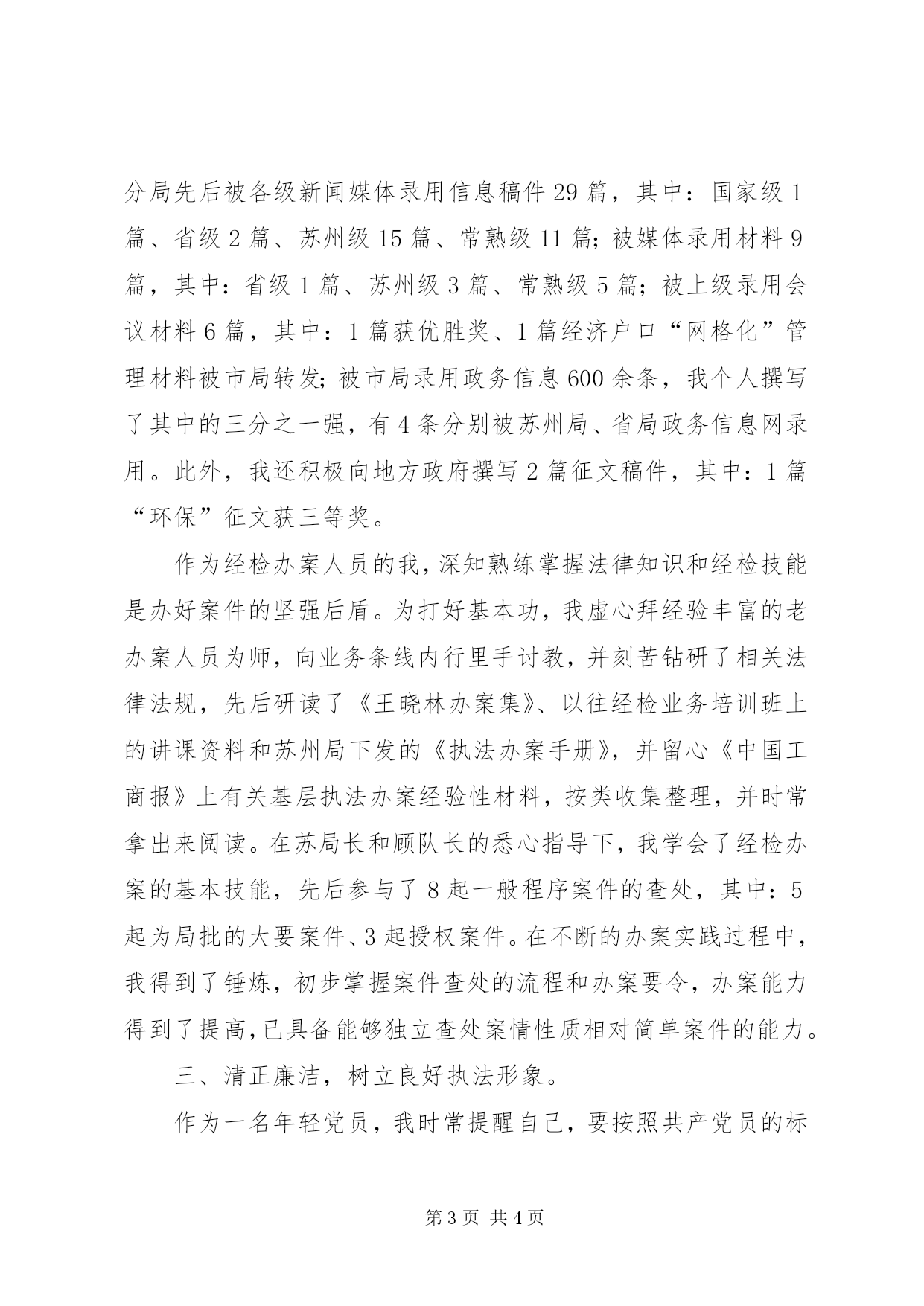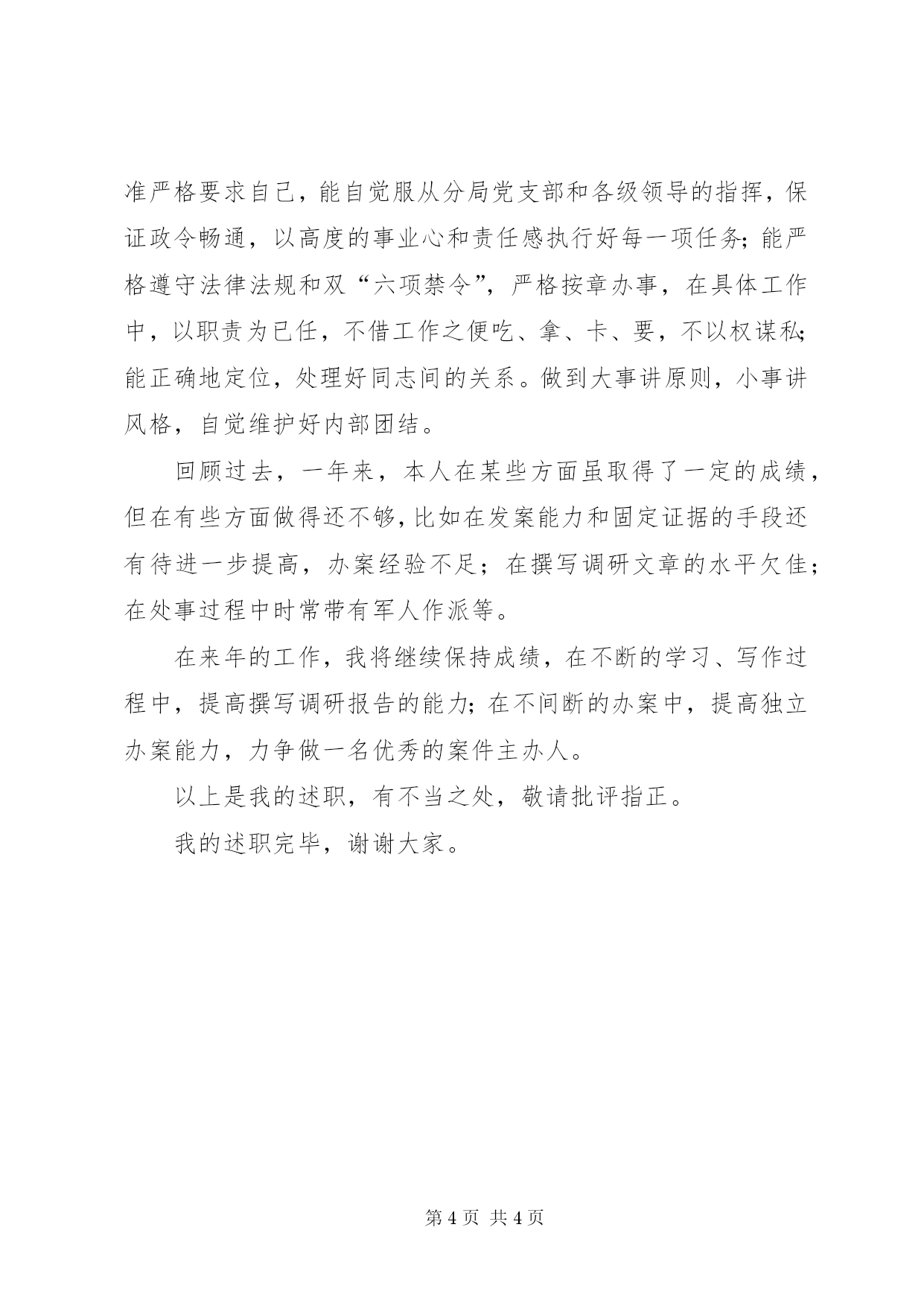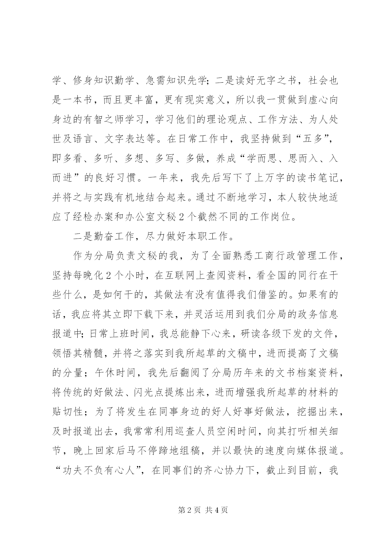 第PAGE\*Arabic\*MERGEFORMAT4页共NUMPAGES\*MERGEFORMAT4页工商局军转干部述职报告述职报告尊敬的领导、同志们:大家好。时光飞速,弹指一挥间,我转业至某工商分局已一年有余。回顾2006,本人收获多多。在市局和分局两级党组织的正确领导下,我顺利地实现了由一名军转干部到一名地方国家公务员的岗位转变;在经检中队长和综合组长的悉心栽培下,我较快地完成了由一名部队财务助理员到经检中队案件承办人和分局文秘的角色转换。根据要求,现就一年来的情况,向在座的各位领导和同志们汇报如下:一、努力学习,快速适应新岗位。学习是明确政治方向,提高能力水平的重要途径,更是适应新形势、新环境的必然要求。对我而言,面对由部队到地方的岗位转变,唯恐辜负组织的培养和领导的信任,更加自觉刻苦地学习政治理论和业务知识,努力提高自身政治水平和综合能力,尽快进入情况,适应新岗位。为此,我坚持做到勤学习、多思考、善总结,并自加压力,时常提醒自己要认真读好“两本书”,一是读好有字之书,即时刻向书本学习,学习政治理论、学习工商法律法规和经检办案业务技能,做到基础知识通学、法律知识深学、修身知识勤学、急需知识先学;二是读好无字之书,社会也是一本书,而且更丰富,更有现实意义,所以我一贯做到虚心向身边的有智之师学习,学习他们的理论观点、工作方法、为人处世及语言、文字表达等。在日常工作中,我坚持做到“五多”,即多看、多听、多想、多写、多做,养成“学而思、思而入、入而进”的良好习惯。一年来,我先后写下了上万字的读书笔记,并将之与实践有机地结合起来。通过不断地学习,本人较快地适应了经检办案和办公室文秘2个截然不同的工作岗位。二是勤奋工作,尽力做好本职工作。作为分局负责文秘的我,为了全面熟悉工商行政管理工作,坚持每晚化2个小时,在互联网上查阅资料,看全国的同行在干些什么,是如何干的,其做法有没有值得我们借鉴的。如果有的话,我应将其立即下载下来,并灵活运用到我们分局的政务信息报道中;日常上班时间,我总能静下心来,研读各级下发的文件,领悟其精髓,并将之落实到我所起草的文稿中,进而提高了文稿的分量;午休时间,我先后翻阅了分局历年来的文书档案资料,将传统的好做法、闪光点提炼出来,进而增强我所起草的材料的贴切性;为了将发生在同事身边的好人好事好做法,挖掘出来,及时报道出去,我常常利用巡查人员空闲时间,向其打听相关细节,晚上回家后马不停蹄地组稿,并以最快的速度向媒体报道。“功夫不负有心人”,在同事们的齐心协力下,截止到目前,我分局先后被各级新闻媒体录用信息稿件29篇,其中:国家级1篇、省级2篇、苏州级15篇、常熟级11篇;被媒体录用材料9篇,其中:省级1篇、苏州级3篇、常熟级5篇;被上级录用会议材料6篇,其中:1篇获优胜奖、1篇经济户口“网格化”管理材料被市局转发;被市局录用政务信息600余条,我个人撰写了其中的三分之一强,有4条分别被苏州局、省局政务信息网录用。此外,我还积极向地方政府撰写2篇征文稿件,其中:1篇“环保”征文获三等奖。作为经检办案人员的我,深知熟练掌握法律知识和经检技能是办好案件的坚强后盾。为打好基本功,我虚心拜经验丰富的老办案人员为师,向业务条线内行里手讨教,并刻苦钻研了相关法律法规,先后研读了《王晓林办案集》、以往经检业务培训班上的讲课资料和苏州局下发的《执法办案手册》,并留心《中国工商报》上有关基层执法办案经验性材料,按类收集整理,并时常拿出来阅读。在苏局长和顾队长的悉心指导下,我学会了经检办案的基本技能,先后参与了8起一般程序案件的查处,其中:5起为局批的大要案件、3起授权案件。在不断的办案实践过程中,我得到了锤炼,初步掌握案件查处的流程和办案要令,办案能力得到了提高,已具备能够独立查处案情性质相对简单案件的能力。三、清正廉洁,树立良好执法形象。作为一名年轻党员,我时常提醒自己,要按照共产党员的标准严格要求自己,能自觉服从分局党支部和各级领导的指挥,保证政令畅通,以高度的事业心和责任感执行好每一项任务;能严格遵守法律法规和双“六项禁令”,严格按章办事,在具体工作中,以职责为已任,不借工作之便吃、拿、卡、要,不以权谋私;能正确地定位,处理好同志间的关系。做到大事讲原则,小事讲风格,自觉维护好内部团结。回顾过去,一年来,本人在某些方面虽取得了一定的成绩,但在有些方面做得还不够,比如在发案能力和固定证据的手段还有待进一步提高,办案经验不足;在撰写调研文章的水平欠佳;在处事过程中时常带有军人作派等。在来年的工作,我将继续保持成绩,在不断的学习、写作过程中,提高撰写调研报告的能力;在不间断的办案中,提高独立办案能力,力争做一名优秀的案件主办人。以上是我的述职,有不当之处,敬请批评指正。我的述职完毕,谢谢大家。