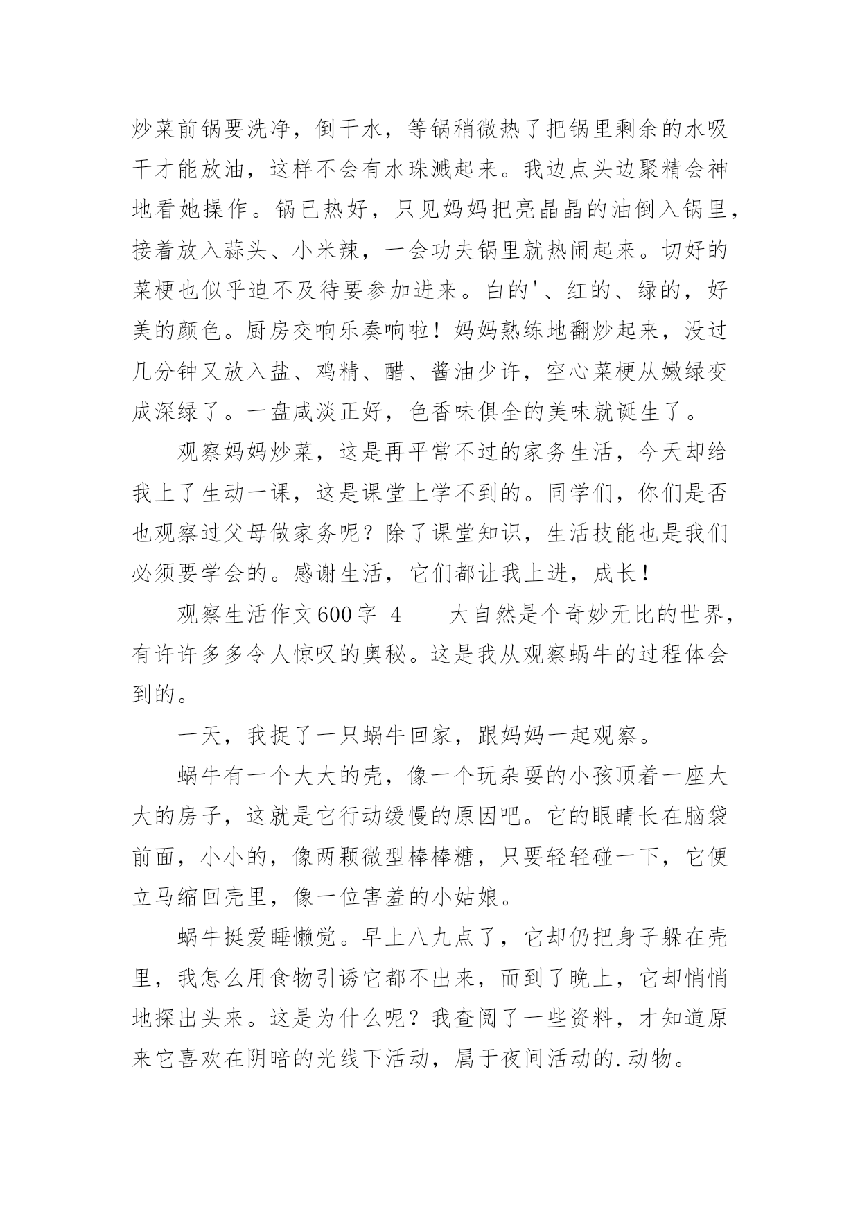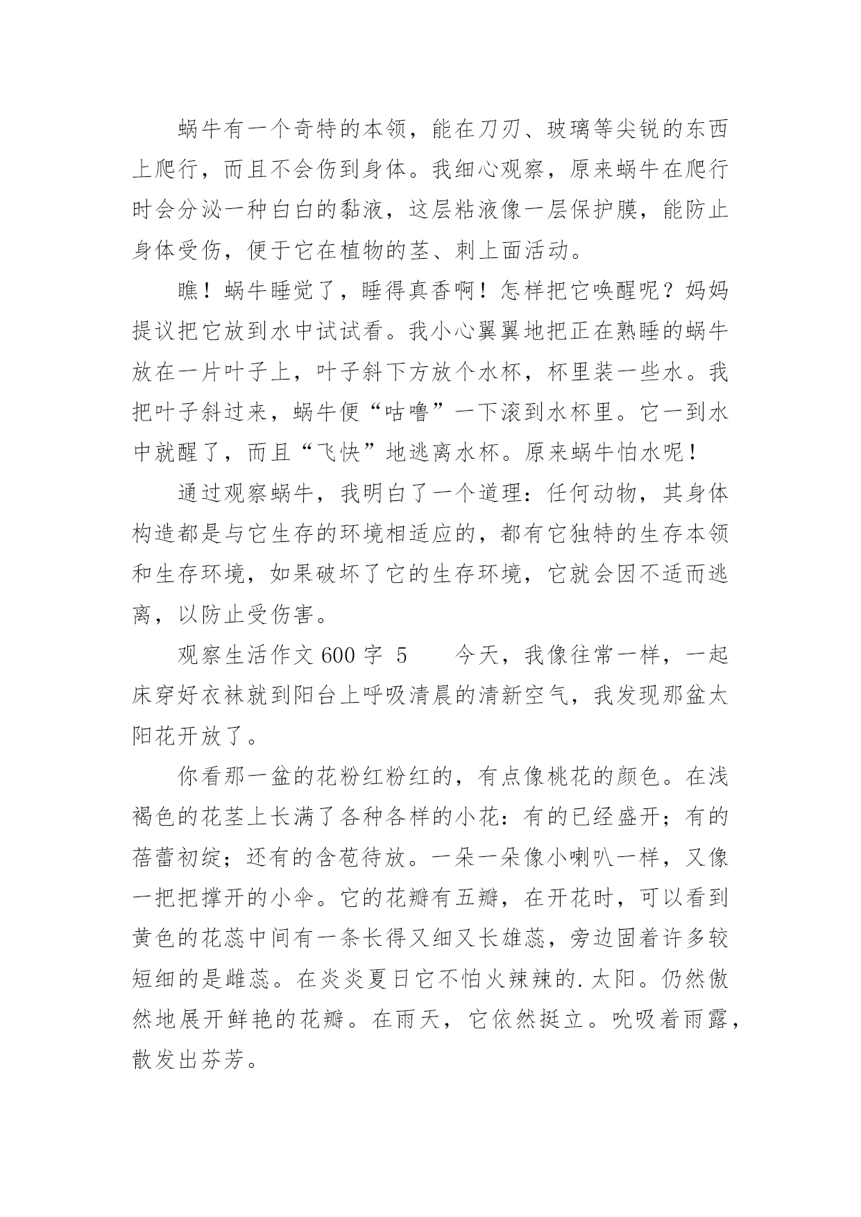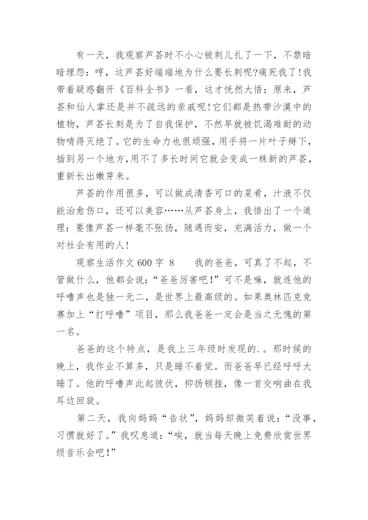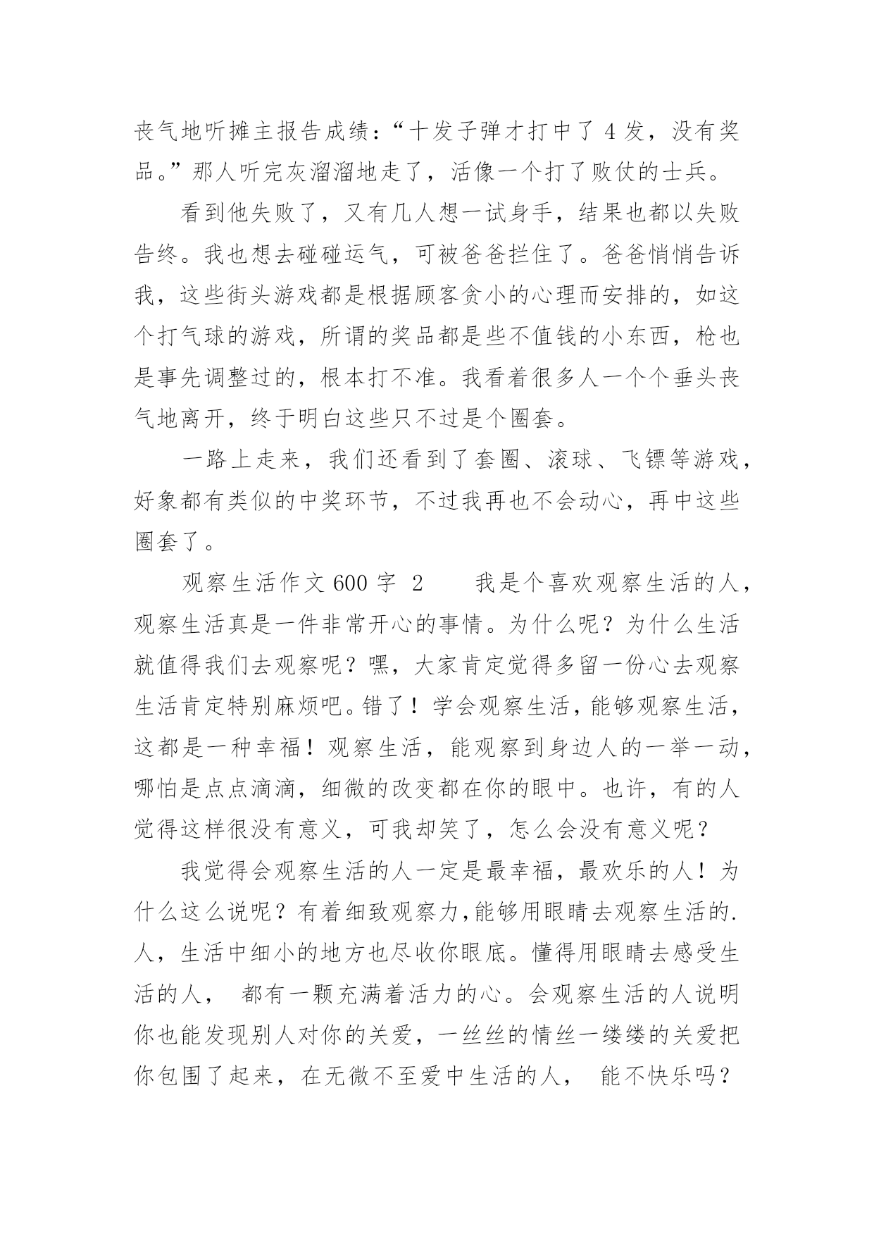 观察生活作文600字观察生活作文600字(通用43篇)在日常学习、工作和生活中,大家都经常接触到作文吧,写作文是培养人们的观察力、联想力、想象力、思考力和记忆力的重要手段。作文的注意事项有许多,你确定会写吗?以下是小编精心整理的观察生活作文600字,仅供参考,欢迎大家阅读。观察生活作文600字1寒假里,我随父母来到了江苏老家探亲。爸爸觉得我一个人在家太闷,就带我上街逛逛,希望可以找点乐子。哇!春节的大街上真热闹,街上人山人海,看来过年出来玩的人还真不少。走着走着,我们发现一个大棚边聚集的人特别多,急忙赶过去看热闹。“嘿嘿!走过路过不要错过,最新上市枪神游戏,5元十发子弹,打中六只气球奖纪念品一个,七只奖手链一条,八只……”一个摊主模样的人向大家吆喝道。这时,一名穿着红色羽绒服的小伙子向前迈了一步,胸有成竹的说:“来,我来打一次,看我来个十发十中。”说完便递给摊主五元钱。摊主给他上好子弹,游戏就开始了。只见那人摒声息气,瞄了好久才打出去一发。一开始,他十分幸运连打好几发都中了,正当我们真的以为他要“十发十中”时,命运这个调皮的小孩却笔锋一转:在他打到第5发时,突然什么都打不到了。终于,十发子弹打完了。那人原先的'锐气没了,垂头丧气地听摊主报告成绩:“十发子弹才打中了4发,没有奖品。”那人听完灰溜溜地走了,活像一个打了败仗的士兵。看到他失败了,又有几人想一试身手,结果也都以失败告终。我也想去碰碰运气,可被爸爸拦住了。爸爸悄悄告诉我,这些街头游戏都是根据顾客贪小的心理而安排的,如这个打气球的游戏,所谓的奖品都是些不值钱的小东西,枪也是事先调整过的,根本打不准。我看着很多人一个个垂头丧气地离开,终于明白这些只不过是个圈套。一路上走来,我们还看到了套圈、滚球、飞镖等游戏,好象都有类似的中奖环节,不过我再也不会动心,再中这些圈套了。观察生活作文600字2我是个喜欢观察生活的人,观察生活真是一件非常开心的事情。为什么呢?为什么生活就值得我们去观察呢?嘿,大家肯定觉得多留一份心去观察生活肯定特别麻烦吧。错了!学会观察生活,能够观察生活,这都是一种幸福!观察生活,能观察到身边人的一举一动,哪怕是点点滴滴,细微的改变都在你的眼中。也许,有的人觉得这样很没有意义,可我却笑了,怎么会没有意义呢?我觉得会观察生活的人一定是最幸福,最欢乐的人!为什么这么说呢?有着细致观察力,能够用眼睛去观察生活的.人,生活中细小的地方也尽收你眼底。懂得用眼睛去感受生活的人,都有一颗充满着活力的心。会观察生活的人说明你也能发现别人对你的关爱,一丝丝的情丝一缕缕的关爱把你包围了起来,在无微不至爱中生活的人,能不快乐吗?每天都有人用自己的爱来滋润你的心,能不快乐吗?你能发现你爱的人对你的好,对你的关心,对你的体贴,甚至对你的唠叨中都包含的爱,能不快乐吗?你能发现身边人的善良,乐观的各种品质,她们那种品质会一点点感染着你,你是一个大家都喜欢的人,能不快乐吗?你能细致的发现别人的悲伤与快乐,和她们分享快乐,又或者让她们倾诉悲伤,这不快乐吗?能和所有人都交上朋友,都成为知心人,所有人都用自己真实的心去面对你,这难道不快乐吗?真的,能够观察生活,发现生活细微之处的人,一定是最快乐的人!一定是,至少我是这样认为的,让我们一起用自己明亮的大眼睛去观察生活中的一点一滴的爱吧……观察生活作文600字3周末老师布置的作文是观察家长做家务。真是惭愧,我平时从没仔细观察过。这次我决定观察妈妈炒菜。周末妈妈都会做几道拿手小菜,比如醋溜空心菜梗、椒盐虾、糖醋肉等等。其中醋溜空心菜是我最喜欢的一道菜。照例妈妈先去菜市场买了一把脆生生、黄绿相间的嫩空心菜梗,捎上一些肉,少许红彤彤的小米辣,就回家做菜了。到家后,只见妈妈首先把空心菜梗粗的一端用刀切去一小段,再一根一根放在撒了少许盐的清水中浸泡10到15分钟,妈妈说这样子可以消除农药和小虫子。泡在水中的空心菜就像一根根小竹排,清新得赏心悦目。浸泡的同时掰蒜,用刀背拍扁切碎,红米辣切好。泡好后把菜梗切成两厘米长的小段,稍稍拍下更容易入味。一切准备就绪。妈妈一边洗锅一边说:炒菜前锅要洗净,倒干水,等锅稍微热了把锅里剩余的水吸干才能放油,这样不会有水珠溅起来。我边点头边聚精会神地看她操作。锅已热好,只见妈妈把亮晶晶的油倒入锅里,接着放入蒜头、小米辣,一会功夫锅里就热闹起来。切好的菜梗也似乎迫不及待要参加进来。白的'、红的、绿的,好美的颜色。厨房交响乐奏响啦!妈妈熟练地翻炒起来,没过几分钟又放入盐、鸡精、醋、酱油少许,空心菜梗从嫩绿变成深绿了。一盘咸淡正好,色香味俱全的美味就诞生了。观察妈妈炒菜,这是再平常不过的家务生活,今天却给我上了生动一课,这是课堂上学不到的。同学们,你们是否也观察过父母做家务呢?除了课堂知识,生活技能也是我们必须要学会的。感谢生活,它们都