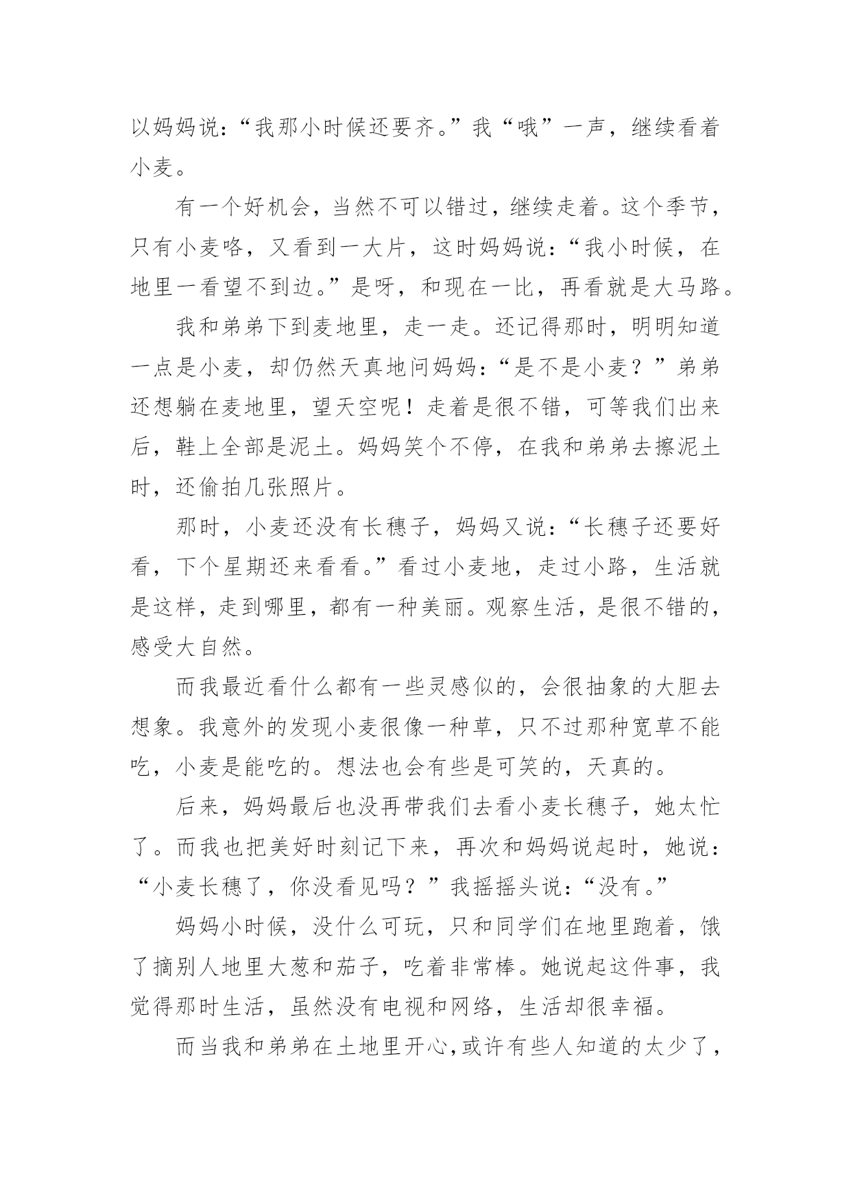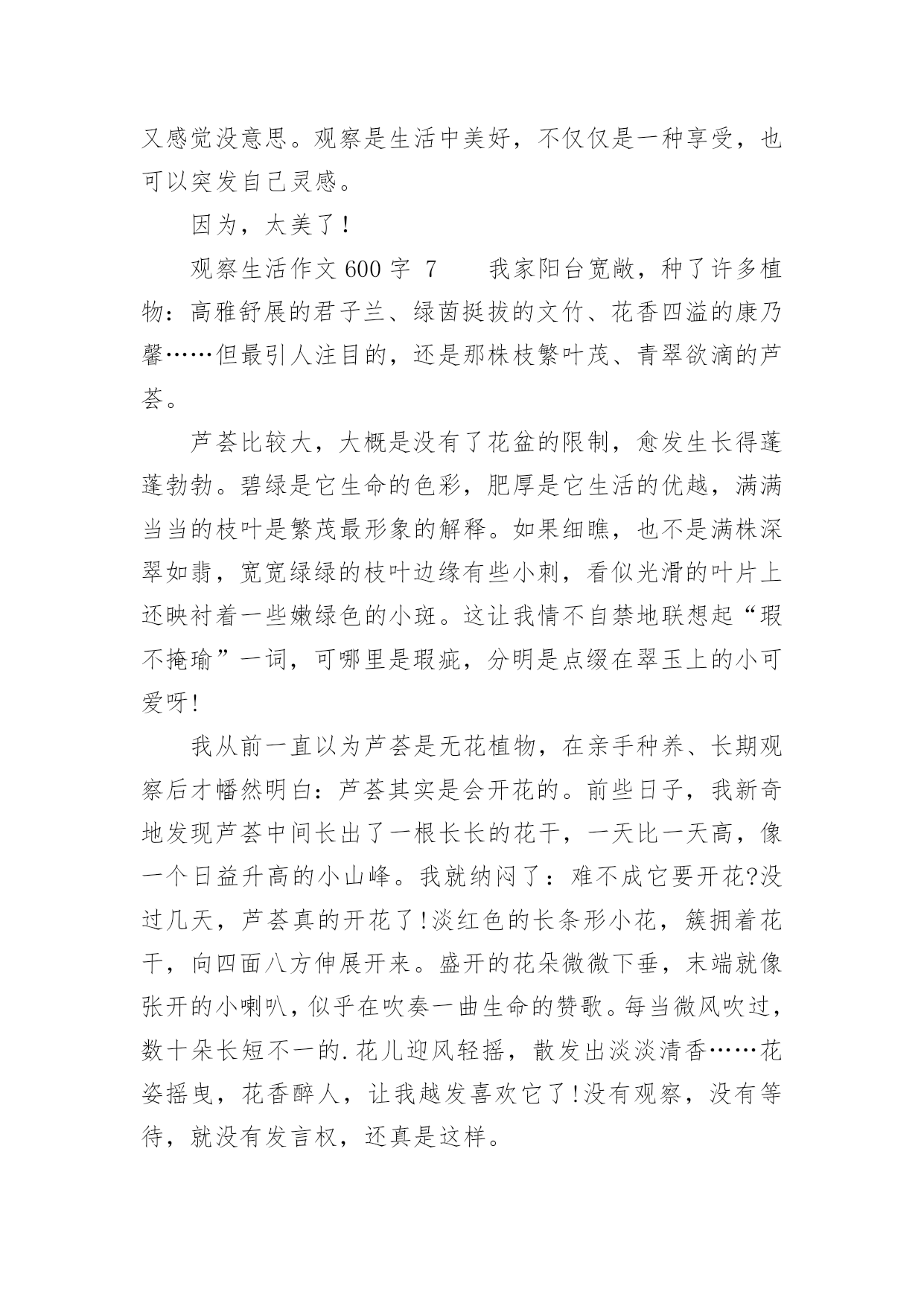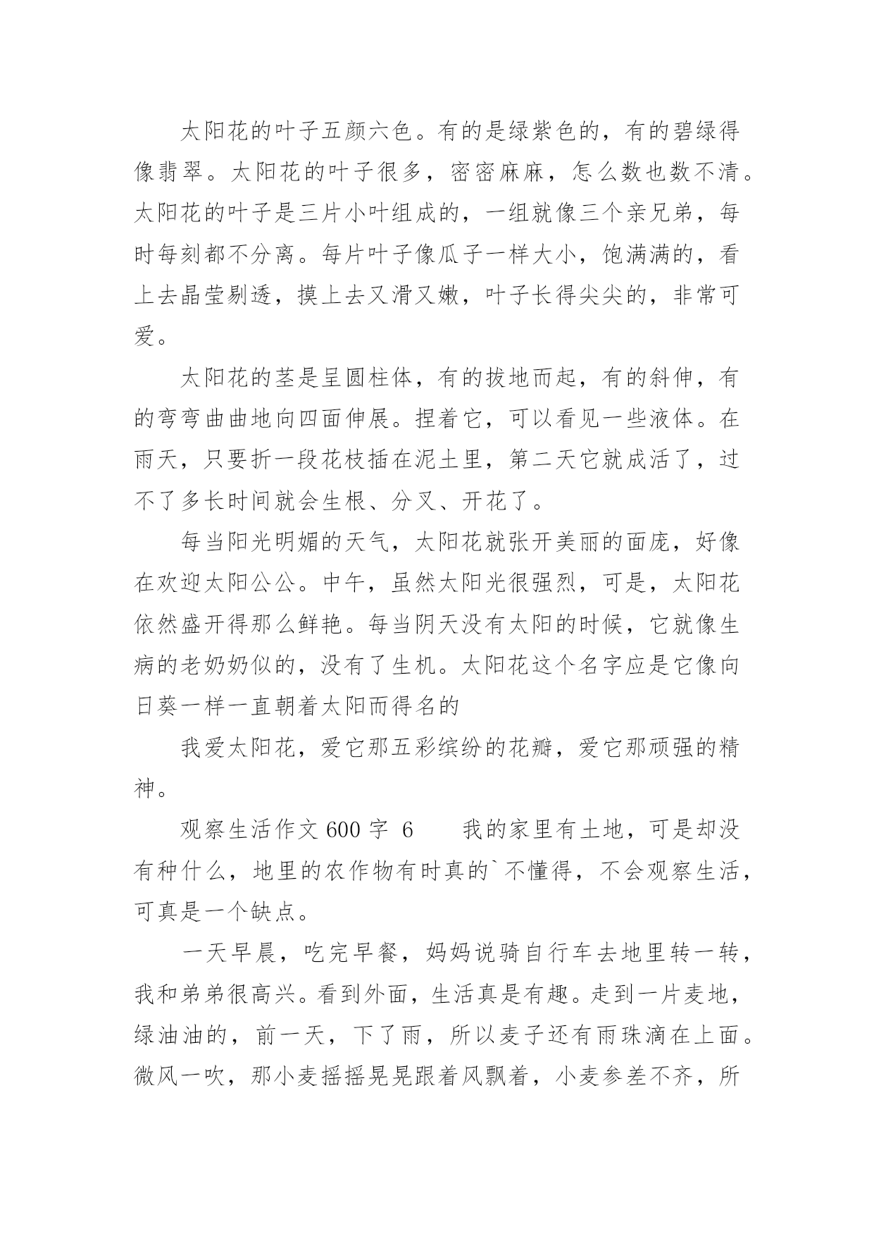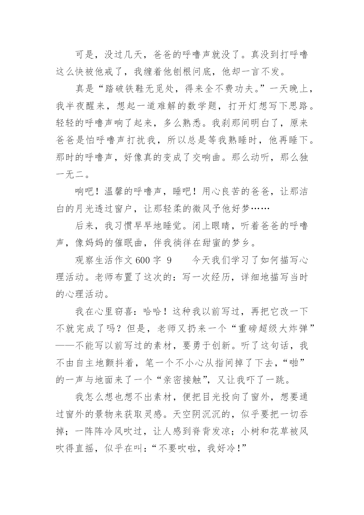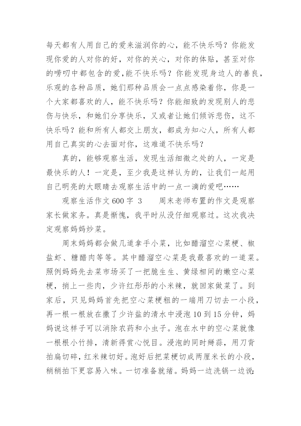 观察生活作文600字观察生活作文600字(通用43篇)在日常学习、工作和生活中,大家都经常接触到作文吧,写作文是培养人们的观察力、联想力、想象力、思考力和记忆力的重要手段。作文的注意事项有许多,你确定会写吗?以下是小编精心整理的观察生活作文600字,仅供参考,欢迎大家阅读。观察生活作文600字1寒假里,我随父母来到了江苏老家探亲。爸爸觉得我一个人在家太闷,就带我上街逛逛,希望可以找点乐子。哇!春节的大街上真热闹,街上人山人海,看来过年出来玩的人还真不少。走着走着,我们发现一个大棚边聚集的人特别多,急忙赶过去看热闹。“嘿嘿!走过路过不要错过,最新上市枪神游戏,5元十发子弹,打中六只气球奖纪念品一个,七只奖手链一条,八只……”一个摊主模样的人向大家吆喝道。这时,一名穿着红色羽绒服的小伙子向前迈了一步,胸有成竹的说:“来,我来打一次,看我来个十发十中。”说完便递给摊主五元钱。摊主给他上好子弹,游戏就开始了。只见那人摒声息气,瞄了好久才打出去一发。一开始,他十分幸运连打好几发都中了,正当我们真的以为他要“十发十中”时,命运这个调皮的小孩却笔锋一转:在他打到第5发时,突然什么都打不到了。终于,十发子弹打完了。那人原先的'锐气没了,垂头丧气地听摊主报告成绩:“十发子弹才打中了4发,没有奖品。”那人听完灰溜溜地走了,活像一个打了败仗的士兵。看到他失败了,又有几人想一试身手,结果也都以失败告终。我也想去碰碰运气,可被爸爸拦住了。爸爸悄悄告诉我,这些街头游戏都是根据顾客贪小的心理而安排的,如这个打气球的游戏,所谓的奖品都是些不值钱的小东西,枪也是事先调整过的,根本打不准。我看着很多人一个个垂头丧气地离开,终于明白这些只不过是个圈套。一路上走来,我们还看到了套圈、滚球、飞镖等游戏,好象都有类似的中奖环节,不过我再也不会动心,再中这些圈套了。观察生活作文600字2我是个喜欢观察生活的人,观察生活真是一件非常开心的事情。为什么呢?为什么生活就值得我们去观察呢?嘿,大家肯定觉得多留一份心去观察生活肯定特别麻烦吧。错了!学会观察生活,能够观察生活,这都是一种幸福!观察生活,能观察到身边人的一举一动,哪怕是点点滴滴,细微的改变都在你的眼中。也许,有的人觉得这样很没有意义,可我却笑了,怎么会没有意义呢?我觉得会观察生活的人一定是最幸福,最欢乐的人!为什么这么说呢?有着细致观察力,能够用眼睛去观察生活的.人,生活中细小的地方也尽收你眼底。懂得用眼睛去感受生活的人,都有一颗充满着活力的心。会观察生活的人说明你也能发现别人对你的关爱,一丝丝的情丝一缕缕的关爱把你包围了起来,在无微不至爱中生活的人,能不快乐吗?每天都有人用自己的爱来滋润你的心,能不快乐吗?你能发现你爱的人对你的好,对你的关心,对你的体贴,甚至对你的唠叨中都包含的爱,能不快乐吗?你能发现身边人的善良,乐观的各种品质,她们那种品质会一点点感染着你,你是一个大家都喜欢的人,能不快乐吗?你能细致的发现别人的悲伤与快乐,和她们分享快乐,又或者让她们倾诉悲伤,这不快乐吗?能和所有人都交上朋友,都成为知心人,所有人都用自己真实的心去面对你,这难道不快乐吗?真的,能够观察生活,发现生活细微之处的人,一定是最快乐的人!一定是,至少我是这样认为的,让我们一起用自己明亮的大眼睛去观察生活中的一点一滴的爱吧……观察生活作文600字3周末老师布置的作文是观察家长做家务。真是惭愧,我平时从没仔细观察过。这次我决定观察妈妈炒菜。周末妈妈都会做几道拿手小菜,比如醋溜空心菜梗、椒盐虾、糖醋肉等等。其中醋溜空心菜是我最喜欢的一道菜。照例妈妈先去菜市场买了一把脆生生、黄绿相间的嫩空心菜梗,捎上一些肉,少许红彤彤的小米辣,就回家做菜了。到家后,只见妈妈首先把空心菜梗粗的一端用刀切去一小段,再一根一根放在撒了少许盐的清水中浸泡10到15分钟,妈妈说这样子可以消除农药和小虫子。泡在水中的空心菜就像一根根小竹排,清新得赏心悦目。浸泡的同时掰蒜,用刀背拍扁切碎,红米辣切好。泡好后把菜梗切成两厘米长的小段,稍稍拍下更容易入味。一切准备就绪。妈妈一边洗锅一边说:炒菜前锅要洗净,倒干水,等锅稍微热了把锅里剩余的水吸干才能放油,这样不会有水珠溅起来。我边点头边聚精会神地看她操作。锅已热好,只见妈妈把亮晶晶的油倒入锅里,接着放入蒜头、小米辣,一会功夫锅里就热闹起来。切好的菜梗也似乎迫不及待要参加进来。白的'、红的、绿的,好美的颜色。厨房交响乐奏响啦!妈妈熟练地翻炒起来,没过几分钟又放入盐、鸡精、醋、酱油少许,空心菜梗从嫩绿变成深绿了。一盘咸淡正好,色香味俱全的美味就诞生了。观察妈妈炒菜,这是再平常不过的家务生活,今天却给我上了生动一课,这是课堂上学不到的。同学们,你们是否也观察过父母做家务呢?除了课堂知识,生活技能也是我们必须要学会的。感谢生活,它们都