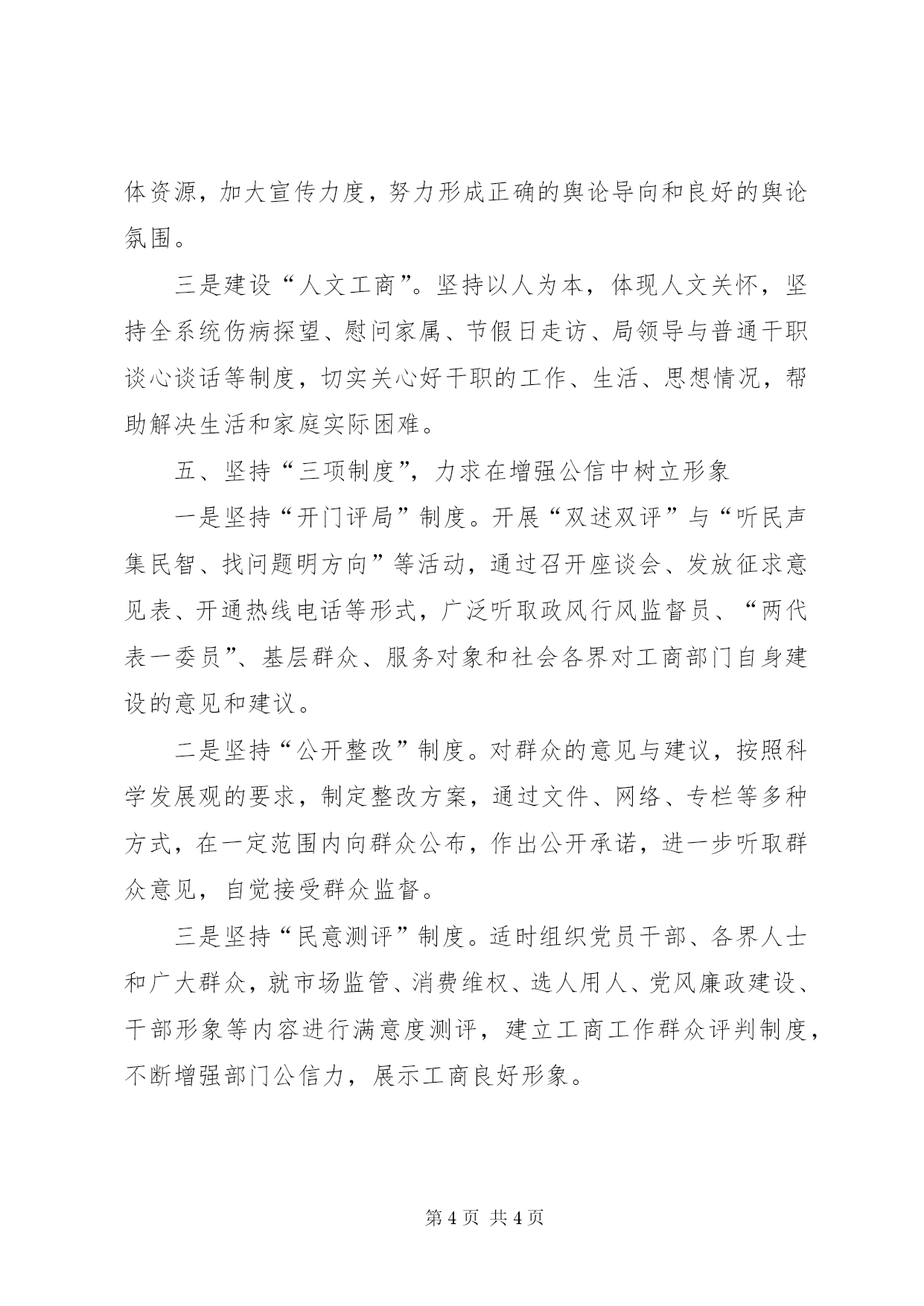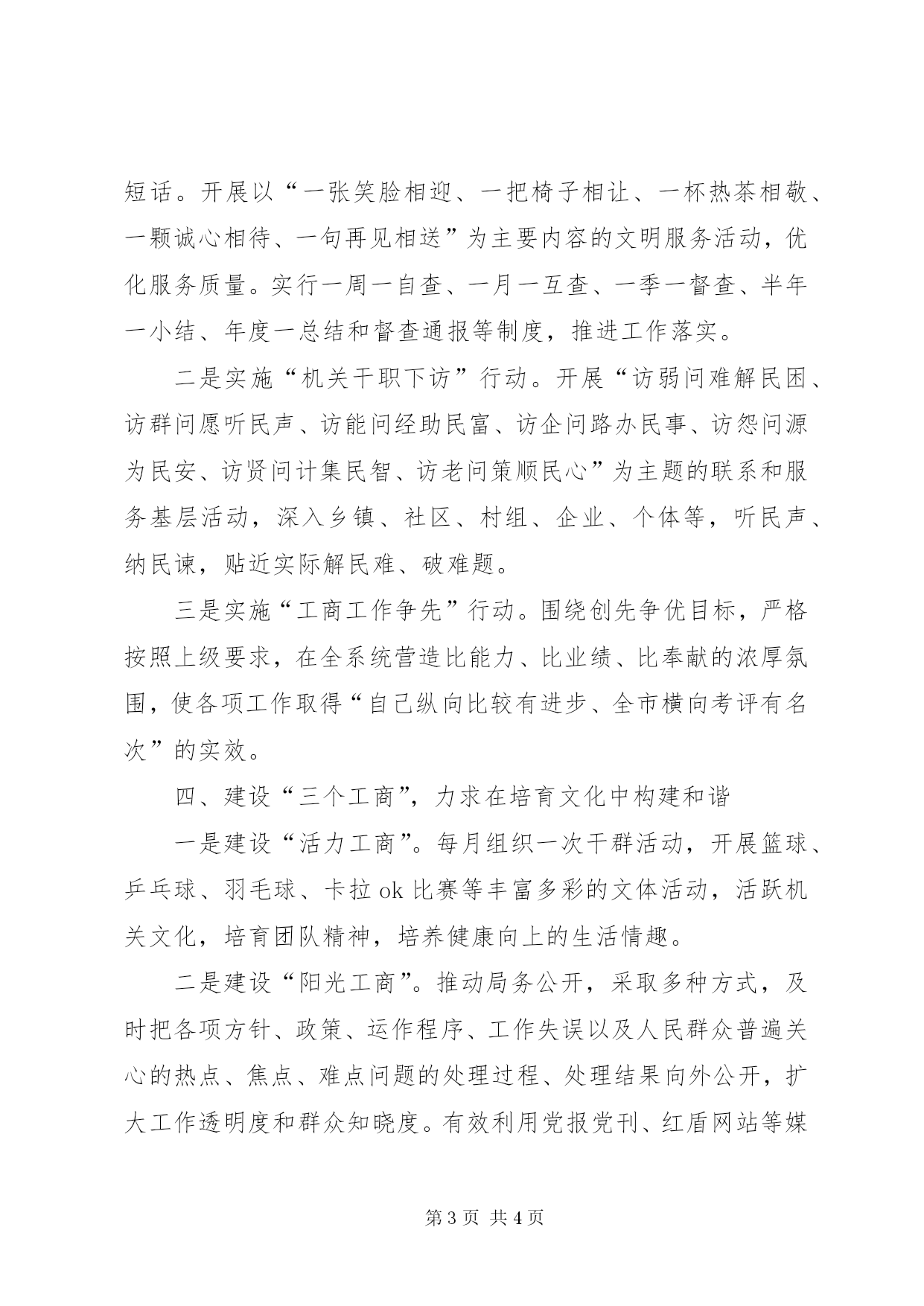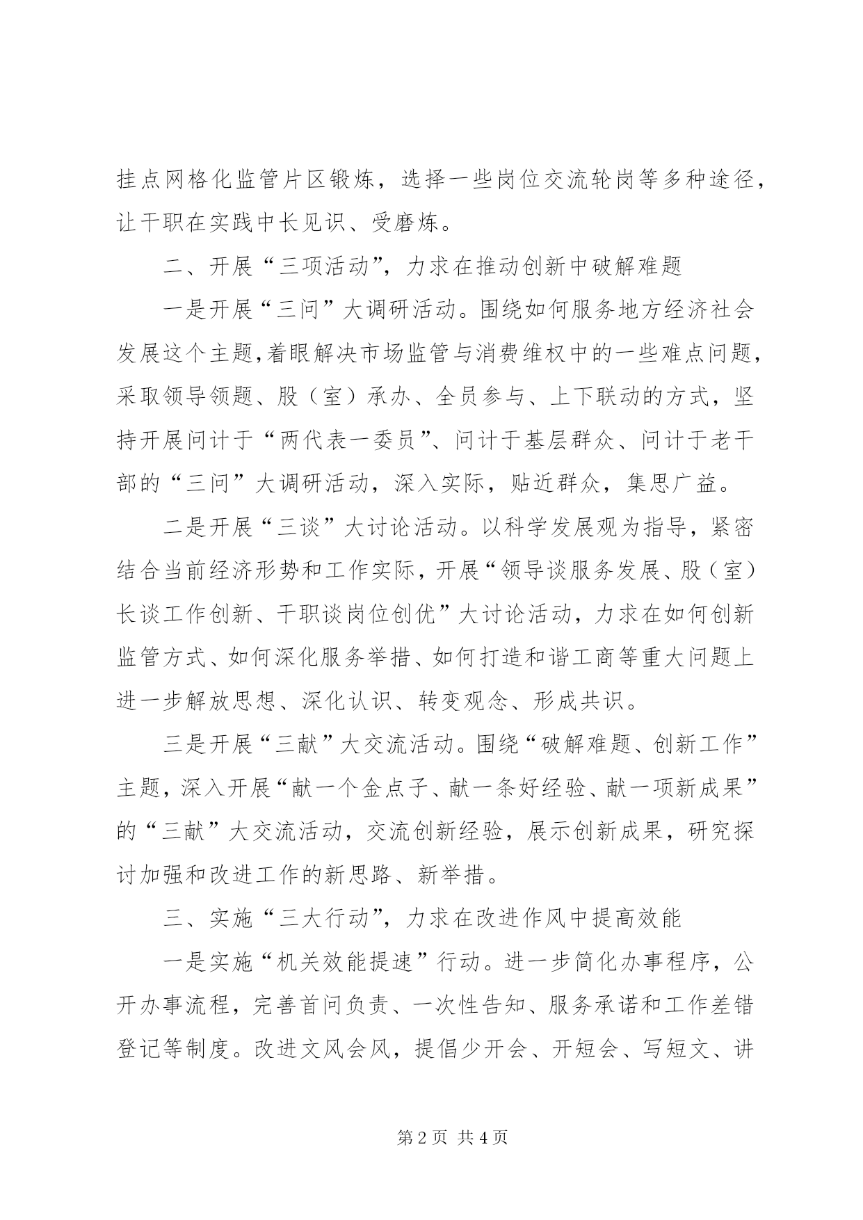 第PAGE\*Arabic\*MERGEFORMAT4页共NUMPAGES\*MERGEFORMAT4页工商局排忧解难活动总结在市局党组的正确领导下,县工商系统以学习贯彻落实党的十七届五中全会精神为主线,以排忧解难促和谐为主题,以密切联系群众为核心,充分发挥广大党员干部与全体干职的主体作用,实施“五个三”举措,深入基层、深入群众,深入帮扶村镇和社区,访民情、解民忧、保民安、帮民富、促和谐,切实做到了情况在一线掌握,问题在一线解决,矛盾在一线化解,稳定在一线加固,作风在一线转变,科学发展在一线体现。一、搭建“三个平台”,力求在强化学习中培养能力一是搭建“教育培训”平台。积极实施“工商干部素质能力提升”计划,突出党性修养和作风养成,年内将全系统干职轮训一遍。坚持完善“工商讲坛”,邀请有关专家学者、部门领导、离退休老干部作专题辅导讲座。开展“每周一课”活动,学习时事政治、政策法规、金融知识、监管业务等内容,做到在“听”中学、在“讲”中学。二是搭建“技能比武”平台。以“基本业务掌握、基本公文写作、基本设备操作”为重点,组织开展岗位练兵、技能比武等竞赛活动,强化干职实际操作技能与办案水平,促使干职熟悉监管业务、熟知政策法规、熟练工作技能。三是搭建“实践锻炼”平台。通过上派干职到上级工商局跟班学习,外派干职到先进地区参观考察,下派干职到基层分局、挂点网格化监管片区锻炼,选择一些岗位交流轮岗等多种途径,让干职在实践中长见识、受磨炼。二、开展“三项活动”,力求在推动创新中破解难题一是开展“三问”大调研活动。围绕如何服务地方经济社会发展这个主题,着眼解决市场监管与消费维权中的一些难点问题,采取领导领题、股(室)承办、全员参与、上下联动的方式,坚持开展问计于“两代表一委员”、问计于基层群众、问计于老干部的“三问”大调研活动,深入实际,贴近群众,集思广益。二是开展“三谈”大讨论活动。以科学发展观为指导,紧密结合当前经济形势和工作实际,开展“领导谈服务发展、股(室)长谈工作创新、干职谈岗位创优”大讨论活动,力求在如何创新监管方式、如何深化服务举措、如何打造和谐工商等重大问题上进一步解放思想、深化认识、转变观念、形成共识。三是开展“三献”大交流活动。围绕“破解难题、创新工作”主题,深入开展“献一个金点子、献一条好经验、献一项新成果”的“三献”大交流活动,交流创新经验,展示创新成果,研究探讨加强和改进工作的新思路、新举措。三、实施“三大行动”,力求在改进作风中提高效能一是实施“机关效能提速”行动。进一步简化办事程序,公开办事流程,完善首问负责、一次性告知、服务承诺和工作差错登记等制度。改进文风会风,提倡少开会、开短会、写短文、讲短话。开展以“一张笑脸相迎、一把椅子相让、一杯热茶相敬、一颗诚心相待、一句再见相送”为主要内容的文明服务活动,优化服务质量。实行一周一自查、一月一互查、一季一督查、半年一小结、年度一总结和督查通报等制度,推进工作落实。二是实施“机关干职下访”行动。开展“访弱问难解民困、访群问愿听民声、访能问经助民富、访企问路办民事、访怨问源为民安、访贤问计集民智、访老问策顺民心”为主题的联系和服务基层活动,深入乡镇、社区、村组、企业、个体等,听民声、纳民谏,贴近实际解民难、破难题。三是实施“工商工作争先”行动。围绕创先争优目标,严格按照上级要求,在全系统营造比能力、比业绩、比奉献的浓厚氛围,使各项工作取得“自己纵向比较有进步、全市横向考评有名次”的实效。四、建设“三个工商”,力求在培育文化中构建和谐一是建设“活力工商”。每月组织一次干群活动,开展篮球、乒乓球、羽毛球、卡拉ok比赛等丰富多彩的文体活动,活跃机关文化,培育团队精神,培养健康向上的生活情趣。二是建设“阳光工商”。推动局务公开,采取多种方式,及时把各项方针、政策、运作程序、工作失误以及人民群众普遍关心的热点、焦点、难点问题的处理过程、处理结果向外公开,扩大工作透明度和群众知晓度。有效利用党报党刊、红盾网站等媒体资源,加大宣传力度,努力形成正确的舆论导向和良好的舆论氛围。三是建设“人文工商”。坚持以人为本,体现人文关怀,坚持全系统伤病探望、慰问家属、节假日走访、局领导与普通干职谈心谈话等制度,切实关心好干职的工作、生活、思想情况,帮助解决生活和家庭实际困难。五、坚持“三项制度”,力求在增强公信中树立形象一是坚持“开门评局”制度。开展“双述双评”与“听民声集民智、找问题明方向”等活动,通过召开座谈会、发放征求意见表、开通热线电话等形式,广泛听取政风行风监督员、“两代表一委员”、基层群众、服务对象和社会各界对工商部门自身建设的意见和建议。二是坚持“公开整改”制度。对群众的意见与建议,按照科学发展观的要求,制定整改方案,通过文件、网络、专栏等多种方式,在一定范围内向群众