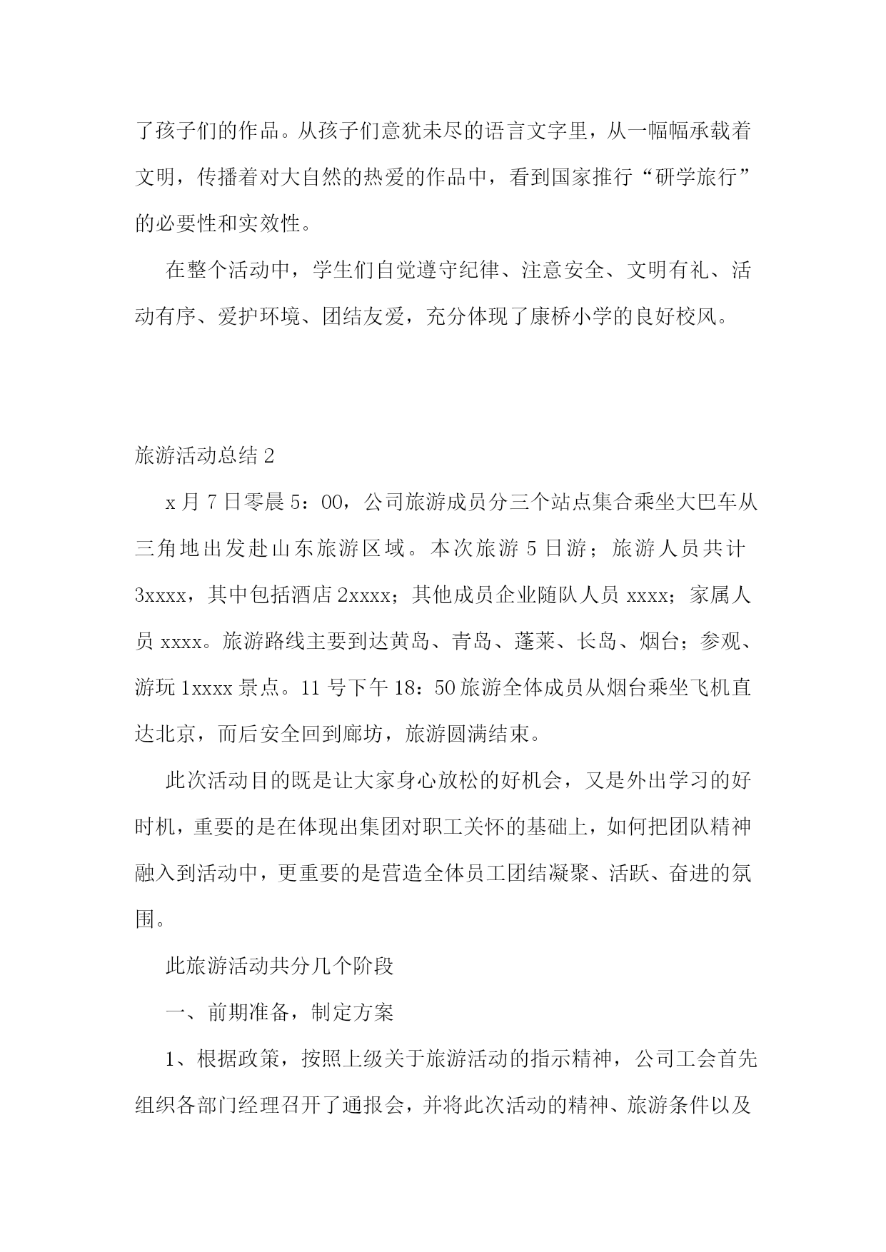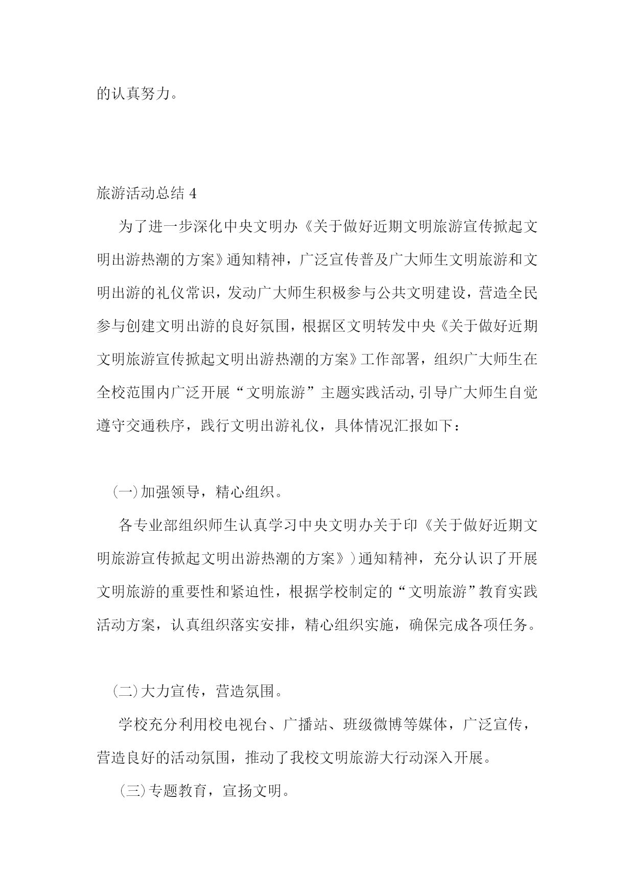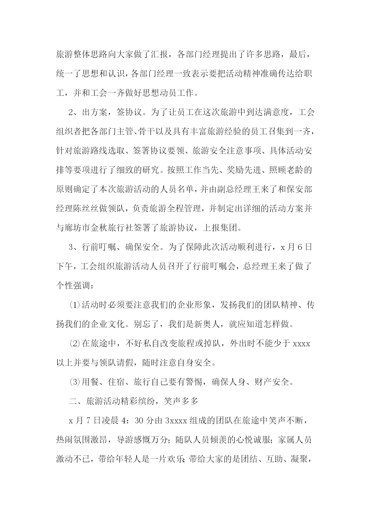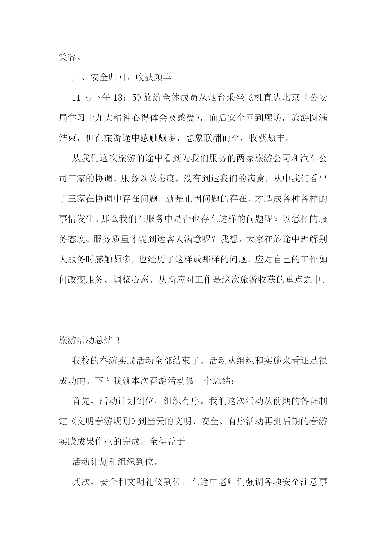 旅游活动总结旅游活动总结1春天是一年中最美的季节,也是踏青的大好时节。4月10日,我校组织三至六年级学生开展了研学旅行活动。活动从组织到实施,计划到位,组织有序,加强安全,注重礼仪,配合密切。本次活动以“走进秦岭憧憬梦想”为主题,通过本次活动,让学生走出课堂,走进社会,丰富了学生的课余生活,拓展学生的知识面,进一步感受大自然之美。培养学生热爱家乡、热爱祖国、热爱大自然的情感。出发前,学校主管领导召开会议就研学旅行活动做了周密的安排,重点强调了活动中的安全、文明礼仪等,并提出了要求。我随后,对本班这次活动做了详细安排:告知家长、安全及礼仪教育、学生自主分组并推选出安全员、安排学生做出行准备。活动地点是秦岭野生动物园,首先组织学生有序坐车,到达目的地,以班为单位组织开展了丰富多彩的参观活动。工作人员热情地接待、详细地介绍,给小学生们上了一堂生动的知识课。孩子们在讲解员的引领下,带着极大的好奇,兴致勃勃的参观了野生动物区、动物博物馆、动物表演、海洋馆,孩子们用手中的相机和纸笔记录着他们所追寻的,从他们可爱的笑脸上可以看到他们的收获和喜悦。通过这次参观活动,不仅丰富了同学们的动物知识,还激发了他们浓厚的求知欲望。参观结束后,学生们恋恋不舍的离开了秦岭野生动物园。4月21日对学生的优秀作品进行了评比展览,并及时给学校上交了孩子们的作品。从孩子们意犹未尽的语言文字里,从一幅幅承载着文明,传播着对大自然的热爱的作品中,看到国家推行“研学旅行”的必要性和实效性。在整个活动中,学生们自觉遵守纪律、注意安全、文明有礼、活动有序、爱护环境、团结友爱,充分体现了康桥小学的良好校风。旅游活动总结2x月7日零晨5:00,公司旅游成员分三个站点集合乘坐大巴车从三角地出发赴山东旅游区域。本次旅游5日游;旅游人员共计3xxxx,其中包括酒店2xxxx;其他成员企业随队人员xxxx;家属人员xxxx。旅游路线主要到达黄岛、青岛、蓬莱、长岛、烟台;参观、游玩1xxxx景点。11号下午18:50旅游全体成员从烟台乘坐飞机直达北京,而后安全回到廊坊,旅游圆满结束。此次活动目的既是让大家身心放松的好机会,又是外出学习的好时机,重要的是在体现出集团对职工关怀的基础上,如何把团队精神融入到活动中,更重要的是营造全体员工团结凝聚、活跃、奋进的氛围。此旅游活动共分几个阶段一、前期准备,制定方案1、根据政策,按照上级关于旅游活动的指示精神,公司工会首先组织各部门经理召开了通报会,并将此次活动的精神、旅游条件以及旅游整体思路向大家做了汇报,各部门经理提出了许多思路,最后,统一了思想和认识,各部门经理一致表示要把活动精神准确传达给职工,并和工会一齐做好思想动员工作。2、出方案,签协议。为了让员工在这次旅游中到达满意度,工会组织者把各部门主管、骨干以及具有丰富旅游经验的员工召集到一齐,针对旅游路线选取、签署协议要领、旅游安全注意事项、具体活动安排等要项进行了细致的研究。按照工作当先、奖励先进、照顾老龄的原则确定了本次旅游活动的人员名单,并由副总经理王来了和保安部经理陈丝丝做领队,负责旅游全程管理,并制定出详细的活动方案并与廊坊市金秋旅行社签署了旅游协议,上报集团。3、行前叮嘱、确保安全。为了保障此次活动顺利进行,x月6日下午,工会组织旅游活动人员召开了行前叮嘱会,总经理王来了做了个性强调:(1)活动时必须要注意我们的企业形象,发扬我们的团队精神、传扬我们的企业文化。别忘了,我们是新奥人,就应知道怎样做。(2)在旅途中,不好私自改变旅程或掉队,外出时不能少于xxxx以上并要与领队请假,随时注意自身安全。(3)用餐、住宿、旅行自己要有警惕,确保人身、财产安全。二、旅游活动精彩缤纷,笑声多多x月7日凌晨4:30分由3xxxx组成的团队在旅途中笑声不断,热闹氛围激昂,导游感慨万分;随队人员倾羡的心悦诚服;家属人员激动不已,带给年轻人是一片欢乐;带给大家的是团结、互助、凝聚,营造了有青春、活力的氛围。更多的则是各种各样的收获,体现的则是酒店良好的团队精神。曾现出几多笑声:笑声一:拉歌对唱、结成语x月7日,天边刚刚放亮,旅行队伍便浩浩荡荡出发了。8:30分,领队的笑话撩拨起了大家的兴致,于是,按耐不住寂寞的年轻人便争先恐后的拉歌对唱起来。王总经理提议:以车中段为分界线,分左队与右队两组进行对歌、结成语,首先全体成员起立合唱新奥之歌,激烈的对歌比赛便开始了。左队,来一个;来一个,左队。右队,来一个;来一个,右队……,顿时,高呼声、洪亮的歌声、掌声不断,笑话、歌唱、戏曲、故事、对歌、结成语等载体不一,热闹非凡,激情澎湃,整个车厢成了欢乐的海洋。还别说,五音不全的领队陈丝丝这天还成了内秀儿,发音挺准。随队导游对我们队伍激情氛围所感染,本不高兴的她不由自主参