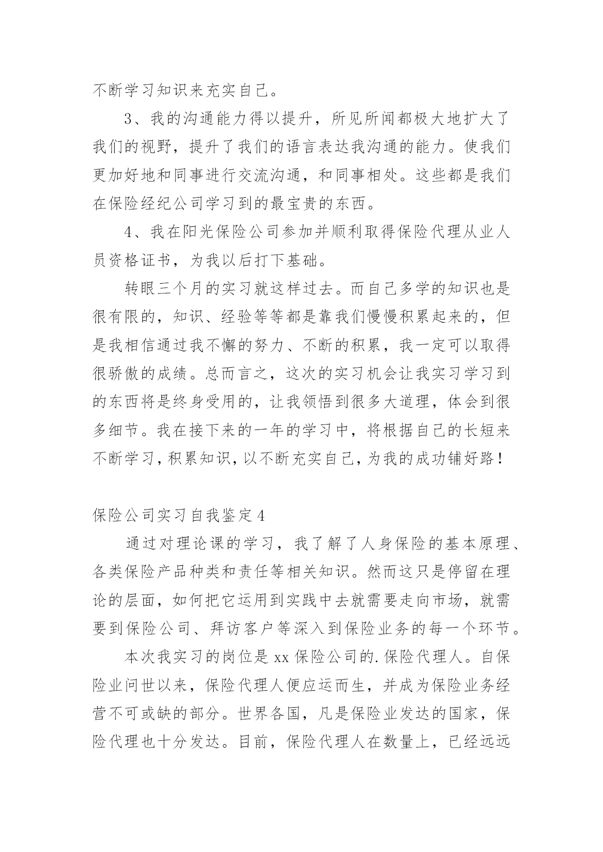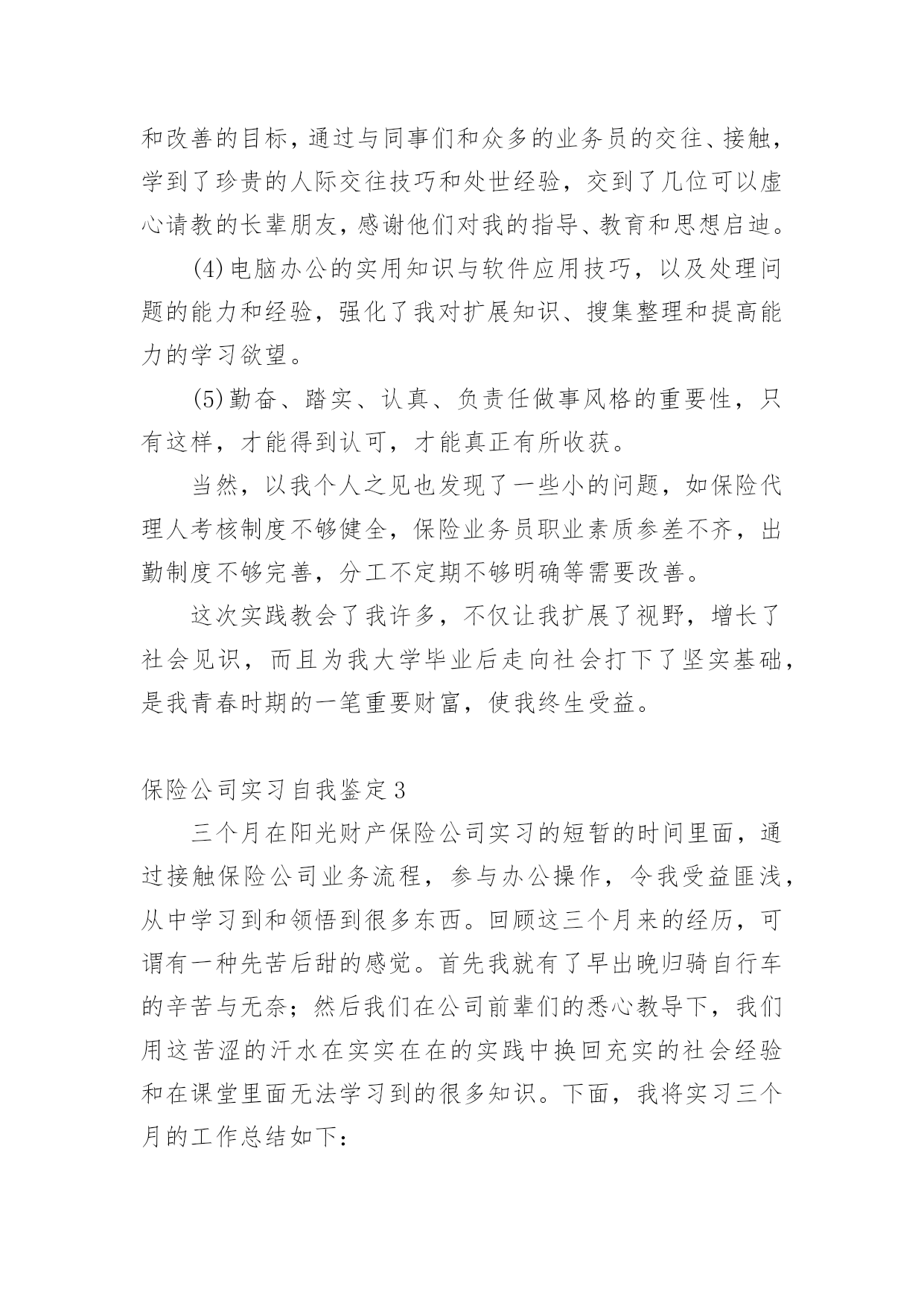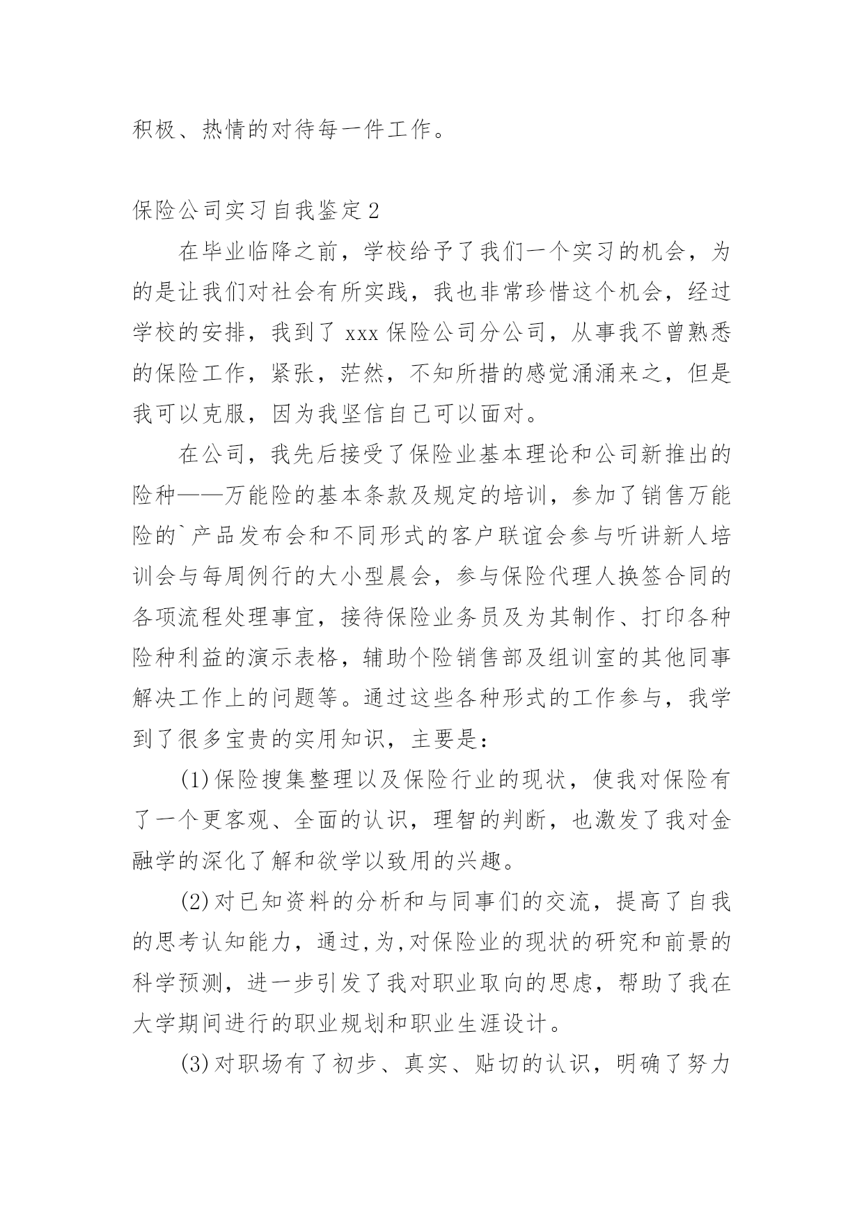 保险公司实习自我鉴定保险公司实习自我鉴定10篇(优)自我鉴定是个人在一个时期的自我总结,自我鉴定可以使我们锻炼语言组织能力,让我们一起来学习写自我鉴定吧。但是自我鉴定有什么要求呢?以下是小编整理的保险公司实习自我鉴定,欢迎大家借鉴与参考,希望对大家有所帮助。保险公司实习自我鉴定1实习不足之处1、工作中有时自信心不足,有放弃的念头。时而出现低级错误。2、在处理一些事情时有时显得较为急躁,没有及时找出失败的原因。4、对一些业务知识特别是银行、金融、证券知识不够熟悉。5、社会阅历相对来说较少,跟客户聊不起来。在今后的'工作中,我将发扬成绩,克服不足,坚持不懈地努力学习各种理论知识,并用于指导实践,以更好的适应行业发展的需要;熟练的掌握各种业务技能才能更好的投入工作,我将通过多看、多学、多问、多练来不断的提高自己的各项业务技能;通过实践不断的总结经验,提高自己解决实际问题的能力,并在实践的过程中慢慢克服急躁情绪,积极、热情的对待每一件工作。保险公司实习自我鉴定2在毕业临降之前,学校给予了我们一个实习的机会,为的是让我们对社会有所实践,我也非常珍惜这个机会,经过学校的安排,我到了xxx保险公司分公司,从事我不曾熟悉的保险工作,紧张,茫然,不知所措的感觉涌涌来之,但是我可以克服,因为我坚信自己可以面对。在公司,我先后接受了保险业基本理论和公司新推出的险种——万能险的基本条款及规定的培训,参加了销售万能险的`产品发布会和不同形式的客户联谊会参与听讲新人培训会与每周例行的大小型晨会,参与保险代理人换签合同的各项流程处理事宜,接待保险业务员及为其制作、打印各种险种利益的演示表格,辅助个险销售部及组训室的其他同事解决工作上的问题等。通过这些各种形式的工作参与,我学到了很多宝贵的实用知识,主要是:(1)保险搜集整理以及保险行业的现状,使我对保险有了一个更客观、全面的认识,理智的判断,也激发了我对金融学的深化了解和欲学以致用的兴趣。(2)对已知资料的分析和与同事们的交流,提高了自我的思考认知能力,通过,为,对保险业的现状的研究和前景的科学预测,进一步引发了我对职业取向的思虑,帮助了我在大学期间进行的职业规划和职业生涯设计。(3)对职场有了初步、真实、贴切的认识,明确了努力和改善的目标,通过与同事们和众多的业务员的交往、接触,学到了珍贵的人际交往技巧和处世经验,交到了几位可以虚心请教的长辈朋友,感谢他们对我的指导、教育和思想启迪。(4)电脑办公的实用知识与软件应用技巧,以及处理问题的能力和经验,强化了我对扩展知识、搜集整理和提高能力的学习欲望。(5)勤奋、踏实、认真、负责任做事风格的重要性,只有这样,才能得到认可,才能真正有所收获。当然,以我个人之见也发现了一些小的问题,如保险代理人考核制度不够健全,保险业务员职业素质参差不齐,出勤制度不够完善,分工不定期不够明确等需要改善。这次实践教会了我许多,不仅让我扩展了视野,增长了社会见识,而且为我大学毕业后走向社会打下了坚实基础,是我青春时期的一笔重要财富,使我终生受益。保险公司实习自我鉴定3三个月在阳光财产保险公司实习的短暂的时间里面,通过接触保险公司业务流程,参与办公操作,令我受益匪浅,从中学习到和领悟到很多东西。回顾这三个月来的经历,可谓有一种先苦后甜的感觉。首先我就有了早出晚归骑自行车的辛苦与无奈;然后我们在公司前辈们的悉心教导下,我们用这苦涩的汗水在实实在在的实践中换回充实的社会经验和在课堂里面无法学习到的很多知识。下面,我将实习三个月的工作总结如下:一、个人感想体会1.认真决定一切俗话说:“隔行如隔山”。一开始是很难的,但态度认真会让你很快进入状态。工作时一定要一丝不苟,认真仔细,一个职员在公司的大部分时间都是在工作的,这就要求他在这段时间内一定要小心谨慎,一丝不苟,不能老是出错,有必要一定要检验自己的工作结果,以确保自己的万无一失.工作的时候我一直保持极大的工作热情,不仅顺利完成工作任务,工作之余还经常总结经验教训,不断提高工作效率,虽然工作中我也会犯一些错误,受到带我的老师的批评,但我认为这些错误和批评是能让我能在以后的工作中谨慎小心,提高工作效率的。在和大家工作的这段时间里,他们严谨、认真的工作作风给我留下了很深刻的印象,我也从他们身上学到了很多自己缺少的东西。这次生产实习虽然说时间比较少,但是却让我了解了公司的企业文化、模式和体系管理等经验,这对我来说是很宝贵的。“精诚所至,金石为开”,当一个人处于一个陌生的环境时,用什么去打开别人的心灵,得到别人的认可?真诚!阳光保险公司文化中就有:风雨中做事,阳光下做人!首先从做人开始,不仅要求我们要诚信做人,注重团结,培养团队精神,更要实力良好的学习态度:不要期盼等待别人告诉你要做什么,应该做什么,或者该怎么去做。这样被动的学习或者工作的态度都是