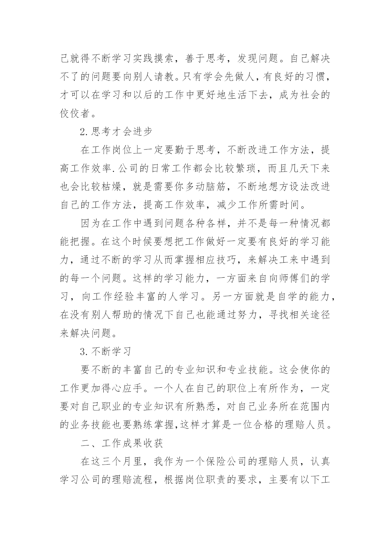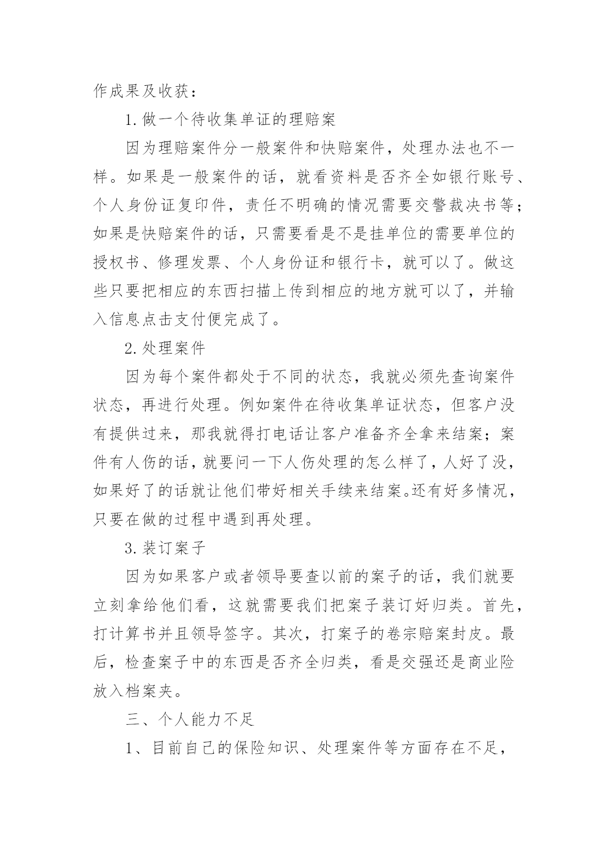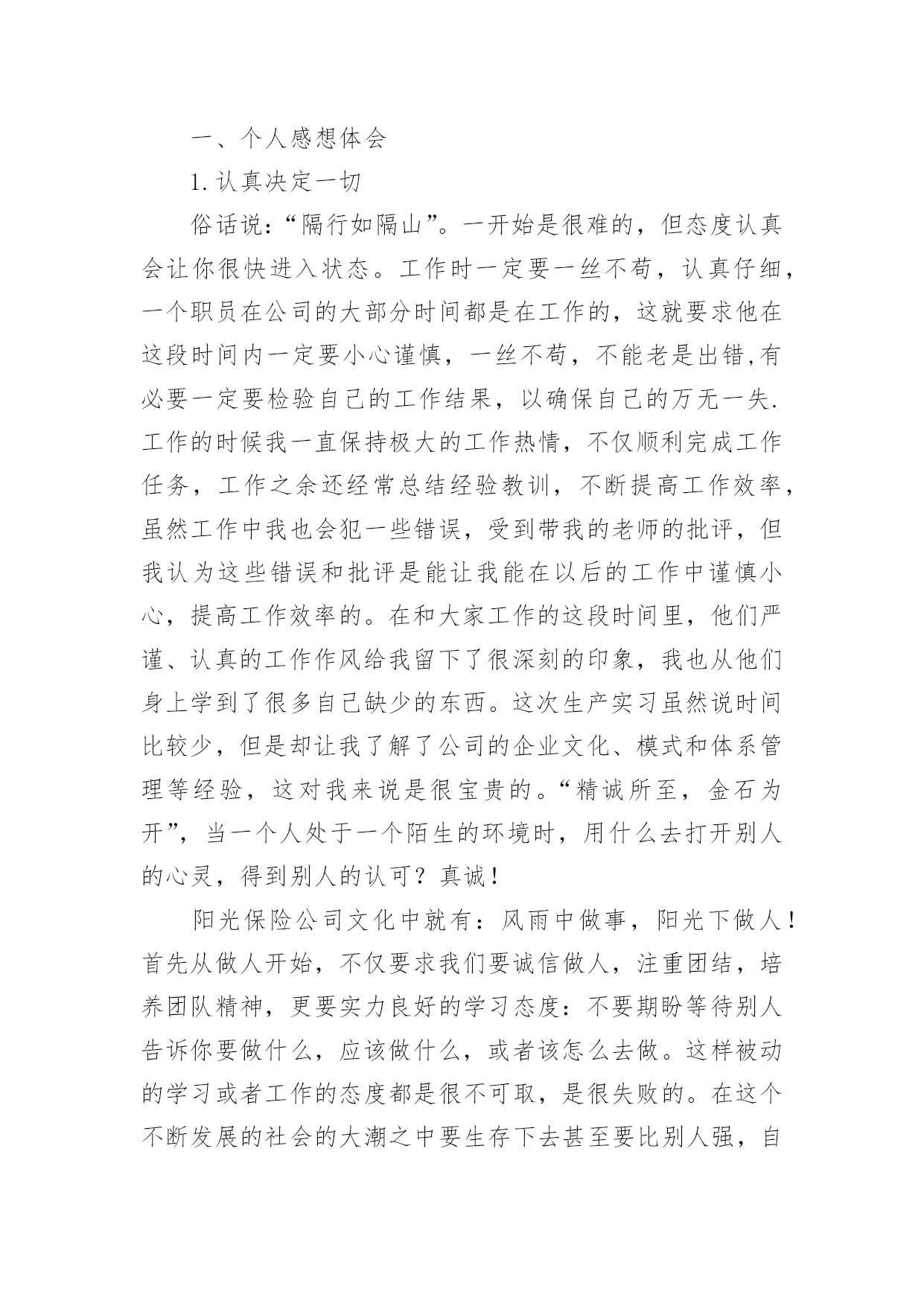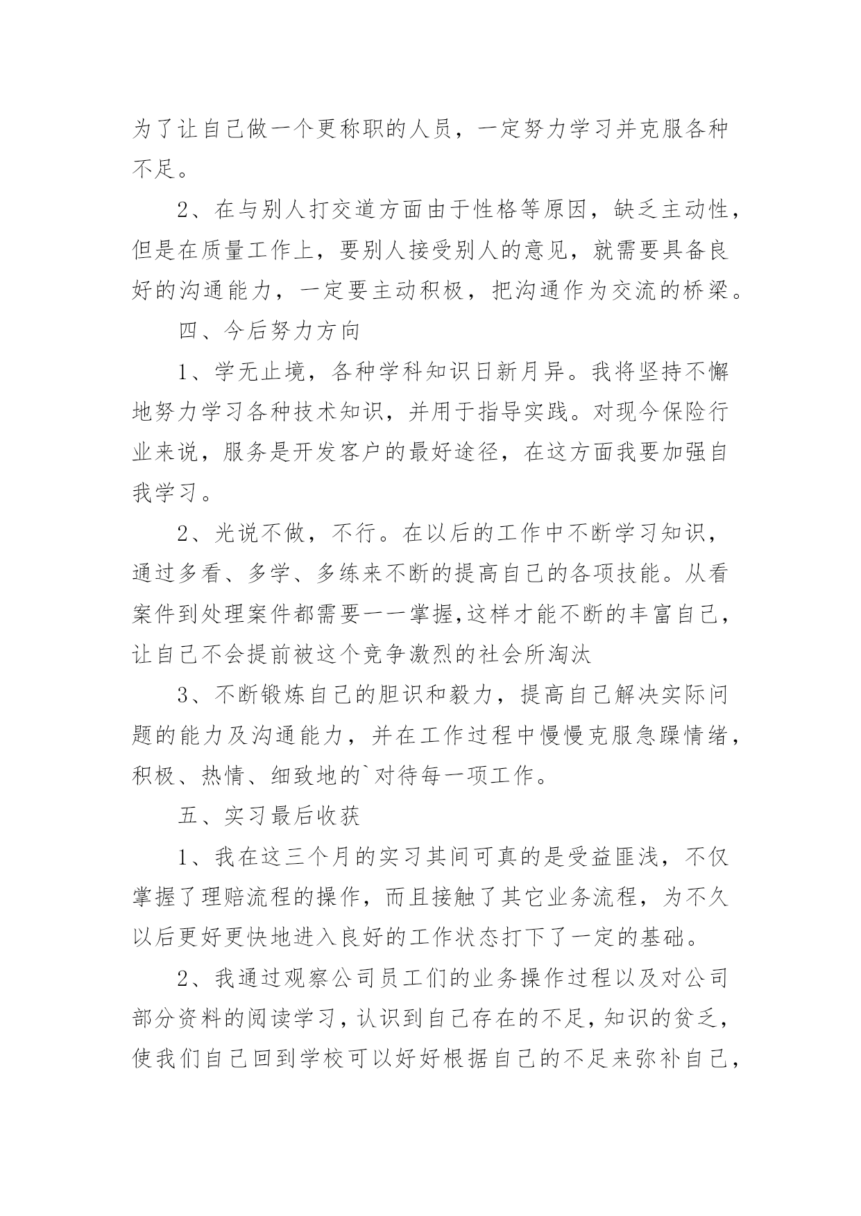 保险公司实习自我鉴定保险公司实习自我鉴定10篇(优)自我鉴定是个人在一个时期的自我总结,自我鉴定可以使我们锻炼语言组织能力,让我们一起来学习写自我鉴定吧。但是自我鉴定有什么要求呢?以下是小编整理的保险公司实习自我鉴定,欢迎大家借鉴与参考,希望对大家有所帮助。保险公司实习自我鉴定1实习不足之处1、工作中有时自信心不足,有放弃的念头。时而出现低级错误。2、在处理一些事情时有时显得较为急躁,没有及时找出失败的原因。4、对一些业务知识特别是银行、金融、证券知识不够熟悉。5、社会阅历相对来说较少,跟客户聊不起来。在今后的'工作中,我将发扬成绩,克服不足,坚持不懈地努力学习各种理论知识,并用于指导实践,以更好的适应行业发展的需要;熟练的掌握各种业务技能才能更好的投入工作,我将通过多看、多学、多问、多练来不断的提高自己的各项业务技能;通过实践不断的总结经验,提高自己解决实际问题的能力,并在实践的过程中慢慢克服急躁情绪,积极、热情的对待每一件工作。保险公司实习自我鉴定2在毕业临降之前,学校给予了我们一个实习的机会,为的是让我们对社会有所实践,我也非常珍惜这个机会,经过学校的安排,我到了xxx保险公司分公司,从事我不曾熟悉的保险工作,紧张,茫然,不知所措的感觉涌涌来之,但是我可以克服,因为我坚信自己可以面对。在公司,我先后接受了保险业基本理论和公司新推出的险种——万能险的基本条款及规定的培训,参加了销售万能险的`产品发布会和不同形式的客户联谊会参与听讲新人培训会与每周例行的大小型晨会,参与保险代理人换签合同的各项流程处理事宜,接待保险业务员及为其制作、打印各种险种利益的演示表格,辅助个险销售部及组训室的其他同事解决工作上的问题等。通过这些各种形式的工作参与,我学到了很多宝贵的实用知识,主要是:(1)保险搜集整理以及保险行业的现状,使我对保险有了一个更客观、全面的认识,理智的判断,也激发了我对金融学的深化了解和欲学以致用的兴趣。(2)对已知资料的分析和与同事们的交流,提高了自我的思考认知能力,通过,为,对保险业的现状的研究和前景的科学预测,进一步引发了我对职业取向的思虑,帮助了我在大学期间进行的职业规划和职业生涯设计。(3)对职场有了初步、真实、贴切的认识,明确了努力和改善的目标,通过与同事们和众多的业务员的交往、接触,学到了珍贵的人际交往技巧和处世经验,交到了几位可以虚心请教的长辈朋友,感谢他们对我的指导、教育和思想启迪。(4)电脑办公的实用知识与软件应用技巧,以及处理问题的能力和经验,强化了我对扩展知识、搜集整理和提高能力的学习欲望。(5)勤奋、踏实、认真、负责任做事风格的重要性,只有这样,才能得到认可,才能真正有所收获。当然,以我个人之见也发现了一些小的问题,如保险代理人考核制度不够健全,保险业务员职业素质参差不齐,出勤制度不够完善,分工不定期不够明确等需要改善。这次实践教会了我许多,不仅让我扩展了视野,增长了社会见识,而且为我大学毕业后走向社会打下了坚实基础,是我青春时期的一笔重要财富,使我终生受益。保险公司实习自我鉴定3三个月在阳光财产保险公司实习的短暂的时间里面,通过接触保险公司业务流程,参与办公操作,令我受益匪浅,从中学习到和领悟到很多东西。回顾这三个月来的经历,可谓有一种先苦后甜的感觉。首先我就有了早出晚归骑自行车的辛苦与无奈;然后我们在公司前辈们的悉心教导下,我们用这苦涩的汗水在实实在在的实践中换回充实的社会经验和在课堂里面无法学习到的很多知识。下面,我将实习三个月的工作总结如下:一、个人感想体会1.认真决定一切俗话说:“隔行如隔山”。一开始是很难的,但态度认真会让你很快进入状态。工作时一定要一丝不苟,认真仔细,一个职员在公司的大部分时间都是在工作的,这就要求他在这段时间内一定要小心谨慎,一丝不苟,不能老是出错,有必要一定要检验自己的工作结果,以确保自己的万无一失.工作的时候我一直保持极大的工作热情,不仅顺利完成工作任务,工作之余还经常总结经验教训,不断提高工作效率,虽然工作中我也会犯一些错误,受到带我的老师的批评,但我认为这些错误和批评是能让我能在以后的工作中谨慎小心,提高工作效率的。在和大家工作的这段时间里,他们严谨、认真的工作作风给我留下了很深刻的印象,我也从他们身上学到了很多自己缺少的东西。这次生产实习虽然说时间比较少,但是却让我了解了公司的企业文化、模式和体系管理等经验,这对我来说是很宝贵的。“精诚所至,金石为开”,当一个人处于一个陌生的环境时,用什么去打开别人的心灵,得到别人的认可?真诚!阳光保险公司文化中就有:风雨中做事,阳光下做人!首先从做人开始,不仅要求我们要诚信做人,注重团结,培养团队精神,更要实力良好的学习态度:不要期盼等待别人告诉你要做什么,应该做什么,或者该怎么去做。这样被动的学习或者工作的态度都是