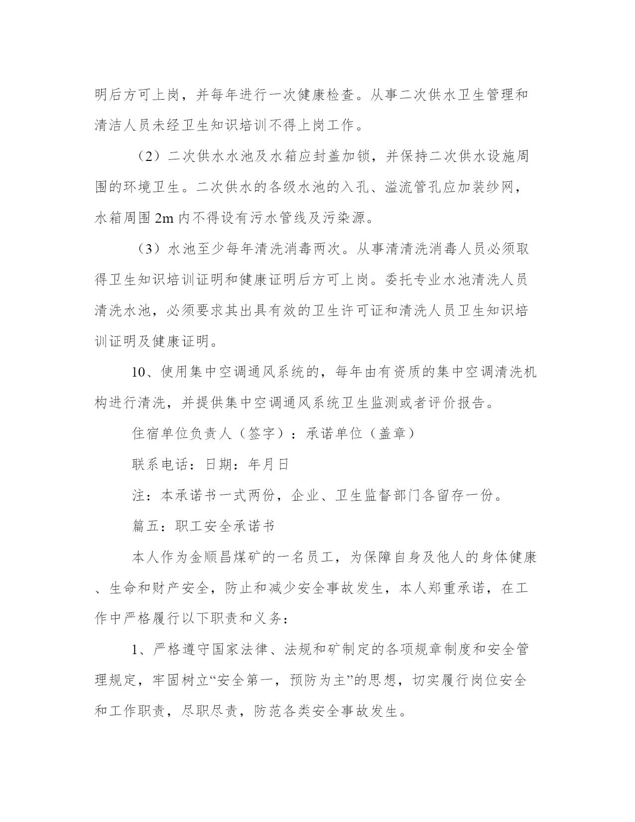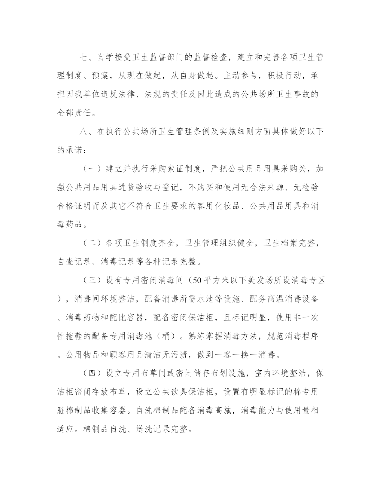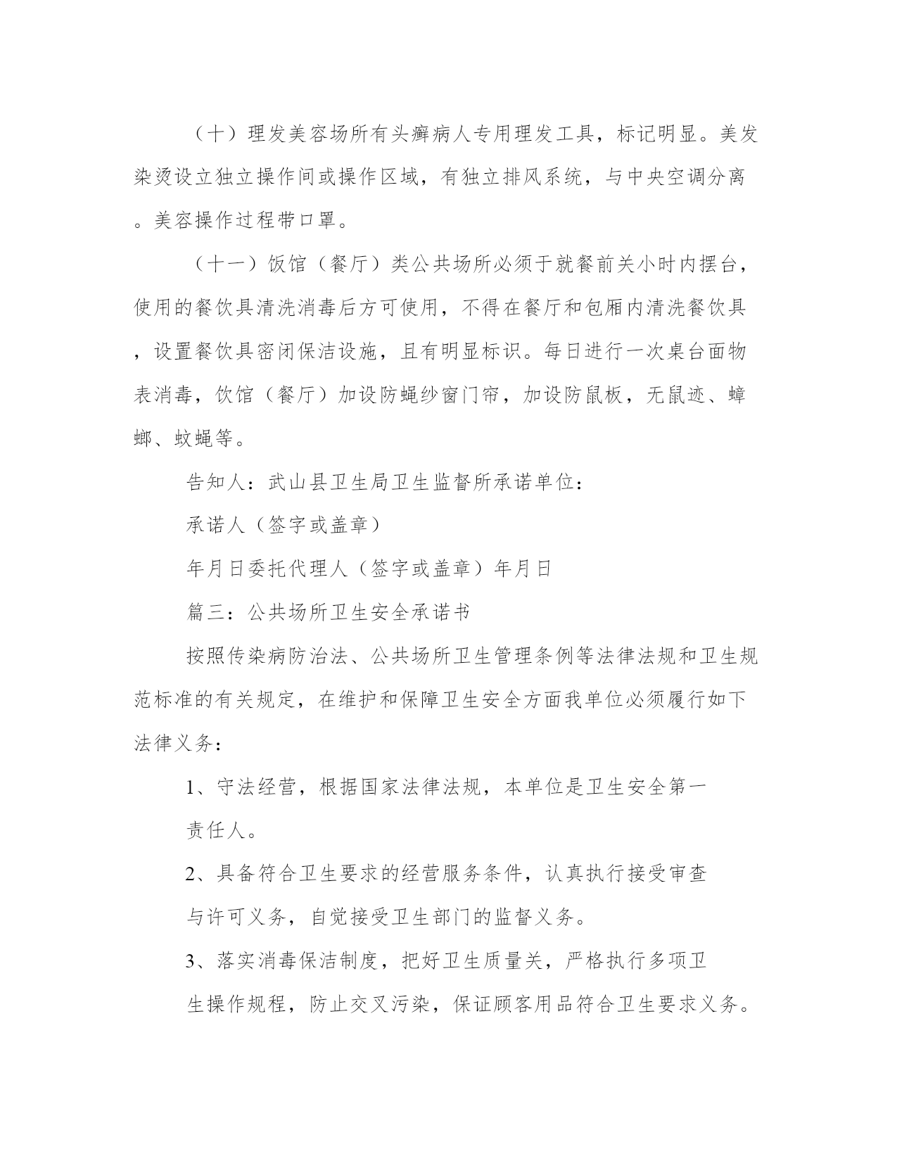 公共场所安全的承诺书按照公共场所卫生管理条例、公共场所卫生管理条例实施细则的要求,创造良好的公共场所卫生条件,保障顾客身体健康,本单位保证做好以下几点:(一)公共场所负责人(法定代表人)为公共卫生安全的第一责任人,对本单位的公共卫生安全负全面责任。(二)建立卫生管理制度,配备专职或兼职卫生管理人员,并按制度做好本单位的各项卫生管理工作。(三)从业人员每年进行健康检查和卫生知识培训考核,持健康证和培训合格证上岗。(四)做到场所内通风良好,配备机械通风排风设施。(五)配置公共用具清洗消毒设施,保证能正常使用,公用品、用具等做到一客一换一消毒并保洁。(六)定期清理室内外卫生,保持环境整洁。(七)提供的食品、用品保证符合国家卫生标准和要求。(八)认真学习并履行公共场所卫生管理条例、公共场所卫生管理条例实施细则的其他卫生要求。本单位将认真履行承诺书内容,保证经营的公共场所卫生符合要求,同时接受卫生行政部门的监督与管理,对违反法律法规的行为承担相应的法律责任。承诺单位:负责人:日期:年月日篇二:公共场所卫生安全承诺书根据中华人民共和国传染病防治法,艾滋病防治条例,公共场所卫生管理条例及实施细则等法律、法规、规章和相关标准的要求,为创建国家卫生城市,确保公共场所卫生安全,我单位特做以下承诺:一、认真履行卫生安全第一责任人的职责,确保公共场所卫生安全。二、证照齐全,亮证经营,不开展未经许可的公共场所经营活动。三、所有从业人员持有效健康证明和卫生知识培训合格证明上岗,确保个人卫生良好,文明礼貌,热情服务,着装统一。四、在经营中严格遵守相关法律、法规、规章、标准及规范文件规定。保证内外环境整洁,卫生设施布局合理,不违法经营。五、公共场所内禁止吸烟,严格落实控烟措施,并在醒目位置张贴禁烟标志。六、按照公共场所卫生监督量化分级管理的标准要求,寻找不足,积极投入,加强自身卫生管理,把握机遇,不懈努力,树立品牌意识,争先创优,树立“文明城市,魅力企事业”对外形象,为创建国家卫生城市贡献绵薄之力。七、自学接受卫生监督部门的监督检查,建立和完善各项卫生管理制度、预案,从现在做起,从自身做起。主动参与,积极行动,承担因我单位违反法律、法规的责任及因此造成的公共场所卫生事故的全部责任。八、在执行公共场所卫生管理条例及实施细则方面具体做好以下的承诺:(一)建立并执行采购索证制度,严把公共用品用具采购关,加强公共用品用具进货验收与登记,不购买和使用无合法来源、无检验合格证明而及其它不符合卫生要求的客用化妆品、公共用品用具和消毒药品。(二)各项卫生制度齐全,卫生管理组织健全,卫生档案完整,自查记录、消毒记录等各种记录完整。(三)设有专用密闭消毒间(50平方米以下美发场所设消毒专区),消毒间环境整洁,配备消毒所需水池等设施、配务高温消毒设备、消毒药物和配比容器,配备密闭保洁柜,且标记明显,使用非一次性拖鞋的配备专用消毒池(桶)。熟练掌握消毒方法,规范消毒程序。公用物品和顾客用品清洁无污渍,做到一客一换一消毒。(四)设立专用布草间或密闭储存布划设施,室内环境整洁,保洁柜密闭存放布草,设立公共饮具保洁柜,设置有明显标记的棉专用脏棉制品收集容器。自洗棉制品配备消毒高施,消毒能力与使用量相适应。棉制品自洗、送洗记录完整。(五)场所通风良好,卫生间清洁、元异味,设有洗手设施和机械通风装置,座位套定期清洗保洁。(六)机械通风滤网无积尘,集中式空调按规范要求定期清洗消毒,集中式空调档案完整。机械通风新风取风口远离污染源、开放式冷却塔、排风口,开放式冷却塔远离公众通道并设置有效隔挡设施。(七)落实消毒制度:通风系统,二次供水设施以及公共用品用具及时清洗,彻底消毒,保持清洁。场所内空气、微小气候、顾客用品用具等每年至少卫生检测一次。持有产公共场所卫生检测报告,消毒用品、客用化妆品等索证资料齐全。场所供应的饮用水必须符合生活饮用水卫生标准,二次供水单位持有效卫生许可证。(八)淋浴场所于入口醒目处张贴禁浴标志,浴池清洗消毒设施齐全,消毒措施落实到位,有池水清洗、消毒设施并正常使用,从业人员为顾客进行面部、修脚、搓背操作前使用专用消毒盆对手部进行消毒,有专用的修脚工具消毒设施并正常使用。(九)游泳场所醒目位置有水质公示牌,公示项目完整,不出租游泳衣裤,有池水循环消毒设备并正常使用,有补充新水系统和强制通过式浸脚池(池水4小蝗更换一次),有检测游泳池水质有效氯仪器和完整的游泳池水循环净化消毒操作记录以及水质有效氯检测记录,液氯安全措施到位,有独立消毒剂存放场所,消毒剂密闭存放。(十)理发美容场所有头癣病人专用理发工具,标记明显。美发染烫设立独立操作间或操作区域,有独立排风系统,与中央空调分离。美容操作过程带口罩。(十一)饭馆(餐