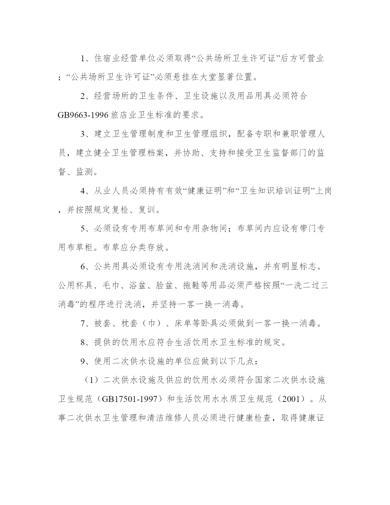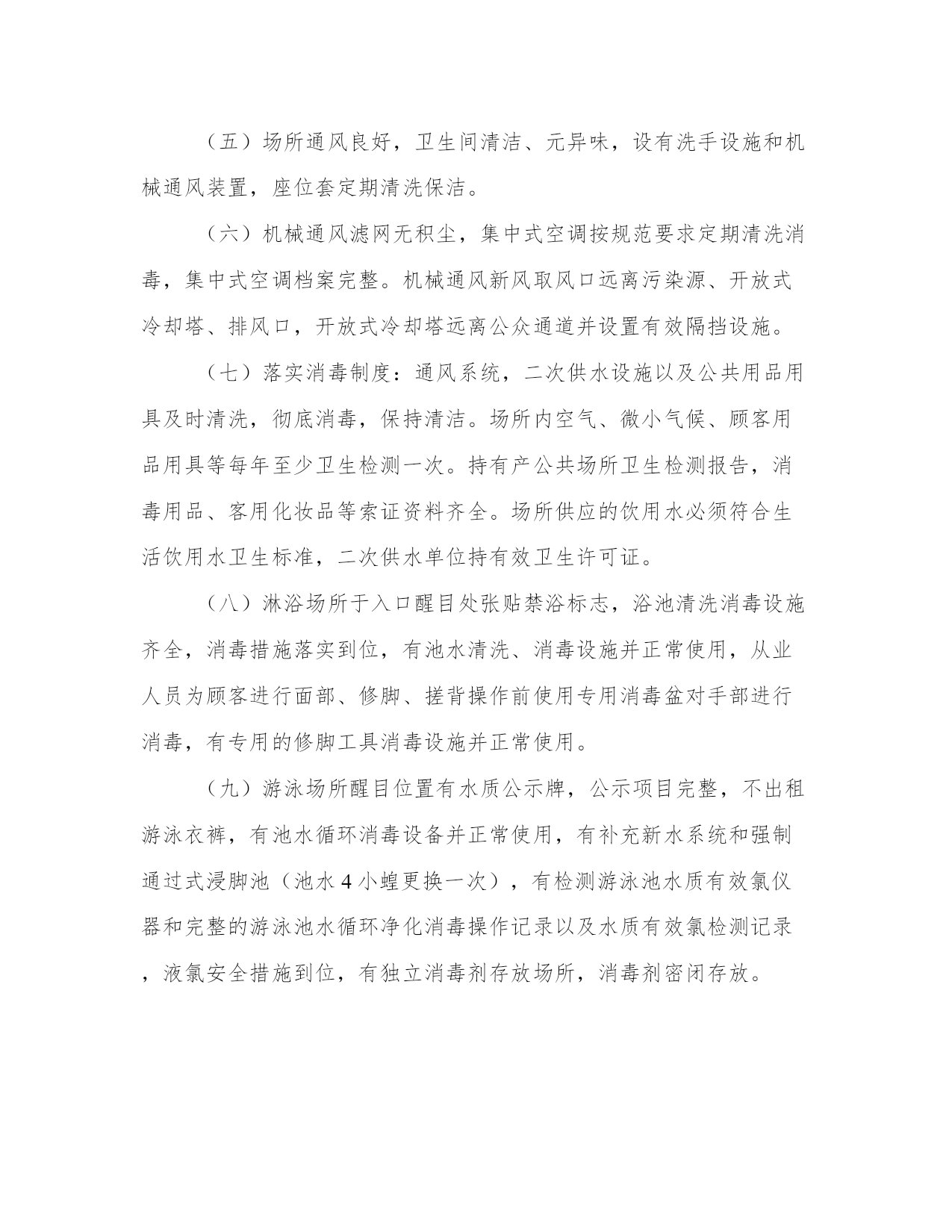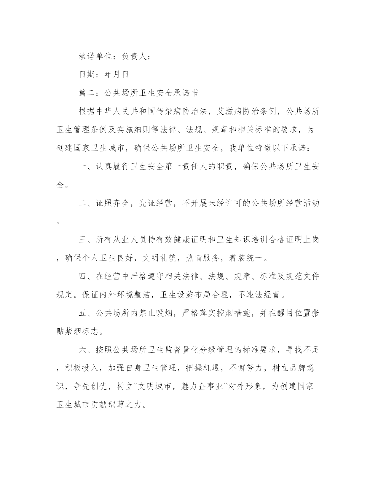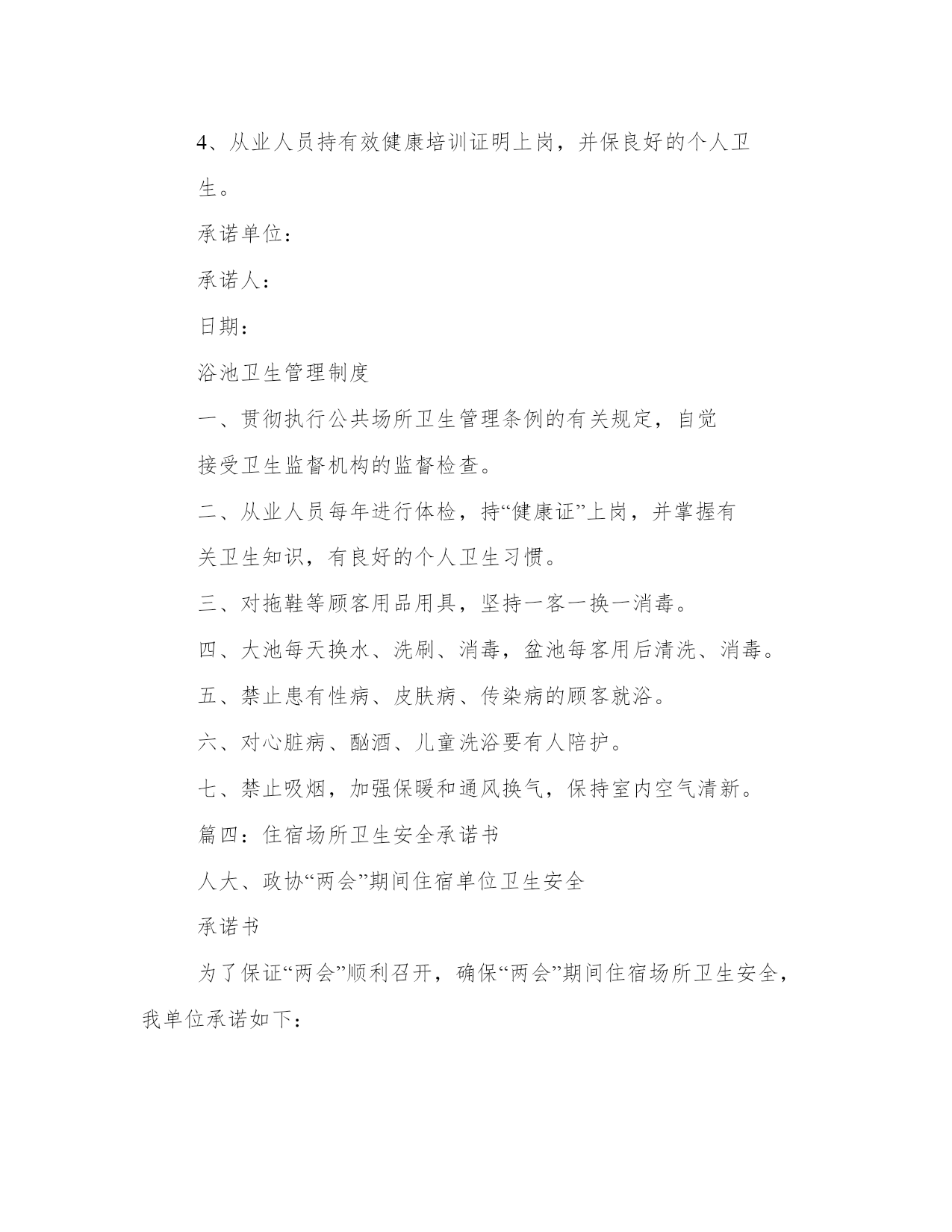 公共场所安全的承诺书按照公共场所卫生管理条例、公共场所卫生管理条例实施细则的要求,创造良好的公共场所卫生条件,保障顾客身体健康,本单位保证做好以下几点:(一)公共场所负责人(法定代表人)为公共卫生安全的第一责任人,对本单位的公共卫生安全负全面责任。(二)建立卫生管理制度,配备专职或兼职卫生管理人员,并按制度做好本单位的各项卫生管理工作。(三)从业人员每年进行健康检查和卫生知识培训考核,持健康证和培训合格证上岗。(四)做到场所内通风良好,配备机械通风排风设施。(五)配置公共用具清洗消毒设施,保证能正常使用,公用品、用具等做到一客一换一消毒并保洁。(六)定期清理室内外卫生,保持环境整洁。(七)提供的食品、用品保证符合国家卫生标准和要求。(八)认真学习并履行公共场所卫生管理条例、公共场所卫生管理条例实施细则的其他卫生要求。本单位将认真履行承诺书内容,保证经营的公共场所卫生符合要求,同时接受卫生行政部门的监督与管理,对违反法律法规的行为承担相应的法律责任。承诺单位:负责人:日期:年月日篇二:公共场所卫生安全承诺书根据中华人民共和国传染病防治法,艾滋病防治条例,公共场所卫生管理条例及实施细则等法律、法规、规章和相关标准的要求,为创建国家卫生城市,确保公共场所卫生安全,我单位特做以下承诺:一、认真履行卫生安全第一责任人的职责,确保公共场所卫生安全。二、证照齐全,亮证经营,不开展未经许可的公共场所经营活动。三、所有从业人员持有效健康证明和卫生知识培训合格证明上岗,确保个人卫生良好,文明礼貌,热情服务,着装统一。四、在经营中严格遵守相关法律、法规、规章、标准及规范文件规定。保证内外环境整洁,卫生设施布局合理,不违法经营。五、公共场所内禁止吸烟,严格落实控烟措施,并在醒目位置张贴禁烟标志。六、按照公共场所卫生监督量化分级管理的标准要求,寻找不足,积极投入,加强自身卫生管理,把握机遇,不懈努力,树立品牌意识,争先创优,树立“文明城市,魅力企事业”对外形象,为创建国家卫生城市贡献绵薄之力。七、自学接受卫生监督部门的监督检查,建立和完善各项卫生管理制度、预案,从现在做起,从自身做起。主动参与,积极行动,承担因我单位违反法律、法规的责任及因此造成的公共场所卫生事故的全部责任。八、在执行公共场所卫生管理条例及实施细则方面具体做好以下的承诺:(一)建立并执行采购索证制度,严把公共用品用具采购关,加强公共用品用具进货验收与登记,不购买和使用无合法来源、无检验合格证明而及其它不符合卫生要求的客用化妆品、公共用品用具和消毒药品。(二)各项卫生制度齐全,卫生管理组织健全,卫生档案完整,自查记录、消毒记录等各种记录完整。(三)设有专用密闭消毒间(50平方米以下美发场所设消毒专区),消毒间环境整洁,配备消毒所需水池等设施、配务高温消毒设备、消毒药物和配比容器,配备密闭保洁柜,且标记明显,使用非一次性拖鞋的配备专用消毒池(桶)。熟练掌握消毒方法,规范消毒程序。公用物品和顾客用品清洁无污渍,做到一客一换一消毒。(四)设立专用布草间或密闭储存布划设施,室内环境整洁,保洁柜密闭存放布草,设立公共饮具保洁柜,设置有明显标记的棉专用脏棉制品收集容器。自洗棉制品配备消毒高施,消毒能力与使用量相适应。棉制品自洗、送洗记录完整。(五)场所通风良好,卫生间清洁、元异味,设有洗手设施和机械通风装置,座位套定期清洗保洁。(六)机械通风滤网无积尘,集中式空调按规范要求定期清洗消毒,集中式空调档案完整。机械通风新风取风口远离污染源、开放式冷却塔、排风口,开放式冷却塔远离公众通道并设置有效隔挡设施。(七)落实消毒制度:通风系统,二次供水设施以及公共用品用具及时清洗,彻底消毒,保持清洁。场所内空气、微小气候、顾客用品用具等每年至少卫生检测一次。持有产公共场所卫生检测报告,消毒用品、客用化妆品等索证资料齐全。场所供应的饮用水必须符合生活饮用水卫生标准,二次供水单位持有效卫生许可证。(八)淋浴场所于入口醒目处张贴禁浴标志,浴池清洗消毒设施齐全,消毒措施落实到位,有池水清洗、消毒设施并正常使用,从业人员为顾客进行面部、修脚、搓背操作前使用专用消毒盆对手部进行消毒,有专用的修脚工具消毒设施并正常使用。(九)游泳场所醒目位置有水质公示牌,公示项目完整,不出租游泳衣裤,有池水循环消毒设备并正常使用,有补充新水系统和强制通过式浸脚池(池水4小蝗更换一次),有检测游泳池水质有效氯仪器和完整的游泳池水循环净化消毒操作记录以及水质有效氯检测记录,液氯安全措施到位,有独立消毒剂存放场所,消毒剂密闭存放。(十)理发美容场所有头癣病人专用理发工具,标记明显。美发染烫设立独立操作间或操作区域,有独立排风系统,与中央空调分离。美容操作过程带口罩。(十一)饭馆(餐