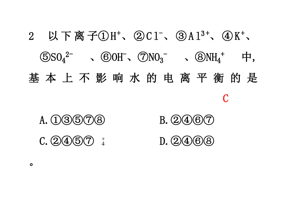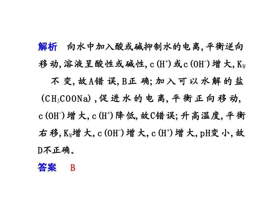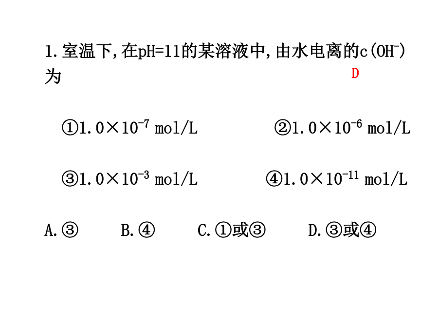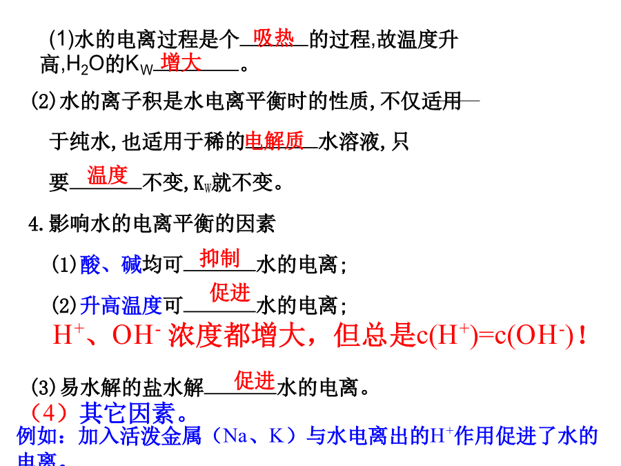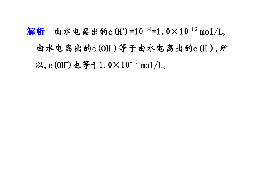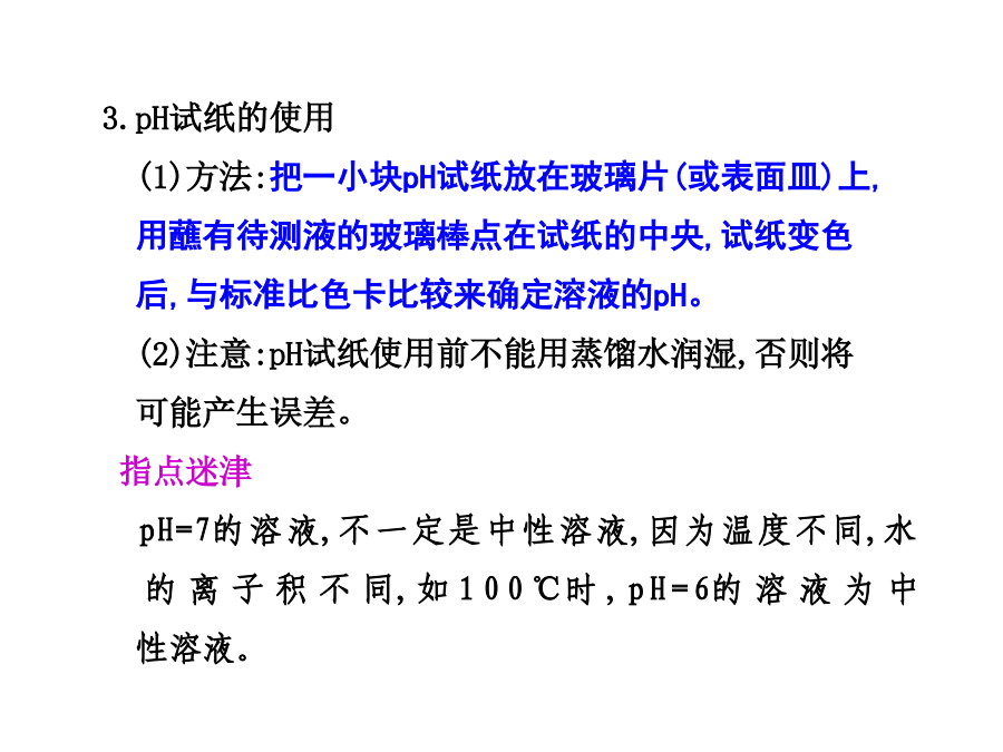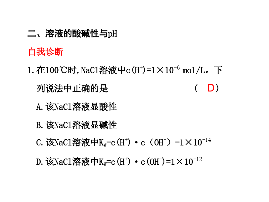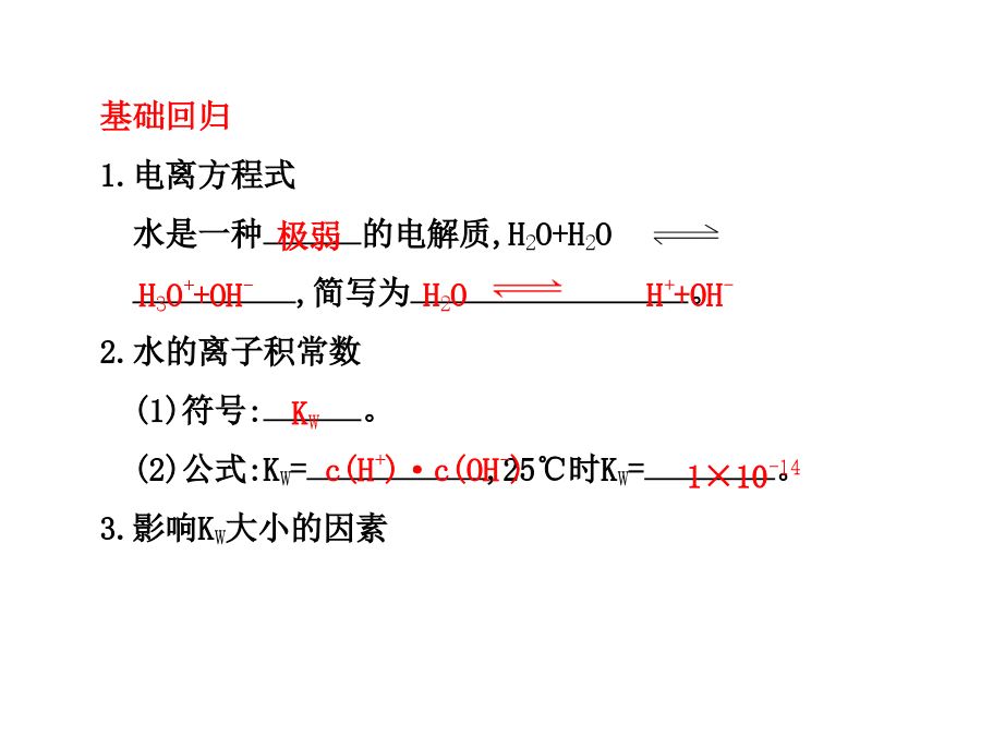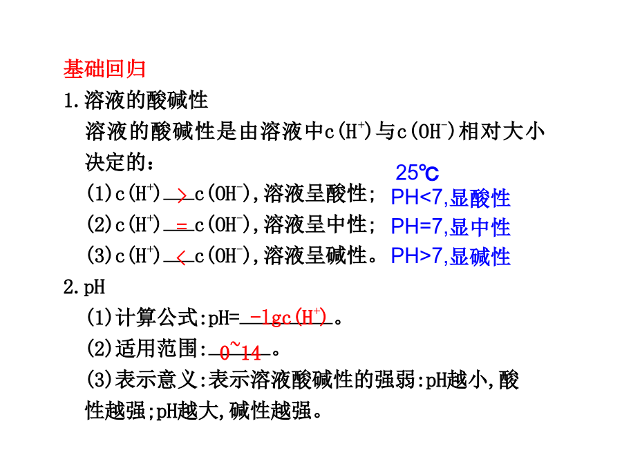 1.25℃,水的电离达到平衡:H2OH++OH-ΔH>0,下列叙述正确的是()A.向水中加入稀氨水,平衡逆向移动,c(OH-)降低B.向水中加入少量固体硫酸氢钠,c(H+)增大,KW不变C.向水中加入少量固体CH3COONa,平衡逆向移动,c(H+)降低D.将水加热,KW增大,pH不变解析向水中加入酸或碱抑制水的电离,平衡逆向移动,溶液呈酸性或碱性,c(H+)或c(OH-)增大,KW不变,故A错误,B正确;加入可以水解的盐(CH3COONa),促进水的电离,平衡正向移动,c(OH-)增大,c(H+)降低,故C错误;升高温度,平衡右移,KW增大,c(OH-)增大,c(H+)增大,pH变小,故D不正确。答案B基础回归1.电离方程式水是一种的电解质,H2O+H2O,简写为。2.水的离子积常数(1)符号:。(2)公式:KW=,25℃时KW=。3.影响KW大小的因素(1)水的电离过程是个的过程,故温度升高,H2O的KW。(2)水的离子积是水电离平衡时的性质,不仅适用于纯水,也适用于稀的水溶液,只要不变,KW就不变。4.影响水的电离平衡的因素(1)酸、碱均可水的电离;(2)升高温度可水的电离;(3)易水解的盐水解水的电离。二、溶液的酸碱性与pH自我诊断1.在100℃时,NaCl溶液中c(H+)=1×10-6mol/L。下列说法中正确的是()A.该NaCl溶液显酸性B.该NaCl溶液显碱性C.该NaCl溶液中KW=c(H+)·c(OH-)=1×10-14D.该NaCl溶液中KW=c(H+)·c(OH-)=1×10-12基础回归1.溶液的酸碱性溶液的酸碱性是由溶液中c(H+)与c(OH-)相对大小决定的:(1)c(H+)c(OH-),溶液呈酸性;(2)c(H+)c(OH-),溶液呈中性;(3)c(H+)c(OH-),溶液呈碱性。2.pH(1)计算公式:pH=。(2)适用范围:。(3)表示意义:表示溶液酸碱性的强弱:pH越小,酸性越强;pH越大,碱性越强。3.pH试纸的使用(1)方法:把一小块pH试纸放在玻璃片(或表面皿)上,用蘸有待测液的玻璃棒点在试纸的中央,试纸变色后,与标准比色卡比较来确定溶液的pH。(2)注意:pH试纸使用前不能用蒸馏水润湿,否则将可能产生误差。指点迷津pH=7的溶液,不一定是中性溶液,因为温度不同,水的离子积不同,如100℃时,pH=6的溶液为中性溶液。1.室温下,在pH=11的某溶液中,由水电离的c(OH-)为①1.0×10-7mol/L②1.0×10-6mol/L③1.0×10-3mol/L④1.0×10-11mol/LA.③B.④C.①或③D.③或④解析由水电离出的c(H+)=10-pH=1.0×10-12mol/L,由水电离出的c(OH-)等于由水电离出的c(H+),所以,c(OH-)也等于1.0×10-12mol/L。2以下离子①H+、②Cl-、③Al3+、④K+、⑤SO42-、⑥OH-、⑦NO3-、⑧NH4+中,基本上不影响水的电离平衡的是A.①③⑤⑦⑧B.②④⑥⑦C.②④⑤⑦D.②④⑥⑧。3.(2008·上海高考)常温下,某溶液中由水电离的c(H+)=1×10-13mol/L,该溶液可能是①二氧化硫水溶液②氯化铵水溶液③硝酸钠水溶液④氢氧化钠水溶液A.①④B.①②C.②③D.③④4.常温下,某溶液中由水电离的c(H+)=1×10-3mol/L,该溶液可能是①二氧化硫水溶液②氯化铵水溶液③硝酸钠水溶液④氢氧化钠水溶液A.①④B.①②C.②③D.②4、溶液pH的计算1.计算下列溶液的pH:0.1mol/LNaOH溶液0.05mol/LH2SO4溶液2.pH=2的盐酸与pH=5的盐酸等体积混合,所得混合溶液的pH约为A.2.3B.3.5C.4.7D.11.73.pH=10的NaOH溶液与pH=13的NaOH溶液等体积混合,所得混合溶液的pH约为A.10.3B.11.5C.12.3D.12.74.pH=3的盐酸与pH=13的NaOH溶液等体积混合,所得混合溶液的pH约为A.2.3B.8C.12.3D.12.75.pH=2的盐酸与pH=10的NaOH溶液等体积混合,所得混合溶液的pH约为A.2.3B.6C.9.7D.10.31、pH=5的盐酸与pH=9的NaOH溶液以体积比11:9混合,所得混合溶液的pH为A、6B、7.2C、8D、无法计算2、等体积混和0.10摩/升盐酸和0.06摩/升Ba(OH)2溶液后,溶液的pH值等于A、2.0B、12.3C、1.7D、12.03、PH=13的强碱溶液与PH=2的强酸溶液混和