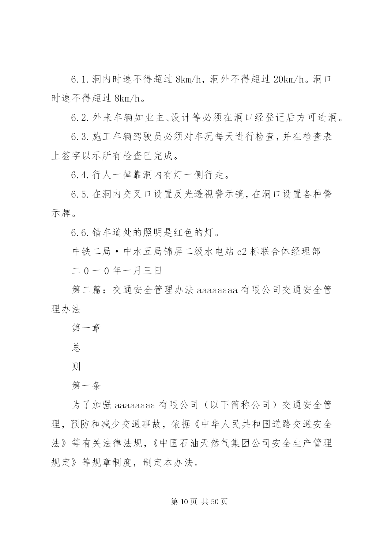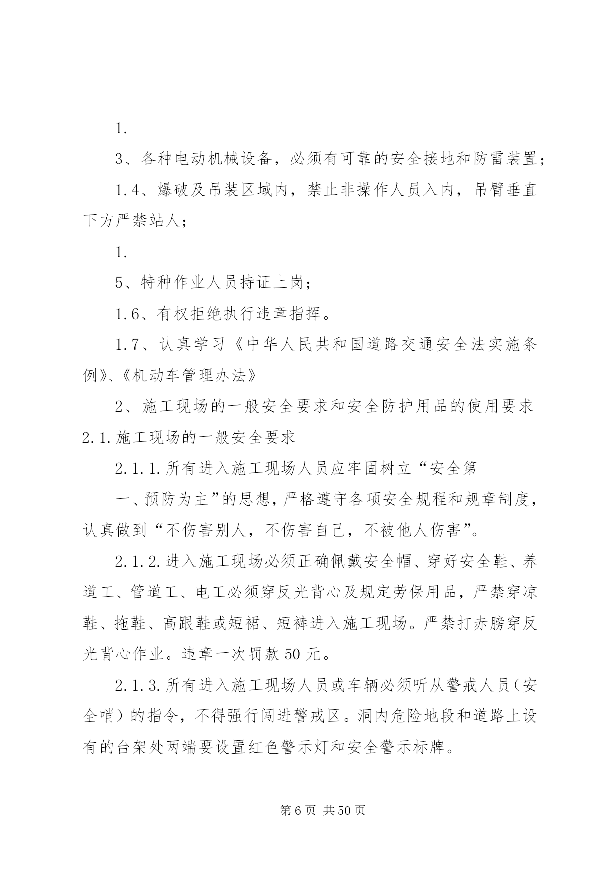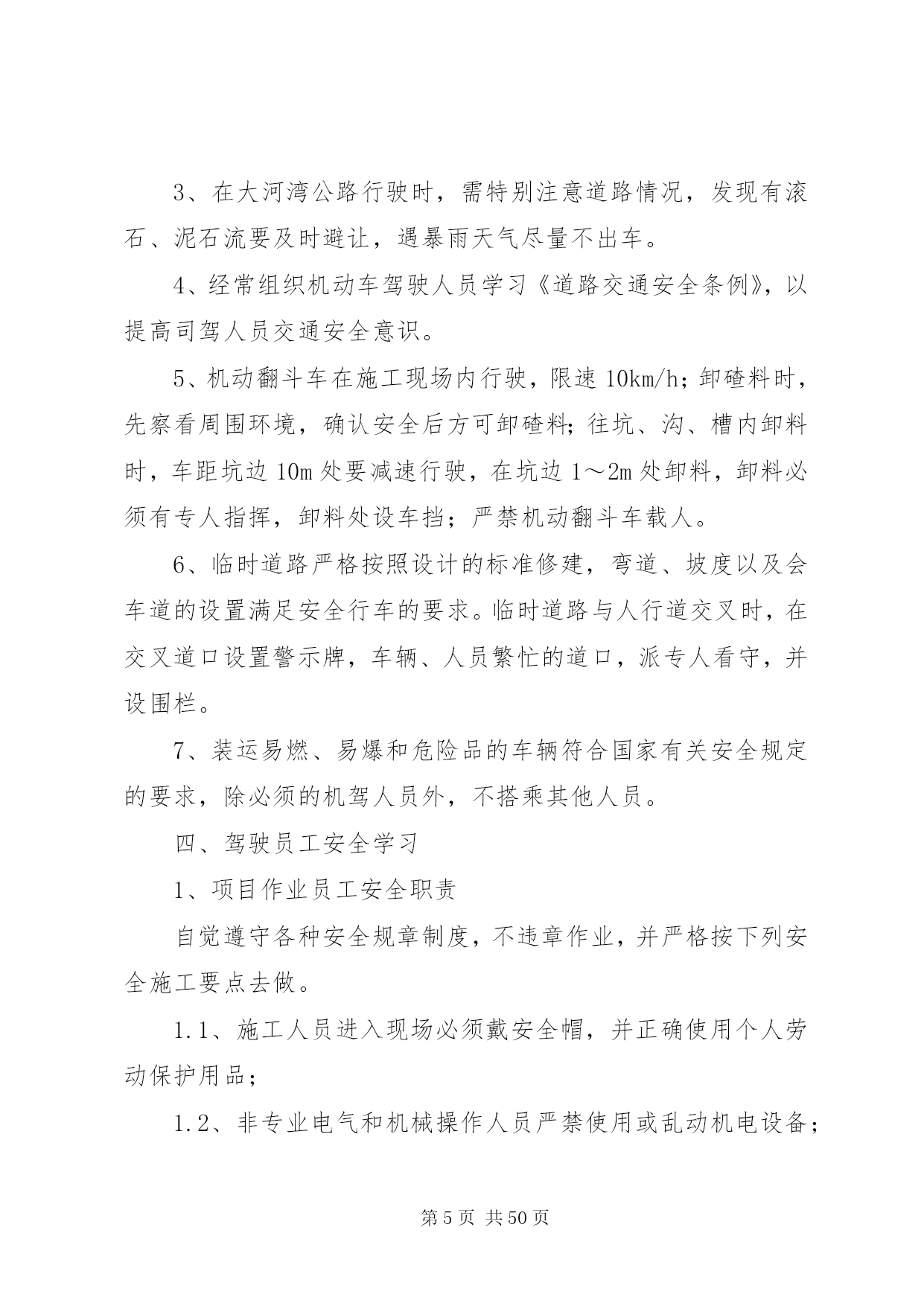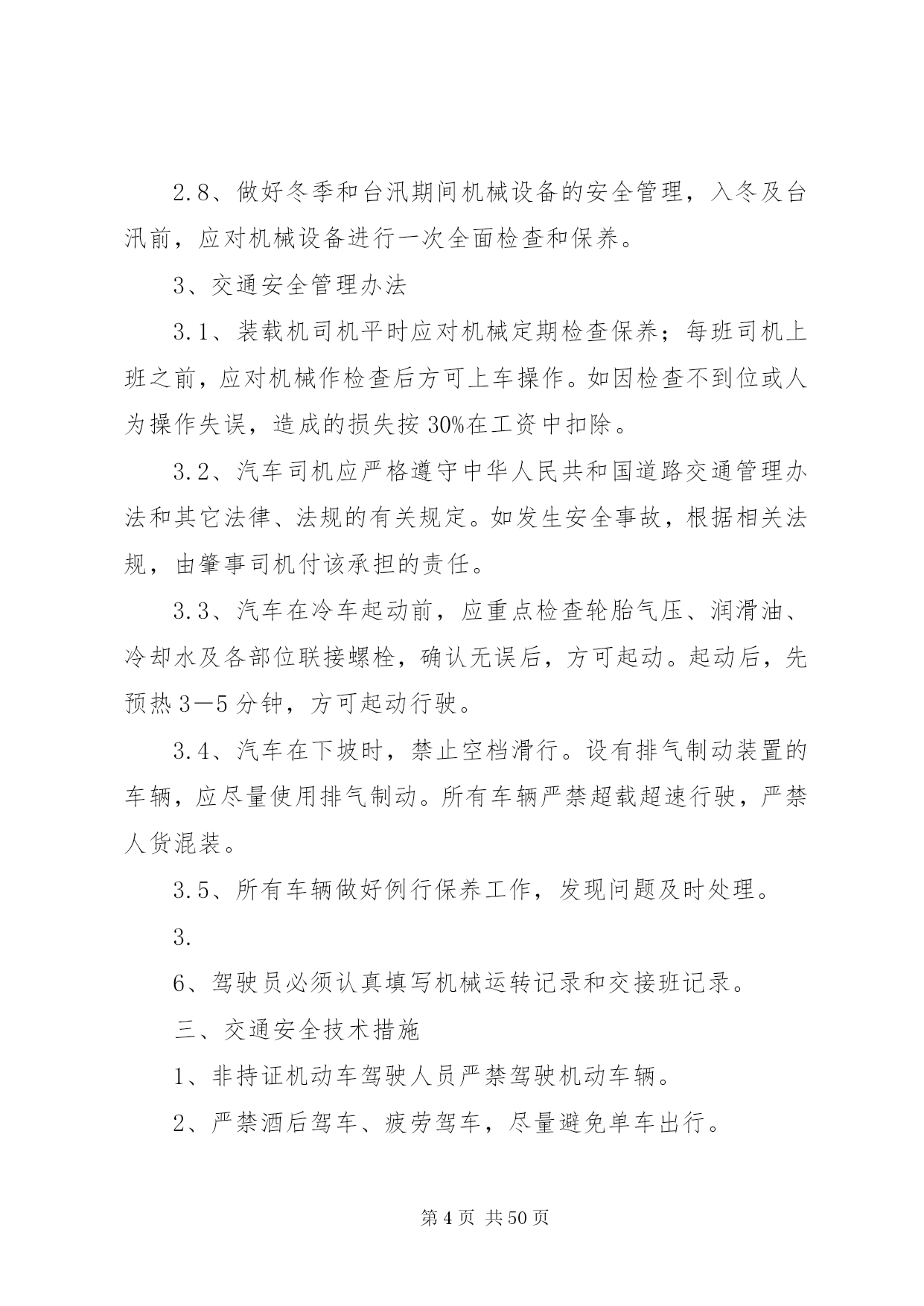 第PAGE\*Arabic\*MERGEFORMAT50页共NUMPAGES\*MERGEFORMAT50页交通安全管理办法为了保证我部工程的顺利施工,降低成本消耗,提高工作效率,减少交通安全事故的发生,特制定我部交通安全管理办法。一、交通安全管理体系成立以项目经理为组长的交通安全管理领导小组,领导小组下设办公室于机电部,在安质部的监督下进行日常交通安全管理工作和驾驶员的安全培训和学习。组长:沙宗天副组长:张帅张焰成员:唐剑刘士恩汤修明廖建东姚华忠廖大洪刘元东邓迪周双刘传刚申华东由张焰任办公室主任。二、机电设备安全管理加强施工现场机械设备的安全管理,以确保机械设备的安全运行和职工的人身安全。施工现场必须健全机械设备安全管理体制,完善机械设备安全责任制,机电部门负责机械设备的监督检查。施工计划必须保证必要的设备维修保养时间,严禁盲目追求施工进度而滥用设备的现象。1、机电人员管理1.1、机电设备操作人员须身体健康,没有妨碍从事本工程作业的疾病和缺陷,受过专门训练,熟悉机械性能,经考核合格,取得安全操作证后,方可上岗操作。1.2、特种作业人员必须按国家《特种作业人员安全技术考核管理规则》的要求培训和考核,取得“特种作业人员安全操作许可证”后,方可上岗操作。1.3、实习操作人员必须持有实习证,在单位指派并持有合格证件的熟练人员指导下才能操作机械设备。在非生产时间内,未经项目部主管部门批准,任何人不得私自动用机械设备。1.4、操作人员在操作时必须按规定使用劳保用品,操作人员有权拒绝执行违反安全规程的指令;强令违章操作,不管是否造成后果,均应严肃追究指挥人的责任,操作人员盲目服从违章操作,应负直接操作责任。设备管理和操作人员队伍应相对稳定。2、机械设备的安全使用和管理2.1、施工现场及项目部应建立健全机械设备的安全技术档案。每台机械设备的例行检查、定期保养、安全运行和检测记录,必须准确及时齐全;两班制以上作业的机械设备,均应实行交接班制度,认真填写交接班记录,并归入技术档案。2.2、施工现场设备的安装,应严格执行验收制度。起重机械等大型特种设备的验收,应由项目工程部、机电部、安质部、项目总工及分管领导会同专业安装队伍进行初验,自检合格后再报XX省特种设备检测中心进行验收,验收合格取证后才能使用。大型起重设备安装及大型起重吊装作业前,须编制专门拆装方案,经公司总工程师审批后,方可进行作业。2.3、各类施工机械的安全防护装置和安全措施,必须严格按有关的安全技术规程配置,并保持齐全有效,严禁拆除机械设备上的各种安全防护及监测、指示、仪表等装置。机械设备严格执行定人、定机、定岗位的制度,多人操作设备应严格执行交接班制和机长负责制。2.4、起重机械必须严格遵守起重机械安全规程和执行“十不吊”的规定。吊索具应符合相应的国家标准,严格按有关规定使用。起重机操作及指挥人员必须持证上岗。起重机械作业应设置有效的通信联络信号。施工设备易发生故障,危险性较大的地方,应配置报警装置。2.5、施工现场所有机管、机械操作和机修人员必须严格执行机械设备的安全操作及保养规程,机械设备应按原机技术性能的规定正确使用,必须严格执行例检制度和定期保养制度,做好操作前、操作中和操作后设备的清洁、润滑、紧固、调整和防腐工作。当机械设备运转到保养周期时,必须按规定进行保养,严禁机械设备超负荷使用、带病运转和在运转作业中进行维修保养。2.6、根据有关安全技术标准,制定各类机械设备的安全检查项目及时间表,对现场施工设备定期进行安全检查评定,针对检查出的隐患问题限期整改,并严格履行验收手续。2.7、施工现场应具备机械设备安全作业所需的道路、场地、机棚以及供水、供电、排水等条件,夜间作业必须有充足的照明。2.8、做好冬季和台汛期间机械设备的安全管理,入冬及台汛前,应对机械设备进行一次全面检查和保养。3、交通安全管理办法3.1、装载机司机平时应对机械定期检查保养;每班司机上班之前,应对机械作检查后方可上车操作。如因检查不到位或人为操作失误,造成的损失按30%在工资中扣除。3.2、汽车司机应严格遵守中华人民共和国道路交通管理办法和其它法律、法规的有关规定。如发生安全事故,根据相关法规,由肇事司机付该承担的责任。3.3、汽车在冷车起动前,应重点检查轮胎气压、润滑油、冷却水及各部位联接螺栓,确认无误后,方可起动。起动后,先预热3-5分钟,方可起动行驶。3.4、汽车在下坡时,禁止空档滑行。设有排气制动装置的车辆,应尽量使用排气制动。所有车辆严禁超载超速行驶,严禁人货混装。3.5、所有车辆做好例行保养工作,发现问题及时处理。3.6、驾驶员必须认真填写机械运转记录和交接班记录。三、交通安全技术措施1、非持证机动车驾驶人员严禁驾驶机动车辆。2、严禁酒后驾车、疲劳驾车,尽量避免单车