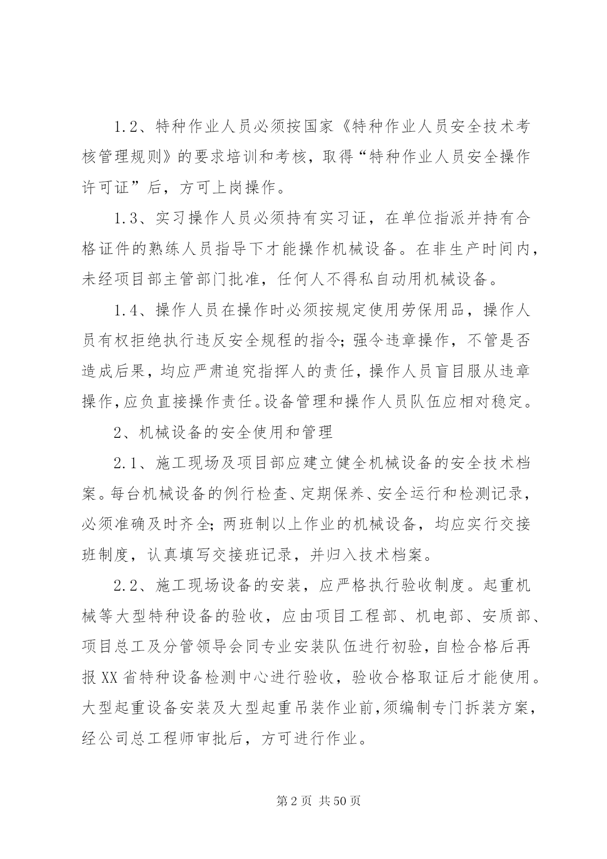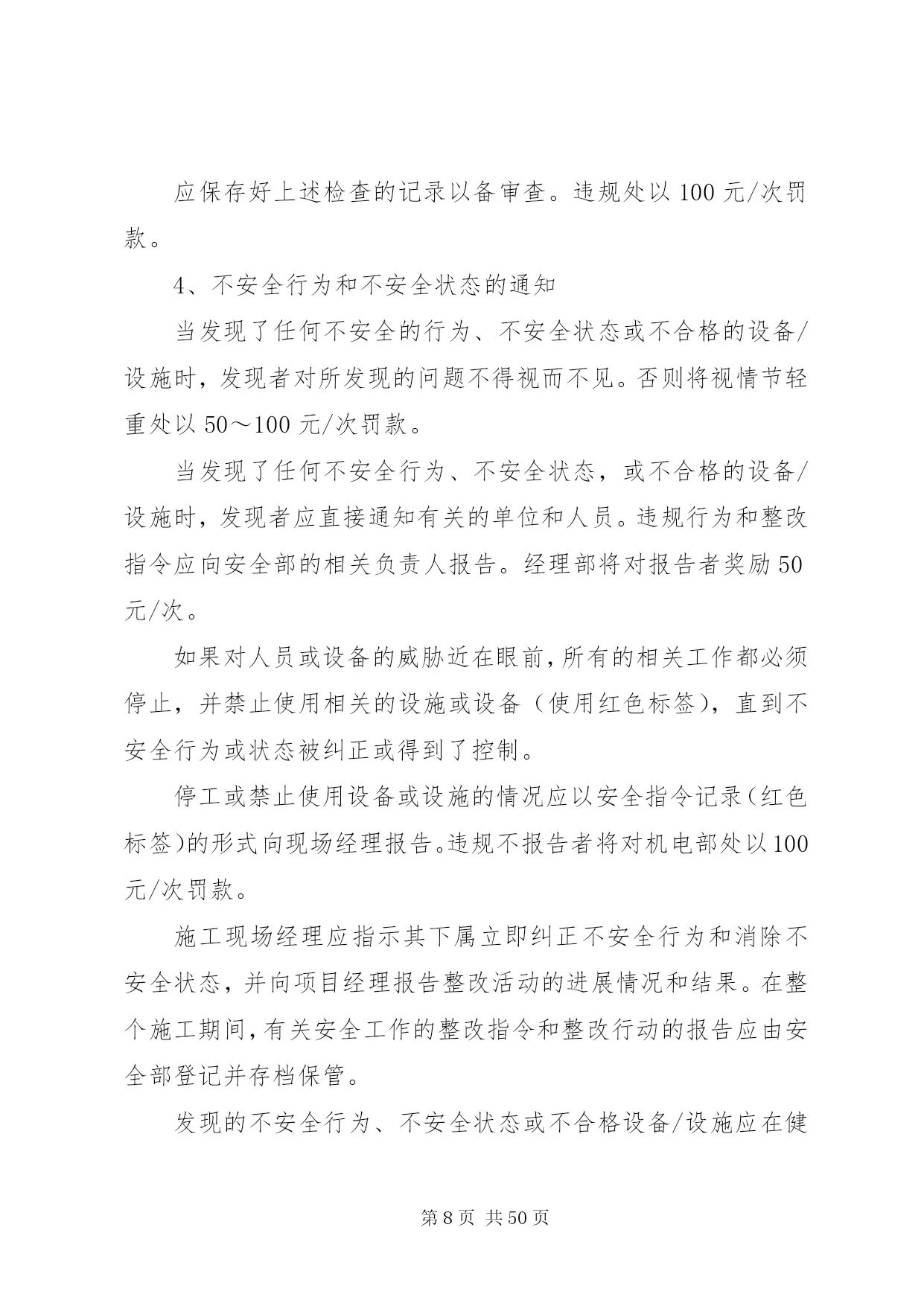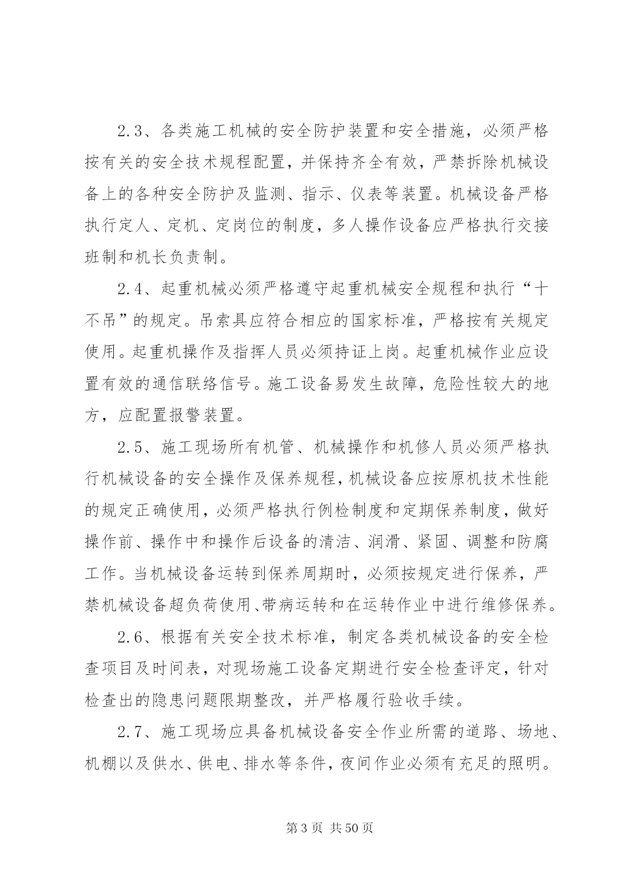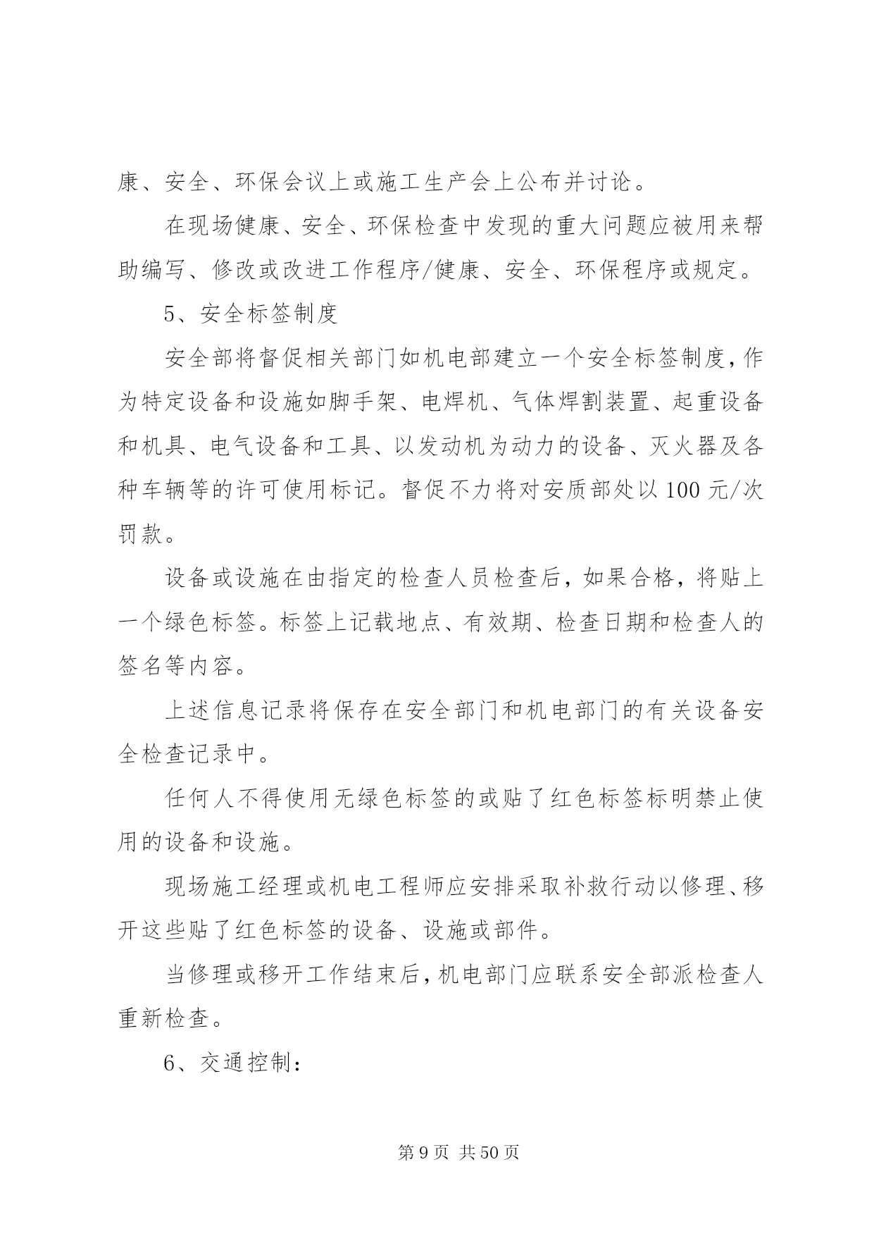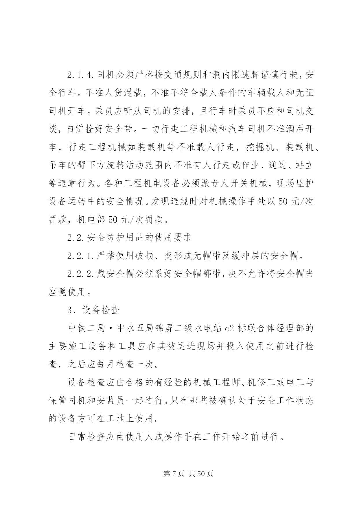 第PAGE\*Arabic\*MERGEFORMAT50页共NUMPAGES\*MERGEFORMAT50页交通安全管理办法为了保证我部工程的顺利施工,降低成本消耗,提高工作效率,减少交通安全事故的发生,特制定我部交通安全管理办法。一、交通安全管理体系成立以项目经理为组长的交通安全管理领导小组,领导小组下设办公室于机电部,在安质部的监督下进行日常交通安全管理工作和驾驶员的安全培训和学习。组长:沙宗天副组长:张帅张焰成员:唐剑刘士恩汤修明廖建东姚华忠廖大洪刘元东邓迪周双刘传刚申华东由张焰任办公室主任。二、机电设备安全管理加强施工现场机械设备的安全管理,以确保机械设备的安全运行和职工的人身安全。施工现场必须健全机械设备安全管理体制,完善机械设备安全责任制,机电部门负责机械设备的监督检查。施工计划必须保证必要的设备维修保养时间,严禁盲目追求施工进度而滥用设备的现象。1、机电人员管理1.1、机电设备操作人员须身体健康,没有妨碍从事本工程作业的疾病和缺陷,受过专门训练,熟悉机械性能,经考核合格,取得安全操作证后,方可上岗操作。1.2、特种作业人员必须按国家《特种作业人员安全技术考核管理规则》的要求培训和考核,取得“特种作业人员安全操作许可证”后,方可上岗操作。1.3、实习操作人员必须持有实习证,在单位指派并持有合格证件的熟练人员指导下才能操作机械设备。在非生产时间内,未经项目部主管部门批准,任何人不得私自动用机械设备。1.4、操作人员在操作时必须按规定使用劳保用品,操作人员有权拒绝执行违反安全规程的指令;强令违章操作,不管是否造成后果,均应严肃追究指挥人的责任,操作人员盲目服从违章操作,应负直接操作责任。设备管理和操作人员队伍应相对稳定。2、机械设备的安全使用和管理2.1、施工现场及项目部应建立健全机械设备的安全技术档案。每台机械设备的例行检查、定期保养、安全运行和检测记录,必须准确及时齐全;两班制以上作业的机械设备,均应实行交接班制度,认真填写交接班记录,并归入技术档案。2.2、施工现场设备的安装,应严格执行验收制度。起重机械等大型特种设备的验收,应由项目工程部、机电部、安质部、项目总工及分管领导会同专业安装队伍进行初验,自检合格后再报XX省特种设备检测中心进行验收,验收合格取证后才能使用。大型起重设备安装及大型起重吊装作业前,须编制专门拆装方案,经公司总工程师审批后,方可进行作业。2.3、各类施工机械的安全防护装置和安全措施,必须严格按有关的安全技术规程配置,并保持齐全有效,严禁拆除机械设备上的各种安全防护及监测、指示、仪表等装置。机械设备严格执行定人、定机、定岗位的制度,多人操作设备应严格执行交接班制和机长负责制。2.4、起重机械必须严格遵守起重机械安全规程和执行“十不吊”的规定。吊索具应符合相应的国家标准,严格按有关规定使用。起重机操作及指挥人员必须持证上岗。起重机械作业应设置有效的通信联络信号。施工设备易发生故障,危险性较大的地方,应配置报警装置。2.5、施工现场所有机管、机械操作和机修人员必须严格执行机械设备的安全操作及保养规程,机械设备应按原机技术性能的规定正确使用,必须严格执行例检制度和定期保养制度,做好操作前、操作中和操作后设备的清洁、润滑、紧固、调整和防腐工作。当机械设备运转到保养周期时,必须按规定进行保养,严禁机械设备超负荷使用、带病运转和在运转作业中进行维修保养。2.6、根据有关安全技术标准,制定各类机械设备的安全检查项目及时间表,对现场施工设备定期进行安全检查评定,针对检查出的隐患问题限期整改,并严格履行验收手续。2.7、施工现场应具备机械设备安全作业所需的道路、场地、机棚以及供水、供电、排水等条件,夜间作业必须有充足的照明。2.8、做好冬季和台汛期间机械设备的安全管理,入冬及台汛前,应对机械设备进行一次全面检查和保养。3、交通安全管理办法3.1、装载机司机平时应对机械定期检查保养;每班司机上班之前,应对机械作检查后方可上车操作。如因检查不到位或人为操作失误,造成的损失按30%在工资中扣除。3.2、汽车司机应严格遵守中华人民共和国道路交通管理办法和其它法律、法规的有关规定。如发生安全事故,根据相关法规,由肇事司机付该承担的责任。3.3、汽车在冷车起动前,应重点检查轮胎气压、润滑油、冷却水及各部位联接螺栓,确认无误后,方可起动。起动后,先预热3-5分钟,方可起动行驶。3.4、汽车在下坡时,禁止空档滑行。设有排气制动装置的车辆,应尽量使用排气制动。所有车辆严禁超载超速行驶,严禁人货混装。3.5、所有车辆做好例行保养工作,发现问题及时处理。3.6、驾驶员必须认真填写机械运转记录和交接班记录。三、交通安全技术措施1、非持证机动车驾驶人员严禁驾驶机动车辆。2、严禁酒后驾车、疲劳驾车,尽量避免单车