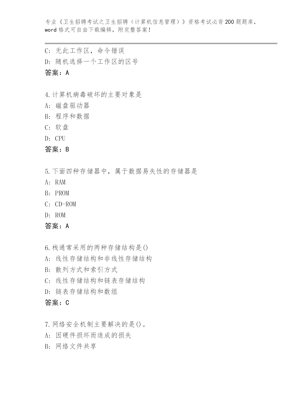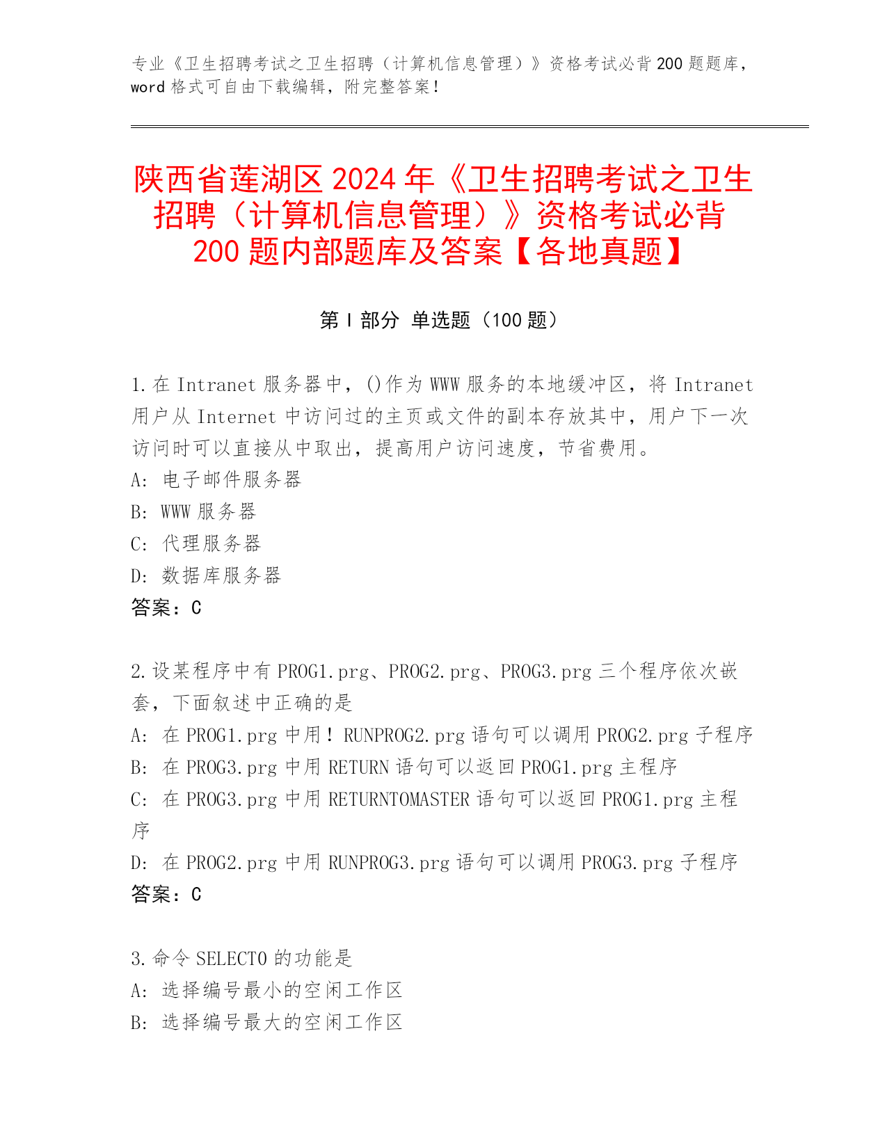 陕西省莲湖区2024年《卫生招聘考试之卫生招聘(计算机信息管理)》资格考试必背200题内部题库及答案【各地真题】