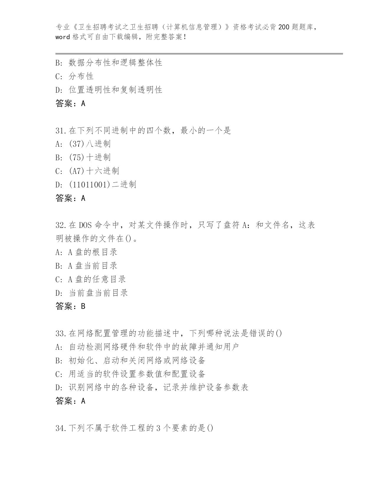 陕西省《卫生招聘考试之卫生招聘(计算机信息管理)》资格考试必背200题真题【各地真题】