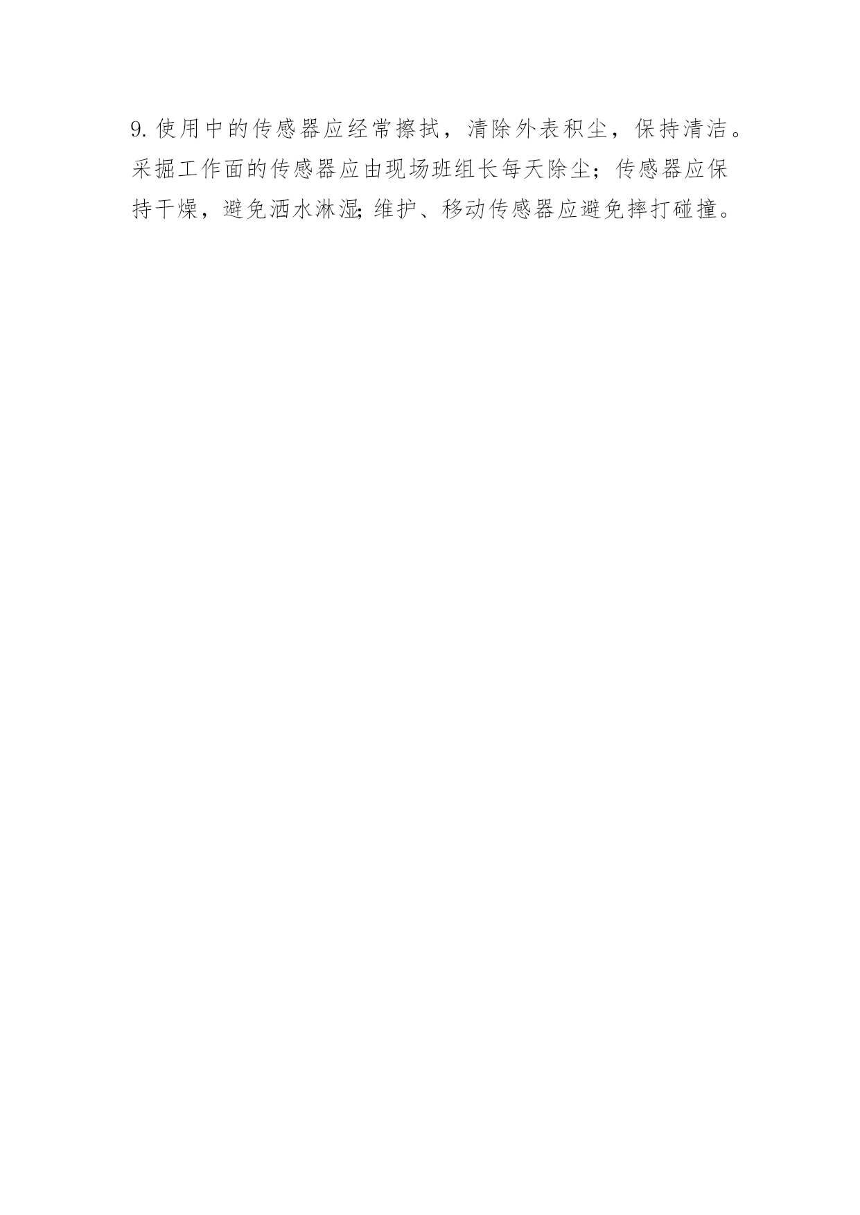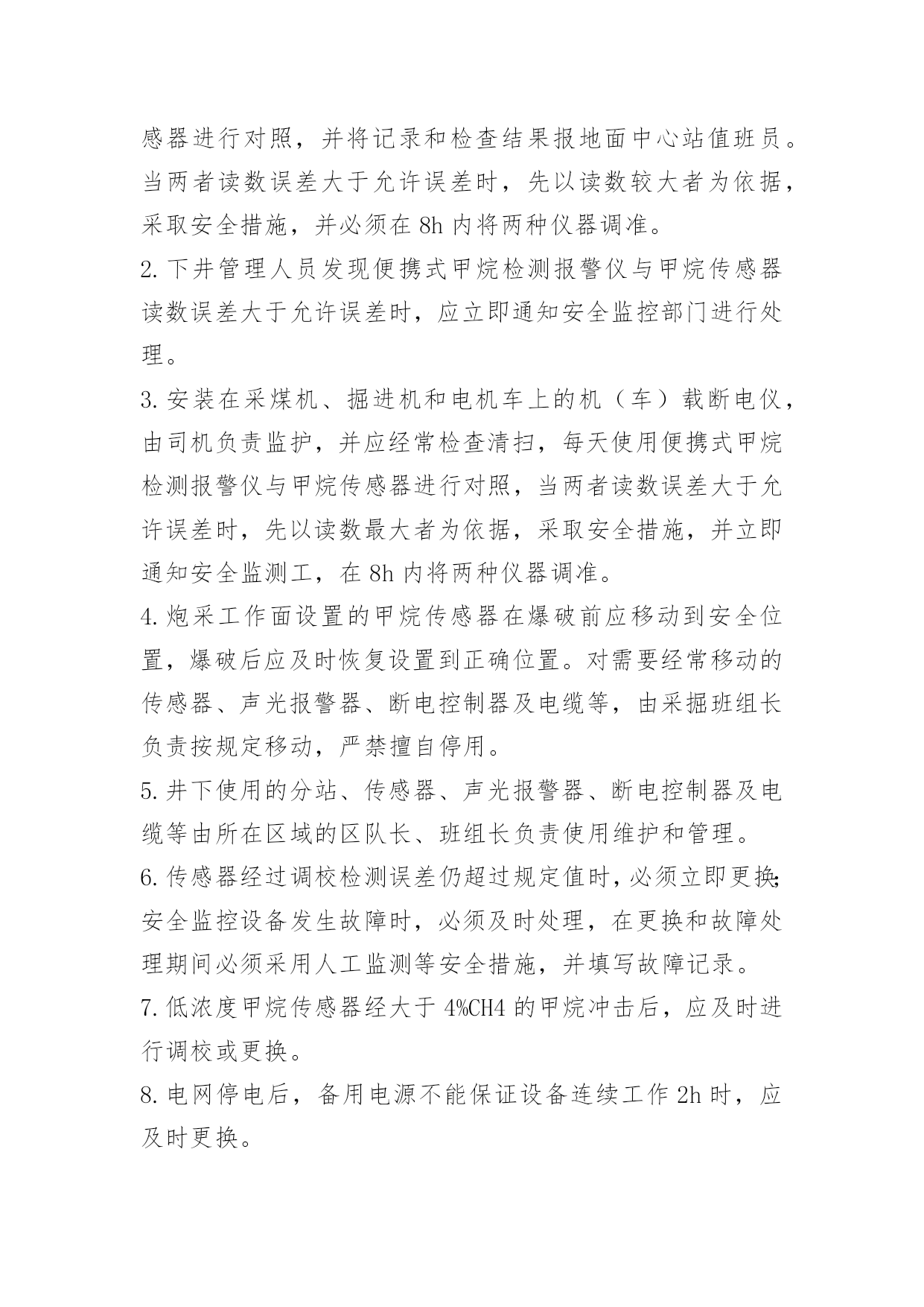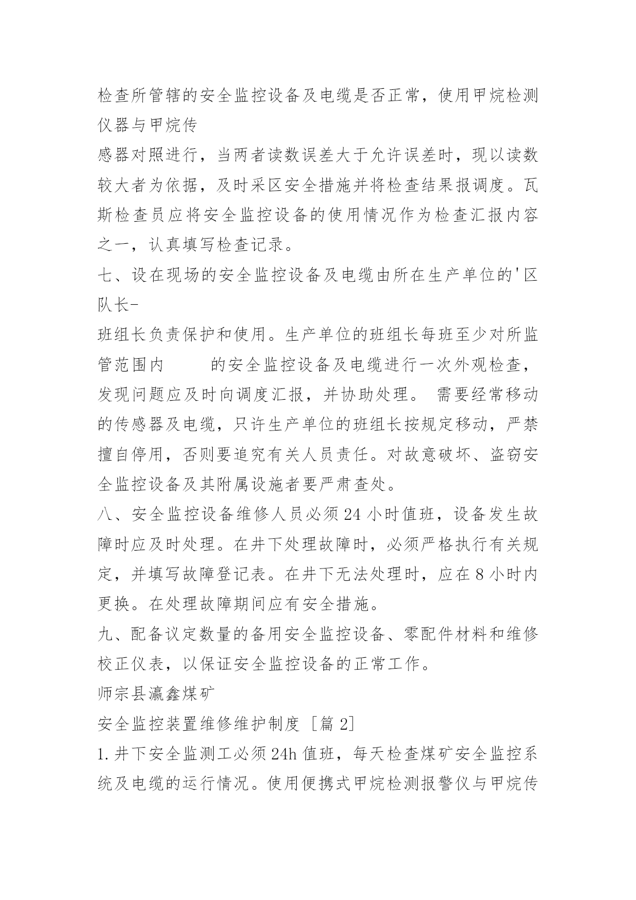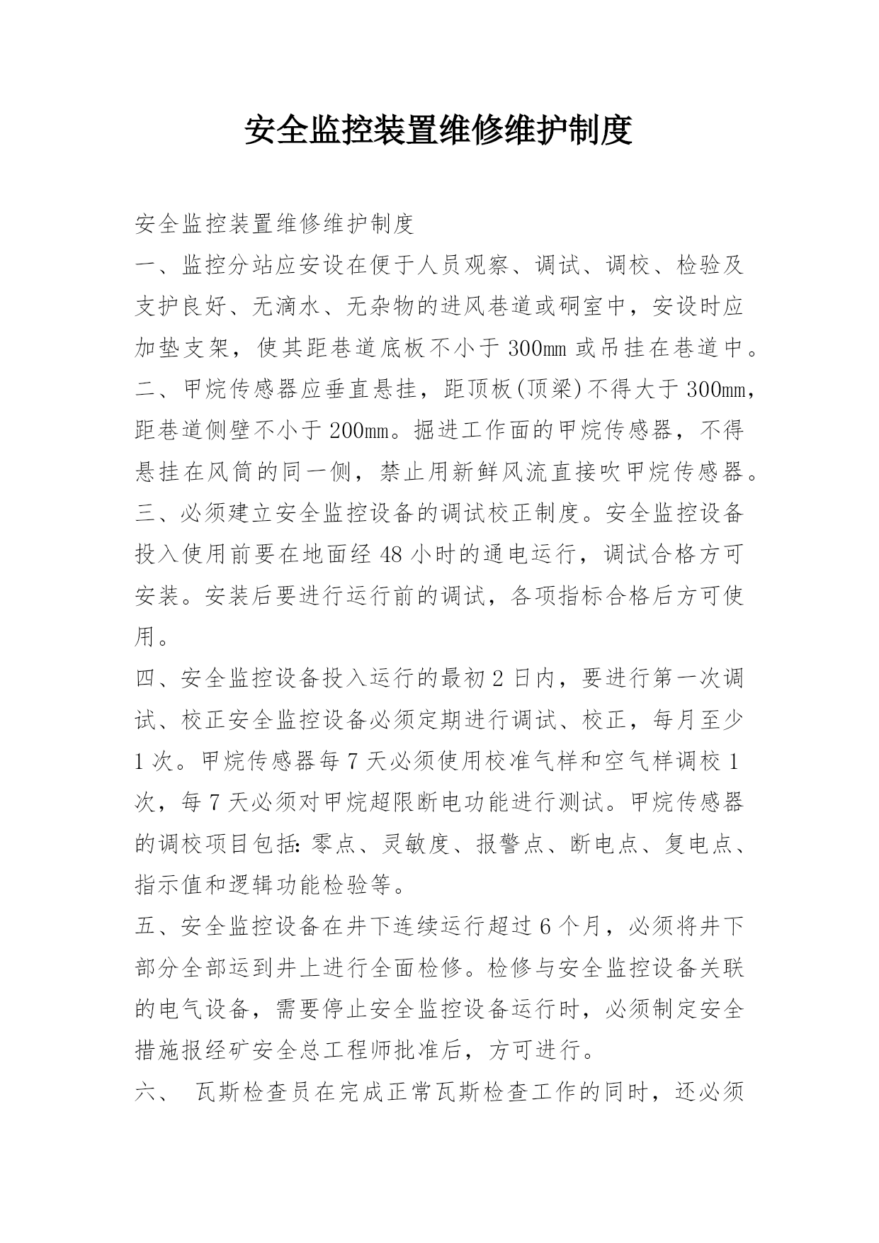 安全监控装置维修维护制度安全监控装置维修维护制度一、监控分站应安设在便于人员观察、调试、调校、检验及支护良好、无滴水、无杂物的进风巷道或硐室中,安设时应加垫支架,使其距巷道底板不小于300mm或吊挂在巷道中。二、甲烷传感器应垂直悬挂,距顶板(顶梁)不得大于300mm,距巷道侧壁不小于200mm。掘进工作面的甲烷传感器,不得悬挂在风筒的同一侧,禁止用新鲜风流直接吹甲烷传感器。三、必须建立安全监控设备的调试校正制度。安全监控设备投入使用前要在地面经48小时的通电运行,调试合格方可安装。安装后要进行运行前的调试,各项指标合格后方可使用。四、安全监控设备投入运行的最初2日内,要进行第一次调试、校正安全监控设备必须定期进行调试、校正,每月至少1次。甲烷传感器每7天必须使用校准气样和空气样调校1次,每7天必须对甲烷超限断电功能进行测试。甲烷传感器的调校项目包括:零点、灵敏度、报警点、断电点、复电点、指示值和逻辑功能检验等。五、安全监控设备在井下连续运行超过6个月,必须将井下部分全部运到井上进行全面检修。检修与安全监控设备关联的电气设备,需要停止安全监控设备运行时,必须制定安全措施报经矿安全总工程师批准后,方可进行。六、瓦斯检查员在完成正常瓦斯检查工作的同时,还必须检查所管辖的安全监控设备及电缆是否正常,使用甲烷检测仪器与甲烷传感器对照进行,当两者读数误差大于允许误差时,现以读数较大者为依据,及时采区安全措施并将检查结果报调度。瓦斯检查员应将安全监控设备的使用情况作为检查汇报内容之一,认真填写检查记录。七、设在现场的安全监控设备及电缆由所在生产单位的'区队长-班组长负责保护和使用。生产单位的班组长每班至少对所监管范围内的安全监控设备及电缆进行一次外观检查,发现问题应及时向调度汇报,并协助处理。需要经常移动的传感器及电缆,只许生产单位的班组长按规定移动,严禁擅自停用,否则要追究有关人员责任。对故意破坏、盗窃安全监控设备及其附属设施者要严肃查处。八、安全监控设备维修人员必须24小时值班,设备发生故障时应及时处理。在井下处理故障时,必须严格执行有关规定,并填写故障登记表。在井下无法处理时,应在8小时内更换。在处理故障期间应有安全措施。九、配备议定数量的备用安全监控设备、零配件材料和维修校正仪表,以保证安全监控设备的正常工作。师宗县瀛鑫煤矿安全监控装置维修维护制度[篇2]1.井下安全监测工必须24h值班,每天检查煤矿安全监控系统及电缆的运行情况。使用便携式甲烷检测报警仪与甲烷传感器进行对照,并将记录和检查结果报地面中心站值班员。当两者读数误差大于允许误差时,先以读数较大者为依据,采取安全措施,并必须在8h内将两种仪器调准。2.下井管理人员发现便携式甲烷检测报警仪与甲烷传感器读数误差大于允许误差时,应立即通知安全监控部门进行处理。3.安装在采煤机、掘进机和电机车上的机(车)载断电仪,由司机负责监护,并应经常检查清扫,每天使用便携式甲烷检测报警仪与甲烷传感器进行对照,当两者读数误差大于允许误差时,先以读数最大者为依据,采取安全措施,并立即通知安全监测工,在8h内将两种仪器调准。4.炮采工作面设置的甲烷传感器在爆破前应移动到安全位置,爆破后应及时恢复设置到正确位置。对需要经常移动的传感器、声光报警器、断电控制器及电缆等,由采掘班组长负责按规定移动,严禁擅自停用。5.井下使用的分站、传感器、声光报警器、断电控制器及电缆等由所在区域的区队长、班组长负责使用维护和管理。6.传感器经过调校检测误差仍超过规定值时,必须立即更换;安全监控设备发生故障时,必须及时处理,在更换和故障处理期间必须采用人工监测等安全措施,并填写故障记录。7.低浓度甲烷传感器经大于4%CH4的甲烷冲击后,应及时进行调校或更换。8.电网停电后,备用电源不能保证设备连续工作2h时,应及时更换。9.使用中的传感器应经常擦拭,清除外表积尘,保持清洁。采掘工作面的传感器应由现场班组长每天除尘;传感器应保持干燥,避免洒水淋湿;维护、移动传感器应避免摔打碰撞。