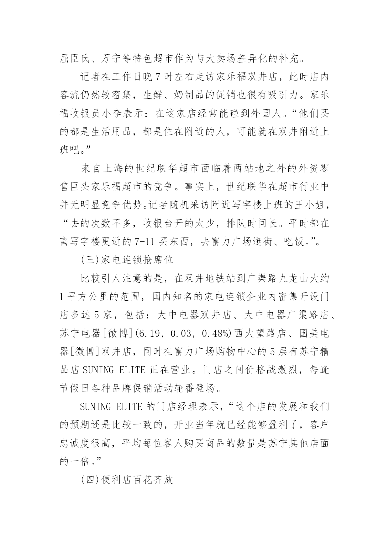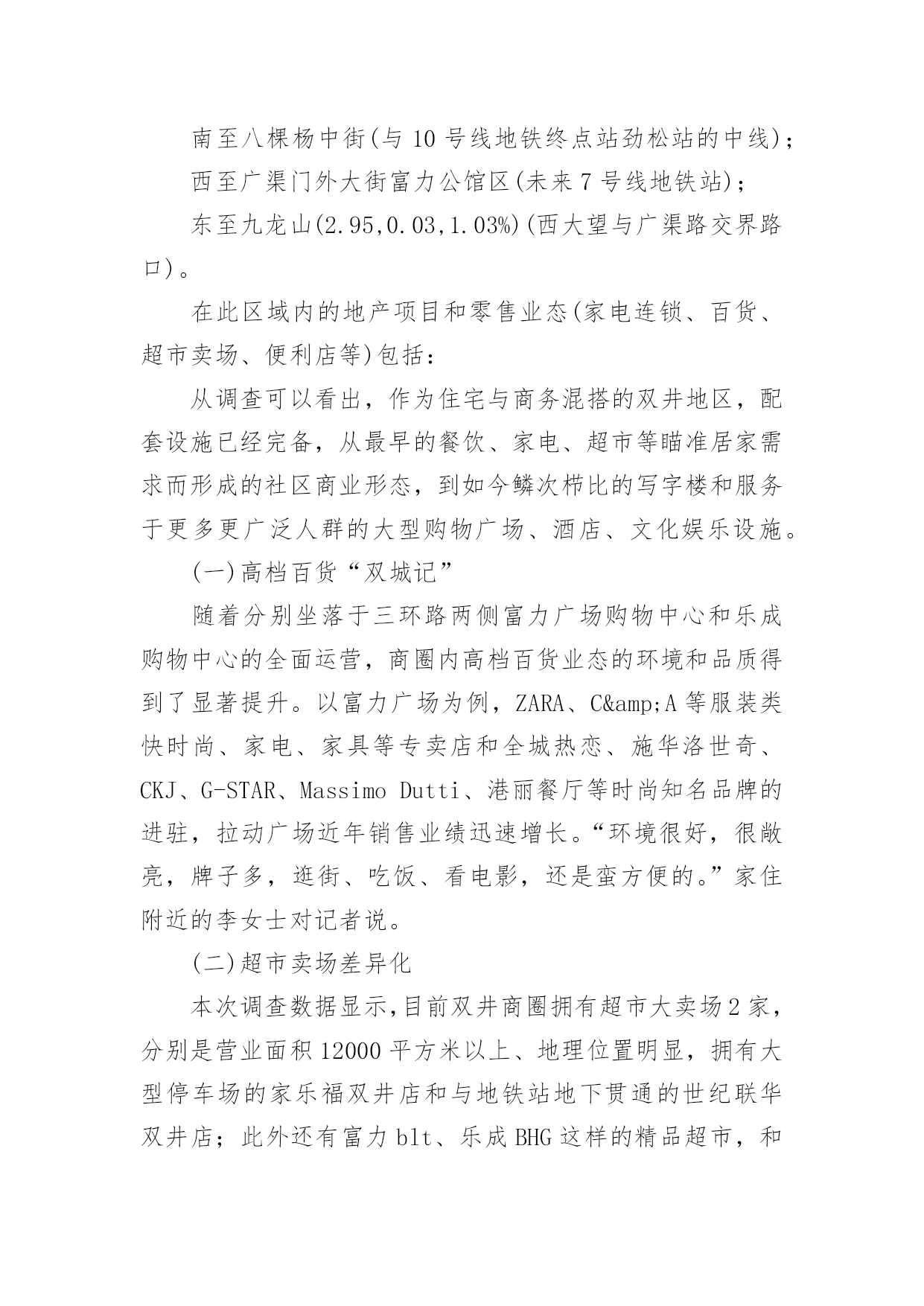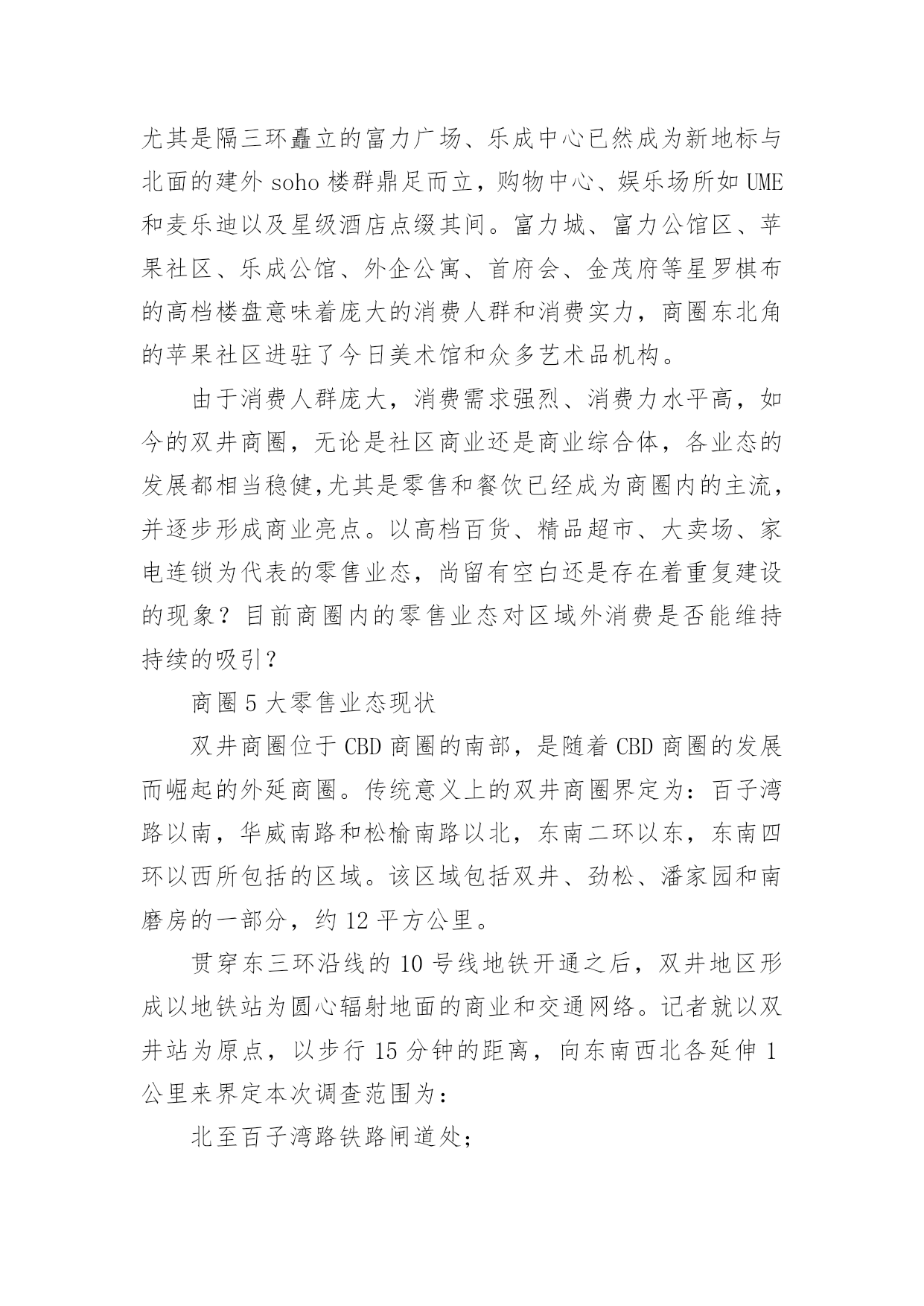 北京双井商圈商业的调查报告北京双井商圈商业的调查报告新地标的前世今生坐落在北京东三环上紧邻国贸的双井地区,是因CBD商圈的扩张而崛起的外延商圈——向北一公里既是CBD核心地标国贸,南面毗邻上世纪八十年代初建成的北京老牌纯居住型社区——劲松,其得天独厚的地理优势而受到商业地产的青睐,日益成为一个频繁见诸于媒体和广告的地标商圈。在2002年以前,双井地区是集合了北京齿轮总厂、北京重型汽车制造厂、北京建筑机械厂、北京重型机械厂等工厂的重工业工厂区。2002年,富力地产投资32亿元拿下了广渠门外东五厂地块建设北京富力城,这在当时是建国后公开招标的最大地块。随后双井地区的价值逐渐为房地产界所重视,从广渠门、双井一直延伸到东四环大郊亭桥一线,陆续开发了富力城、富力公馆区、九龙花园、苹果社区、乐成公馆、外企公寓、百环家园、广渠家园、金港国际、珠江帝景等新楼盘,尤其是贯穿东三环沿线的10号线地铁在2008年开通,结合本就理想的地面公交体系,形成了换乘便利四通八达的交通网络,推动双井地区商务生活、休闲娱乐随之升级,对区域外的消费形成了巨大吸引。十年华丽蜕变之后的双井地区,云集着富力中心、富力双子座、东环国际大厦、乐成中心、优士阁等甲级写字楼,尤其是隔三环矗立的富力广场、乐成中心已然成为新地标与北面的建外soho楼群鼎足而立,购物中心、娱乐场所如UME和麦乐迪以及星级酒店点缀其间。富力城、富力公馆区、苹果社区、乐成公馆、外企公寓、首府会、金茂府等星罗棋布的高档楼盘意味着庞大的消费人群和消费实力,商圈东北角的苹果社区进驻了今日美术馆和众多艺术品机构。由于消费人群庞大,消费需求强烈、消费力水平高,如今的双井商圈,无论是社区商业还是商业综合体,各业态的发展都相当稳健,尤其是零售和餐饮已经成为商圈内的主流,并逐步形成商业亮点。以高档百货、精品超市、大卖场、家电连锁为代表的零售业态,尚留有空白还是存在着重复建设的现象?目前商圈内的零售业态对区域外消费是否能维持持续的吸引?商圈5大零售业态现状双井商圈位于CBD商圈的南部,是随着CBD商圈的发展而崛起的外延商圈。传统意义上的双井商圈界定为:百子湾路以南,华威南路和松榆南路以北,东南二环以东,东南四环以西所包括的区域。该区域包括双井、劲松、潘家园和南磨房的一部分,约12平方公里。贯穿东三环沿线的10号线地铁开通之后,双井地区形成以地铁站为圆心辐射地面的商业和交通网络。记者就以双井站为原点,以步行15分钟的距离,向东南西北各延伸1公里来界定本次调查范围为:北至百子湾路铁路闸道处;南至八棵杨中街(与10号线地铁终点站劲松站的中线);西至广渠门外大街富力公馆区(未来7号线地铁站);东至九龙山(2.95,0.03,1.03%)(西大望与广渠路交界路口)。在此区域内的地产项目和零售业态(家电连锁、百货、超市卖场、便利店等)包括:从调查可以看出,作为住宅与商务混搭的双井地区,配套设施已经完备,从最早的餐饮、家电、超市等瞄准居家需求而形成的社区商业形态,到如今鳞次栉比的写字楼和服务于更多更广泛人群的大型购物广场、酒店、文化娱乐设施。(一)高档百货“双城记”随着分别坐落于三环路两侧富力广场购物中心和乐成购物中心的全面运营,商圈内高档百货业态的环境和品质得到了显著提升。以富力广场为例,ZARA、C&A等服装类快时尚、家电、家具等专卖店和全城热恋、施华洛世奇、CKJ、G-STAR、MassimoDutti、港丽餐厅等时尚知名品牌的进驻,拉动广场近年销售业绩迅速增长。“环境很好,很敞亮,牌子多,逛街、吃饭、看电影,还是蛮方便的。”家住附近的李女士对记者说。(二)超市卖场差异化本次调查数据显示,目前双井商圈拥有超市大卖场2家,分别是营业面积12000平方米以上、地理位置明显,拥有大型停车场的家乐福双井店和与地铁站地下贯通的世纪联华双井店;此外还有富力blt、乐成BHG这样的精品超市,和屈臣氏、万宁等特色超市作为与大卖场差异化的补充。记者在工作日晚7时左右走访家乐福双井店,此时店内客流仍然较密集,生鲜、奶制品的促销也很有吸引力。家乐福收银员小李表示:在这家店经常能碰到外国人。“他们买的都是生活用品,都是住在附近的人,可能就在双井附近上班吧。”来自上海的世纪联华超市面临着两站地之外的外资零售巨头家乐福超市的竞争。事实上,世纪联华在超市行业中并无明显竞争优势。记者随机采访附近写字楼上班的王小姐,“去的次数不多,收银台开的太少,排队时间长。平时都在离写字楼更近的7-11买东西,去富力广场逛街、吃饭。”。(三)家电连锁抢席位比较引人注意的是,在双井地铁站到广渠路九龙山大约1平方公里的范围,国内知名的家电连锁企业内密集开设门店多达5家,包括:大中电器双井店、大中电器广渠路店、苏宁电器[微博](6.19,-0.03,-0.48%)西大望