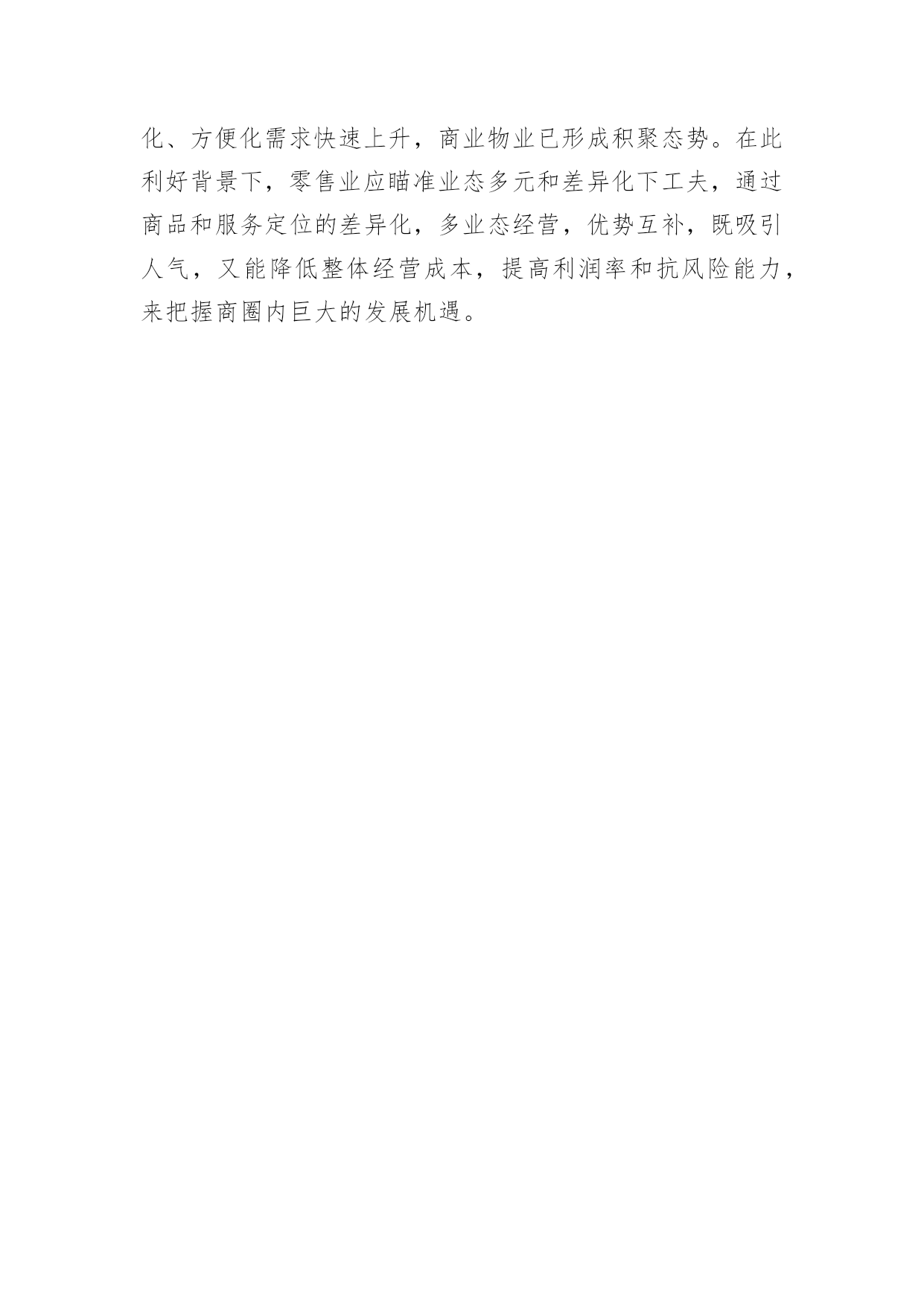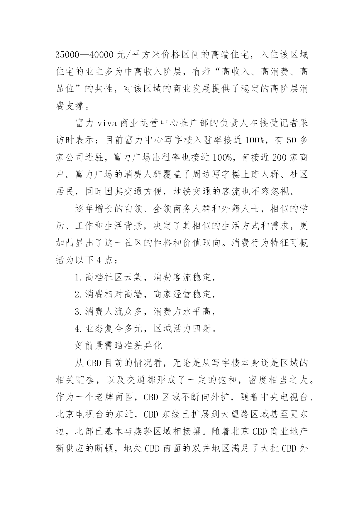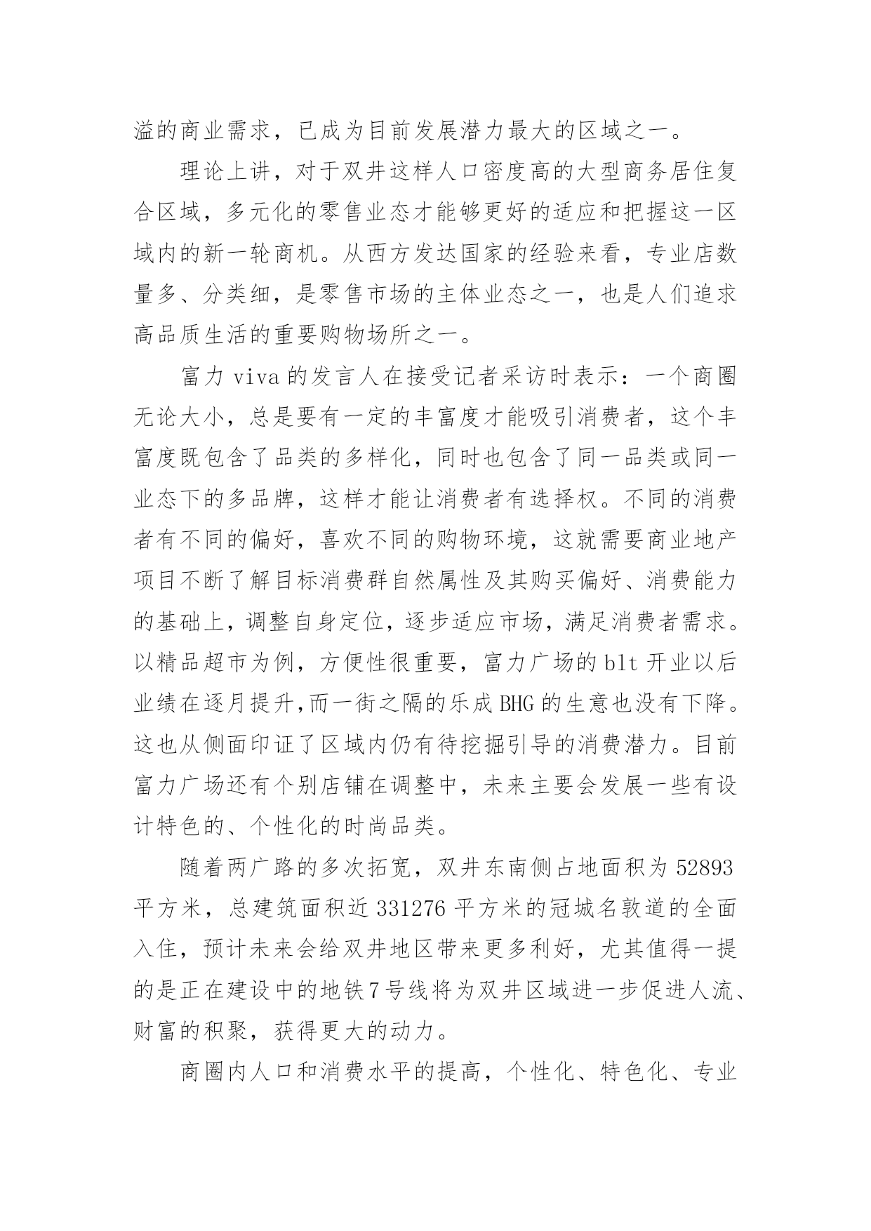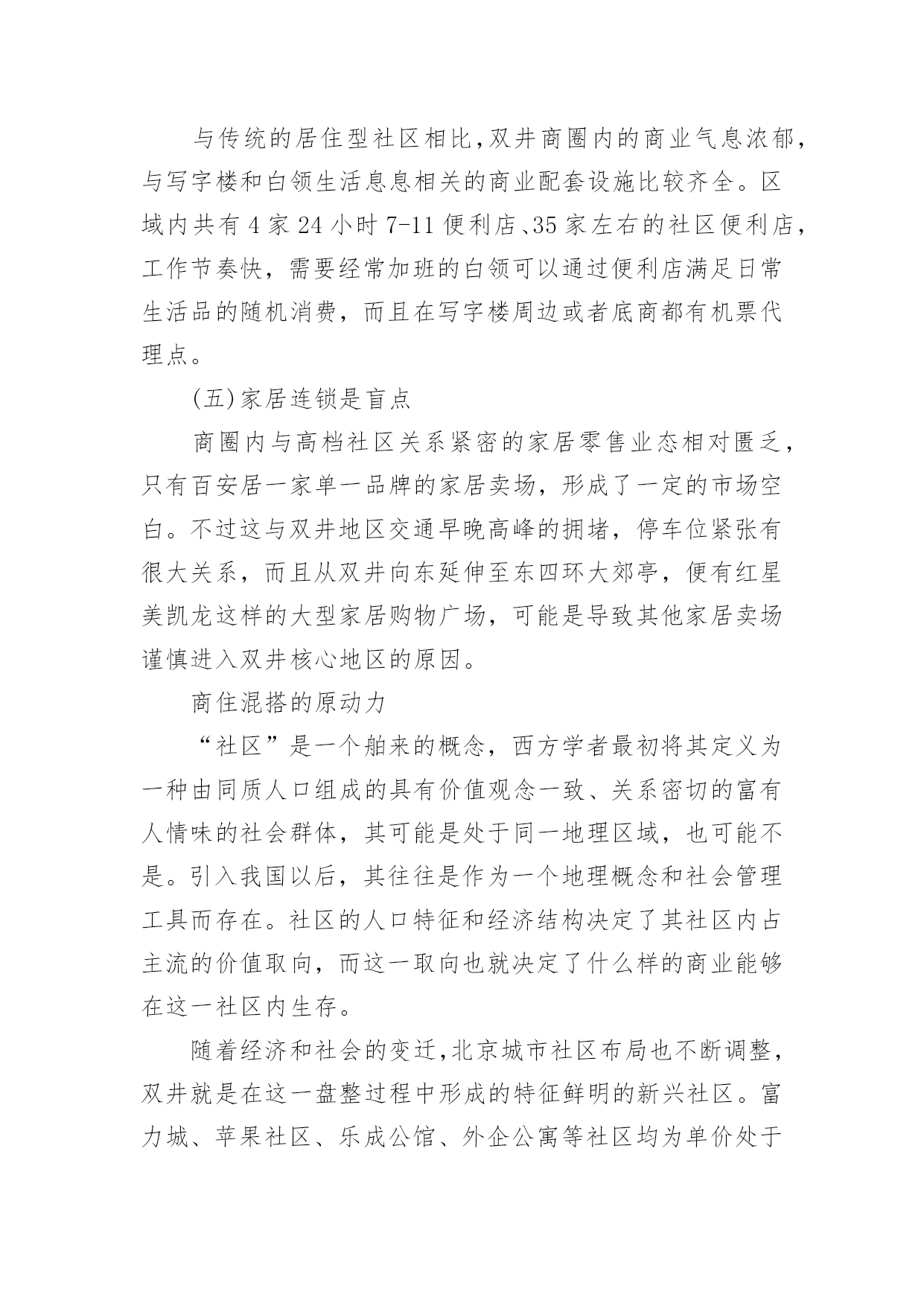 北京双井商圈商业的调查报告北京双井商圈商业的调查报告新地标的前世今生坐落在北京东三环上紧邻国贸的双井地区,是因CBD商圈的扩张而崛起的外延商圈——向北一公里既是CBD核心地标国贸,南面毗邻上世纪八十年代初建成的北京老牌纯居住型社区——劲松,其得天独厚的地理优势而受到商业地产的青睐,日益成为一个频繁见诸于媒体和广告的地标商圈。在2002年以前,双井地区是集合了北京齿轮总厂、北京重型汽车制造厂、北京建筑机械厂、北京重型机械厂等工厂的重工业工厂区。2002年,富力地产投资32亿元拿下了广渠门外东五厂地块建设北京富力城,这在当时是建国后公开招标的最大地块。随后双井地区的价值逐渐为房地产界所重视,从广渠门、双井一直延伸到东四环大郊亭桥一线,陆续开发了富力城、富力公馆区、九龙花园、苹果社区、乐成公馆、外企公寓、百环家园、广渠家园、金港国际、珠江帝景等新楼盘,尤其是贯穿东三环沿线的10号线地铁在2008年开通,结合本就理想的地面公交体系,形成了换乘便利四通八达的交通网络,推动双井地区商务生活、休闲娱乐随之升级,对区域外的消费形成了巨大吸引。十年华丽蜕变之后的双井地区,云集着富力中心、富力双子座、东环国际大厦、乐成中心、优士阁等甲级写字楼,尤其是隔三环矗立的富力广场、乐成中心已然成为新地标与北面的建外soho楼群鼎足而立,购物中心、娱乐场所如UME和麦乐迪以及星级酒店点缀其间。富力城、富力公馆区、苹果社区、乐成公馆、外企公寓、首府会、金茂府等星罗棋布的高档楼盘意味着庞大的消费人群和消费实力,商圈东北角的苹果社区进驻了今日美术馆和众多艺术品机构。由于消费人群庞大,消费需求强烈、消费力水平高,如今的双井商圈,无论是社区商业还是商业综合体,各业态的发展都相当稳健,尤其是零售和餐饮已经成为商圈内的主流,并逐步形成商业亮点。以高档百货、精品超市、大卖场、家电连锁为代表的零售业态,尚留有空白还是存在着重复建设的现象?目前商圈内的零售业态对区域外消费是否能维持持续的吸引?商圈5大零售业态现状双井商圈位于CBD商圈的南部,是随着CBD商圈的发展而崛起的外延商圈。传统意义上的双井商圈界定为:百子湾路以南,华威南路和松榆南路以北,东南二环以东,东南四环以西所包括的区域。该区域包括双井、劲松、潘家园和南磨房的一部分,约12平方公里。贯穿东三环沿线的10号线地铁开通之后,双井地区形成以地铁站为圆心辐射地面的商业和交通网络。记者就以双井站为原点,以步行15分钟的距离,向东南西北各延伸1公里来界定本次调查范围为:北至百子湾路铁路闸道处;南至八棵杨中街(与10号线地铁终点站劲松站的中线);西至广渠门外大街富力公馆区(未来7号线地铁站);东至九龙山(2.95,0.03,1.03%)(西大望与广渠路交界路口)。在此区域内的地产项目和零售业态(家电连锁、百货、超市卖场、便利店等)包括:从调查可以看出,作为住宅与商务混搭的双井地区,配套设施已经完备,从最早的餐饮、家电、超市等瞄准居家需求而形成的社区商业形态,到如今鳞次栉比的写字楼和服务于更多更广泛人群的大型购物广场、酒店、文化娱乐设施。(一)高档百货“双城记”随着分别坐落于三环路两侧富力广场购物中心和乐成购物中心的全面运营,商圈内高档百货业态的环境和品质得到了显著提升。以富力广场为例,ZARA、C&A等服装类快时尚、家电、家具等专卖店和全城热恋、施华洛世奇、CKJ、G-STAR、MassimoDutti、港丽餐厅等时尚知名品牌的进驻,拉动广场近年销售业绩迅速增长。“环境很好,很敞亮,牌子多,逛街、吃饭、看电影,还是蛮方便的。”家住附近的李女士对记者说。(二)超市卖场差异化本次调查数据显示,目前双井商圈拥有超市大卖场2家,分别是营业面积12000平方米以上、地理位置明显,拥有大型停车场的家乐福双井店和与地铁站地下贯通的世纪联华双井店;此外还有富力blt、乐成BHG这样的精品超市,和屈臣氏、万宁等特色超市作为与大卖场差异化的补充。记者在工作日晚7时左右走访家乐福双井店,此时店内客流仍然较密集,生鲜、奶制品的促销也很有吸引力。家乐福收银员小李表示:在这家店经常能碰到外国人。“他们买的都是生活用品,都是住在附近的人,可能就在双井附近上班吧。”来自上海的世纪联华超市面临着两站地之外的外资零售巨头家乐福超市的竞争。事实上,世纪联华在超市行业中并无明显竞争优势。记者随机采访附近写字楼上班的王小姐,“去的次数不多,收银台开的太少,排队时间长。平时都在离写字楼更近的7-11买东西,去富力广场逛街、吃饭。”。(三)家电连锁抢席位比较引人注意的是,在双井地铁站到广渠路九龙山大约1平方公里的范围,国内知名的家电连锁企业内密集开设门店多达5家,包括:大中电器双井店、大中电器广渠路店、苏宁电器[微博](6.19,-0.03,-0.48%)西大望