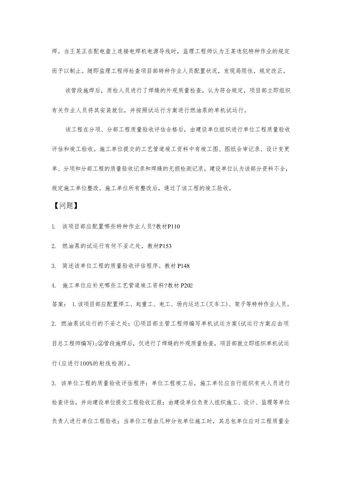 2023年度全国二级建造师执业资格考试《机电工程管理与实务》试卷一、单项选择题(共20题,每题1分。每题的备选项中,只有1个最符合题意)1.在山区的上山索道中,吊运设备多使用()。(教材13页)A.滑移吊装法B.超高空斜承索吊装法C.万能杆件吊装法D.旋转吊装法2.如没有采用合适防护措施,则应立即停止焊接作业的状况是()。(教材18页)A.环境相对湿度达80%B.采用电弧焊焊接,风速抵达6m/sC.采用CO₂气体保护焊,风速抵达2m/sD.天气炎热,阳光下地表温度达38℃3.建筑采暖管道安装工序的对的次序是()21页A.系统清洗→管道系统试验→防腐绝热→竣工验收B.管道系统试验→防腐绝热→系统清洗→竣工验收C.管道系统试验→附件检查→防腐绝热→竣工验收D.防腐绝热→管道系统试验→系统清洗→竣工验收4.如整个建筑物共用一种接地系统,其接地电阻值应满足不同样专业对接地装置接地电阻()的规定。28页A.规范值B.最小值C.平均值D.最大值5.排烟系统的风管板材厚度若设计无规定期,可按()系统风管板厚选择。31页A.负压B.低压C.中压D.高压6.工程竣工后的建筑消防验收,应检查其消防设施配置与否符合()的规定。43页A.已获审核同意的消防设计B.工程可投入使用或生产C.建筑防火等级原则D.公安消防部门管理7.设备安装中,将其纵向中心线和横向中心线与基准线的偏差控制在设计容许范围内的调整称为()。50页A.找平B.找标高C.找中心D.找正8.按静置设备的设计压力分类,中压设备的压力范围是()。64页A.0.1MPa≤p<1.6MPaB.1.6MPa<p≤10MPaC.1.6MPa≤p<10MpaD.10MPa<p≤100MPa9.钢构造的一般安装次序应为()。68页A.构件检查→支撑安装一→维护构造安装→钢柱安装B.钢柱安装→构件检查→支撑安装→维护构造安装C.构件检查→钢柱安装→支撑安装一→维护构造安装D.钢柱安装→维护构造安装一→支撑安装一→构件检查10.自动化仪表工程施工中,综合控制系统试验的紧后工序是()。71页A.保运B.竣工资料编制C.交工D.回路试验11.以液体为介质的仪表管道的压力试验,试验压力应为()倍的设计压力。74页A.1.15B.1.20C.1.50D.1.6012.工业管道施工中,系统清洗工序的紧前工序是()。75页A.管道系统检查B.管道系统试验C.气体泄漏试验D.防腐绝热13.管道系统气压试验的试验温度严禁靠近金属的()转变温度。78页A.脆性B.塑性C.延展性D.韧性14.金属表面预处理质量等级有四级的措施是()除锈。80页A.手工B.喷射C.火焰D.化学15.动态式炉窑砌筑必须在()合格后方可进行。86页A.炉窑壳(筒)体安装验收B.炉窑壳(筒)体对接焊缝经无损检测C.炉窑单机无负荷试运转验收D.炉窑无负荷联动试运转验收16.规范规定,炉窑耐火砖的加工砖厚度不得不不小于原砖厚度的()。88页A.1/3B.1/2C.2/3D.3/417.根据《计量器具分类管理措施》,计量器具按范围划分为A、B、C三类,属于B类的是()。228页A.兆欧表B.超声波测厚仪C.钢直尺D.5m卷尺18.机电工程临时用电设备总容量在()及其以上者,均应编制临时用电施工组织设计。232页A.20KWB.30KWC.40KWD.50KW19.不属于机电工程注册建造师执业工程范围的是()。235页A.水电工程B.钢构造工程C.送变电工程D.管道安装工程20.某送变电工程的单项协议总价为()万元,该工程为中型项目。248页A.760B.810C.950D.1100一、单项选择题答案1.B2.C3.B4.B5.D6.A7.D8.C9.C10.D11.C12.D13.A14.B15.C16.C17.B18.D19.A20.A二、多选题(共10题,每题2分。每题的备选项中,有2个或2个以上符合题意,至少有1个错项。错选,本题不得分;少选,所选的每个选项得0.5分)21.有关注册建造师施工管理签章文献的填写规定,体现对的的有()。250页A.表格中施工单位可填写简称B.表中若实际工程没有其中一项时,可注明“工程无此项”C.审查、审核、验收意见或检查成果,必须用明确的定性文字写明基本状况和结论D.分包企业签订的质量合格文献,应由分包企业的注册建造师签章E.表格中凡规定签章