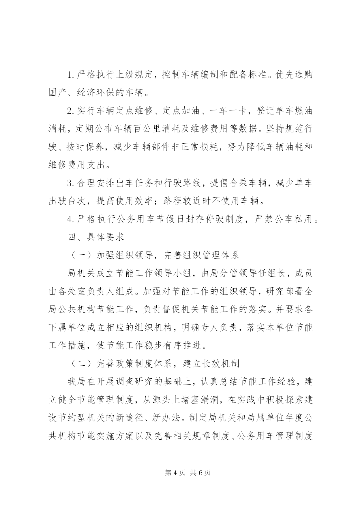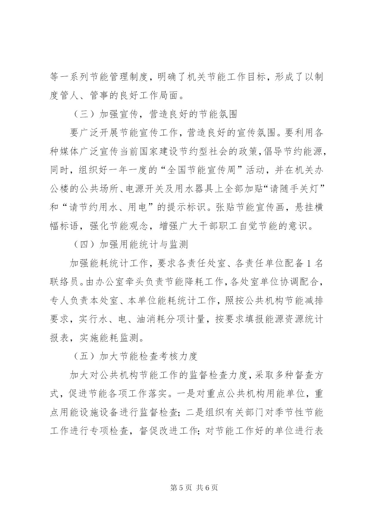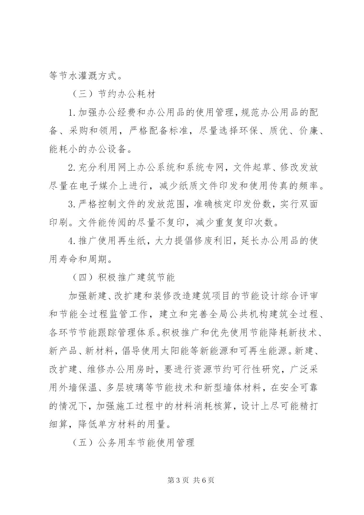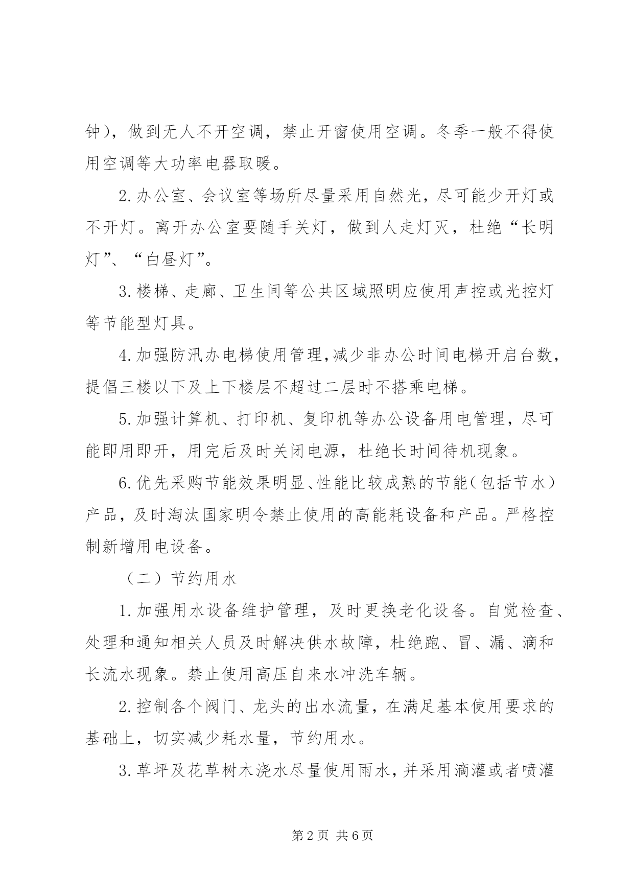第PAGE\*Arabic\*MERGEFORMAT6页共NUMPAGES\*MERGEFORMAT6页水利局公共机构节能方案为认真贯彻落实国务院颁布的《节约能源法》、《公共机构节能条例》和省、市有关节能工作会议精神,为推动我局节能工作进一步深入开展,提高公共机构能源资源利用效率,降低公共机构运行成本,结合我局实际,将制定2012年度公共机构节能减排实施方案。一、指导思想以邓小平理论和“三个代表”重要思想为指导,深入贯彻落实科学发展观,按照中央、国务院关于建设资源节约型、环境友好型,以贯彻实施《公共机构节能条例》为主线,以提高公共能源利用率为核心,以突出抓好节水、节电、节油为重点,引导全局干部职工自觉树立节能意识,低碳消费、低碳办公理念。二、主要目标以2011年为基数,到2012年底现实现节水、节电、节能的分别下降5%,单位建筑能耗和人均能耗分别下降低5%以上,通过技术改造、行为约束、强化管理等办法,有效地提高公共机构能效率。三、保障措施(一)节约用电1.合理设置会议室空调温度,夏季室内空调温度设置不低于25摄氏度,工作人员根据会议时间开启空调(会议前后15分钟),做到无人不开空调,禁止开窗使用空调。冬季一般不得使用空调等大功率电器取暖。2.办公室、会议室等场所尽量采用自然光,尽可能少开灯或不开灯。离开办公室要随手关灯,做到人走灯灭,杜绝“长明灯”、“白昼灯”。3.楼梯、走廊、卫生间等公共区域照明应使用声控或光控灯等节能型灯具。4.加强防汛办电梯使用管理,减少非办公时间电梯开启台数,提倡三楼以下及上下楼层不超过二层时不搭乘电梯。5.加强计算机、打印机、复印机等办公设备用电管理,尽可能即用即开,用完后及时关闭电源,杜绝长时间待机现象。6.优先采购节能效果明显、性能比较成熟的节能(包括节水)产品,及时淘汰国家明令禁止使用的高能耗设备和产品。严格控制新增用电设备。(二)节约用水1.加强用水设备维护管理,及时更换老化设备。自觉检查、处理和通知相关人员及时解决供水故障,杜绝跑、冒、漏、滴和长流水现象。禁止使用高压自来水冲洗车辆。2.控制各个阀门、龙头的出水流量,在满足基本使用要求的基础上,切实减少耗水量,节约用水。3.草坪及花草树木浇水尽量使用雨水,并采用滴灌或者喷灌等节水灌溉方式。(三)节约办公耗材1.加强办公经费和办公用品的使用管理,规范办公用品的配备、采购和领用,严格配备标准,尽量选择环保、质优、价廉、能耗小的办公设备。2.充分利用网上办公系统和系统专网,文件起草、修改发放尽量在电子媒介上进行,减少纸质文件印发和使用传真的频率。3.严格控制文件的发放范围,准确核定印发份数,实行双面印刷。文件能传阅的尽量不复印,减少重复复印次数。4.推广使用再生纸,大力提倡修废利旧,延长办公用品的使用寿命和周期。(四)积极推广建筑节能加强新建、改扩建和装修改造建筑项目的节能设计综合评审和节能全过程监管工作,建立和完善全局公共机构建筑全过程、各环节节能跟踪管理体系。积极推广和优先使用节能降耗新技术、新产品、新材料,倡导使用太阳能等新能源和可再生能源。新建、改扩建、维修办公用房时,要进行资源节约可行性研究,广泛采用外墙保温、多层玻璃等节能技术和新型墙体材料,在安全可靠的情况下,加强施工过程中的材料消耗核算,设计上尽可能精打细算,降低单方材料的用量。(五)公务用车节能使用管理1.严格执行上级规定,控制车辆编制和配备标准。优先选购国产、经济环保的车辆。2.实行车辆定点维修、定点加油、一车一卡,登记单车燃油消耗,定期公布车辆百公里消耗及维修费用等数据。坚持规范行驶、按时保养,减少车辆部件非正常损耗,努力降低车辆油耗和维修费用支出。3.合理安排出车任务和行驶路线,提倡合乘车辆,减少单车出驶台次,提高使用效率;路程较近时不使用车辆。4.严格执行公务用车节假日封存停驶制度,严禁公车私用。四、具体要求(一)加强组织领导,完善组织管理体系局机关成立节能工作领导小组,由局分管领导任组长,成员由各处室负责人组成。加强对节能工作的组织领导,研究部署全局公共机构节能工作,负责督促机关节能工作的落实。并要求各下属单位成立相应的组织机构,明确专人负责,落实本单位节能工作措施,使节能工作稳步有序推进。(二)完善政策制度体系,建立长效机制我局在开展调查研究的基础上,认真总结节能工作经验,建立健全节能管理制度,从源头上堵塞漏洞,在实践中积极探索建设节约型机关的新途径、新办法。制定局机关和局属单位年度公共机构节能实施方案以及完善相关规章制度、公务用车管理制度等一系列节能管理制度,明确了机关节能工作目标,形成了以制度管人、管事的良好工作局面。(三)加强宣传,营造良好的节能氛围要广泛开展节能宣传工作,营造良好的宣传氛围。要利用各种媒体广泛宣传当前国家建设节约型社会的