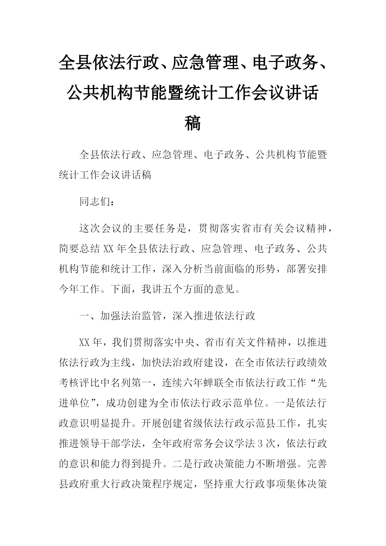 全县依法行政、应急管理、电子政务、公共机构节能暨统计工作会议讲话稿-.docx