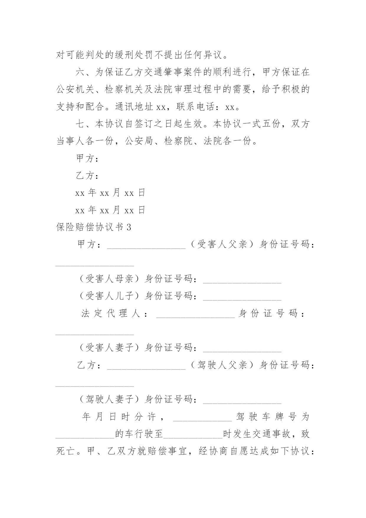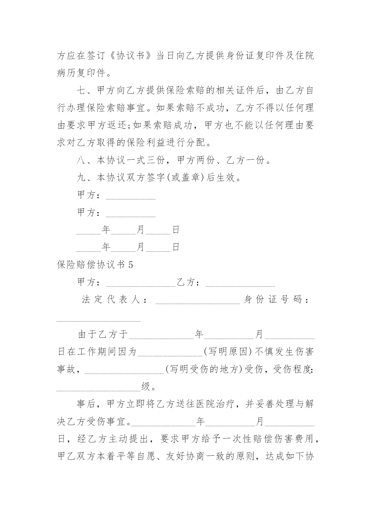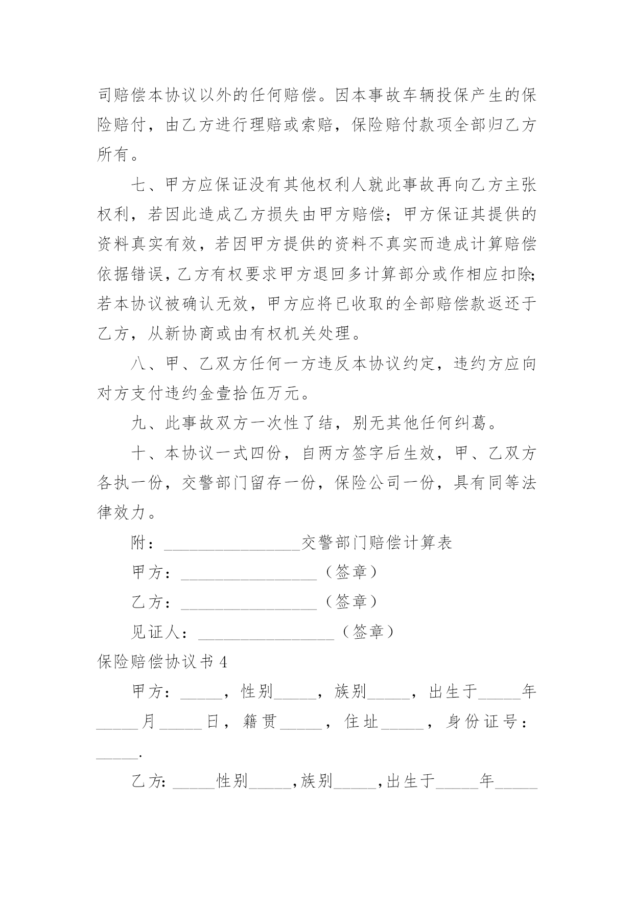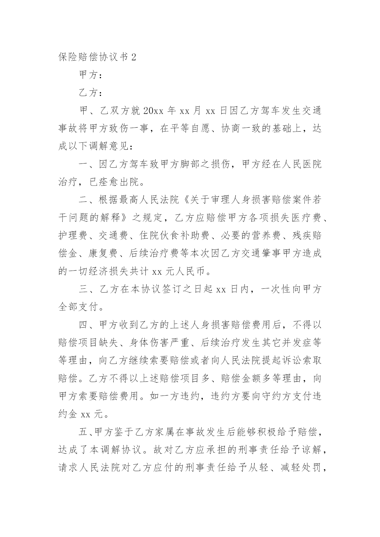 保险赔偿协议书保险赔偿协议书在学习、工作生活中,协议使用的频率越来越高,协议能够成为双方当事人的合法依据。协议到底怎么写才合适呢?以下是小编整理的保险赔偿协议书,供大家参考借鉴,希望可以帮助到有需要的朋友。保险赔偿协议书1甲方(肇事方):________________乙方(受害方):________________丙方(受害方):________________丁方(保险公司):________________一、交通事故基本情况1、事故经过:_________________年_月_日,发生了______驾驶______车辆在________________路段和______驾驶______(车牌号为______)相撞致________________的道路交通事故。后__________交警队赶赴现场处理,制作了事故现场图,扣留了双方车辆以备进一步调查。2、______交警队对该事故的认定情况:_________________交警队在查明事实的基础上,作出如下认定。_______________违反《中华人民共和国道路交通安全法》第_____条第_____款之规定,是发生事故的主要原因,应承担此事故的主要责任;______违反《中华人民共和国道路交通安全法》第_____条第_____款之规定,是发生事故的次要原因,应负此事故的次要责任;乘车人______无责任。二、甲乙丙丁四方根据交警队的事故认定,在交警队的主持下,按照互谅互让的原则达成如下调解交通事故协议:________________1、经双方确认,本次事故造成双方财产损失和人员伤残所需费用情况如下:________________(1)甲方车辆维修费及其他杂费______元(人民币,以下同);______受伤住院治疗医药费、误工费、护理费、伙食补助费、交通费、住宿费、伤残补偿金、后续治疗费等共计______元。(2)乙方车辆维修费及其他杂费______元;______受伤住院治疗医药费、误工费、护理费、交通费、住宿费、伙食补助费、伤残补偿金、后续治疗费等共计______元。(3)丙方(乘车人)______受伤住院治疗医药费、误工费、护理费、交通费、住宿费、伙食补助费、伤残赔偿金、后续治疗费等共计______元。(4)以上费用共计______元。2、经双方协商,由甲方承担上述费用的60%,计______元;乙方承担上述费用的40%,计______元;甲方在扣除自身损失费用外,尚需支付乙方______元;支付丙方______元。3、丁方需承担甲方所需赔付费用的80%,承担乙方所需赔付费用费用的75%,丁方照上述标准各自对甲乙双方进行赔付,并代甲方支付须赔付给乙方和丙方的部分。4、以上费用赔付和结算自本协议签订之日起即时结算付清。5、甲乙丙三方需积极配合丁方办理保险赔付事宜,及时提供丁方所需要的交通事故认定书、医药费用发票等资料。5、本协议履行完毕后,除本协议另有规定外,甲乙丙三方的赔付责任即算完毕,其中任何一方不得再以任何理由对其他任何一方提出增加赔付及其他要求。6、如本案的受伤者确因事故引起的病情进一步恶化,治疗费用大大超过本协议预计,超出预计1万元以内,由伤者自行负责,1万元以上费用由伤者出具省级医院证明(包括医疗诊断书、医药费用发票、伤残鉴定报告等)及其他可证明该病情恶化是由该事故引发的`证据,可另行找甲乙责任方赔付,由甲乙方按照本协议确定的赔付责任标准(即甲方60%、乙方40%)分担赔付。三、本协议自协议各方签字盖章之日起生效。四、协议各方如在履行本协议中发生纠纷,可先协商,协商不成,可提交_____________仲裁委员会仲裁。五、本交通事故协议书范文共四页,一式五份,协议各方各一份,_______________交警队一份存档备查。甲方:________________乙方:_____________________年_____月_____日_____年_____月_____日丙方:_____________丁方(公章):__________________年_____月_____日_____年_____月_____日保险赔偿协议书2甲方:乙方:甲、乙双方就20xx年xx月xx日因乙方驾车发生交通事故将甲方致伤一事,在平等自愿、协商一致的基础上,达成以下调解意见:一、因乙方驾车致甲方脚部之损伤,甲方经在人民医院治疗,已痊愈出院。二、根据最高人民法院《关于审理人身损害赔偿案件若干问题的解释》之规定,乙方应赔偿甲方各项损失医疗费、护理费、交通费、住院伙食补助费、必要的营养费、残疾赔偿金、康复费、后续治疗费等本次因乙方交通肇事甲方造成的一切经济损失共计xx元人民币。三、乙方在本协议签订之日起xx日内,一次性向甲方全部支付。四、甲方收到乙方的上述人身损害