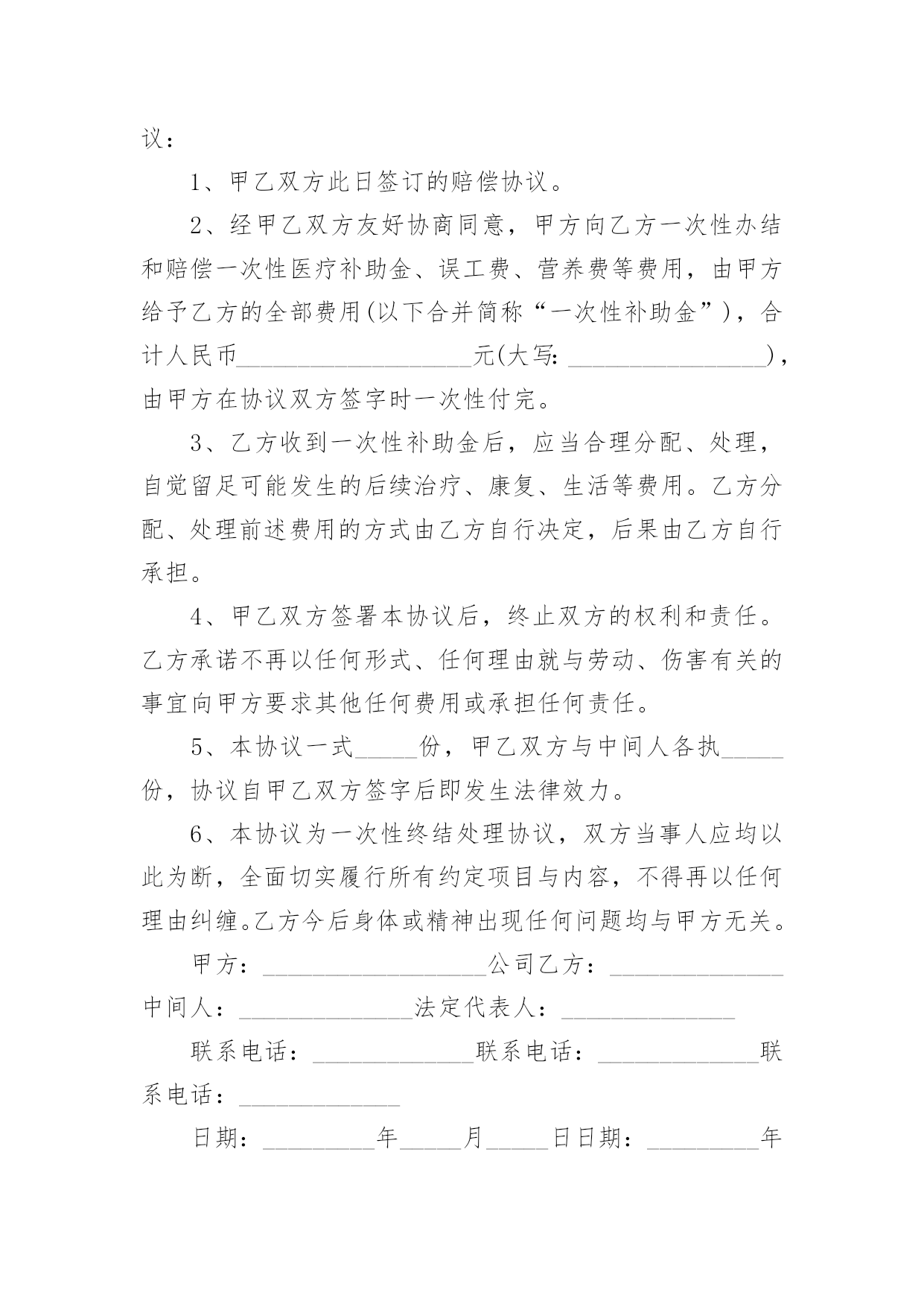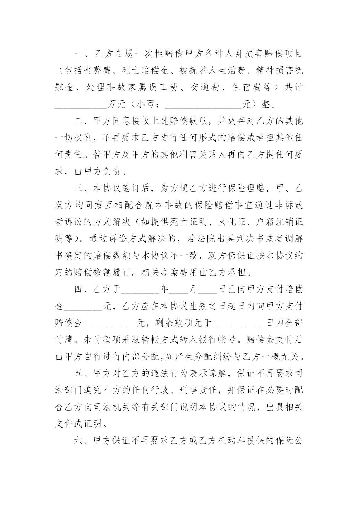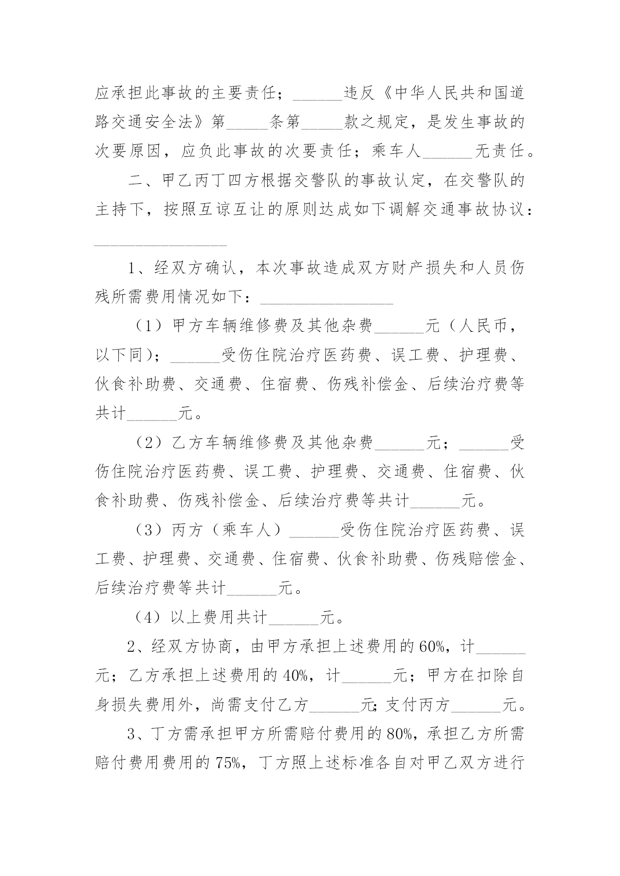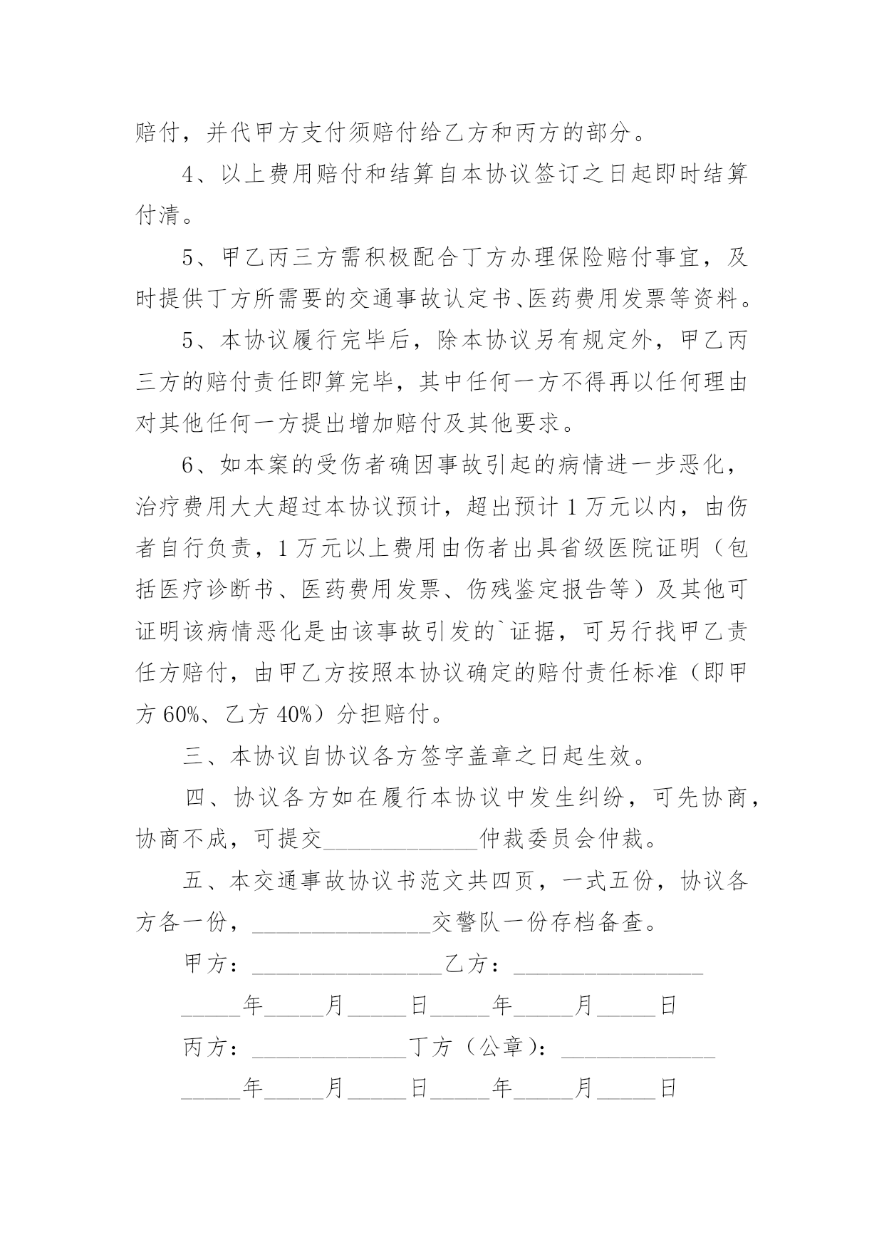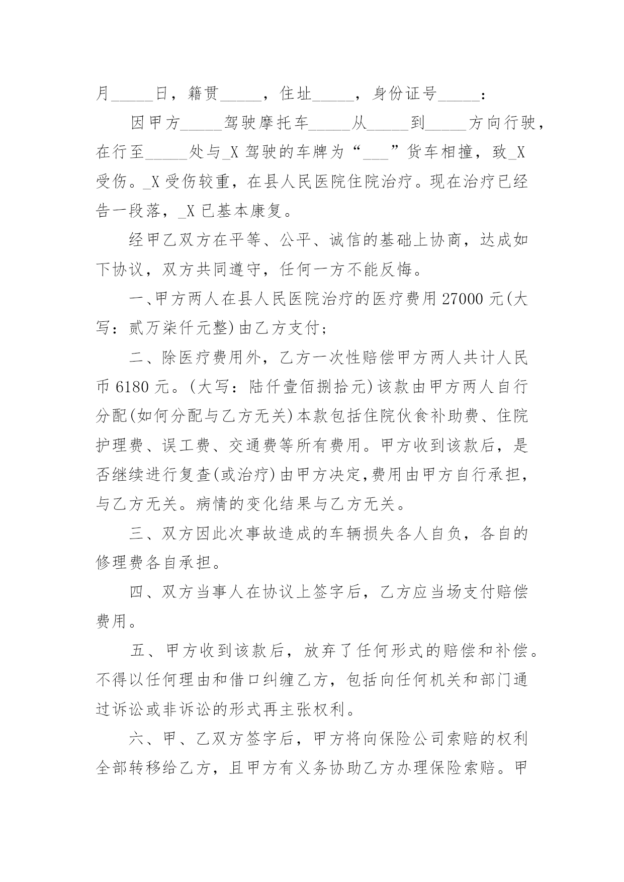 保险赔偿协议书保险赔偿协议书在学习、工作生活中,协议使用的频率越来越高,协议能够成为双方当事人的合法依据。协议到底怎么写才合适呢?以下是小编整理的保险赔偿协议书,供大家参考借鉴,希望可以帮助到有需要的朋友。保险赔偿协议书1甲方(肇事方):________________乙方(受害方):________________丙方(受害方):________________丁方(保险公司):________________一、交通事故基本情况1、事故经过:_________________年_月_日,发生了______驾驶______车辆在________________路段和______驾驶______(车牌号为______)相撞致________________的道路交通事故。后__________交警队赶赴现场处理,制作了事故现场图,扣留了双方车辆以备进一步调查。2、______交警队对该事故的认定情况:_________________交警队在查明事实的基础上,作出如下认定。_______________违反《中华人民共和国道路交通安全法》第_____条第_____款之规定,是发生事故的主要原因,应承担此事故的主要责任;______违反《中华人民共和国道路交通安全法》第_____条第_____款之规定,是发生事故的次要原因,应负此事故的次要责任;乘车人______无责任。二、甲乙丙丁四方根据交警队的事故认定,在交警队的主持下,按照互谅互让的原则达成如下调解交通事故协议:________________1、经双方确认,本次事故造成双方财产损失和人员伤残所需费用情况如下:________________(1)甲方车辆维修费及其他杂费______元(人民币,以下同);______受伤住院治疗医药费、误工费、护理费、伙食补助费、交通费、住宿费、伤残补偿金、后续治疗费等共计______元。(2)乙方车辆维修费及其他杂费______元;______受伤住院治疗医药费、误工费、护理费、交通费、住宿费、伙食补助费、伤残补偿金、后续治疗费等共计______元。(3)丙方(乘车人)______受伤住院治疗医药费、误工费、护理费、交通费、住宿费、伙食补助费、伤残赔偿金、后续治疗费等共计______元。(4)以上费用共计______元。2、经双方协商,由甲方承担上述费用的60%,计______元;乙方承担上述费用的40%,计______元;甲方在扣除自身损失费用外,尚需支付乙方______元;支付丙方______元。3、丁方需承担甲方所需赔付费用的80%,承担乙方所需赔付费用费用的75%,丁方照上述标准各自对甲乙双方进行赔付,并代甲方支付须赔付给乙方和丙方的部分。4、以上费用赔付和结算自本协议签订之日起即时结算付清。5、甲乙丙三方需积极配合丁方办理保险赔付事宜,及时提供丁方所需要的交通事故认定书、医药费用发票等资料。5、本协议履行完毕后,除本协议另有规定外,甲乙丙三方的赔付责任即算完毕,其中任何一方不得再以任何理由对其他任何一方提出增加赔付及其他要求。6、如本案的受伤者确因事故引起的病情进一步恶化,治疗费用大大超过本协议预计,超出预计1万元以内,由伤者自行负责,1万元以上费用由伤者出具省级医院证明(包括医疗诊断书、医药费用发票、伤残鉴定报告等)及其他可证明该病情恶化是由该事故引发的`证据,可另行找甲乙责任方赔付,由甲乙方按照本协议确定的赔付责任标准(即甲方60%、乙方40%)分担赔付。三、本协议自协议各方签字盖章之日起生效。四、协议各方如在履行本协议中发生纠纷,可先协商,协商不成,可提交_____________仲裁委员会仲裁。五、本交通事故协议书范文共四页,一式五份,协议各方各一份,_______________交警队一份存档备查。甲方:________________乙方:_____________________年_____月_____日_____年_____月_____日丙方:_____________丁方(公章):__________________年_____月_____日_____年_____月_____日保险赔偿协议书2甲方:乙方:甲、乙双方就20xx年xx月xx日因乙方驾车发生交通事故将甲方致伤一事,在平等自愿、协商一致的基础上,达成以下调解意见:一、因乙方驾车致甲方脚部之损伤,甲方经在人民医院治疗,已痊愈出院。二、根据最高人民法院《关于审理人身损害赔偿案件若干问题的解释》之规定,乙方应赔偿甲方各项损失医疗费、护理费、交通费、住院伙食补助费、必要的营养费、残疾赔偿金、康复费、后续治疗费等本次因乙方交通肇事甲方造成的一切经济损失共计xx元人民币。三、乙方在本协议签订之日起xx日内,一次性向甲方全部支付。四、甲方收到乙方的上述人身损害