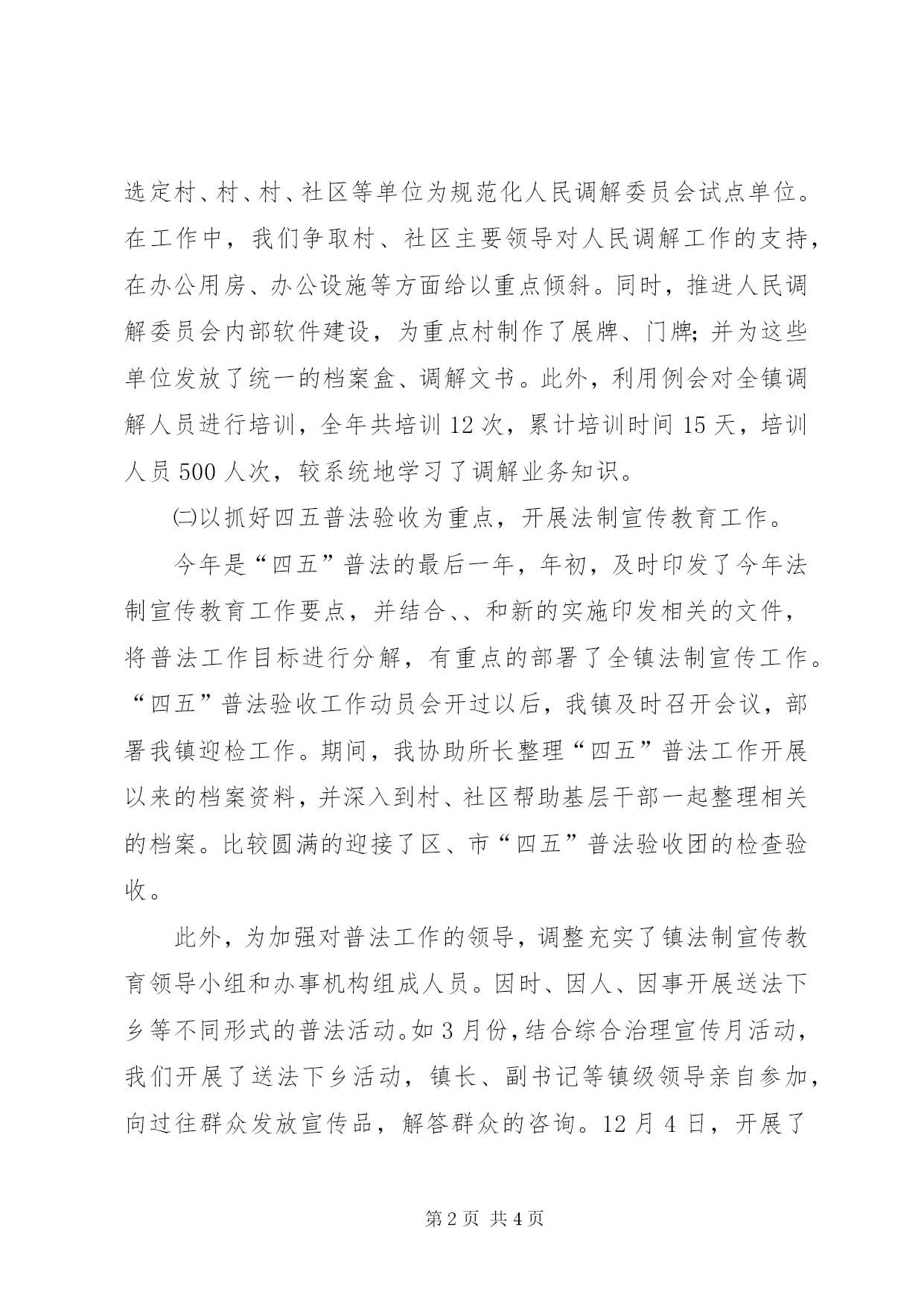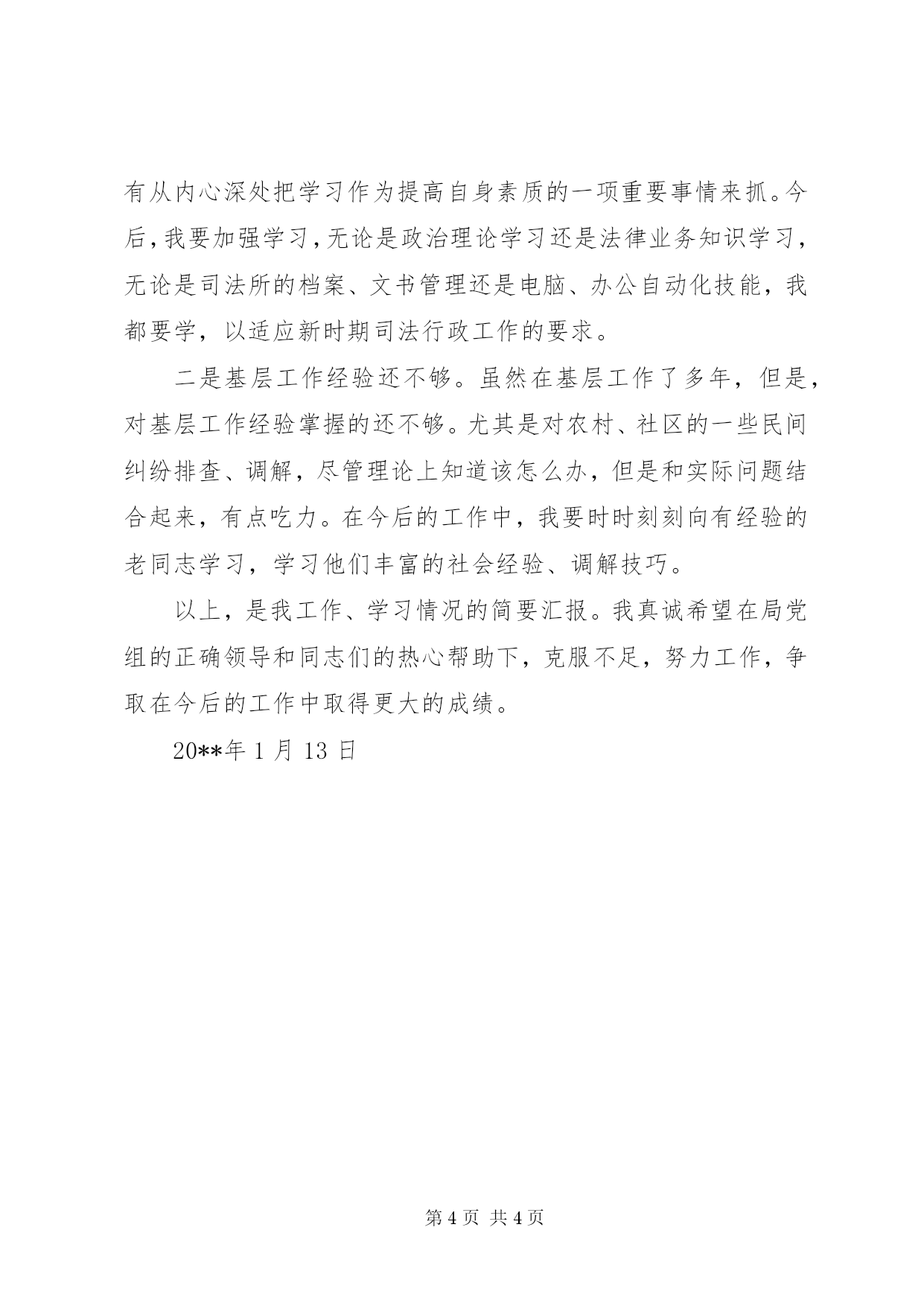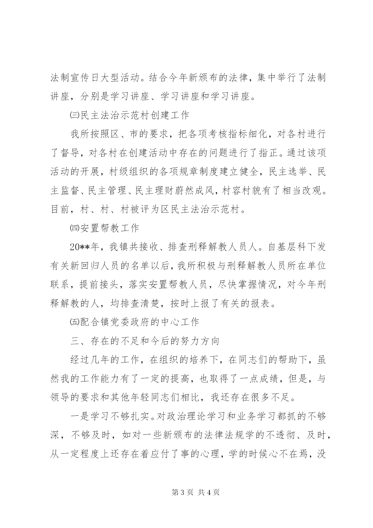 第PAGE\*Arabic\*MERGEFORMAT4页共NUMPAGES\*MERGEFORMAT4页述职报告(司法所副所长)----------彭城司法所刘峰我叫刘峰,男,今年岁,中共党员,现任彭城司法所副所长。自年参加工作以来,我在局党组的正确领导下,积极进取,努力工作,较好的完成了各项司法行政工作。现就近一段时间的工作简要总结如下:一、坚持学习,提高政治业务素质我是参加工作的新同志,属于比较年轻的同志,所以无论在工作经验上还是工作方法上,都还和老同志有一定的差距。自参加工作以来,我就以查找工作上、思想上的不足为重点,认真分析各方面存在的不足,并加以改进。特别是开展保持共产党员先进性教育活动以来,我认真学习了理论文章,按照要求写出了心得体会,对照新时期党员的标准进行了整改。结合今年的“两整一树”活动,我又认真学习了区政法委领导、局领导在动员会议上的讲话,在工作中,力戒“一种歪风十种病”,杜绝“吃、拿、卡、要”等不良行为的发生。通过以上活动的开展,我进一步端正了“立党为公、执政为民”的思想。二、开展各项司法行政工作㈠突出抓好以“两大主体工程”全面推进基层司法所和人民调解委员会工作。按照年初我局关于基层调解委员会规范化建设工作的要求,选定村、村、村、社区等单位为规范化人民调解委员会试点单位。在工作中,我们争取村、社区主要领导对人民调解工作的支持,在办公用房、办公设施等方面给以重点倾斜。同时,推进人民调解委员会内部软件建设,为重点村制作了展牌、门牌;并为这些单位发放了统一的档案盒、调解文书。此外,利用例会对全镇调解人员进行培训,全年共培训12次,累计培训时间15天,培训人员500人次,较系统地学习了调解业务知识。㈡以抓好四五普法验收为重点,开展法制宣传教育工作。今年是“四五”普法的最后一年,年初,及时印发了今年法制宣传教育工作要点,并结合、、和新的实施印发相关的文件,将普法工作目标进行分解,有重点的部署了全镇法制宣传工作。“四五”普法验收工作动员会开过以后,我镇及时召开会议,部署我镇迎检工作。期间,我协助所长整理“四五”普法工作开展以来的档案资料,并深入到村、社区帮助基层干部一起整理相关的档案。比较圆满的迎接了区、市“四五”普法验收团的检查验收。此外,为加强对普法工作的领导,调整充实了镇法制宣传教育领导小组和办事机构组成人员。因时、因人、因事开展送法下乡等不同形式的普法活动。如3月份,结合综合治理宣传月活动,我们开展了送法下乡活动,镇长、副书记等镇级领导亲自参加,向过往群众发放宣传品,解答群众的咨询。12月4日,开展了法制宣传日大型活动。结合今年新颁布的法律,集中举行了法制讲座,分别是学习讲座、学习讲座和学习讲座。㈢民主法治示范村创建工作我所按照区、市的要求,把各项考核指标细化,对各村进行了督导,对各村在创建活动中存在的问题进行了指正。通过该项活动的开展,村级组织的各项规章制度建立健全,民主选举、民主监督、民主管理、民主理财蔚然成风,村容村貌有了相当改观。目前,村、村、村被评为区民主法治示范村。㈣安置帮教工作20**年,我镇共接收、排查刑释解教人员人。自基层科下发有关新回归人员的名单以后,我所积极与刑释解教人员所在单位联系,提前接头,落实安置帮教人员,尽快掌握情况,对今年刑释解教的人,均排查清楚,按时上报了有关的报表。㈤配合镇党委政府的中心工作三、存在的不足和今后的努力方向经过几年的工作,在组织的培养下,在同志们的帮助下,虽然我的工作能力有了一定的提高,也取得了一点成绩,但是,与领导的要求和其他年轻同志们相比,我还存在很多不足。一是学习不够扎实。对政治理论学习和业务学习都抓的不够深,不够及时,如对一些新颁布的法律法规学的不透彻、及时,从一定程度上还存在着应付了事的心理,学的时候心不在焉,没有从内心深处把学习作为提高自身素质的一项重要事情来抓。今后,我要加强学习,无论是政治理论学习还是法律业务知识学习,无论是司法所的档案、文书管理还是电脑、办公自动化技能,我都要学,以适应新时期司法行政工作的要求。二是基层工作经验还不够。虽然在基层工作了多年,但是,对基层工作经验掌握的还不够。尤其是对农村、社区的一些民间纠纷排查、调解,尽管理论上知道该怎么办,但是和实际问题结合起来,有点吃力。在今后的工作中,我要时时刻刻向有经验的老同志学习,学习他们丰富的社会经验、调解技巧。以上,是我工作、学习情况的简要汇报。我真诚希望在局党组的正确领导和同志们的热心帮助下,克服不足,努力工作,争取在今后的工作中取得更大的成绩。20**年1月13日