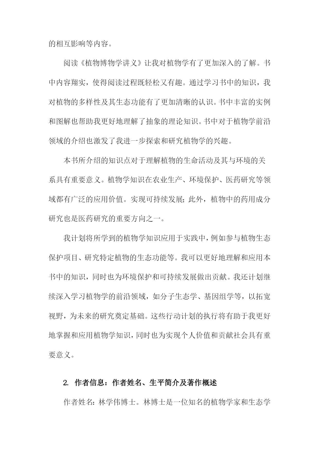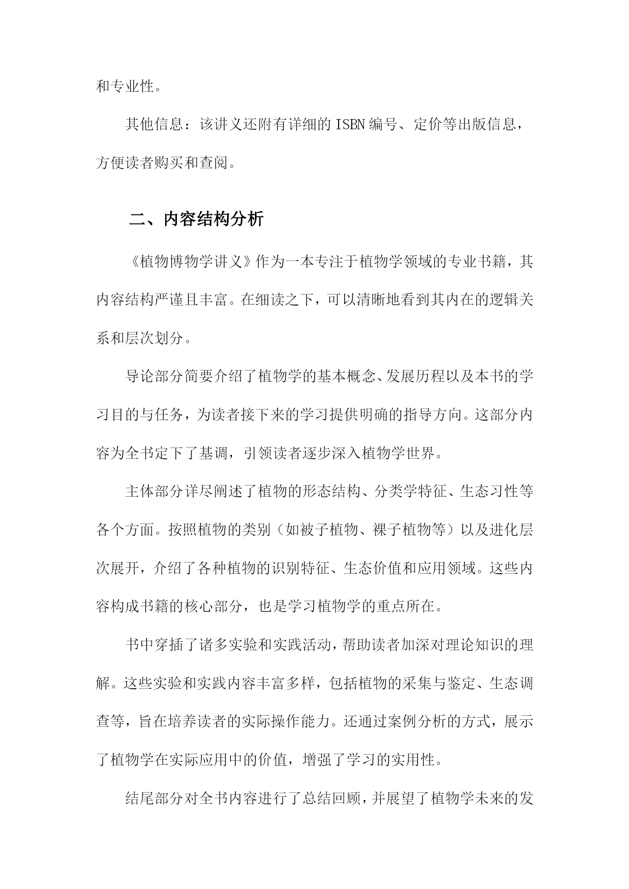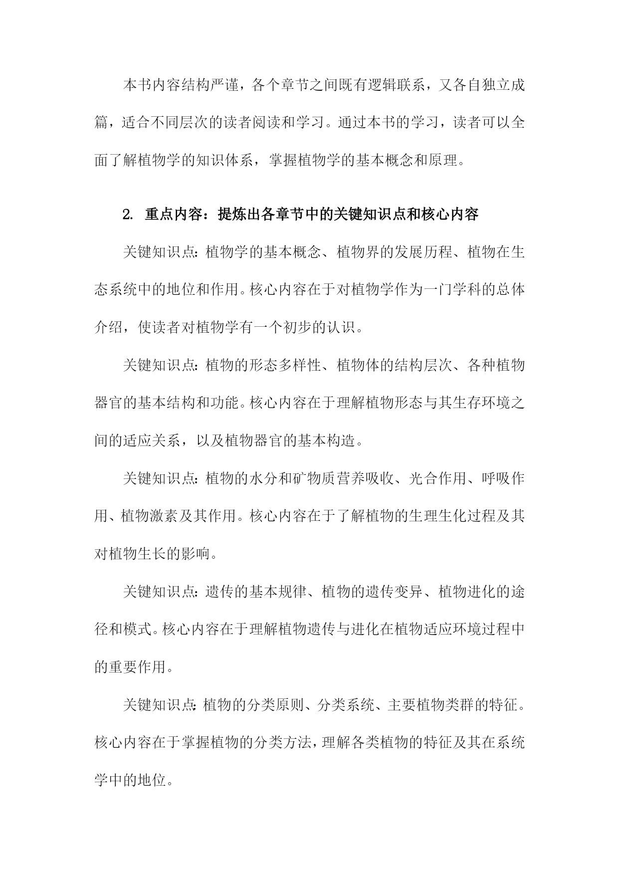 《植物博物学讲义》读书备忘录一、书籍基本信息本书是一部关于植物学的综合性科普读物,旨在为读者提供全面的植物学知识。全书分为若干章节,涵盖了植物的形态、结构、生理、生态、分类等方面。书中详细介绍了植物的基本特征、生长环境、生存策略以及与人类的关系等知识点。通过本书的阅读,读者可以深入了解植物王国的奥秘,增进对自然环境的认识和保护意识。1.书籍名称:《植物博物学讲义》在自然科学领域,植物学是一门研究植物生命特征、结构、分类及其与环境相互关系的学科。《植物博物学讲义》作为一本重要的植物学著作,涵盖了植物学的广泛知识,从植物的多样性、分类学、生理学到生态学等各个方面都有详尽的阐述。通过阅读这本书,读者可以深入了解植物的奥秘及其在自然界中的重要地位。本书系统地介绍了植物学的知识体系,其中包括植物的基本结构、生理过程、生长规律以及与环境之间的相互作用等内容。书中不仅涵盖了宏观的植物形态学、分类学等基础知识,还深入探讨了植物的细胞生物学、分子生物学等微观层面的知识。书中还介绍了植物与生态系统之间的关系,包括植物在生态系统中的作用以及植物与环境之间的相互影响等内容。阅读《植物博物学讲义》让我对植物学有了更加深入的了解。书中内容翔实,使得阅读过程既轻松又有趣。通过学习书中的知识,我对植物的多样性及其生态功能有了更加清晰的认识。书中丰富的实例和图解也帮助我更好地理解了抽象的理论知识。书中对于植物学前沿领域的介绍也激发了我进一步探索和研究植物学的兴趣。本书所介绍的知识点对于理解植物的生命活动及其与环境的关系具有重要意义。植物学知识在农业生产、环境保护、医药研究等领域都有广泛的应用价值。实现可持续发展;此外,植物中的药用成分研究也是医药研究的重要方向之一。我计划将所学到的植物学知识应用于实践中,例如参与植物生态保护项目、研究特定植物的生态功能等。我可以更好地理解和应用本书中的知识,同时也为环境保护和可持续发展做出贡献。我还计划继续深入学习植物学的前沿领域,如分子生态学、基因组学等,以拓宽视野,为未来的研究奠定基础。这些行动计划的执行将有助于我更好地掌握和应用植物学知识,同时也为实现个人价值和贡献社会具有重要意义。2.作者信息:作者姓名、生平简介及著作概述作者姓名:林学伟博士。林博士是一位知名的植物学家和生态学家,对植物学领域有着深入的研究和丰富的实践经验。生平简介:林学伟博士毕业于国内知名大学,并在海外深造多年,获得了植物学博士学位。他在植物学领域耕耘近三十载,发表了众多研究成果,参与了许多国内外的学术交流项目。其学术研究范围涉及植物分类学、植物生理学以及生态科学等领域,是业内极具声望的专家。在日常生活方面,他性格谦逊平和,注重实际科研和实践工作的结合,对待学问始终保持着严谨务实的态度。著作概述:林学伟博士的著作丰富多样,涵盖了植物学的多个分支领域。《植物博物学讲义》是其最具代表性的作品之一。本书基于其多年的学术研究和实践经验,深入浅出地介绍了植物学的知识,涉及植物的形态结构、生理过程、生态适应性等多个方面。本书结合了现代植物学的研究成果和传统植物知识的精华,既有严谨的学术内容,也有丰富的实际应用案例,深受广大读者喜爱和学术界的好评。林博士还有多本学术论文集、科普作品和教科书等著作。他在撰写过程中始终秉持科学精神和创新精神,不断追求学术进步和知识的普及推广。3.出版信息:出版社名称、出版年份、版次等该出版社是国内最具影响力的教育出版社之一,致力于为广大读者提供全面、前沿的教育资源。这本讲义在年由高等教育出版社成功出版,确保了内容的时效性和专业性。其他信息:该讲义还附有详细的ISBN编号、定价等出版信息,方便读者购买和查阅。二、内容结构分析《植物博物学讲义》作为一本专注于植物学领域的专业书籍,其内容结构严谨且丰富。在细读之下,可以清晰地看到其内在的逻辑关系和层次划分。导论部分简要介绍了植物学的基本概念、发展历程以及本书的学习目的与任务,为读者接下来的学习提供明确的指导方向。这部分内容为全书定下了基调,引领读者逐步深入植物学世界。主体部分详尽阐述了植物的形态结构、分类学特征、生态习性等各个方面。按照植物的类别(如被子植物、裸子植物等)以及进化层次展开,介绍了各种植物的识别特征、生态价值和应用领域。这些内容构成书籍的核心部分,也是学习植物学的重点所在。书中穿插了诸多实验和实践活动,帮助读者加深对理论知识的理解。这些实验和实践内容丰富多样,包括植物的采集与鉴定、生态调查等,旨在培养读者的实际操作能力。还通过案例分析的方式,展示了植物学在实际应用中的价值,增强了学习的实用性。结尾部分对全书内容进行了总结回顾,并展望了植物学未来的发展趋势。这部分内容既是对全书学习成果的梳理,也为读者提供了进一步学习和研究的思路与方向。