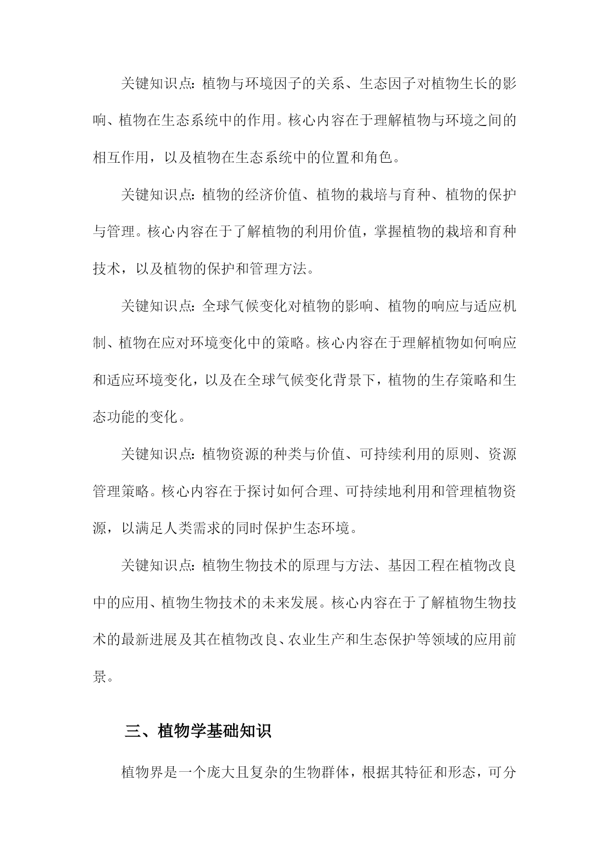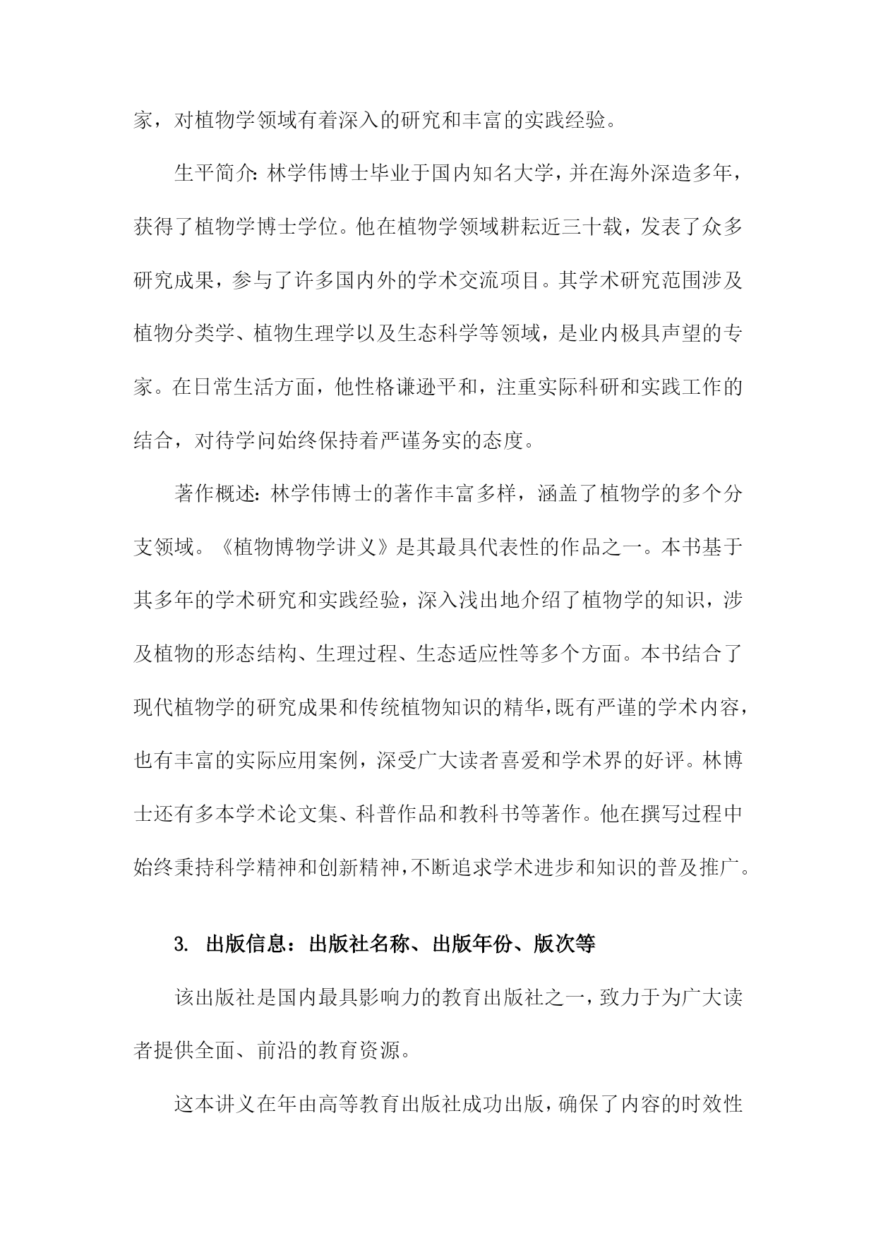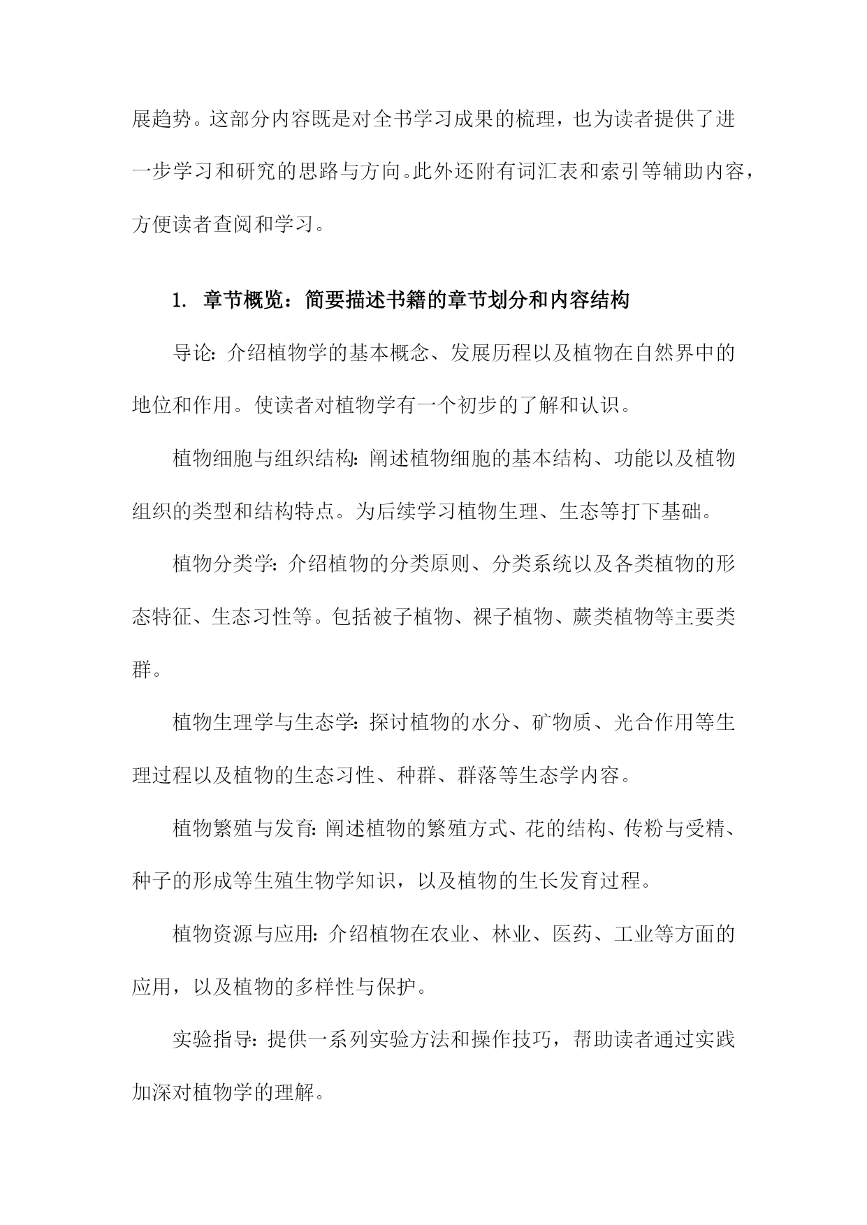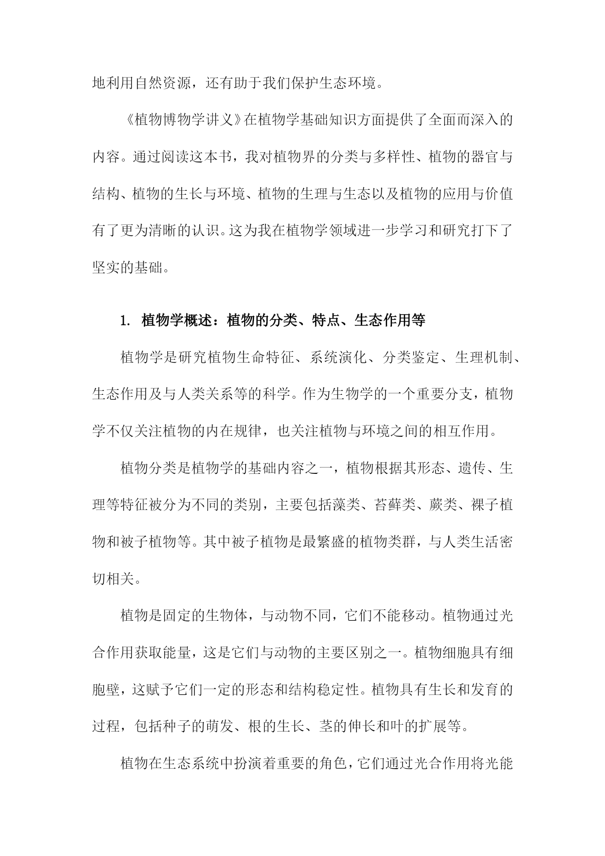 《植物博物学讲义》读书备忘录一、书籍基本信息本书是一部关于植物学的综合性科普读物,旨在为读者提供全面的植物学知识。全书分为若干章节,涵盖了植物的形态、结构、生理、生态、分类等方面。书中详细介绍了植物的基本特征、生长环境、生存策略以及与人类的关系等知识点。通过本书的阅读,读者可以深入了解植物王国的奥秘,增进对自然环境的认识和保护意识。1.书籍名称:《植物博物学讲义》在自然科学领域,植物学是一门研究植物生命特征、结构、分类及其与环境相互关系的学科。《植物博物学讲义》作为一本重要的植物学著作,涵盖了植物学的广泛知识,从植物的多样性、分类学、生理学到生态学等各个方面都有详尽的阐述。通过阅读这本书,读者可以深入了解植物的奥秘及其在自然界中的重要地位。本书系统地介绍了植物学的知识体系,其中包括植物的基本结构、生理过程、生长规律以及与环境之间的相互作用等内容。书中不仅涵盖了宏观的植物形态学、分类学等基础知识,还深入探讨了植物的细胞生物学、分子生物学等微观层面的知识。书中还介绍了植物与生态系统之间的关系,包括植物在生态系统中的作用以及植物与环境之间的相互影响等内容。阅读《植物博物学讲义》让我对植物学有了更加深入的了解。书中内容翔实,使得阅读过程既轻松又有趣。通过学习书中的知识,我对植物的多样性及其生态功能有了更加清晰的认识。书中丰富的实例和图解也帮助我更好地理解了抽象的理论知识。书中对于植物学前沿领域的介绍也激发了我进一步探索和研究植物学的兴趣。本书所介绍的知识点对于理解植物的生命活动及其与环境的关系具有重要意义。植物学知识在农业生产、环境保护、医药研究等领域都有广泛的应用价值。实现可持续发展;此外,植物中的药用成分研究也是医药研究的重要方向之一。我计划将所学到的植物学知识应用于实践中,例如参与植物生态保护项目、研究特定植物的生态功能等。我可以更好地理解和应用本书中的知识,同时也为环境保护和可持续发展做出贡献。我还计划继续深入学习植物学的前沿领域,如分子生态学、基因组学等,以拓宽视野,为未来的研究奠定基础。这些行动计划的执行将有助于我更好地掌握和应用植物学知识,同时也为实现个人价值和贡献社会具有重要意义。2.作者信息:作者姓名、生平简介及著作概述作者姓名:林学伟博士。林博士是一位知名的植物学家和生态学家,对植物学领域有着深入的研究和丰富的实践经验。生平简介:林学伟博士毕业于国内知名大学,并在海外深造多年,获得了植物学博士学位。他在植物学领域耕耘近三十载,发表了众多研究成果,参与了许多国内外的学术交流项目。其学术研究范围涉及植物分类学、植物生理学以及生态科学等领域,是业内极具声望的专家。在日常生活方面,他性格谦逊平和,注重实际科研和实践工作的结合,对待学问始终保持着严谨务实的态度。著作概述:林学伟博士的著作丰富多样,涵盖了植物学的多个分支领域。《植物博物学讲义》是其最具代表性的作品之一。本书基于其多年的学术研究和实践经验,深入浅出地介绍了植物学的知识,涉及植物的形态结构、生理过程、生态适应性等多个方面。本书结合了现代植物学的研究成果和传统植物知识的精华,既有严谨的学术内容,也有丰富的实际应用案例,深受广大读者喜爱和学术界的好评。林博士还有多本学术论文集、科普作品和教科书等著作。他在撰写过程中始终秉持科学精神和创新精神,不断追求学术进步和知识的普及推广。3.出版信息:出版社名称、出版年份、版次等该出版社是国内最具影响力的教育出版社之一,致力于为广大读者提供全面、前沿的教育资源。这本讲义在年由高等教育出版社成功出版,确保了内容的时效性和专业性。其他信息:该讲义还附有详细的ISBN编号、定价等出版信息,方便读者购买和查阅。二、内容结构分析《植物博物学讲义》作为一本专注于植物学领域的专业书籍,其内容结构严谨且丰富。在细读之下,可以清晰地看到其内在的逻辑关系和层次划分。导论部分简要介绍了植物学的基本概念、发展历程以及本书的学习目的与任务,为读者接下来的学习提供明确的指导方向。这部分内容为全书定下了基调,引领读者逐步深入植物学世界。主体部分详尽阐述了植物的形态结构、分类学特征、生态习性等各个方面。按照植物的类别(如被子植物、裸子植物等)以及进化层次展开,介绍了各种植物的识别特征、生态价值和应用领域。这些内容构成书籍的核心部分,也是学习植物学的重点所在。书中穿插了诸多实验和实践活动,帮助读者加深对理论知识的理解。这些实验和实践内容丰富多样,包括植物的采集与鉴定、生态调查等,旨在培养读者的实际操作能力。还通过案例分析的方式,展示了植物学在实际应用中的价值,增强了学习的实用性。结尾部分对全书内容进行了总结回顾,并展望了植物学未来的发展趋势。这部分内容既是对全书学习成果的梳理,也为读者提供了进一步学习和研究的思路与方向。