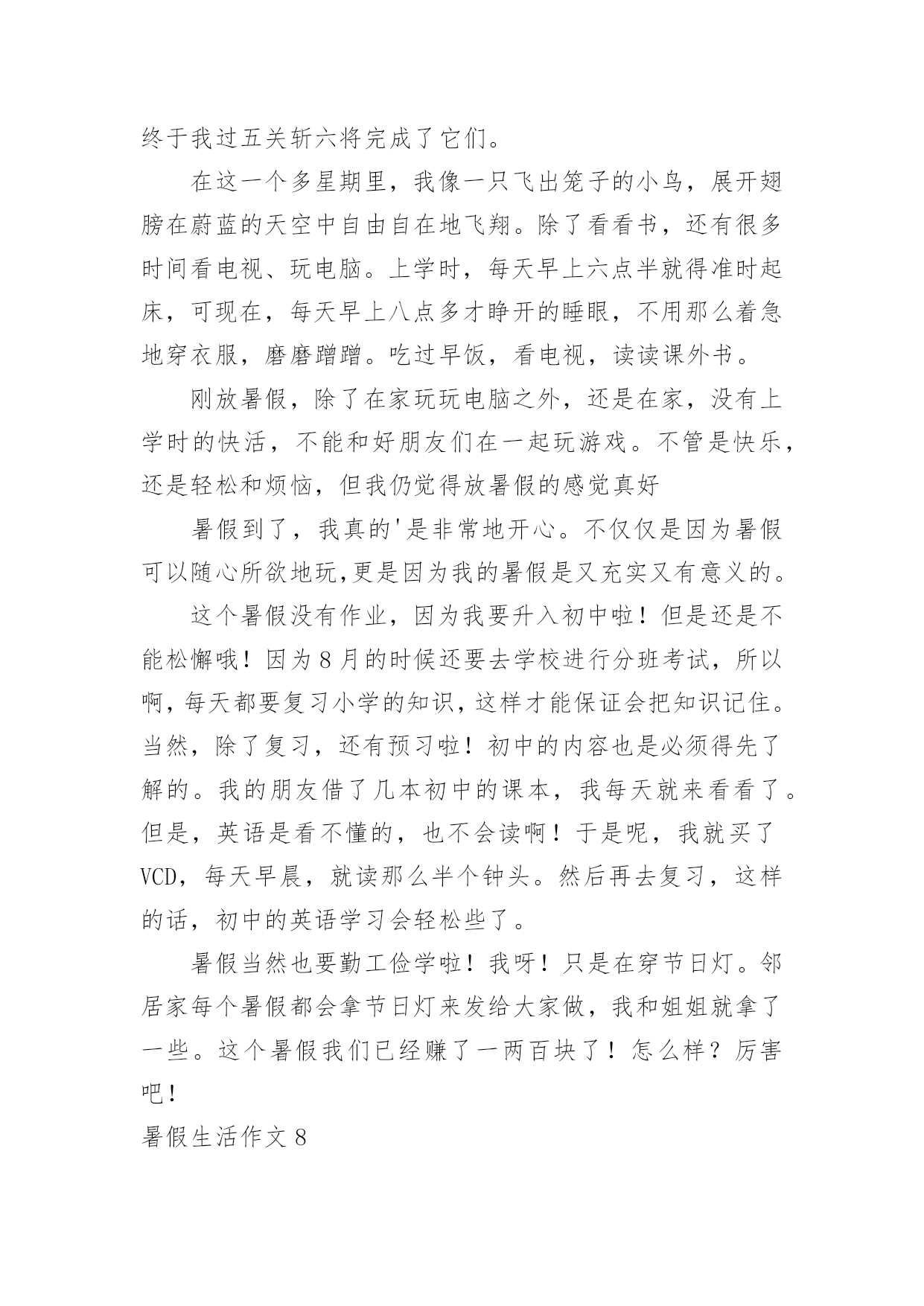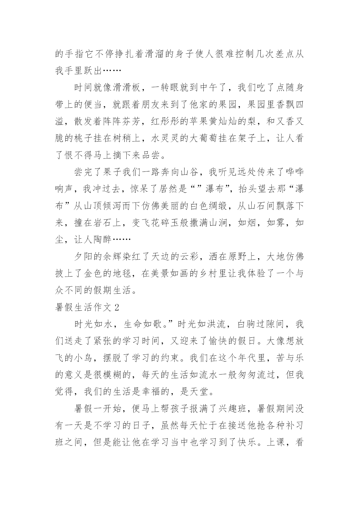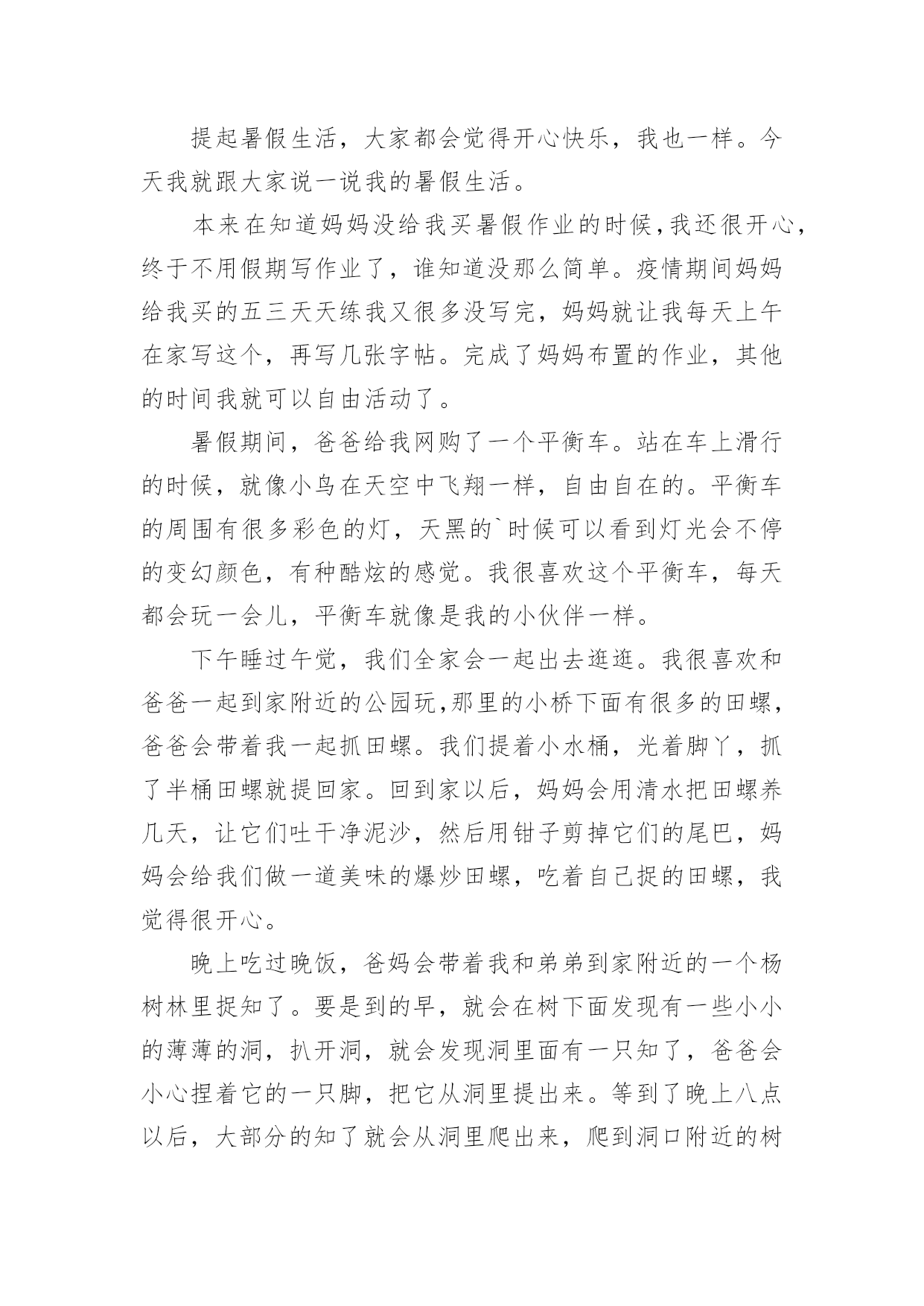 暑假生活作文暑假生活作文(合集)在平日的学习、工作和生活里,大家最不陌生的就是作文了吧,作文一定要做到主题集中,围绕同一主题作深入阐述,切忌东拉西扯,主题涣散甚至无主题。那么,怎么去写作文呢?下面是小编为大家整理的暑假生活作文,欢迎阅读,希望大家能够喜欢。暑假生活作文1放假了,我的心飞了起来,飞到了乡下我的老家……放假后的第一天,我回到了老家,放眼望去,好一副美丽的画:柔和的阳光,绚丽的云彩,山脚下的一簇簇村落,连日的大雨让河水长得满满的,一家家房顶上升起的袅袅炊烟,让村子里充满了浓浓的烟火气息。没有城市的喧哗,乡村显得宁静干净,到处可以听见鸟儿的叫声。歇息了一天,我便约了几个小伙伴,经过商量我们先去河里捉鱼,河水清澈见底,我的脚一踏进去,炎暑便消失得无影无踪,我的“火眼金睛”不断的转动,很快便发现了一条与众不同的`小鱼儿,不禁冷笑出声:鱼儿啊,你挂定了!我猛的扑了过去抓住它,它似乎不愿意做我的俘虏,可任凭它怎样摆动我也不松手,它终于被我降服了,河水里的鱼不多可我运气好,又发现了一条大鱼,我轻手轻脚的走过去迅速的抓住它,那月儿拼命的扭动着身子,企图钻出我紧握的手指它不停挣扎着滑溜的身子使人很难控制几次差点从我手里跃出……时间就像滑滑板,一转眼就到中午了,我们吃了点随身带上的便当,就跟着朋友来到了他家的果园,果园里香飘四溢,散发着阵阵芬芳,红彤彤的苹果黄灿灿的梨,和又香又脆的桃子挂在树稍上,水灵灵的大葡萄挂在架子上,让人看了恨不得马上摘下来品尝。尝完了果子我们一路奔向山谷,我听见远处传来了哗哗响声,我冲过去,惊呆了居然是“”瀑布”,抬头望去那“瀑布”从山顶倾泻而下仿佛美丽的白色绸缎,从山石间飘落下来,撞在岩石上,变飞花碎玉般撒满山涧,如烟,如雾,如尘,让人陶醉……夕阳的余辉染红了天边的云彩,洒在原野上,大地仿佛披上了金色的地毯,在美景如画的乡村里让我体验了一个与众不同的假期生活。暑假生活作文2时光如水,生命如歌。”时光如洪流,白驹过隙间,我们送走了紧张的学习时间,又迎来了愉快的假日。大像想放飞的小鸟,摆脱了学习的约束。我们在这个年代里,苦与乐的意义是很模糊的,每天的生活如流水一般匆匆流过,但我觉得,我们的生活是幸福的,是天堂。暑假一开始,便马上帮孩子报满了兴趣班,暑假期间没有一天是不学习的日子,虽然每天忙于在接送他抢各种补习班之间,但是能让他在学习当中也学习到了快乐。上课,看着孩子忙不迭的.在知识的海洋中畅游,每当他受到老师表扬,我的心总是甜甜的,别提有多高兴了。下课了,和同学一起交流老师所赋予的知识,分享自己的所闻所见,我觉得也挺好。当然,我利用暑假培养他做一个独立的孩子也是我的目标。他也不是一个只会衣来伸手饭来张口的学生,在这个假期里,帮妈妈做了许多家务事。学着妈妈的样子,先用拖把拖地,然后用抹布一点一点的去抹,还没抹完一个房间就汗流浃背。现在我才知道,做一个妈妈有多么的不容易啊。拖完了地,也累得趴在沙发上久久不愿起来。功夫不负有心人,我这才发现地板被我拖得一尘不染,我十分的高兴。休息好后,开始我的第二项任务——培养他整理书桌。首先,要求他先把每一本书分类,把每个年级的语文、数学书都整齐地放在一起。把书桌上的课外书统一放在一个架子上,再把书桌上的废纸扔进垃圾桶里。这个暑假,转眼间马上就结束了。我过得十分充实,看见孩子既学了,也做了,劳逸结合。瞧,这就是我丰富多彩的暑假生活。暑假生活作文3学生的天堂中,暑假是五光十色的,充满了无穷得诱惑,充满了无穷的乐趣,我的暑假生活更是丰富多彩,他是那么令人难忘!记得暑假那一天,天不给力,起先是多云,到了快吃饭的时候,天空逐渐暗了下来,突然,天空一个闪亮,接着轰隆隆打了几声雷,下起了倾盆大雨。看着外面的大雨,心想:爸妈一时半会也回不来了。心里很不是滋味,我心不在焉的走向厨房,此时想起,父母总是很忙很辛苦,不如自己动手做饭,给他们一个惊喜。我苦思冥想,终于,想了出来:做西红柿鸡蛋面。我很是为自己的想法得意,心想这回一定能做好。我从冰箱里拿了两个鸡蛋,一个西红柿,学着妈妈的样子,先用勺子在西红柿上刮两下,本来又红又好看的西红柿就变成了满脸皱纹的老太婆。我很轻松的把皮剥开,西红柿鲜红的果肉和汁水睡着我的指缝向下流,我赶紧用碗接住,用刀轻轻的把西红柿切成块,准备工作就绪,我先到了一点油,等油冒烟时,就把切好的.西红柿放进锅里,只听:吧吧!的一声,油脂乱溅,我赶紧后退几步,等声音小了一点,再用铲子翻,西红柿被炒成了汁,当西红柿被炒成糊状时,我赶紧倒水,盖上锅盖,等水开了以后,我下了一些面条,有过了一会儿我去打鸡蛋,可我从不会打鸡蛋,拿出一颗轻轻在碗边一碰,碎了,我要往碗里放时,不小心弄了出来,又赶紧弄到碗里,我有些不知所措。不一会儿,我闻到了糊味,大喊:坏了!西红柿糊了!不过还是可以过得去的。出锅