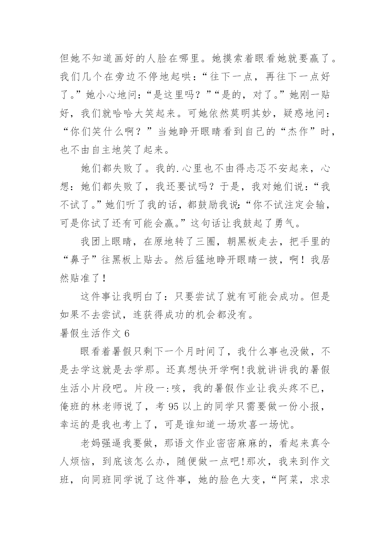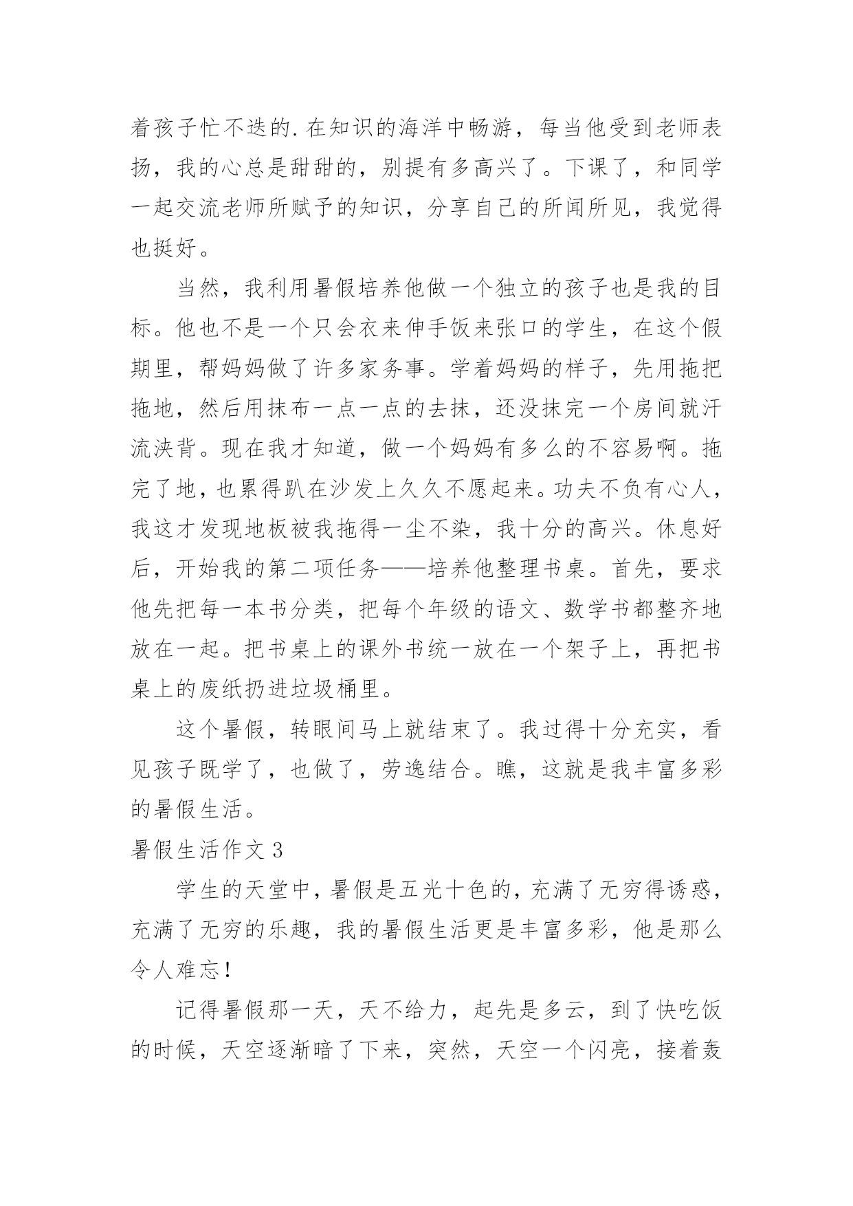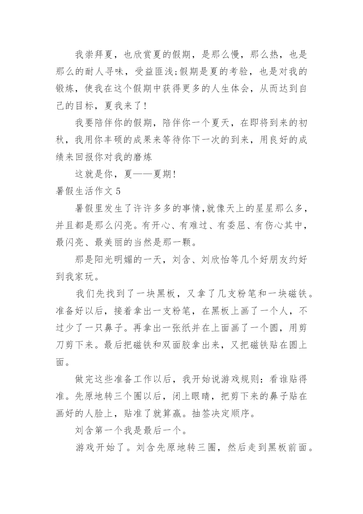 暑假生活作文暑假生活作文(合集)在平日的学习、工作和生活里,大家最不陌生的就是作文了吧,作文一定要做到主题集中,围绕同一主题作深入阐述,切忌东拉西扯,主题涣散甚至无主题。那么,怎么去写作文呢?下面是小编为大家整理的暑假生活作文,欢迎阅读,希望大家能够喜欢。暑假生活作文1放假了,我的心飞了起来,飞到了乡下我的老家……放假后的第一天,我回到了老家,放眼望去,好一副美丽的画:柔和的阳光,绚丽的云彩,山脚下的一簇簇村落,连日的大雨让河水长得满满的,一家家房顶上升起的袅袅炊烟,让村子里充满了浓浓的烟火气息。没有城市的喧哗,乡村显得宁静干净,到处可以听见鸟儿的叫声。歇息了一天,我便约了几个小伙伴,经过商量我们先去河里捉鱼,河水清澈见底,我的脚一踏进去,炎暑便消失得无影无踪,我的“火眼金睛”不断的转动,很快便发现了一条与众不同的`小鱼儿,不禁冷笑出声:鱼儿啊,你挂定了!我猛的扑了过去抓住它,它似乎不愿意做我的俘虏,可任凭它怎样摆动我也不松手,它终于被我降服了,河水里的鱼不多可我运气好,又发现了一条大鱼,我轻手轻脚的走过去迅速的抓住它,那月儿拼命的扭动着身子,企图钻出我紧握的手指它不停挣扎着滑溜的身子使人很难控制几次差点从我手里跃出……时间就像滑滑板,一转眼就到中午了,我们吃了点随身带上的便当,就跟着朋友来到了他家的果园,果园里香飘四溢,散发着阵阵芬芳,红彤彤的苹果黄灿灿的梨,和又香又脆的桃子挂在树稍上,水灵灵的大葡萄挂在架子上,让人看了恨不得马上摘下来品尝。尝完了果子我们一路奔向山谷,我听见远处传来了哗哗响声,我冲过去,惊呆了居然是“”瀑布”,抬头望去那“瀑布”从山顶倾泻而下仿佛美丽的白色绸缎,从山石间飘落下来,撞在岩石上,变飞花碎玉般撒满山涧,如烟,如雾,如尘,让人陶醉……夕阳的余辉染红了天边的云彩,洒在原野上,大地仿佛披上了金色的地毯,在美景如画的乡村里让我体验了一个与众不同的假期生活。暑假生活作文2时光如水,生命如歌。”时光如洪流,白驹过隙间,我们送走了紧张的学习时间,又迎来了愉快的假日。大像想放飞的小鸟,摆脱了学习的约束。我们在这个年代里,苦与乐的意义是很模糊的,每天的生活如流水一般匆匆流过,但我觉得,我们的生活是幸福的,是天堂。暑假一开始,便马上帮孩子报满了兴趣班,暑假期间没有一天是不学习的日子,虽然每天忙于在接送他抢各种补习班之间,但是能让他在学习当中也学习到了快乐。上课,看着孩子忙不迭的.在知识的海洋中畅游,每当他受到老师表扬,我的心总是甜甜的,别提有多高兴了。下课了,和同学一起交流老师所赋予的知识,分享自己的所闻所见,我觉得也挺好。当然,我利用暑假培养他做一个独立的孩子也是我的目标。他也不是一个只会衣来伸手饭来张口的学生,在这个假期里,帮妈妈做了许多家务事。学着妈妈的样子,先用拖把拖地,然后用抹布一点一点的去抹,还没抹完一个房间就汗流浃背。现在我才知道,做一个妈妈有多么的不容易啊。拖完了地,也累得趴在沙发上久久不愿起来。功夫不负有心人,我这才发现地板被我拖得一尘不染,我十分的高兴。休息好后,开始我的第二项任务——培养他整理书桌。首先,要求他先把每一本书分类,把每个年级的语文、数学书都整齐地放在一起。把书桌上的课外书统一放在一个架子上,再把书桌上的废纸扔进垃圾桶里。这个暑假,转眼间马上就结束了。我过得十分充实,看见孩子既学了,也做了,劳逸结合。瞧,这就是我丰富多彩的暑假生活。暑假生活作文3学生的天堂中,暑假是五光十色的,充满了无穷得诱惑,充满了无穷的乐趣,我的暑假生活更是丰富多彩,他是那么令人难忘!记得暑假那一天,天不给力,起先是多云,到了快吃饭的时候,天空逐渐暗了下来,突然,天空一个闪亮,接着轰隆隆打了几声雷,下起了倾盆大雨。看着外面的大雨,心想:爸妈一时半会也回不来了。心里很不是滋味,我心不在焉的走向厨房,此时想起,父母总是很忙很辛苦,不如自己动手做饭,给他们一个惊喜。我苦思冥想,终于,想了出来:做西红柿鸡蛋面。我很是为自己的想法得意,心想这回一定能做好。我从冰箱里拿了两个鸡蛋,一个西红柿,学着妈妈的样子,先用勺子在西红柿上刮两下,本来又红又好看的西红柿就变成了满脸皱纹的老太婆。我很轻松的把皮剥开,西红柿鲜红的果肉和汁水睡着我的指缝向下流,我赶紧用碗接住,用刀轻轻的把西红柿切成块,准备工作就绪,我先到了一点油,等油冒烟时,就把切好的.西红柿放进锅里,只听:吧吧!的一声,油脂乱溅,我赶紧后退几步,等声音小了一点,再用铲子翻,西红柿被炒成了汁,当西红柿被炒成糊状时,我赶紧倒水,盖上锅盖,等水开了以后,我下了一些面条,有过了一会儿我去打鸡蛋,可我从不会打鸡蛋,拿出一颗轻轻在碗边一碰,碎了,我要往碗里放时,不小心弄了出来,又赶紧弄到碗里,我有些不知所措。不一会儿,我闻到了糊味,大喊:坏了!西红柿糊了!不过还是可以过得去的。出锅